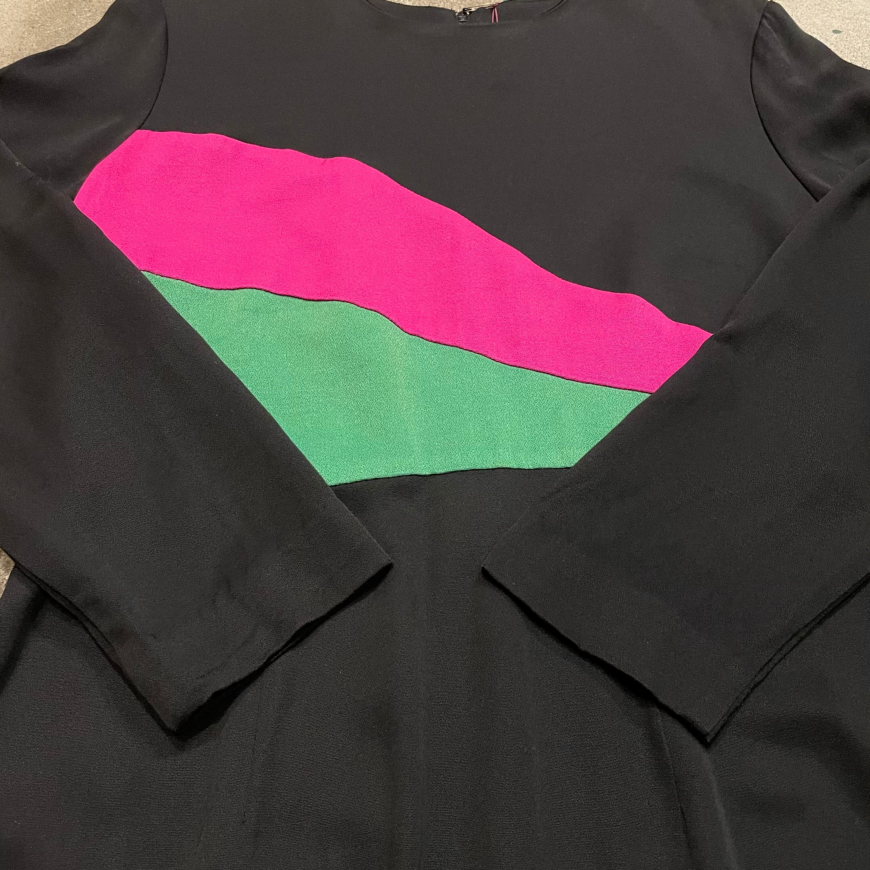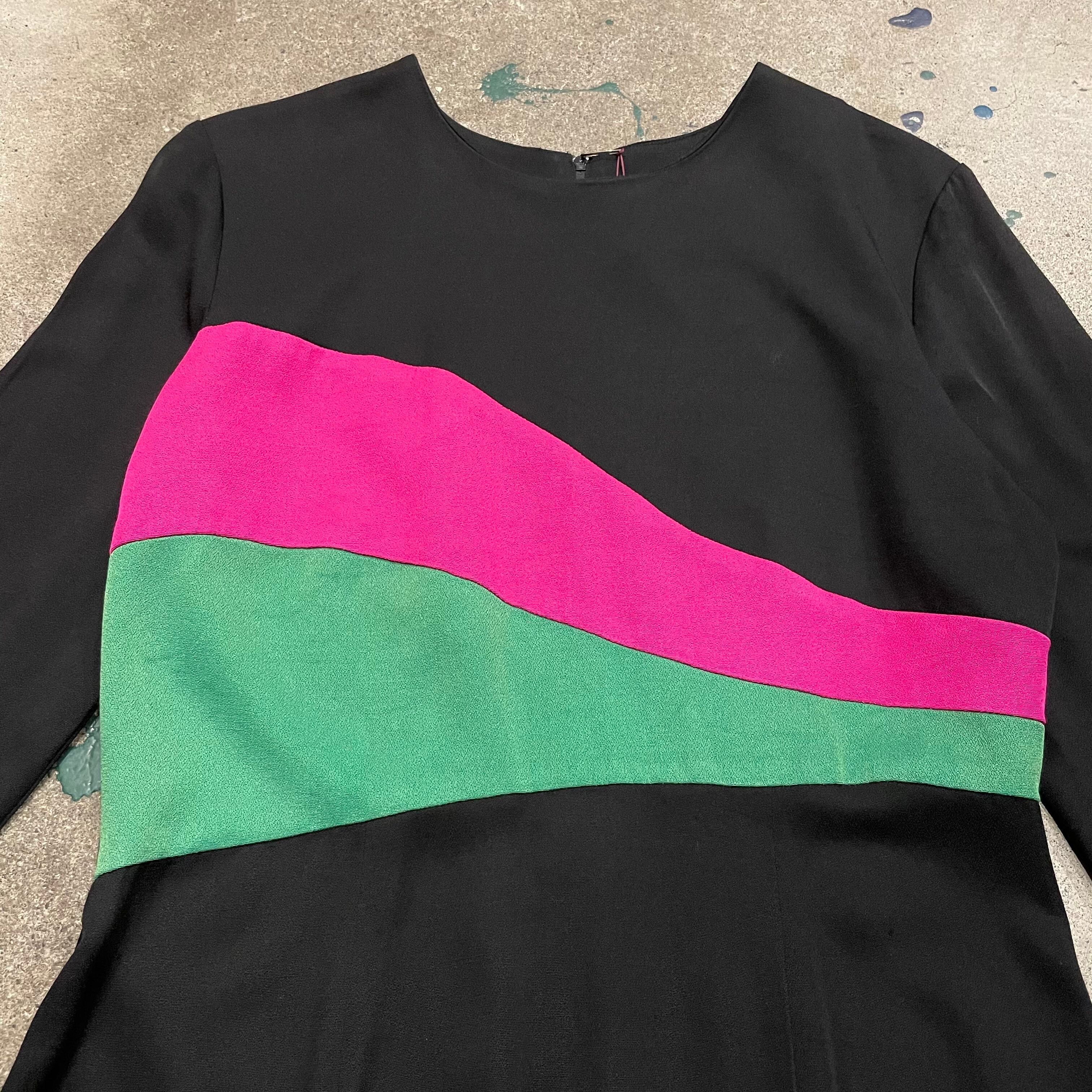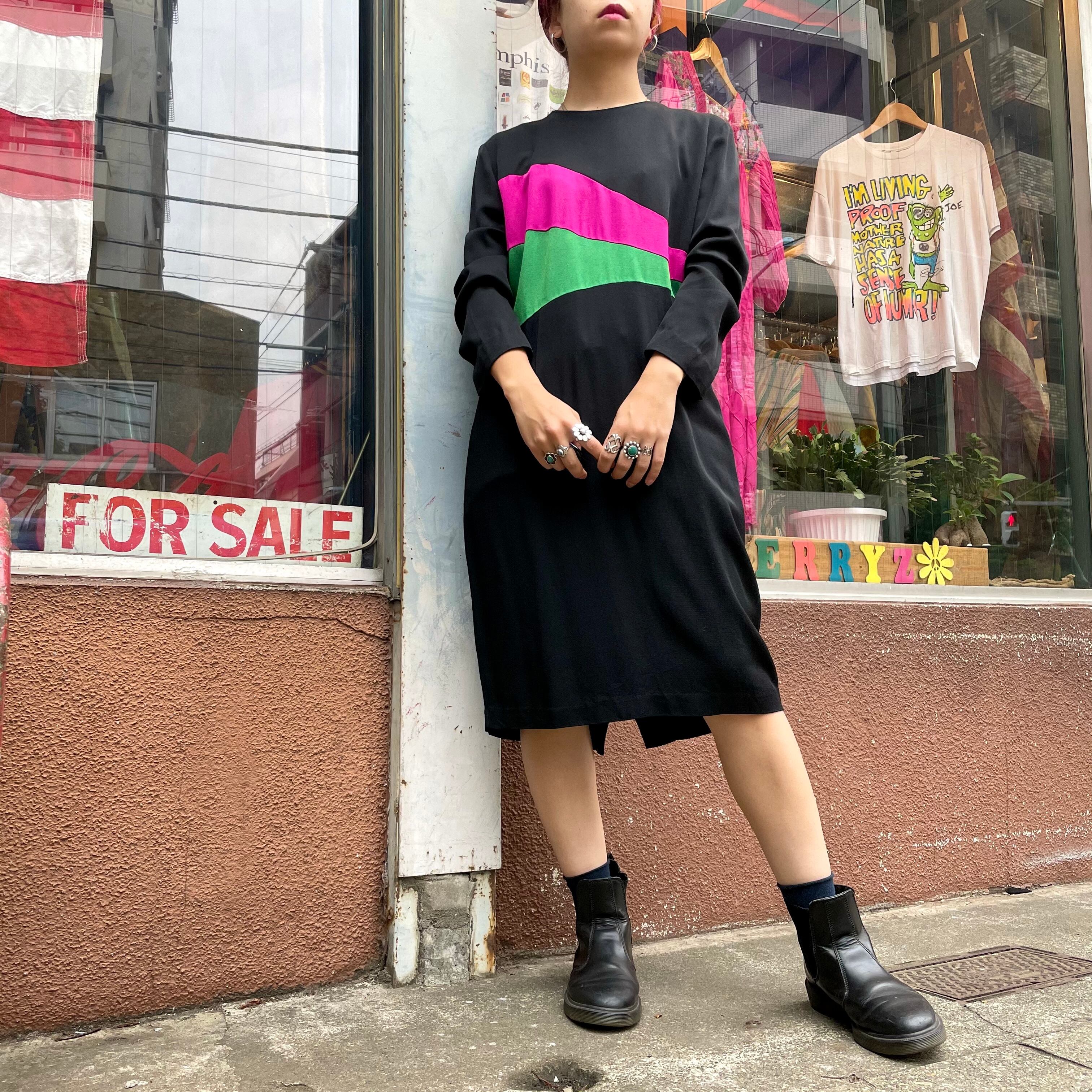 黒地にビビッドなピンクと黄緑の切り替えがインパクトがあってかっこいいワンピースです。