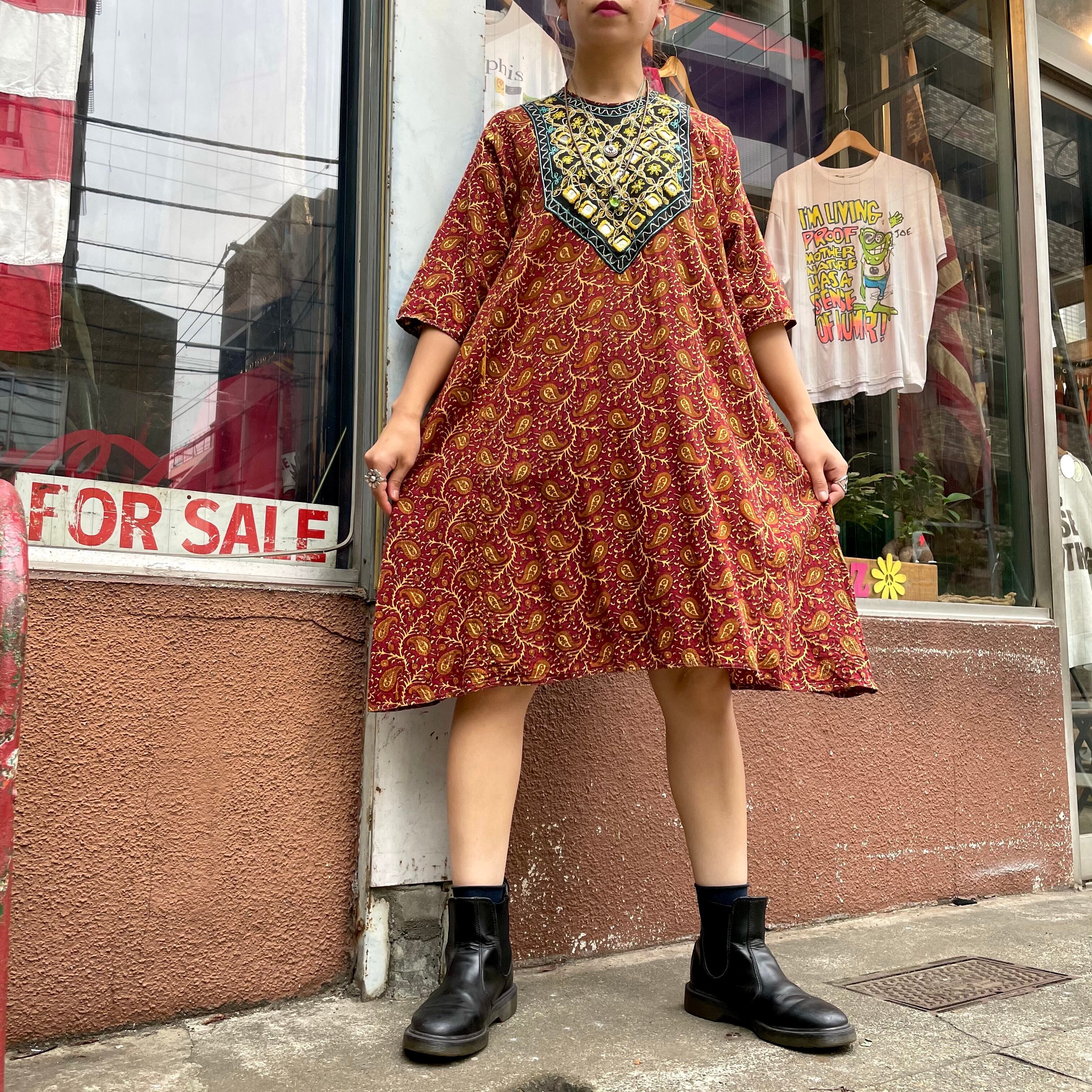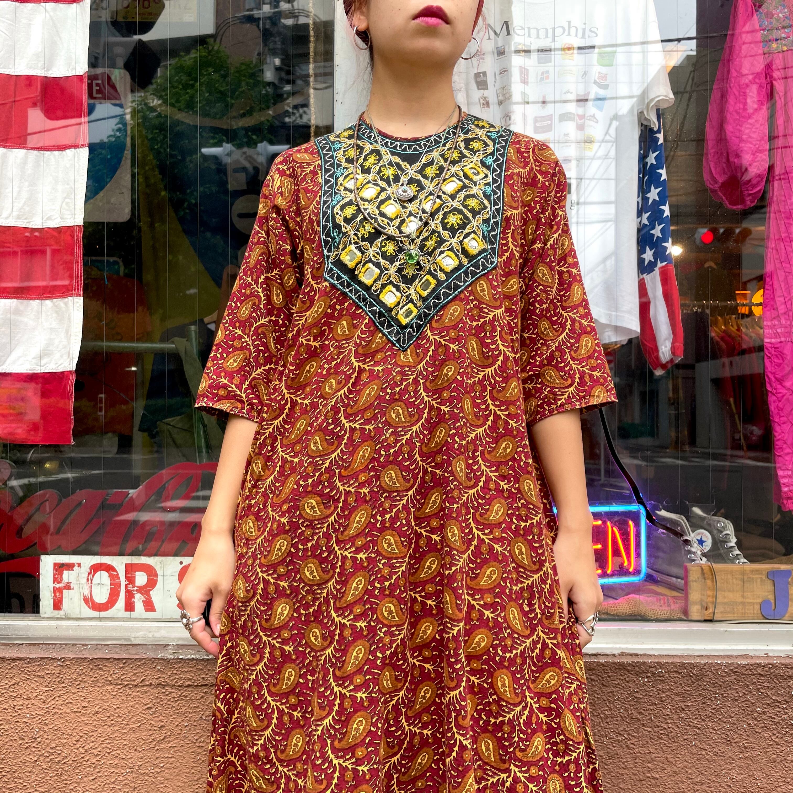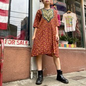 胸元のミラーワークと刺繍がかわいいワンピースです。詰まった首元に五分丈の袖などすっきりしたシルエットがとても素敵です。