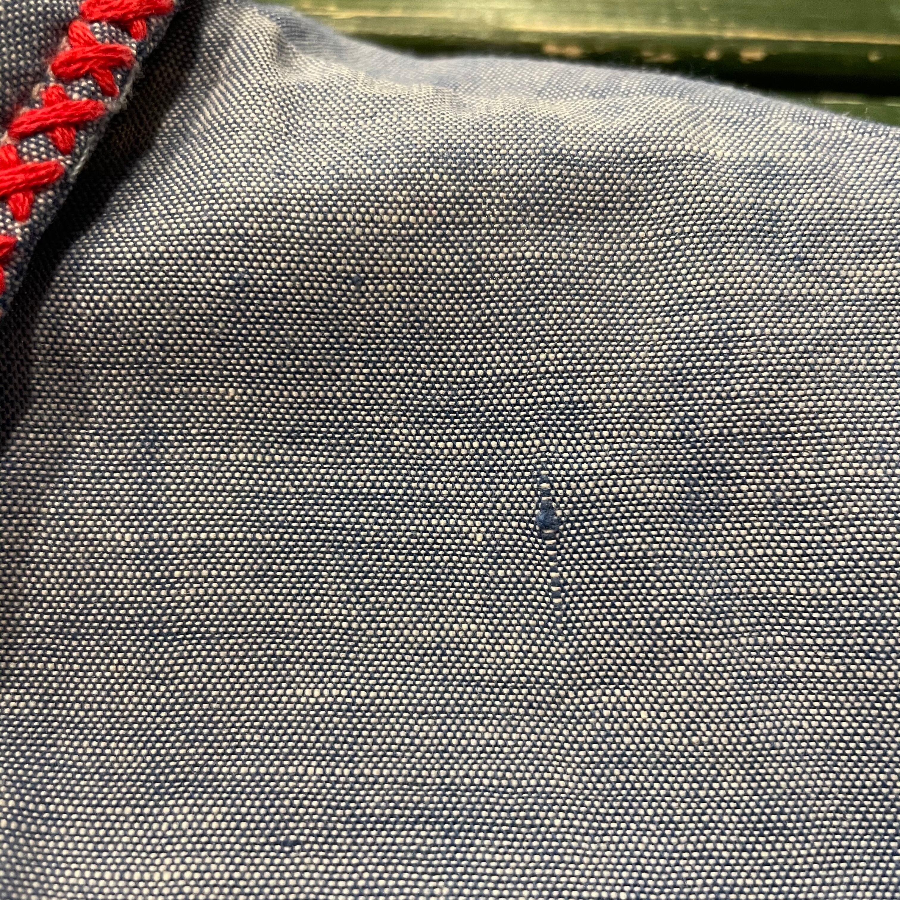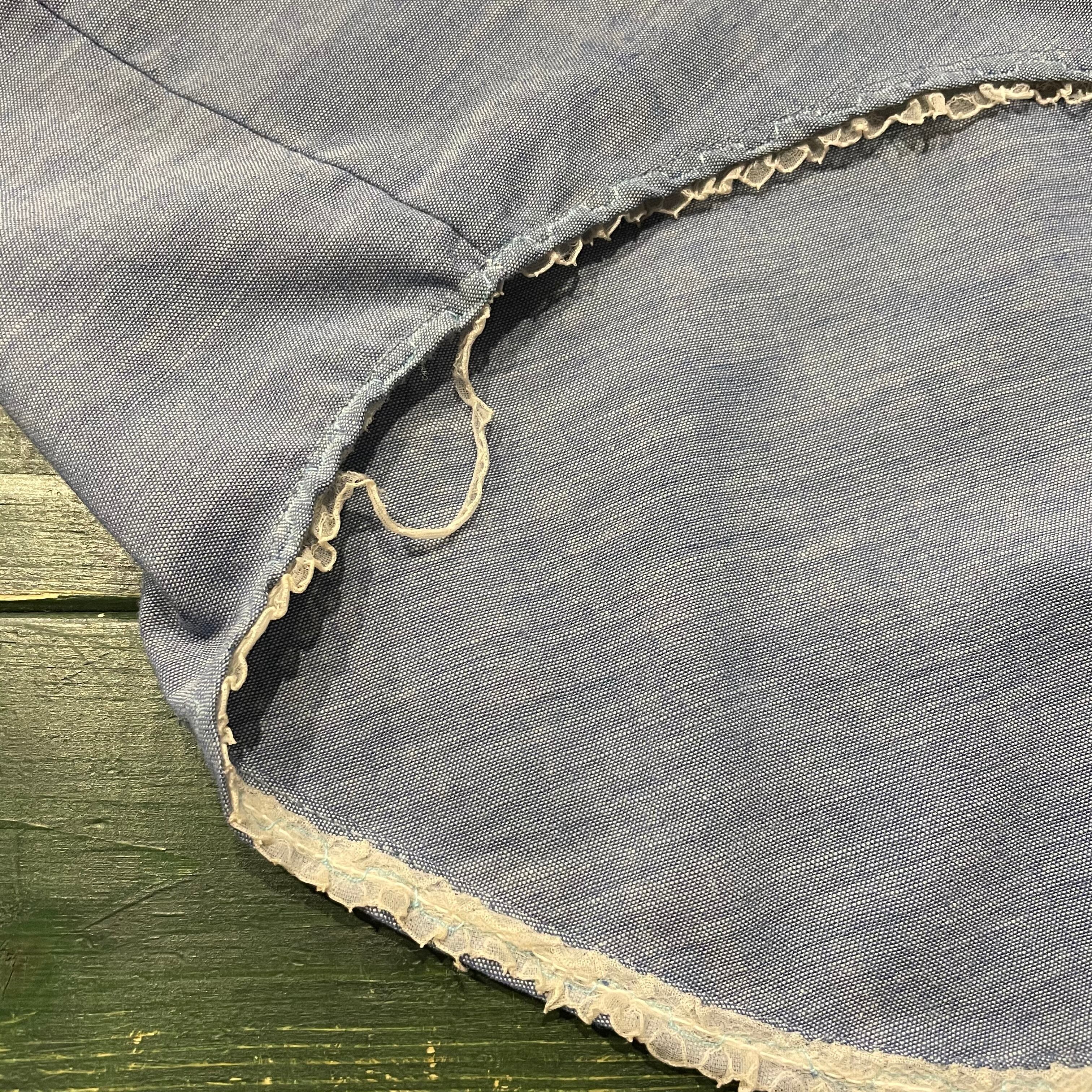 織りのキズのような部分、ポケットのフラップに縫えていない部分、右袖口の刺繍が途中で終わっている、裾のレースにダメージ等ございます。
