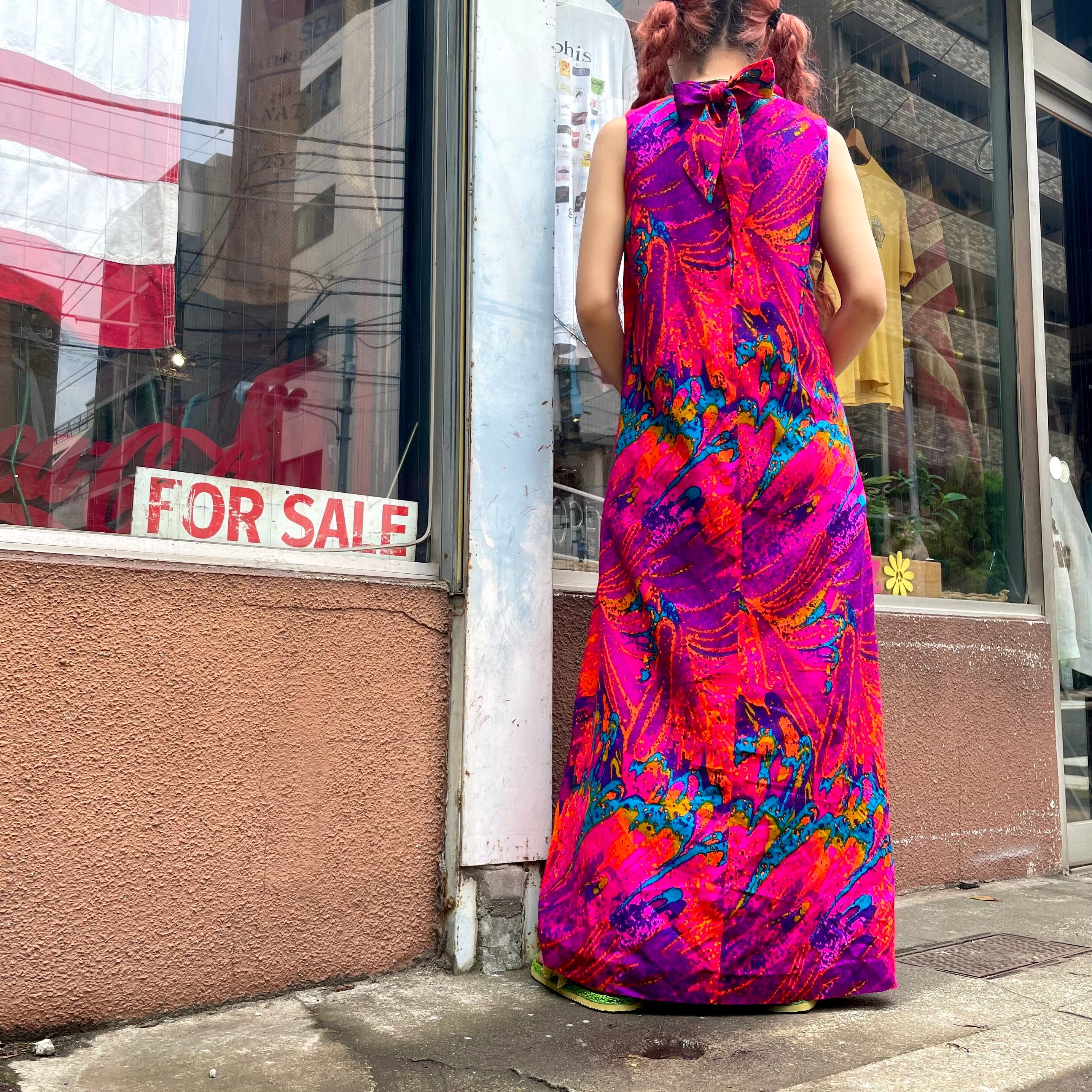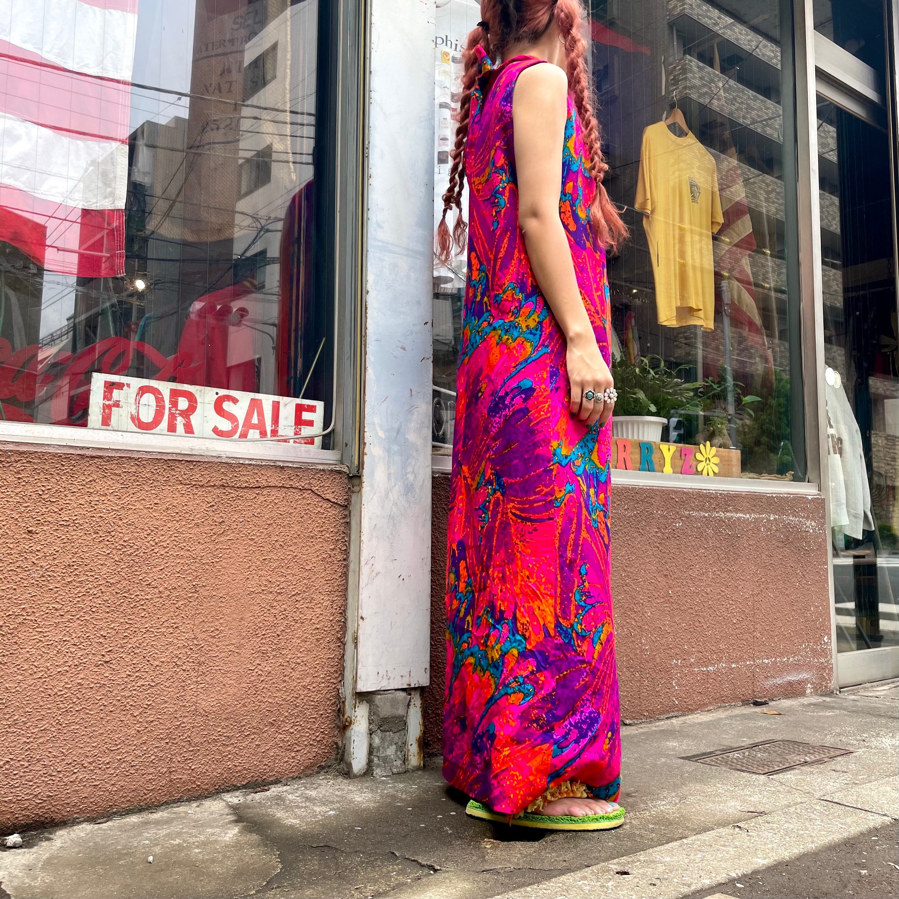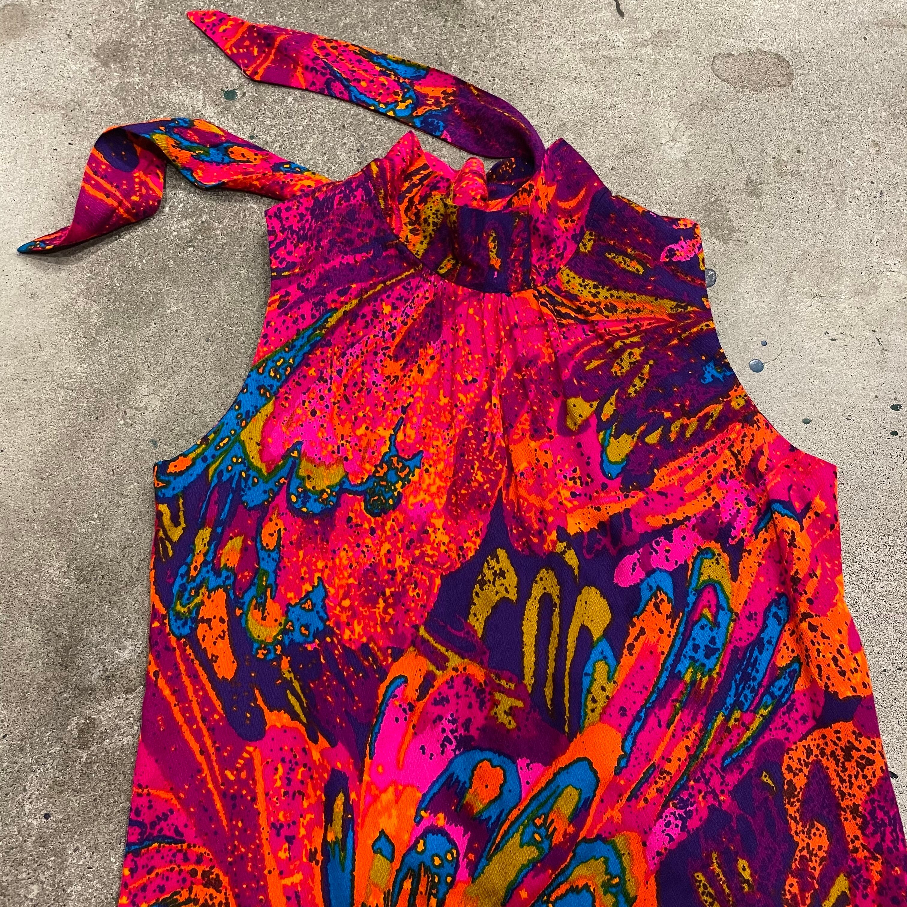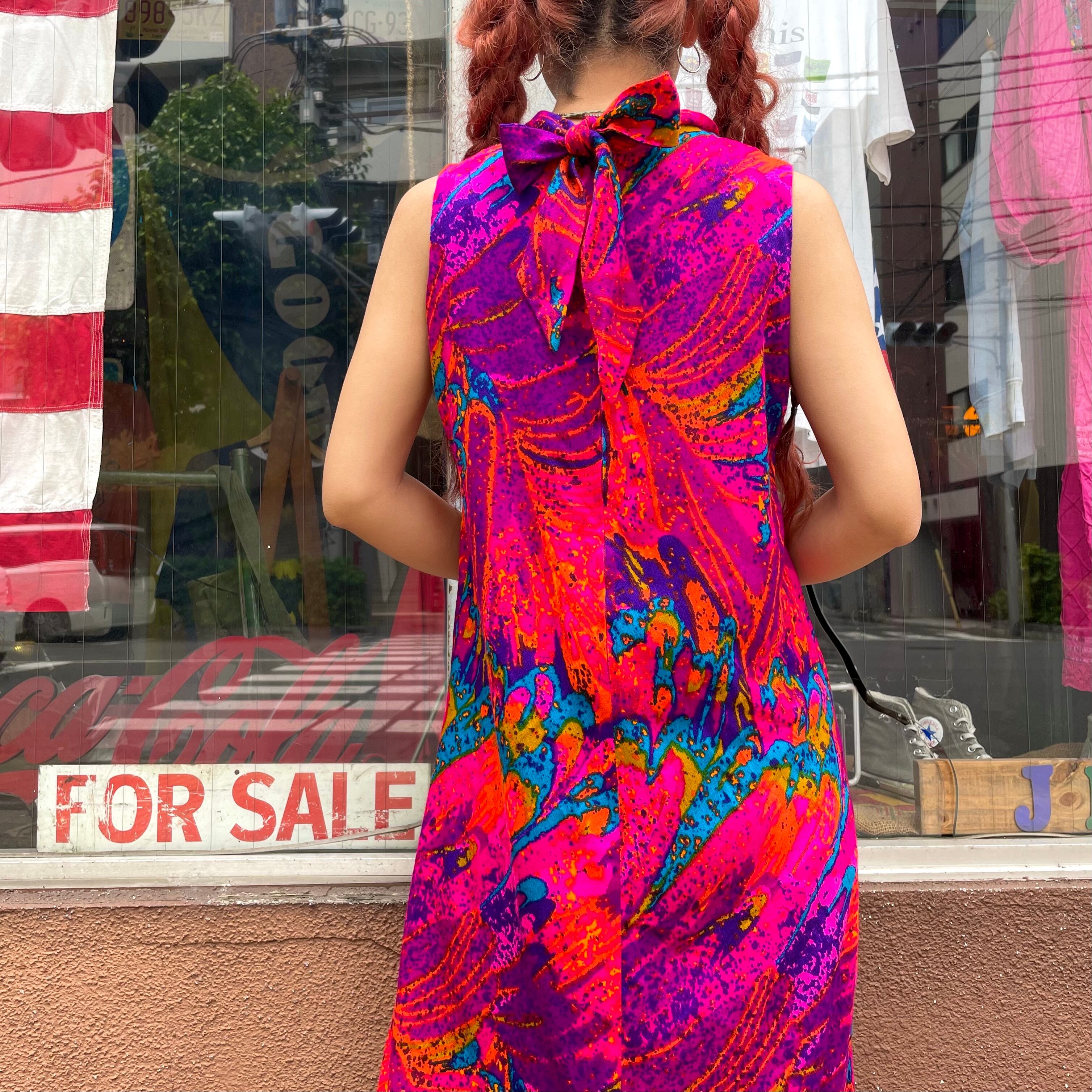 花火のような、鳥のような、ほとばしるエネルギー!というようなサイケデリックで素敵な模様がとてもかっこいいワンピースです。