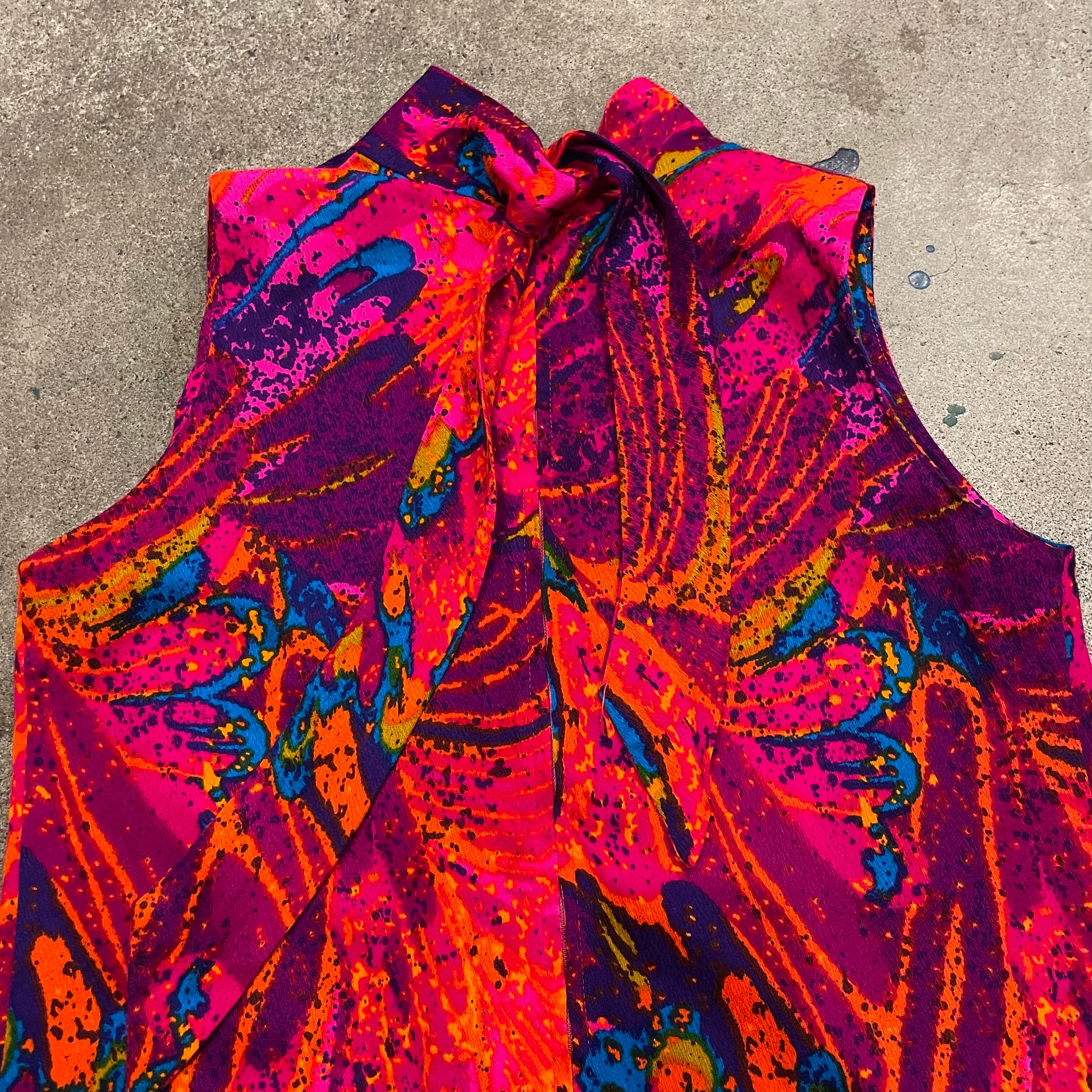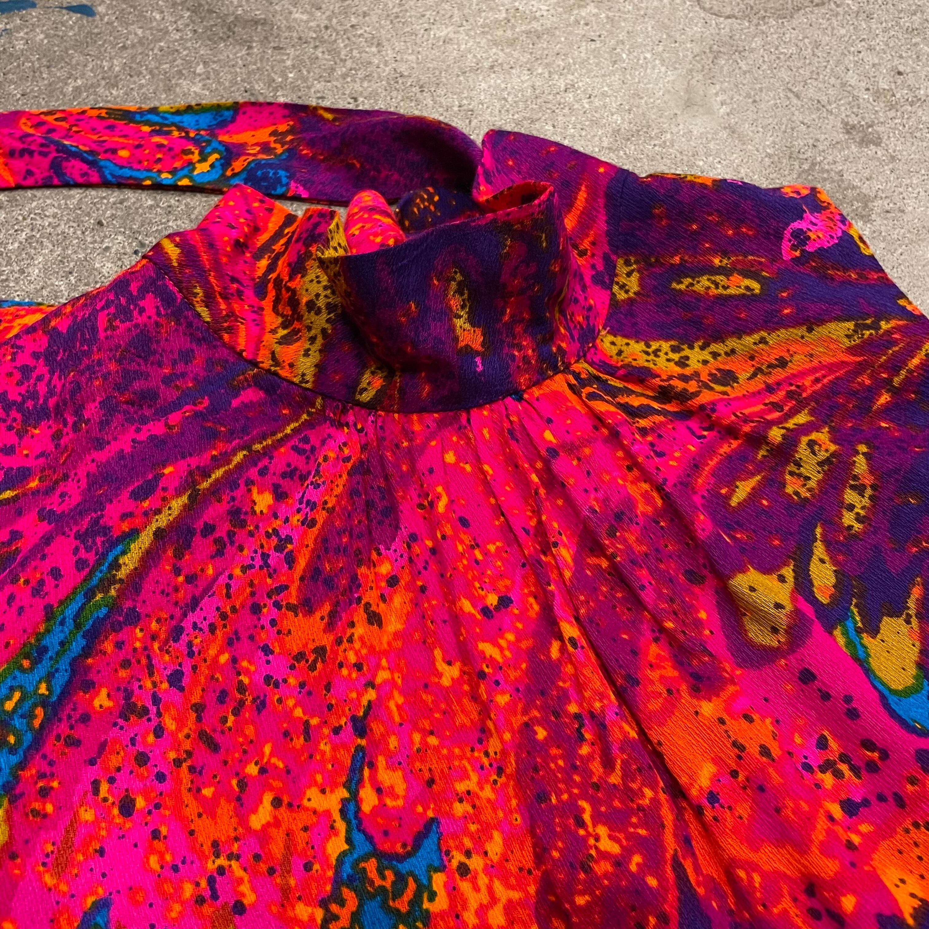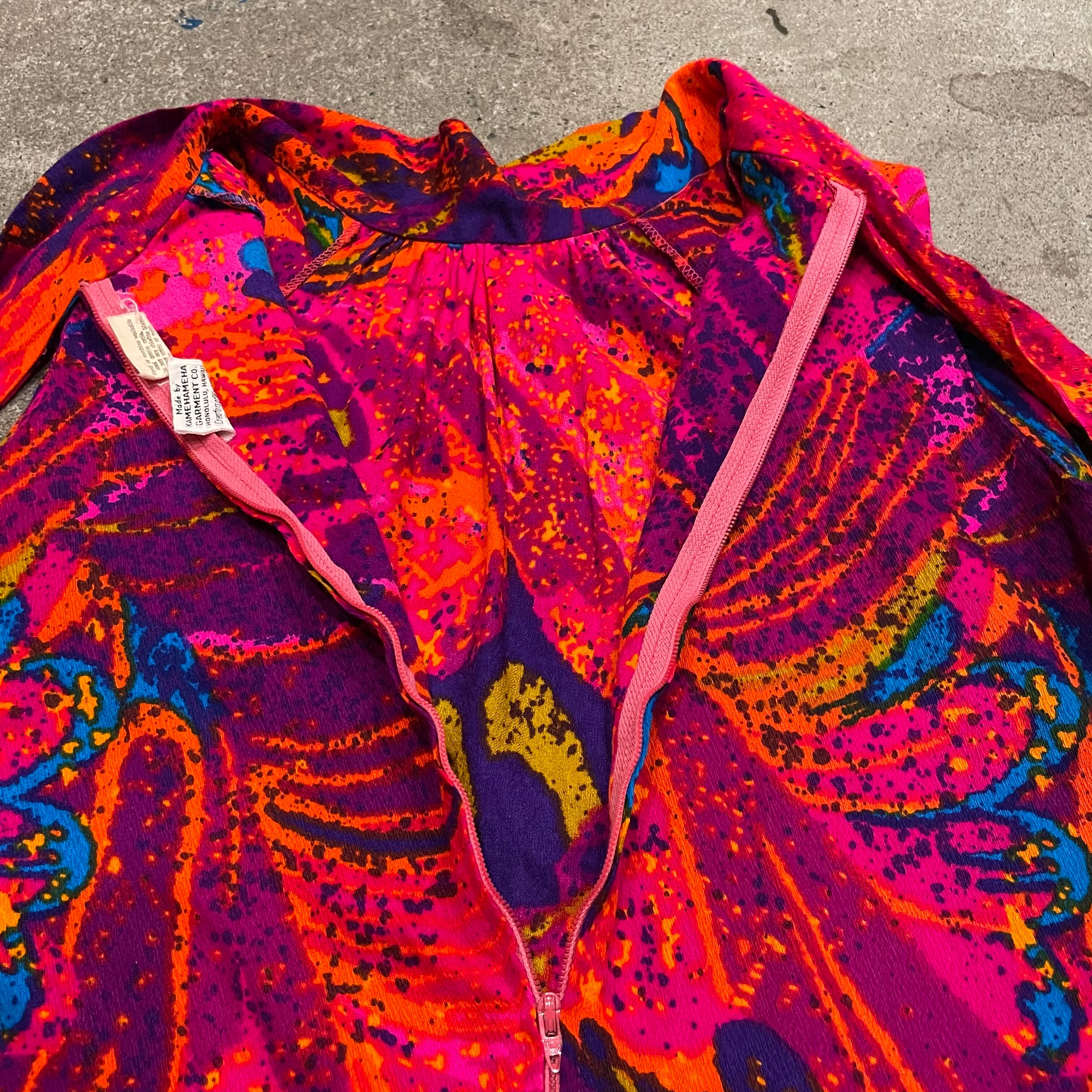 花火のような、鳥のような、ほとばしるエネルギー!というようなサイケデリックで素敵な模様がとてもかっこいいワンピースです。