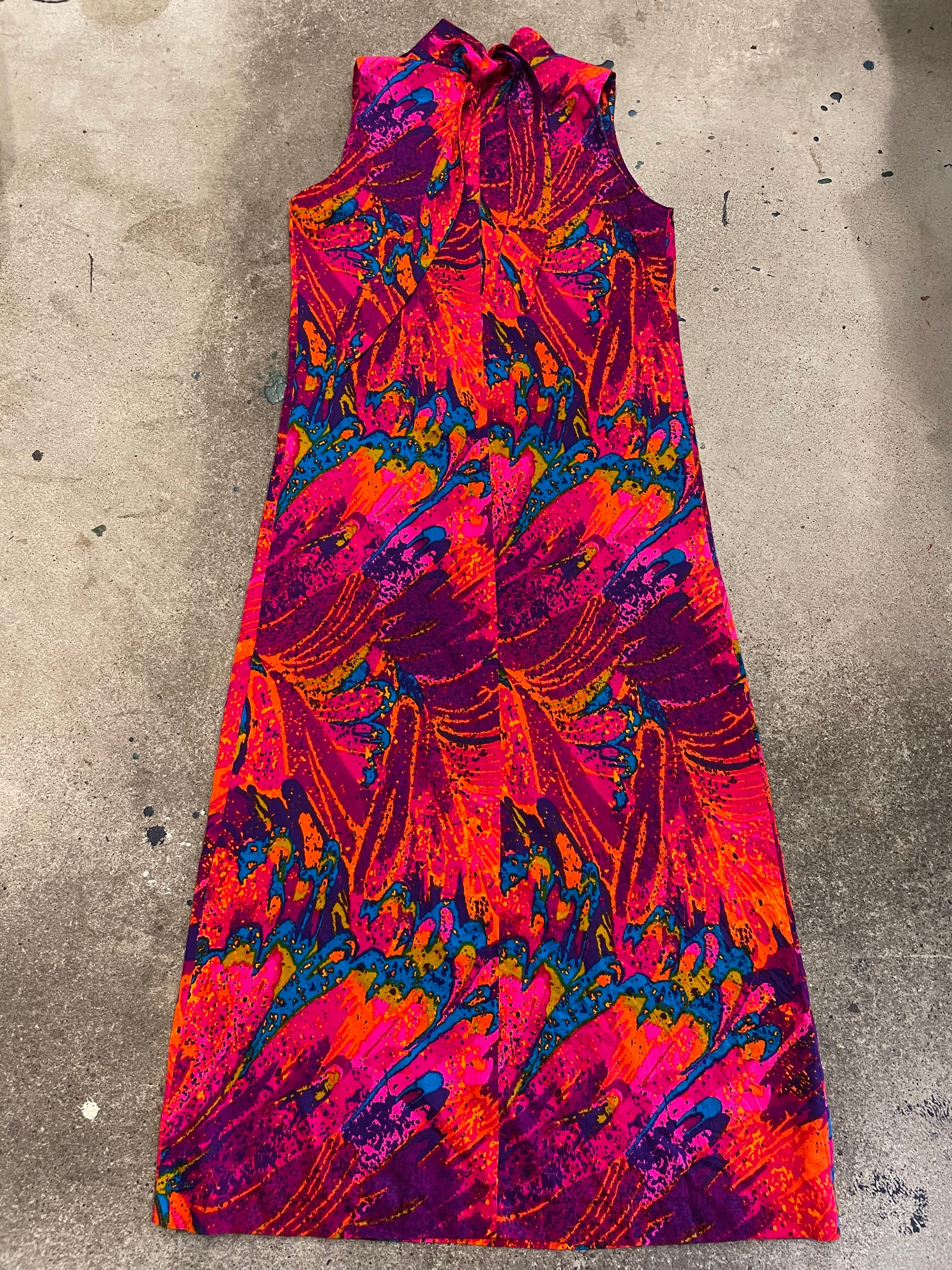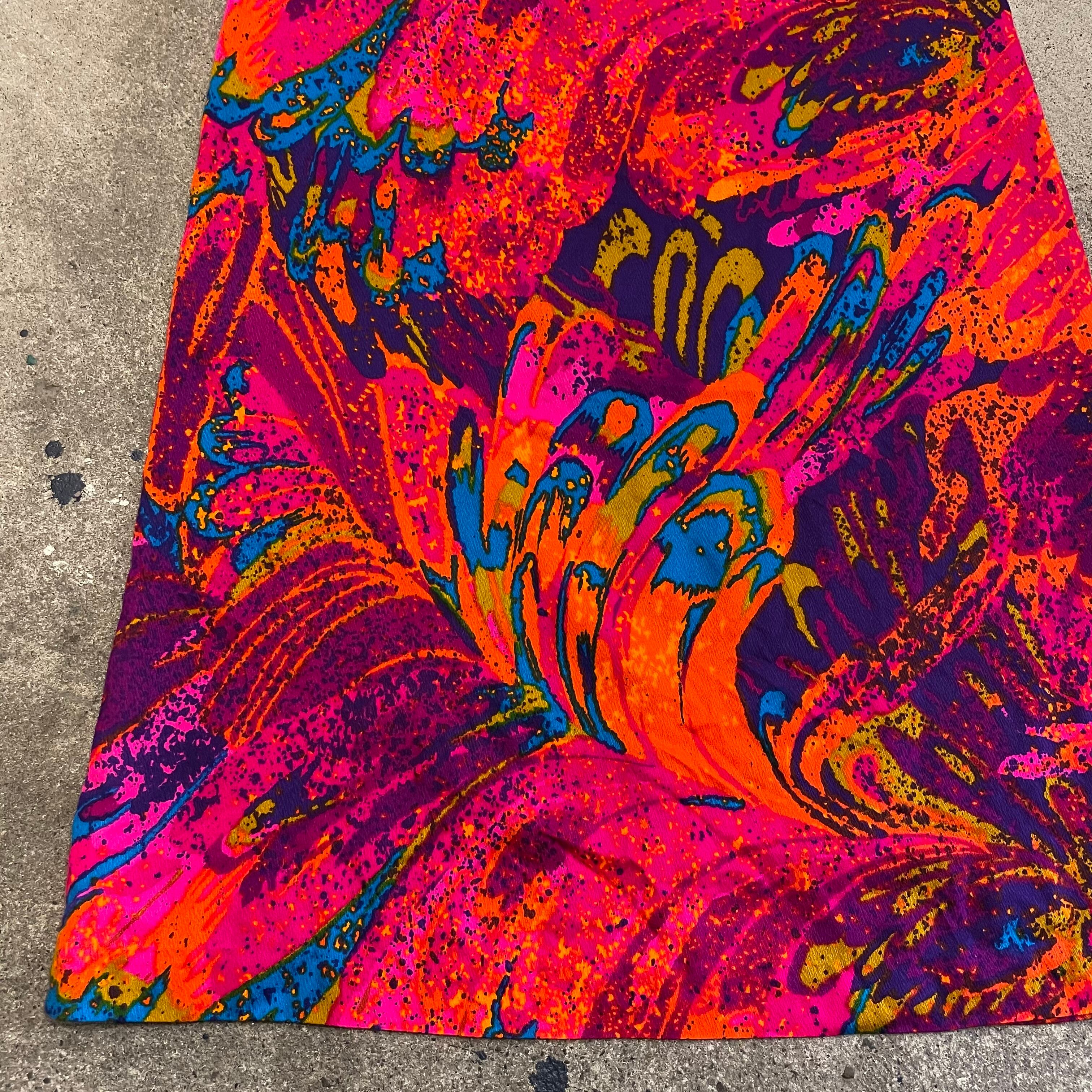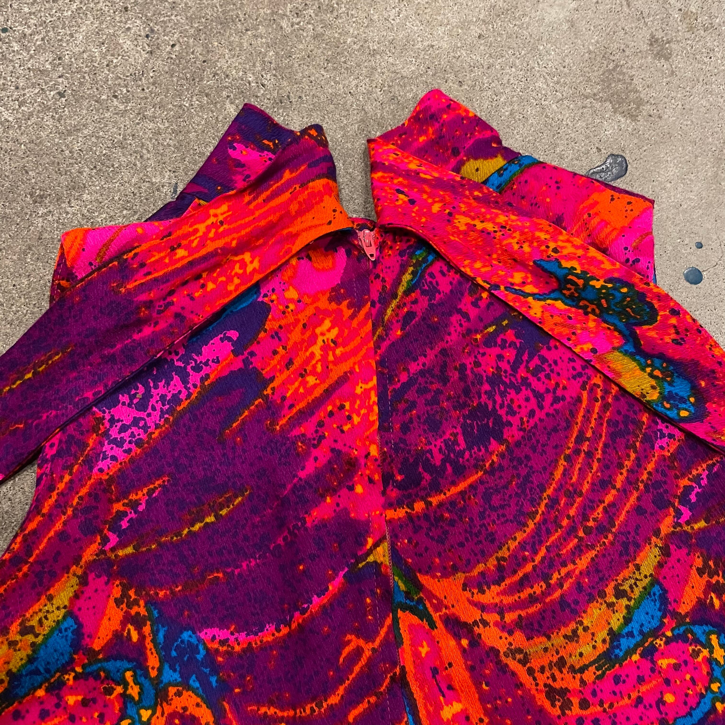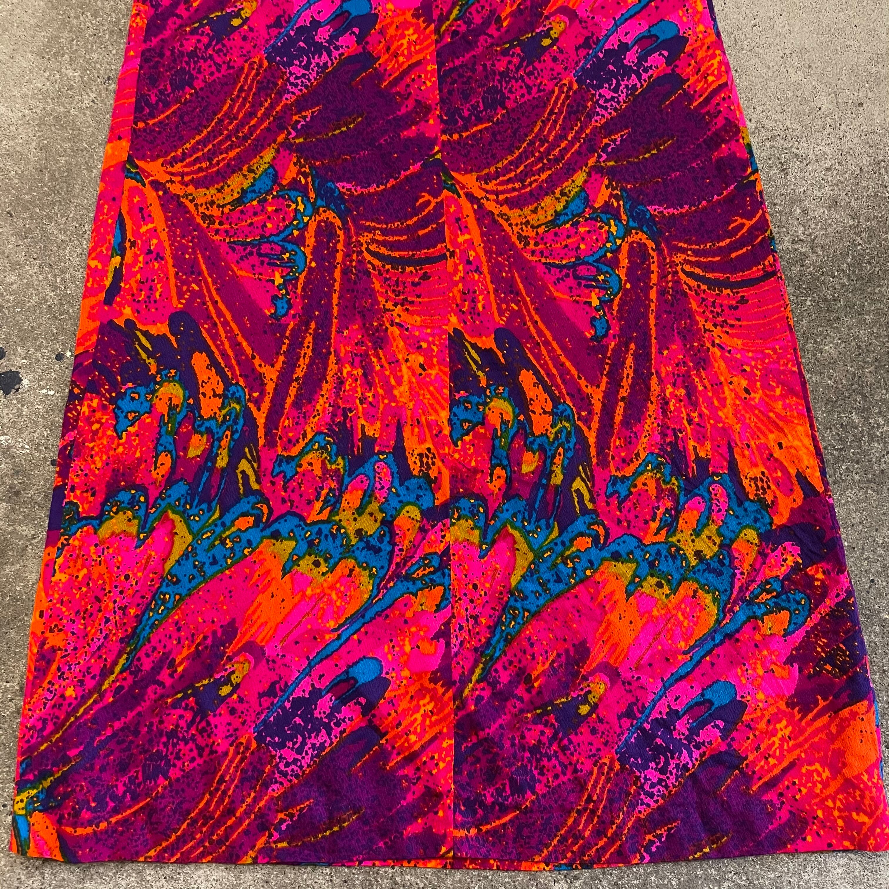 花火のような、鳥のような、ほとばしるエネルギー!というようなサイケデリックで素敵な模様がとてもかっこいいワンピースです。