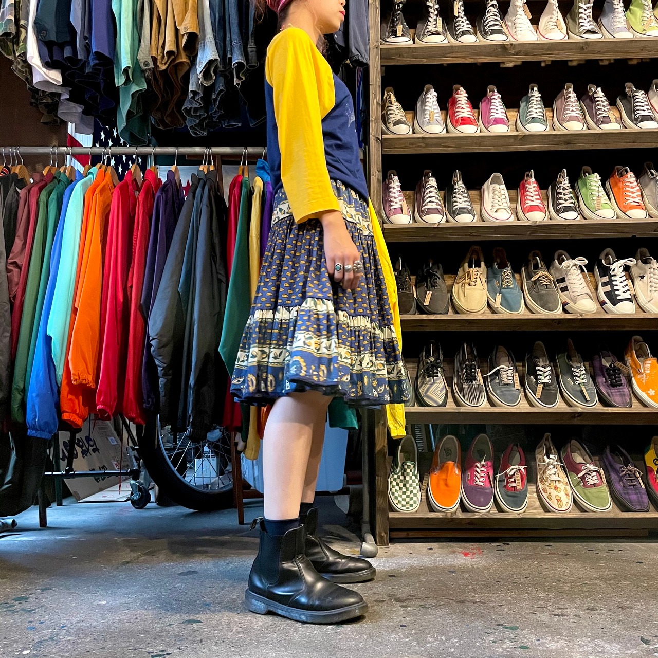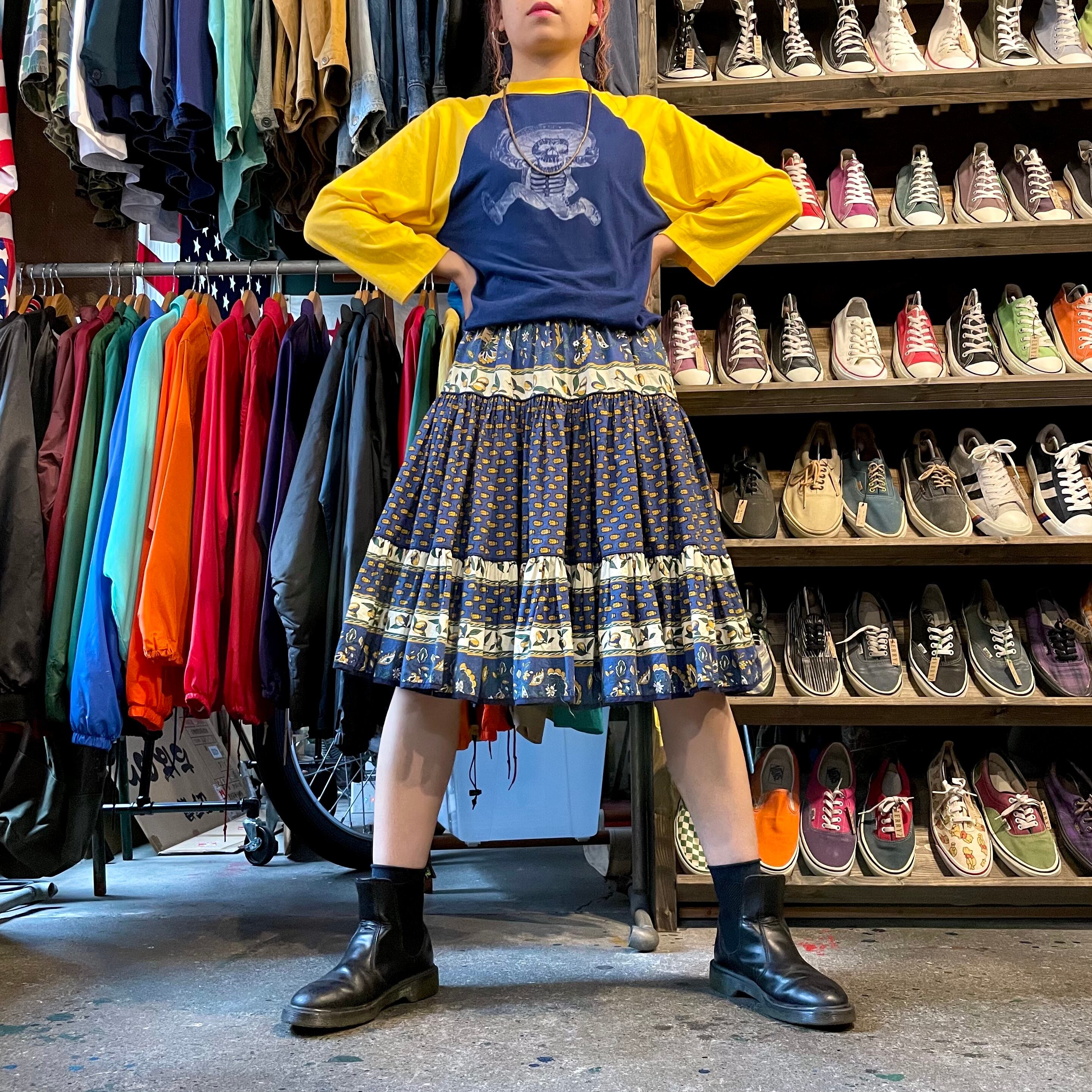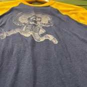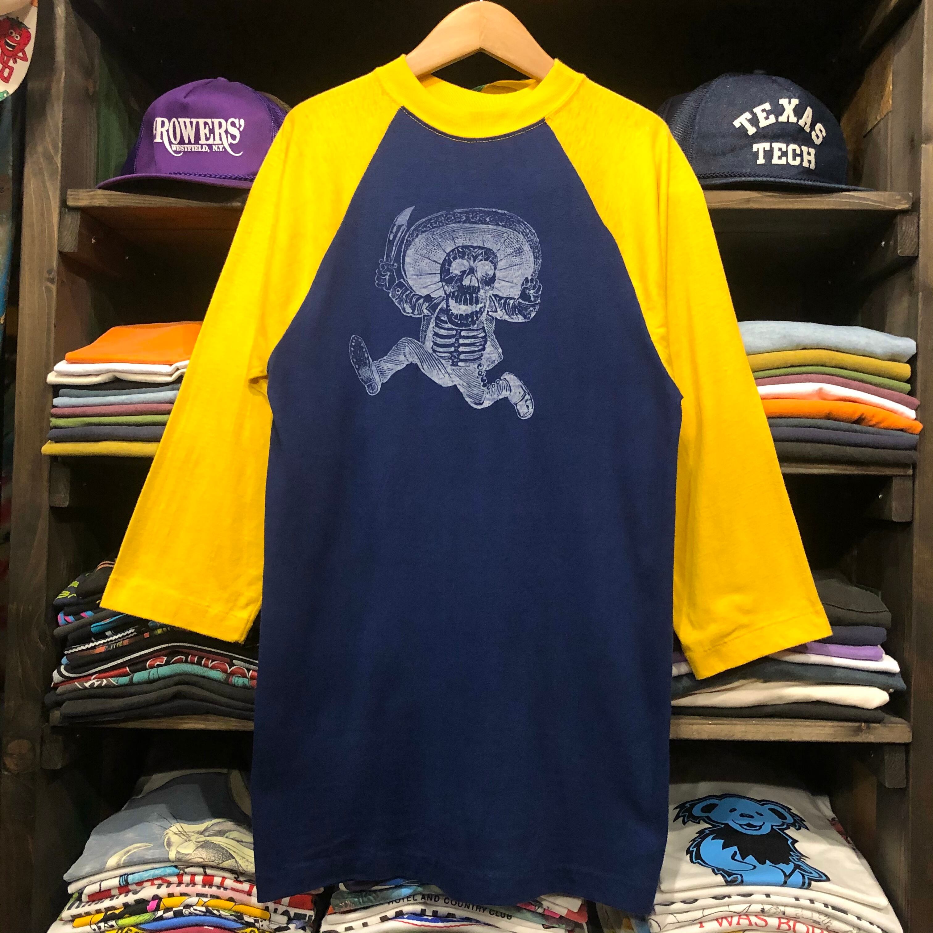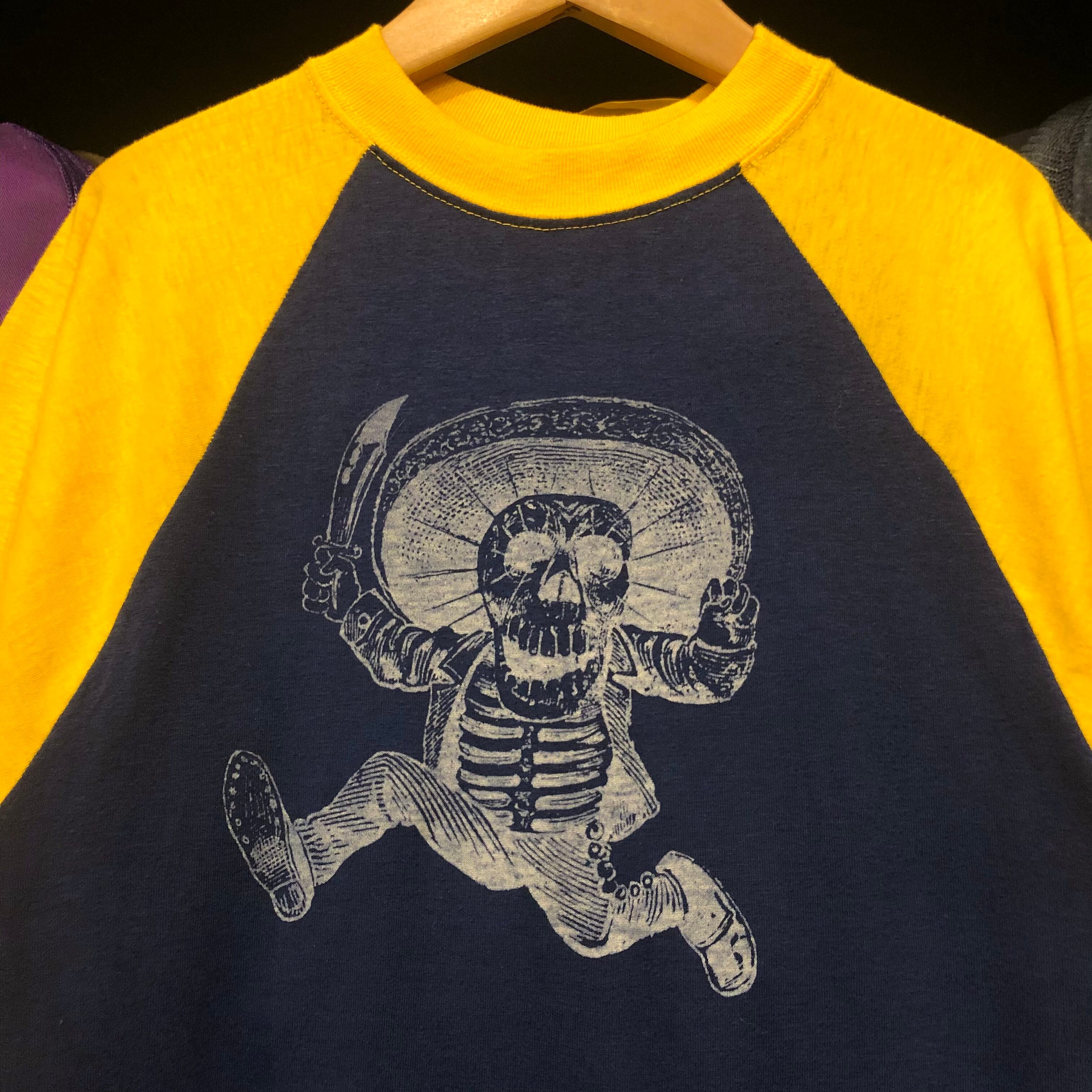ネイビー×黄色にメキシカンなガイコツの海賊?がプリントされたラグランスリーブTシャツです。