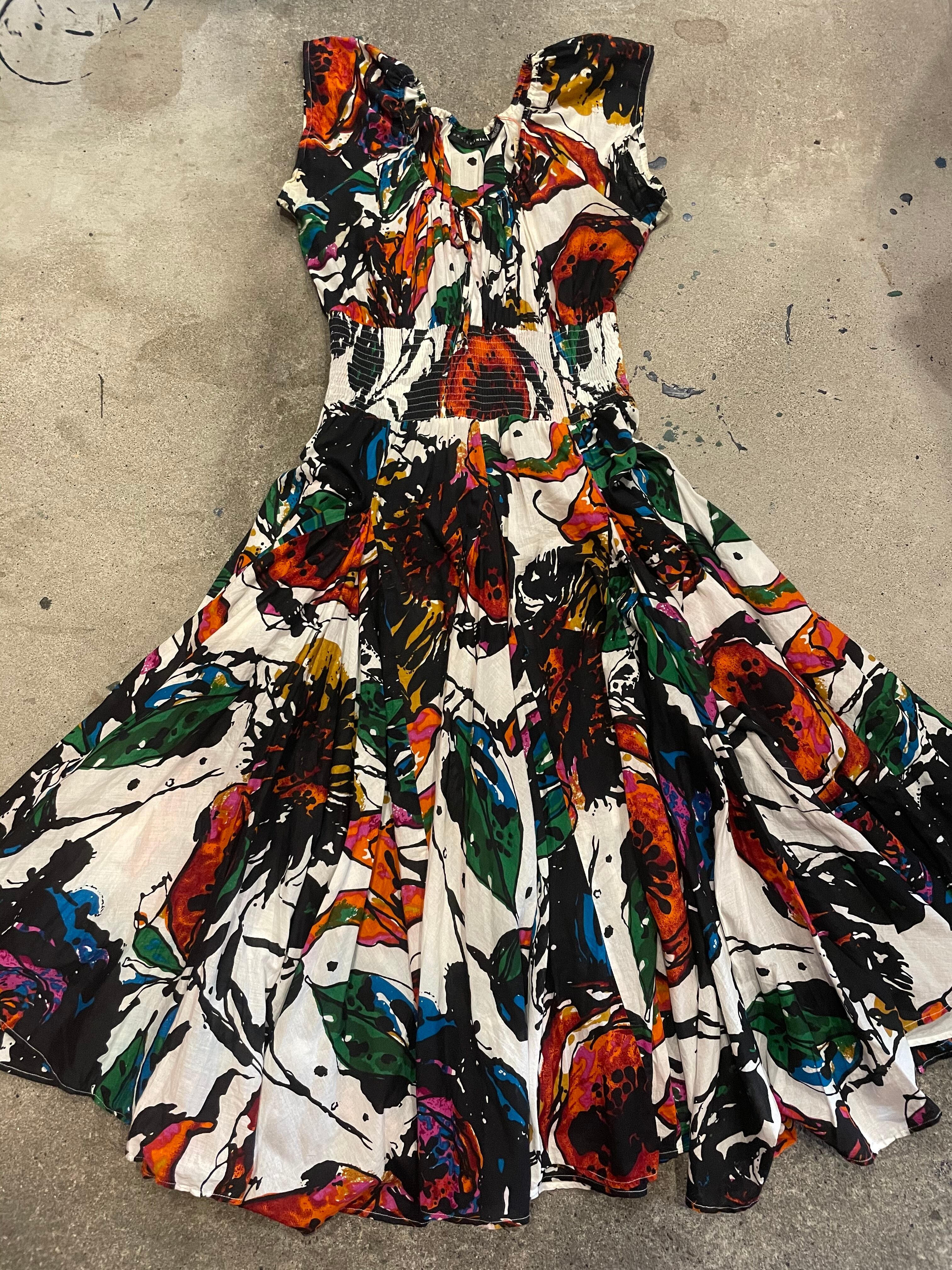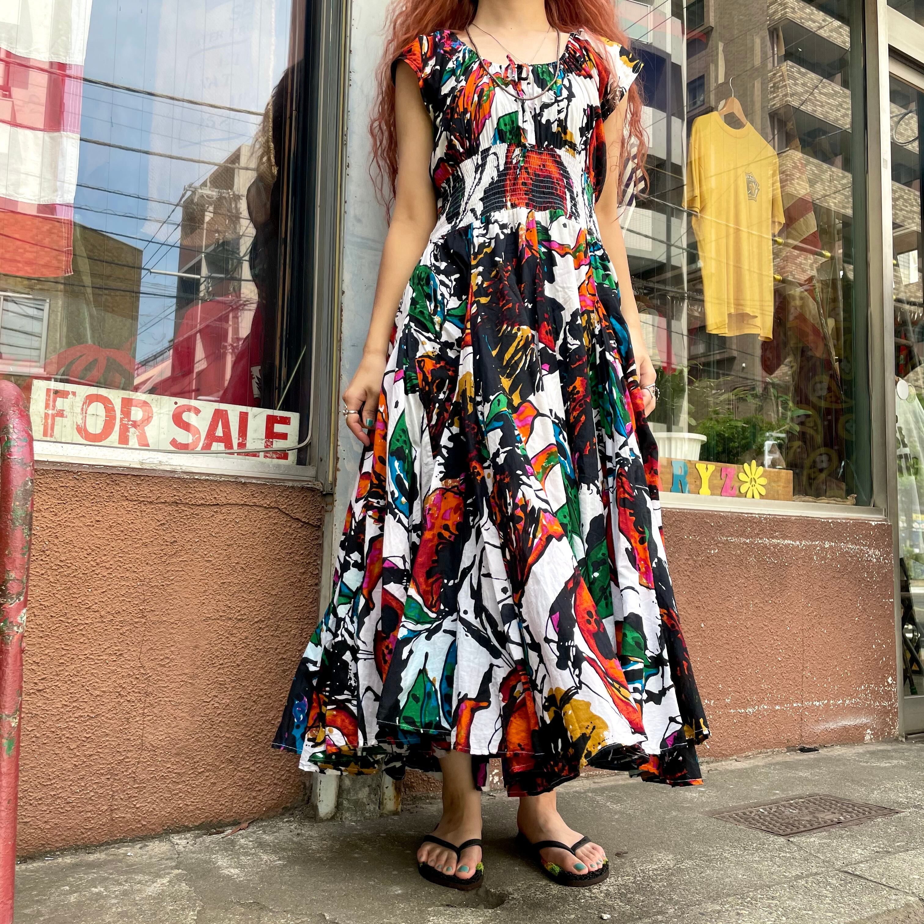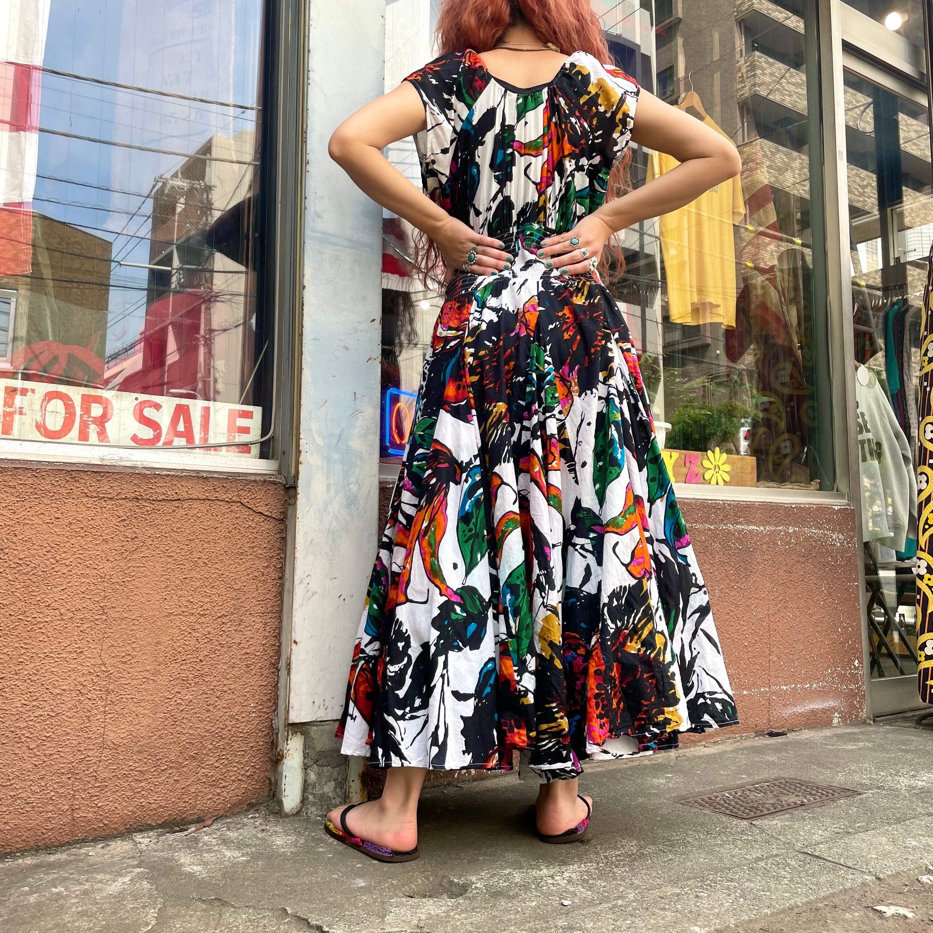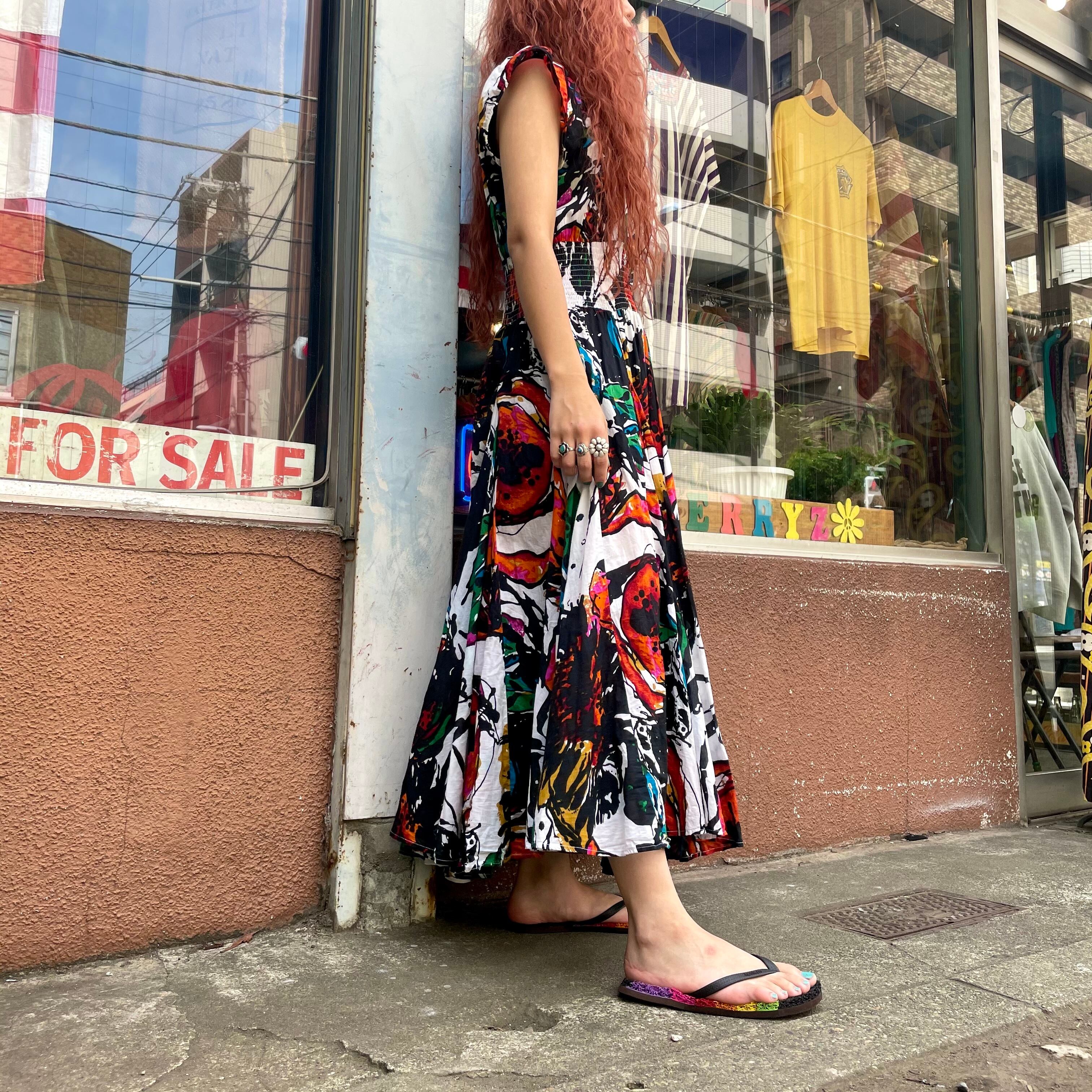 白地に植物なのか果物なのか素敵な柄のワンピースです。かなり薄手のコットンでスカート部分にはかなりのボリュームがあり、ヒラヒラと風になびいてとてもかわいいシルエットです。
