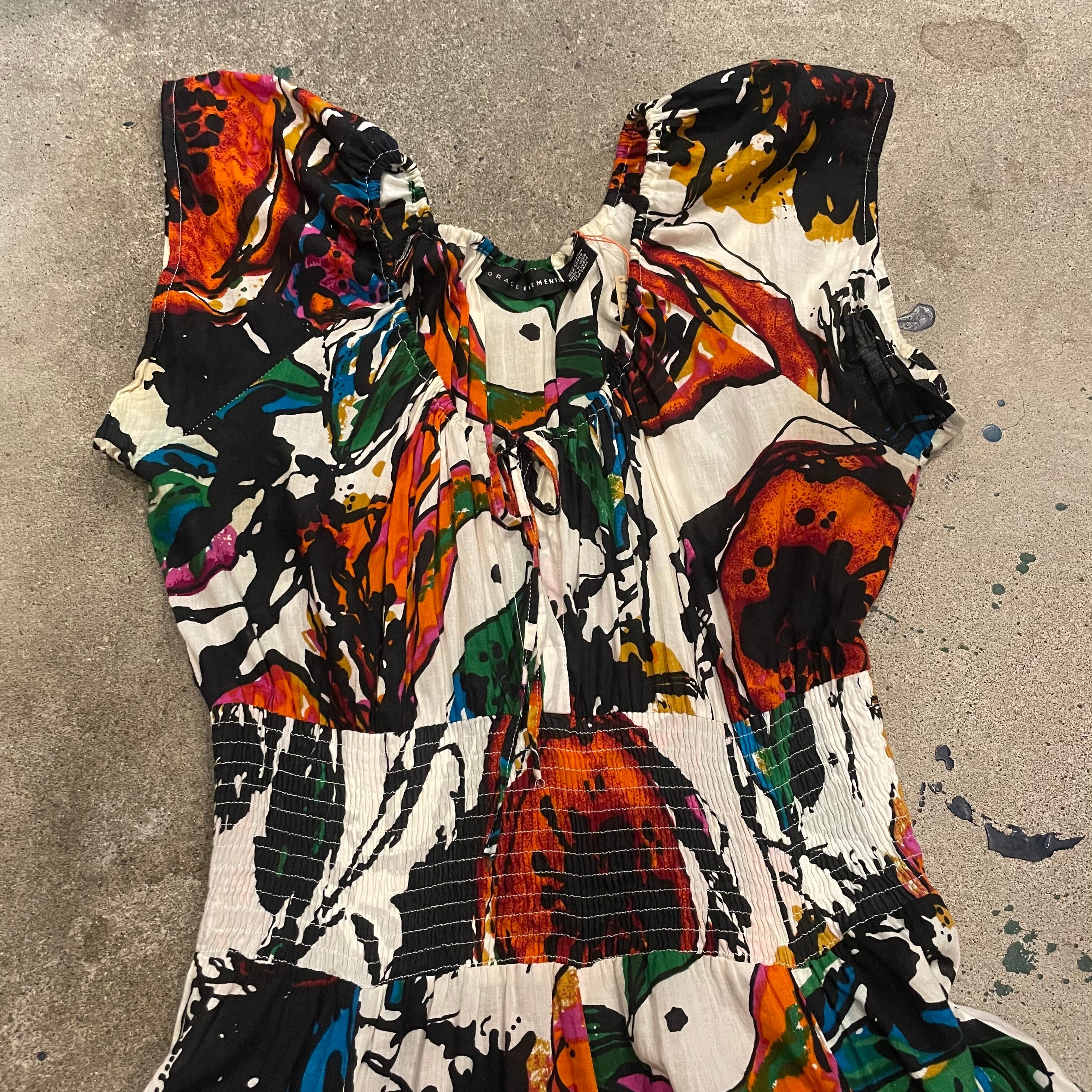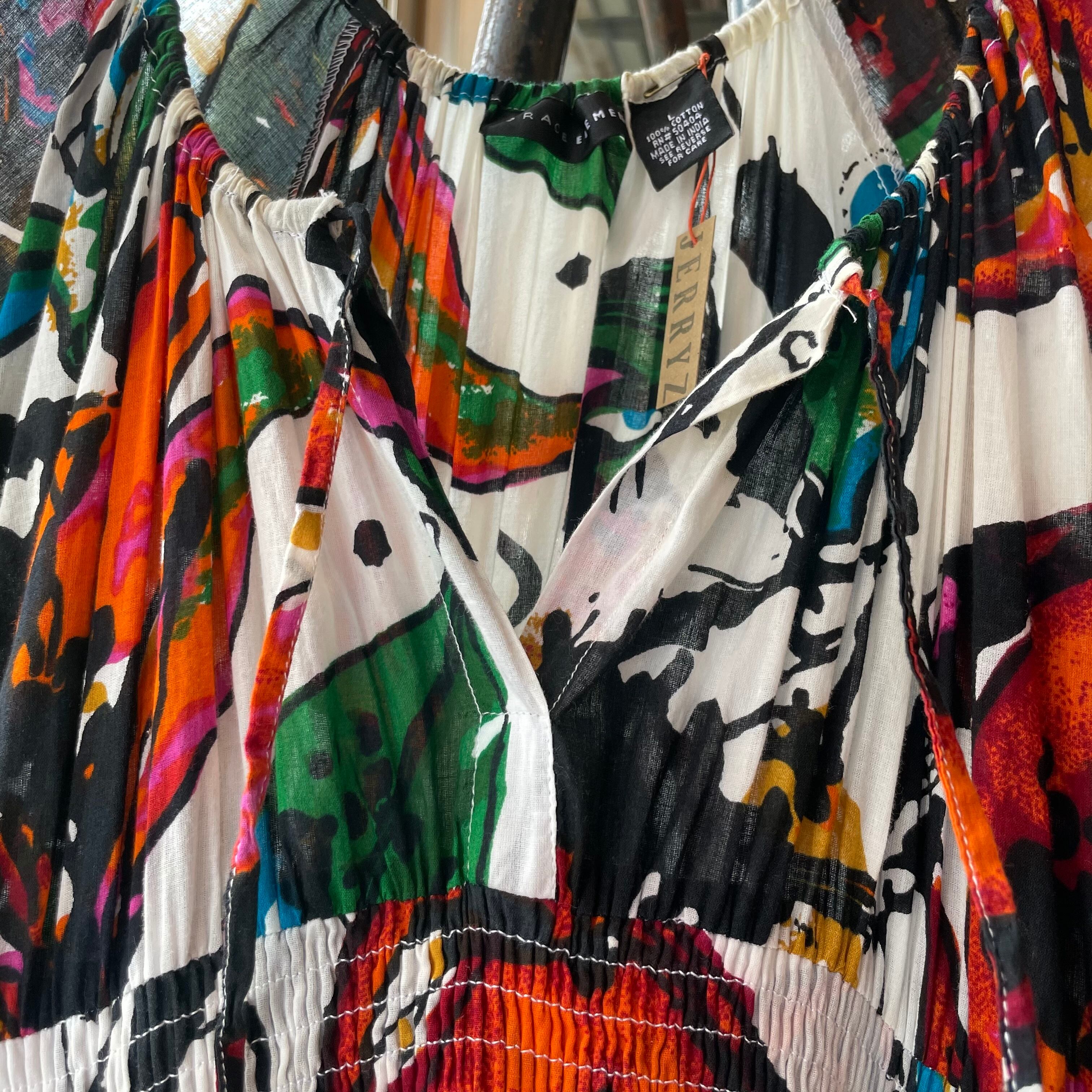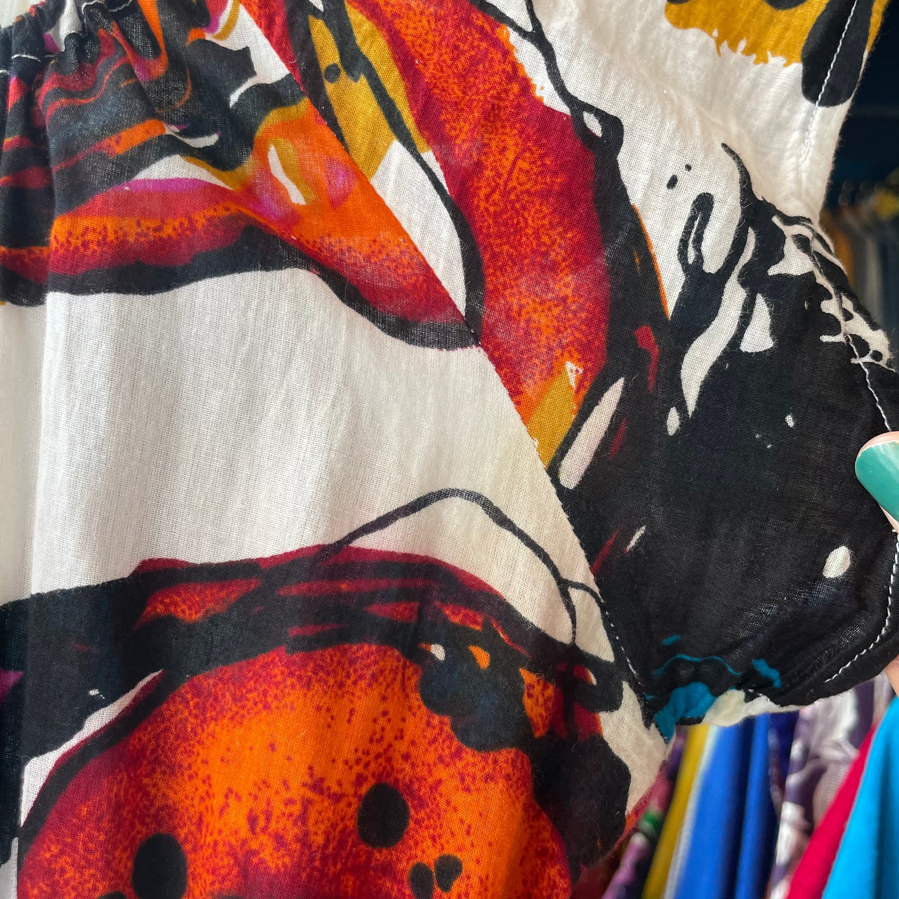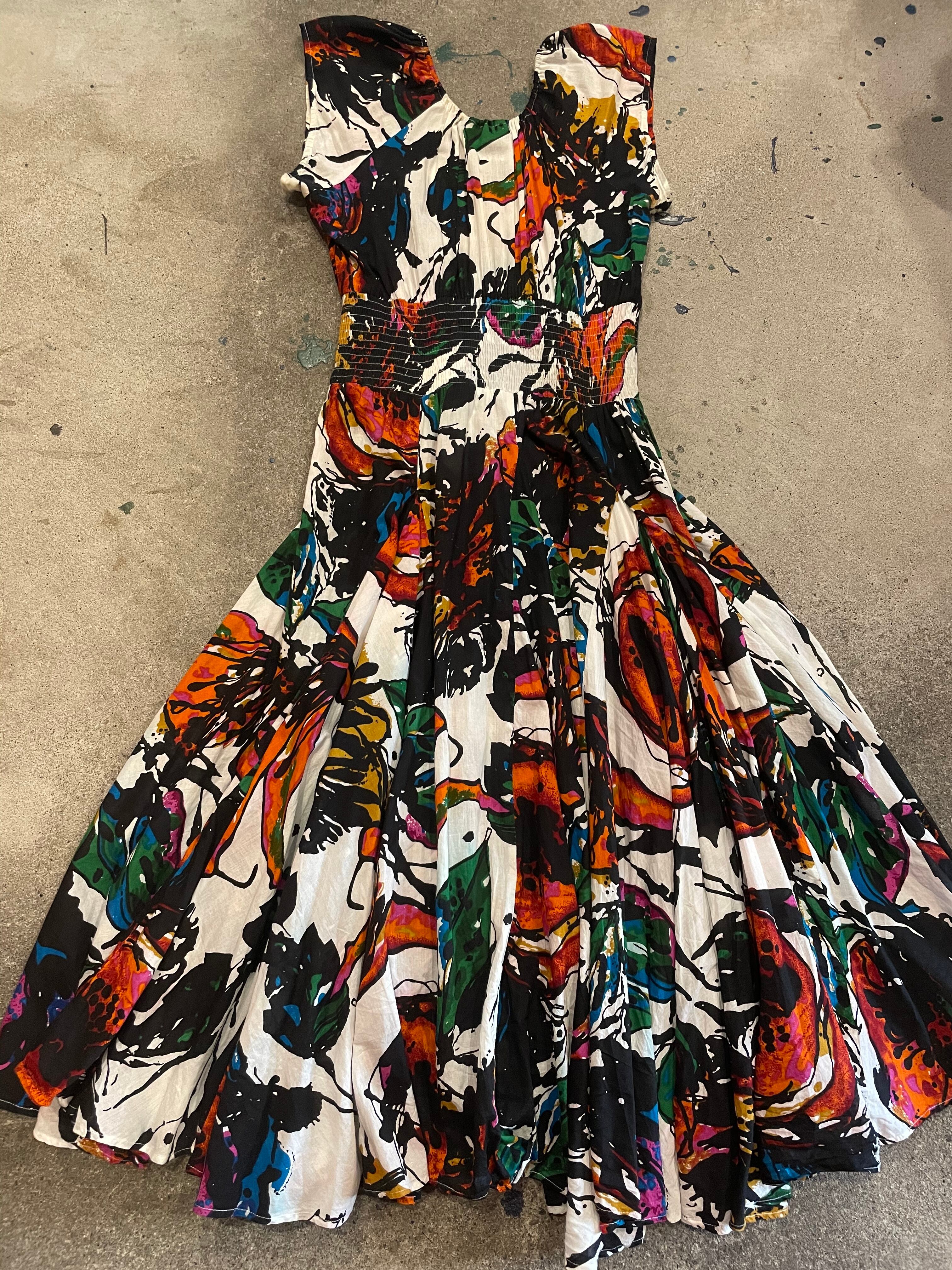 白地に植物なのか果物なのか素敵な柄のワンピースです。かなり薄手のコットンでスカート部分にはかなりのボリュームがあり、ヒラヒラと風になびいてとてもかわいいシルエットです。