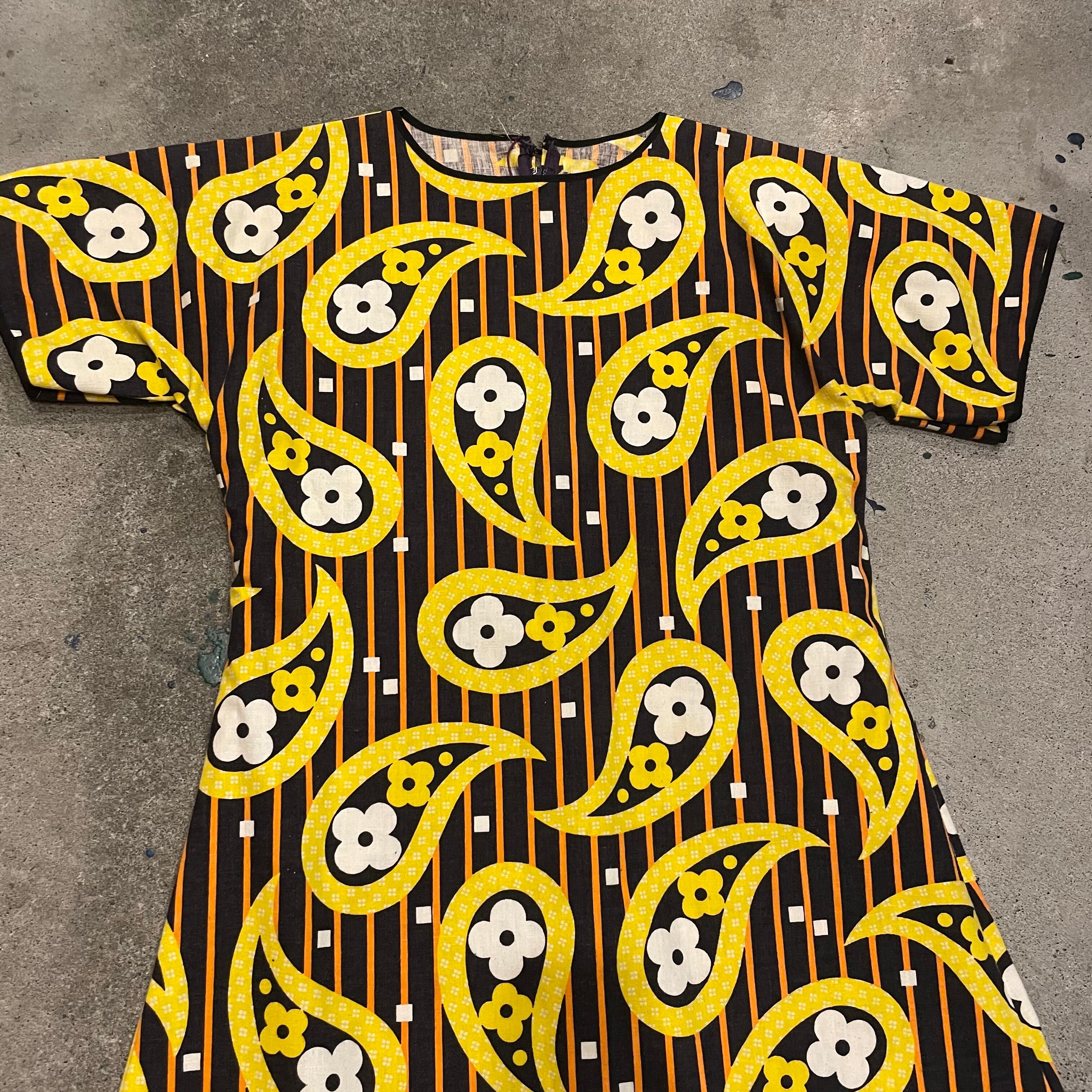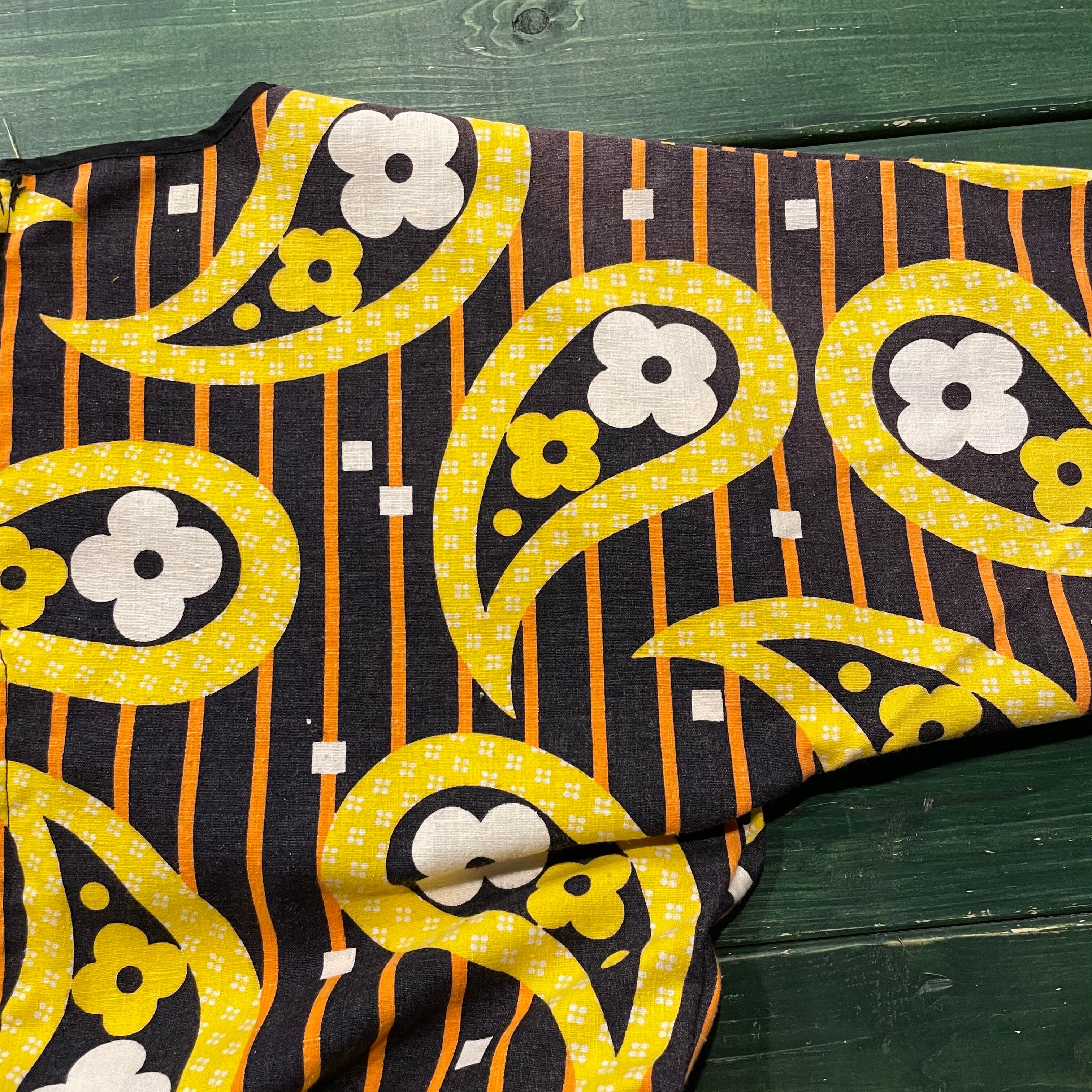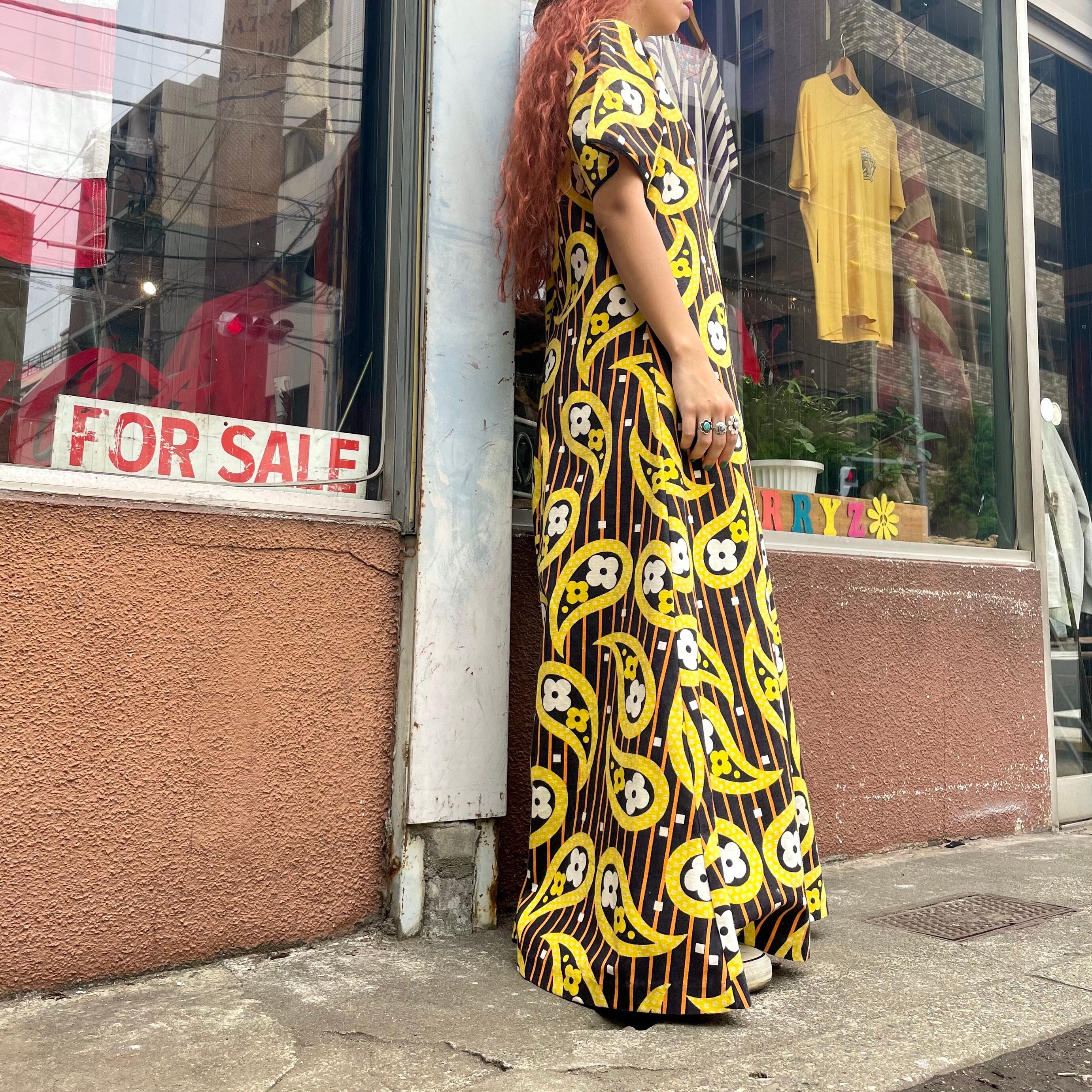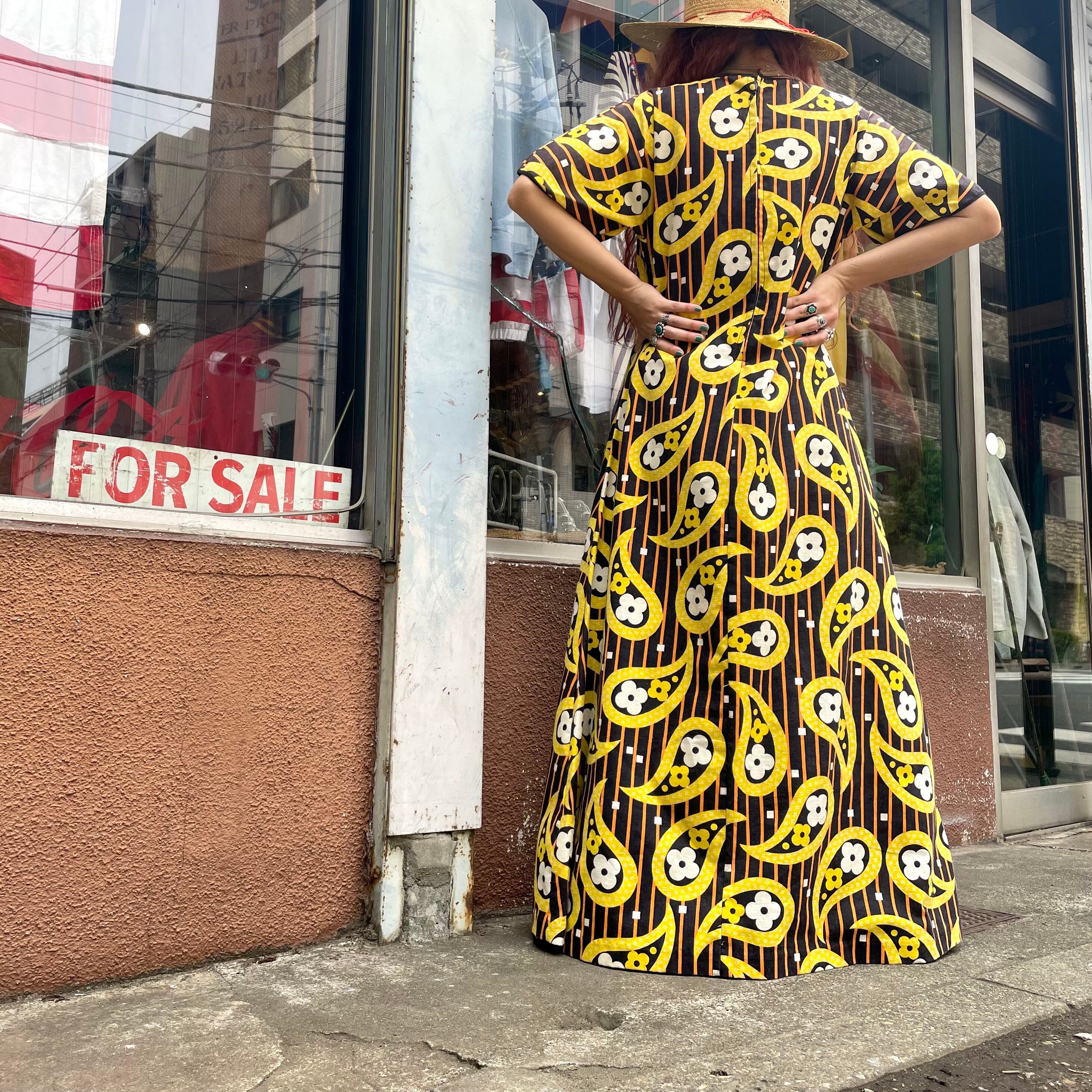 ストライプにペイズリーの大胆な柄がインパクトがあってかわいいワンピースです。おそらくハンドメイドのもので、シンプルな作りではありますが、不思議な雰囲気が魅力的な一着です。フリンジのベストを合わせたり、ベルトでウエストマークしても印象が変わって楽しそうですね!
