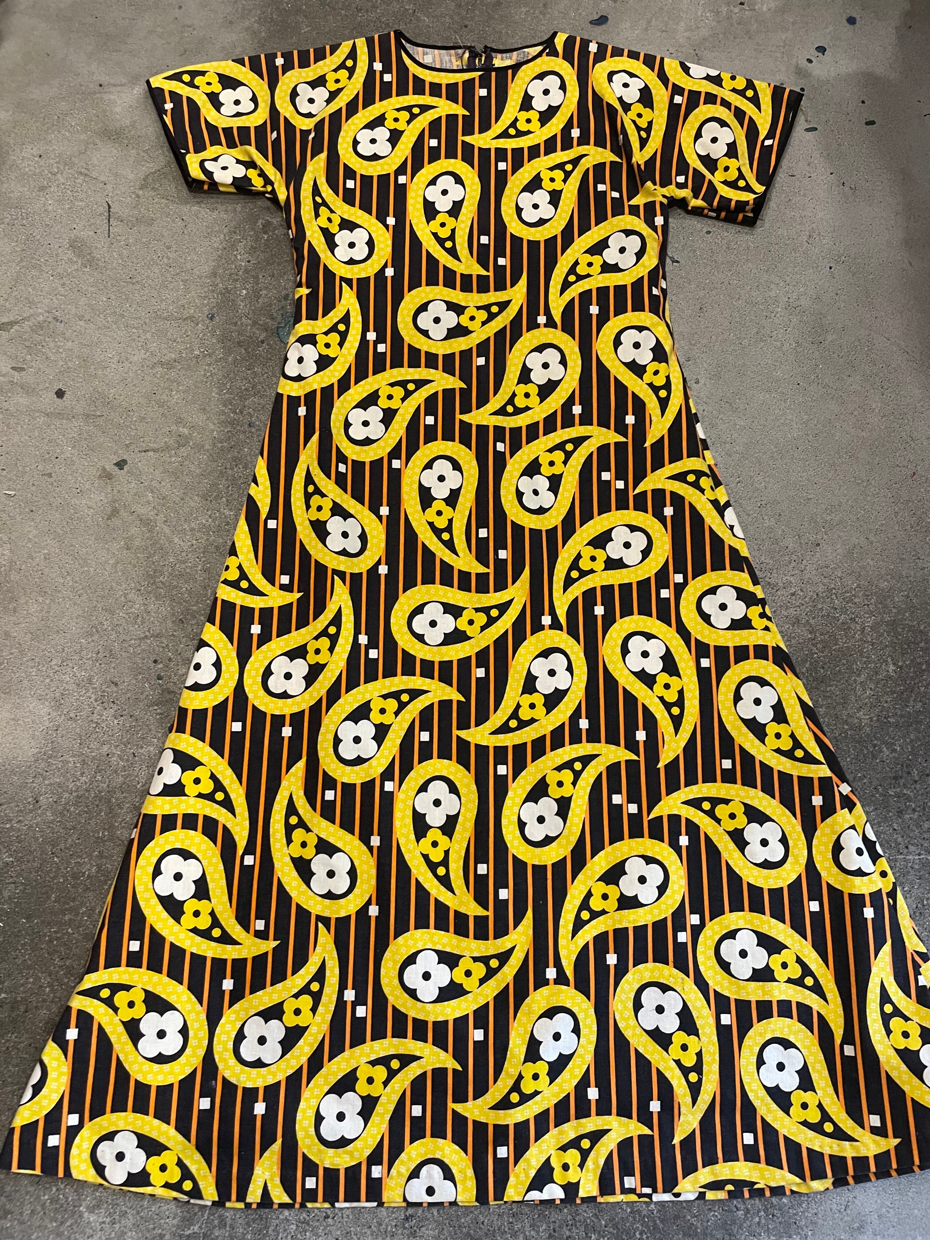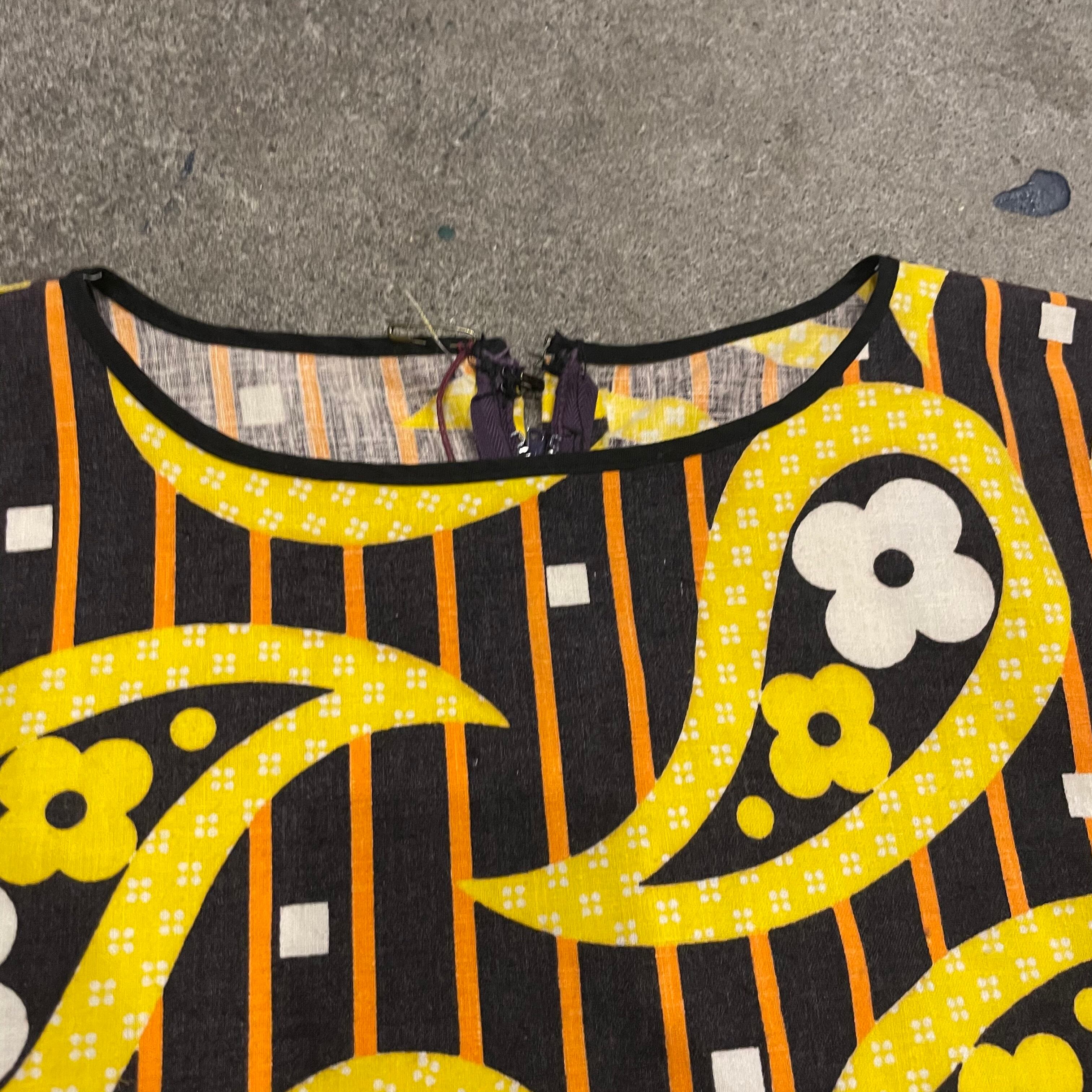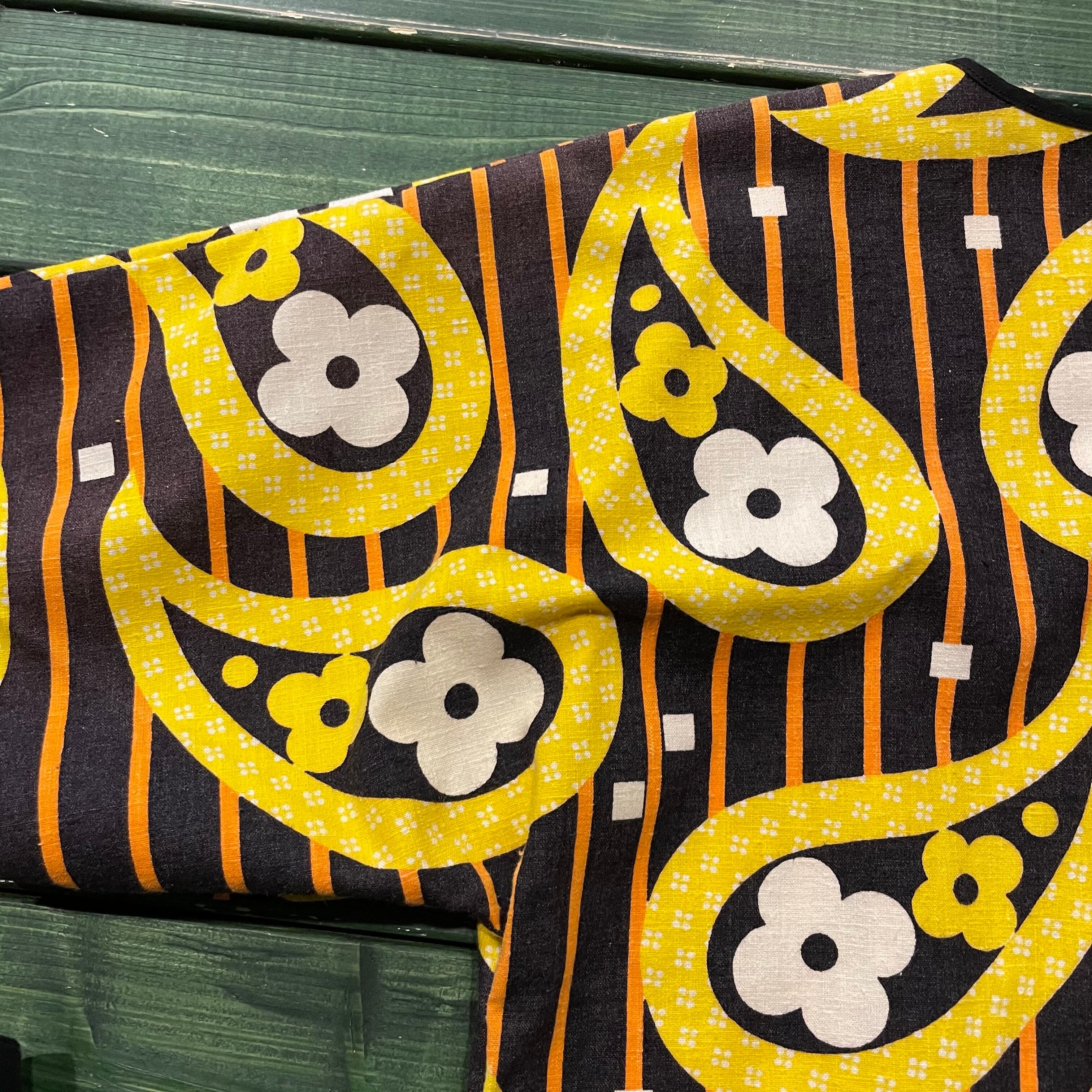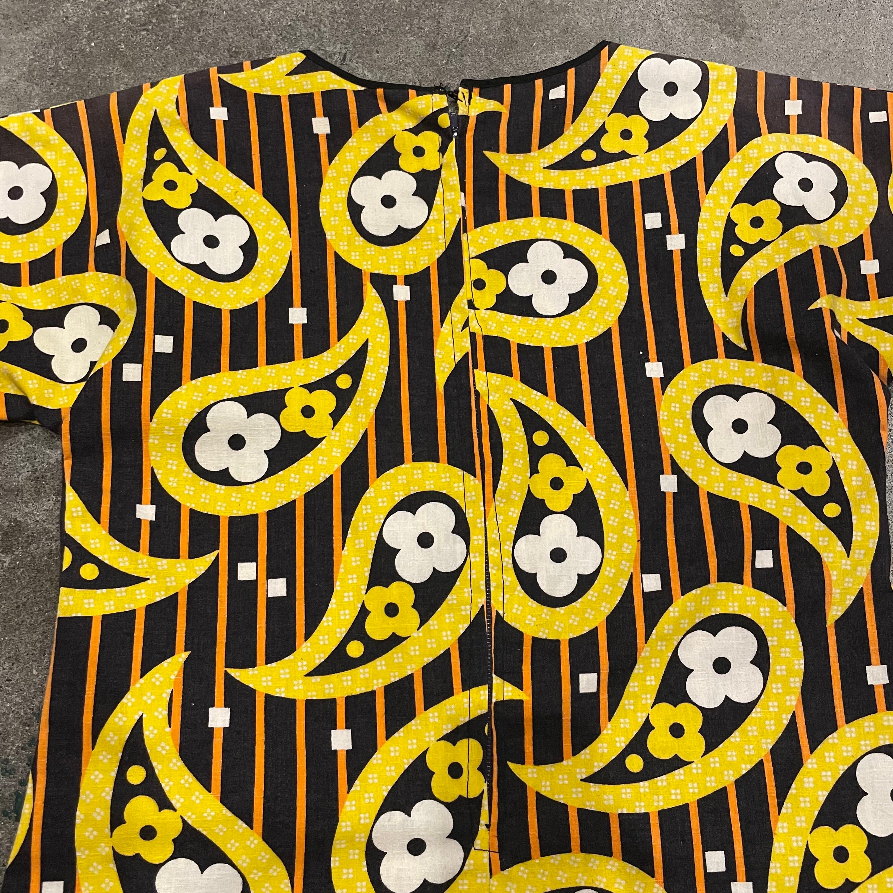 ストライプにペイズリーの大胆な柄がインパクトがあってかわいいワンピースです。おそらくハンドメイドのもので、シンプルな作りではありますが、不思議な雰囲気が魅力的な一着です。フリンジのベストを合わせたり、ベルトでウエストマークしても印象が変わって楽しそうですね!