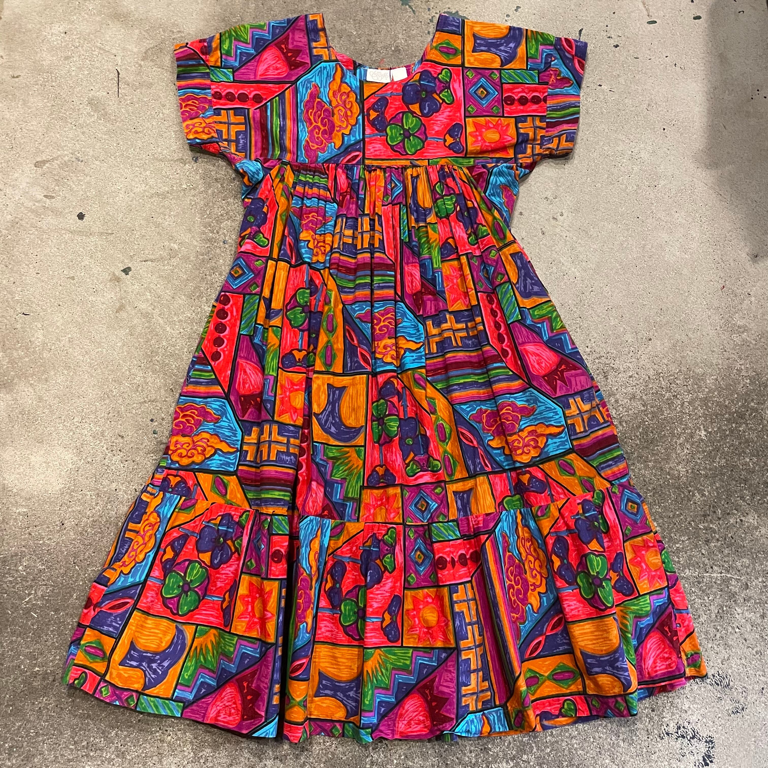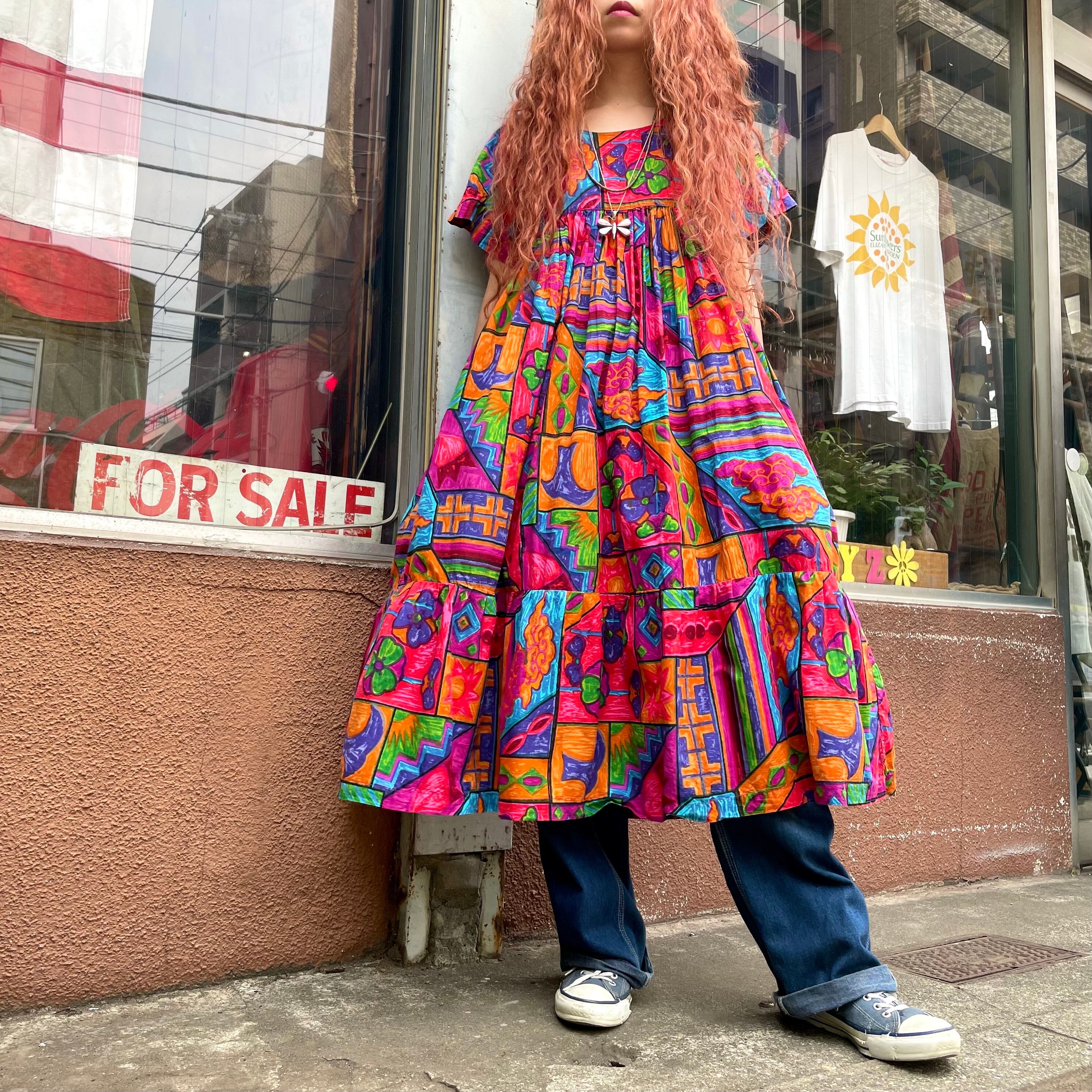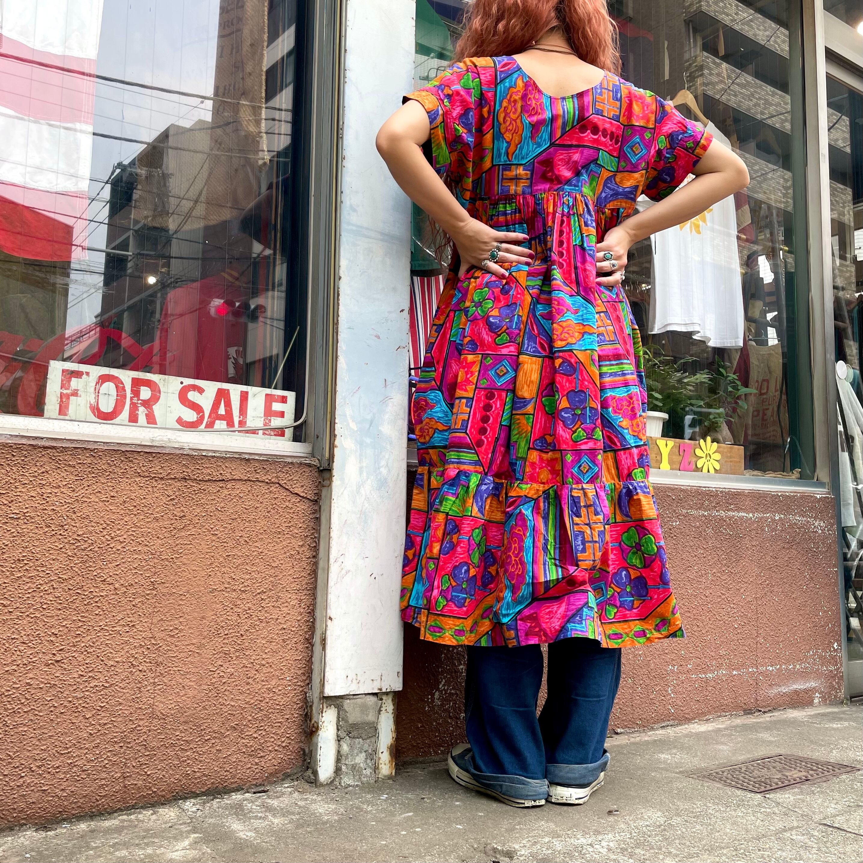鮮やかな色味が弾けていてかわいいワンピースです。絵画のような模様も素敵です。