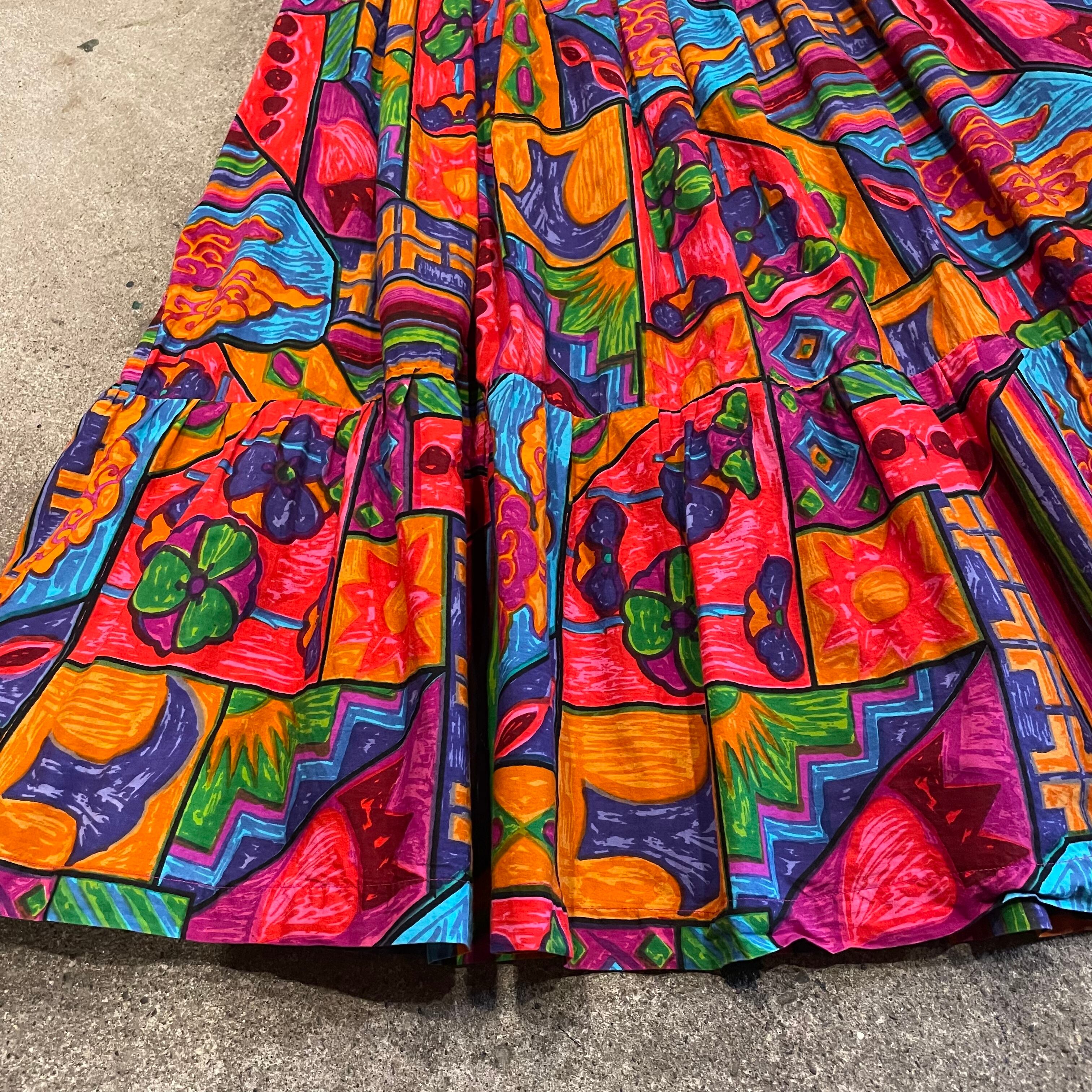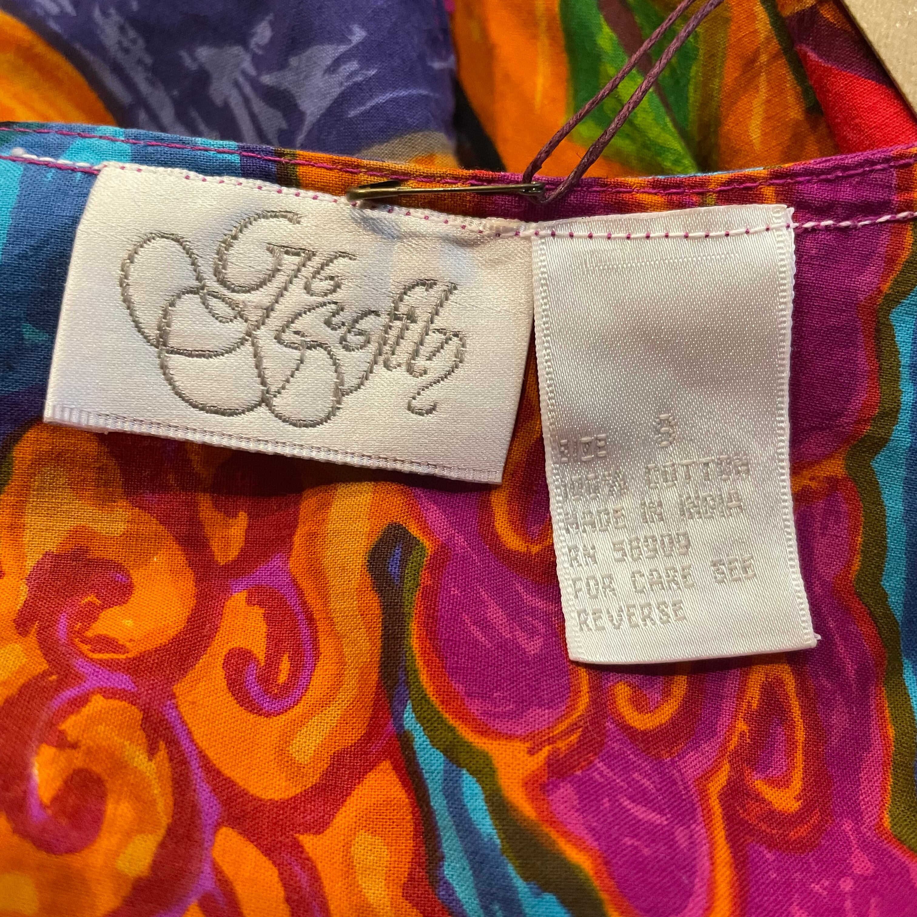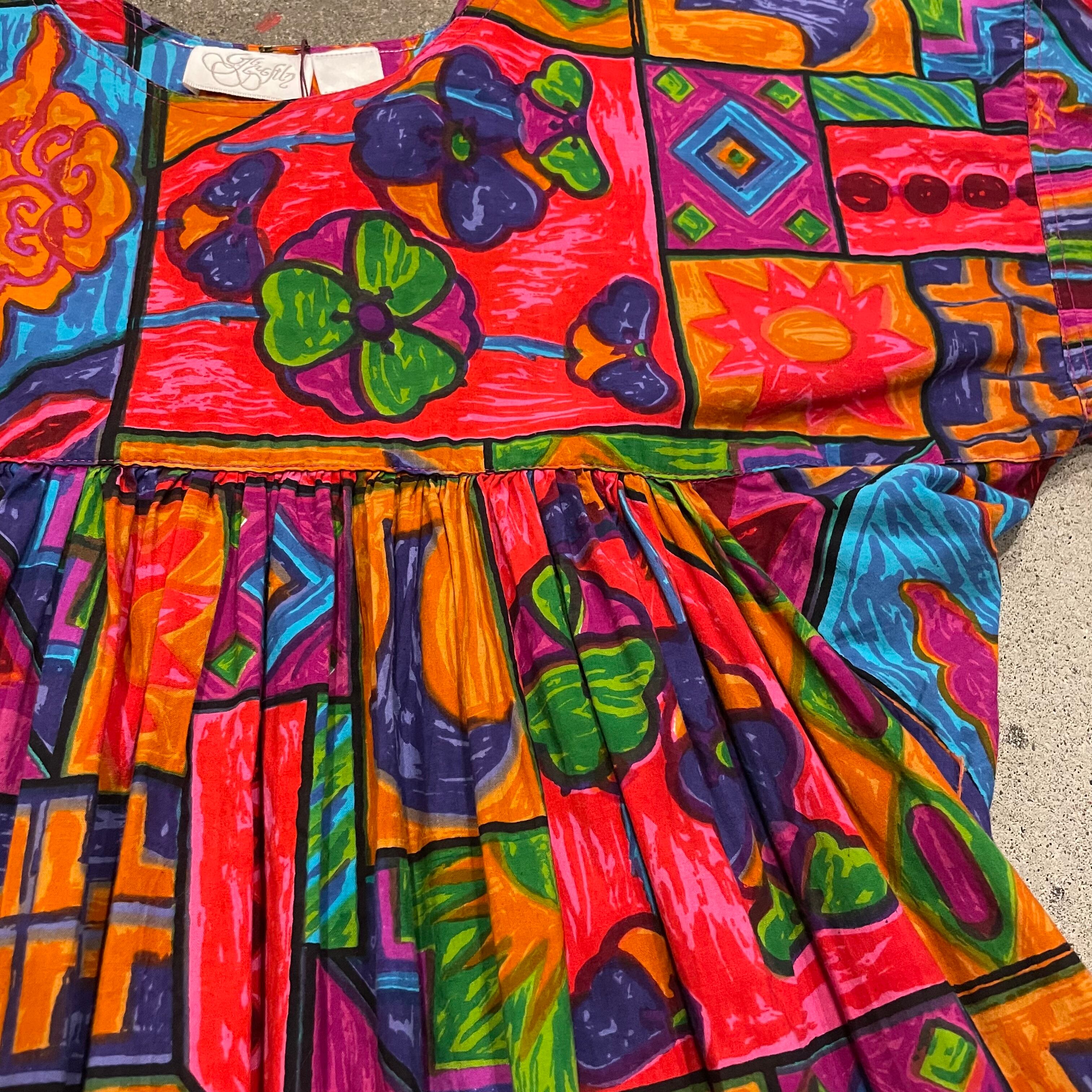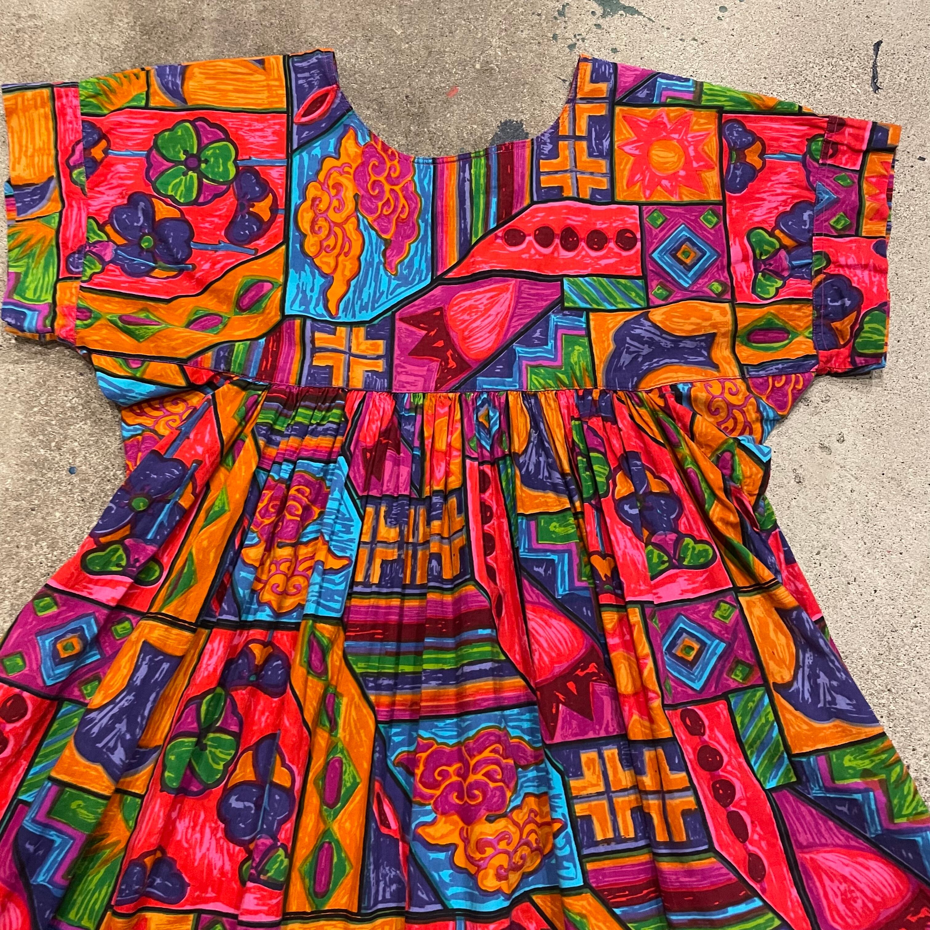 鮮やかな色味が弾けていてかわいいワンピースです。絵画のような模様も素敵です。