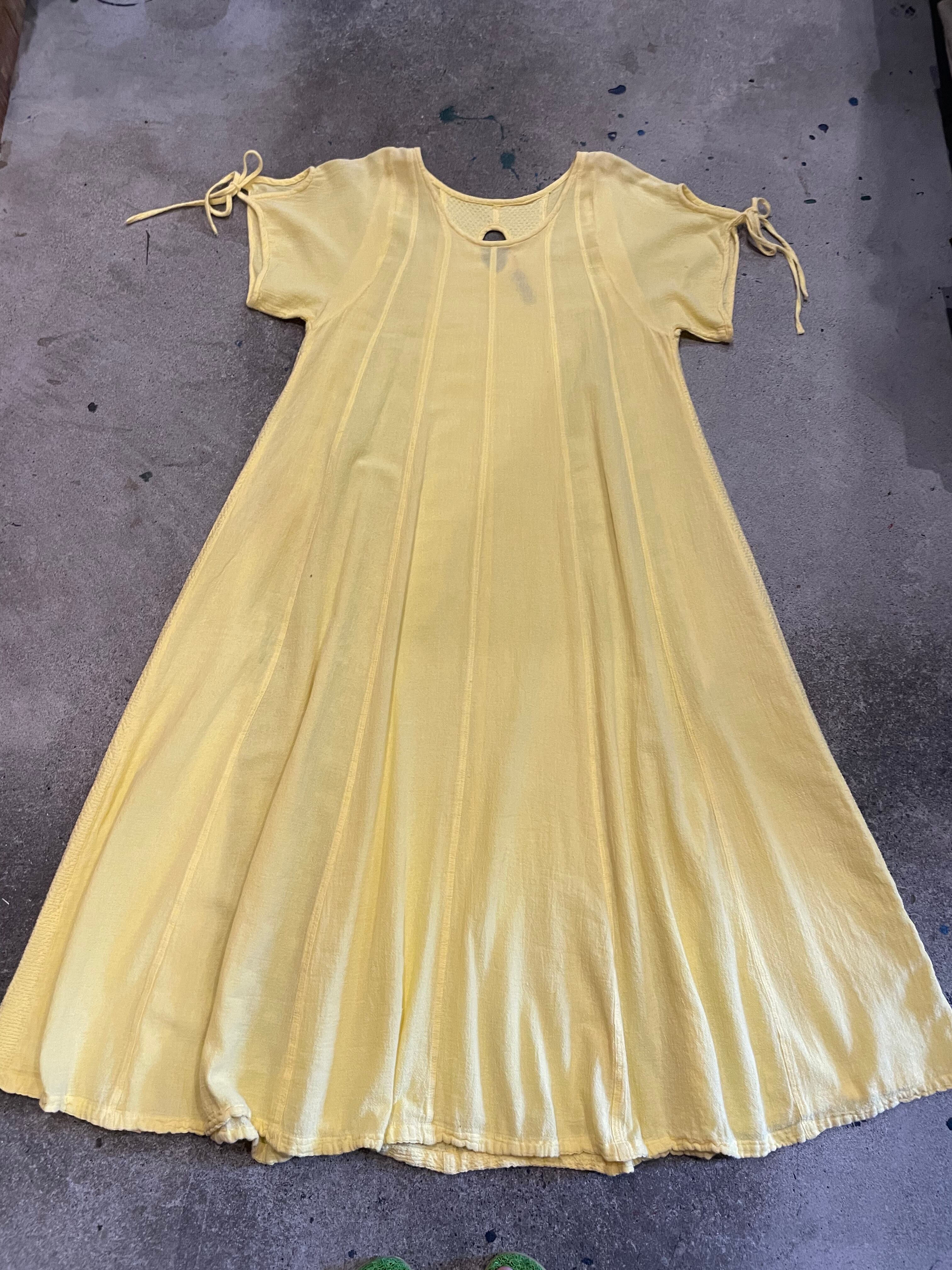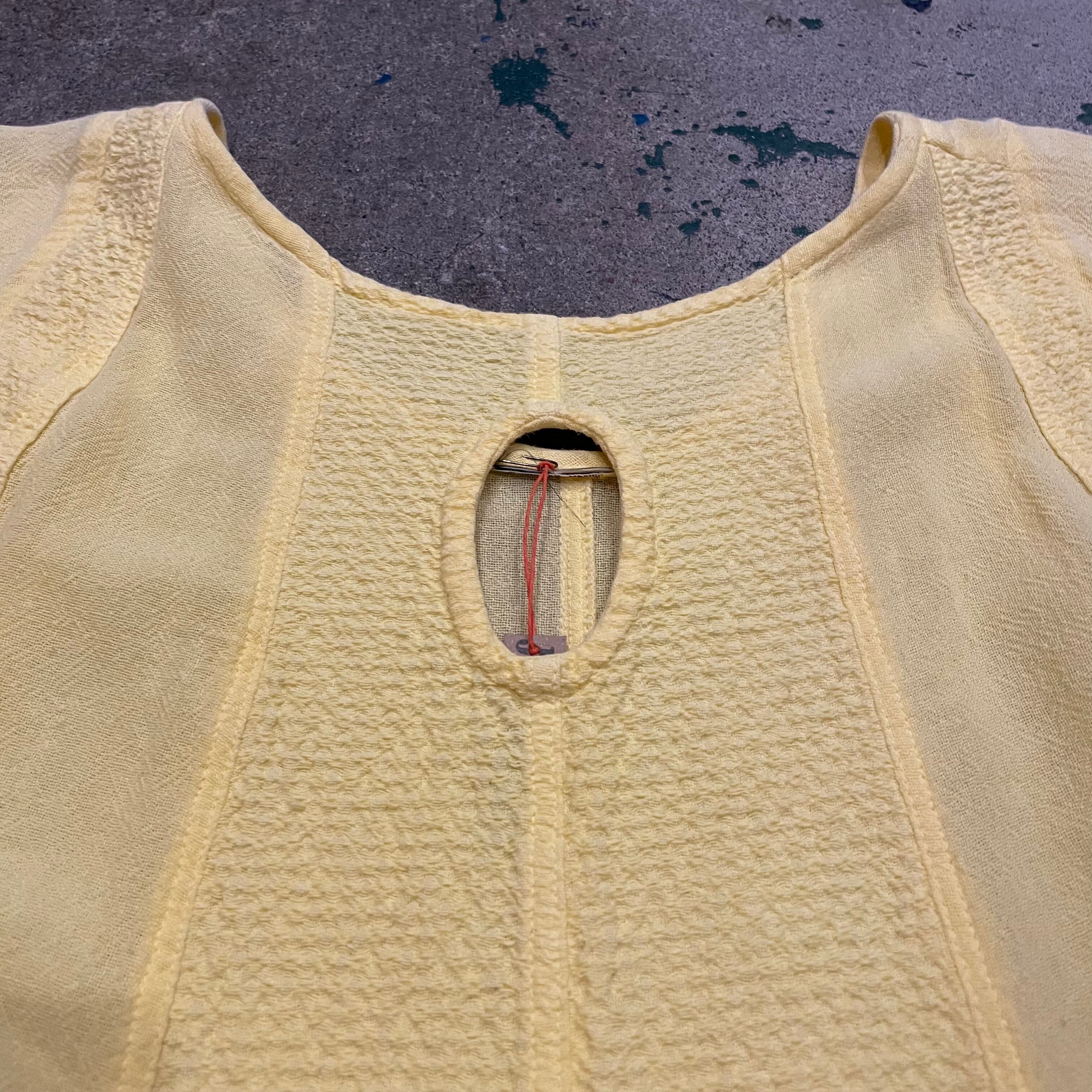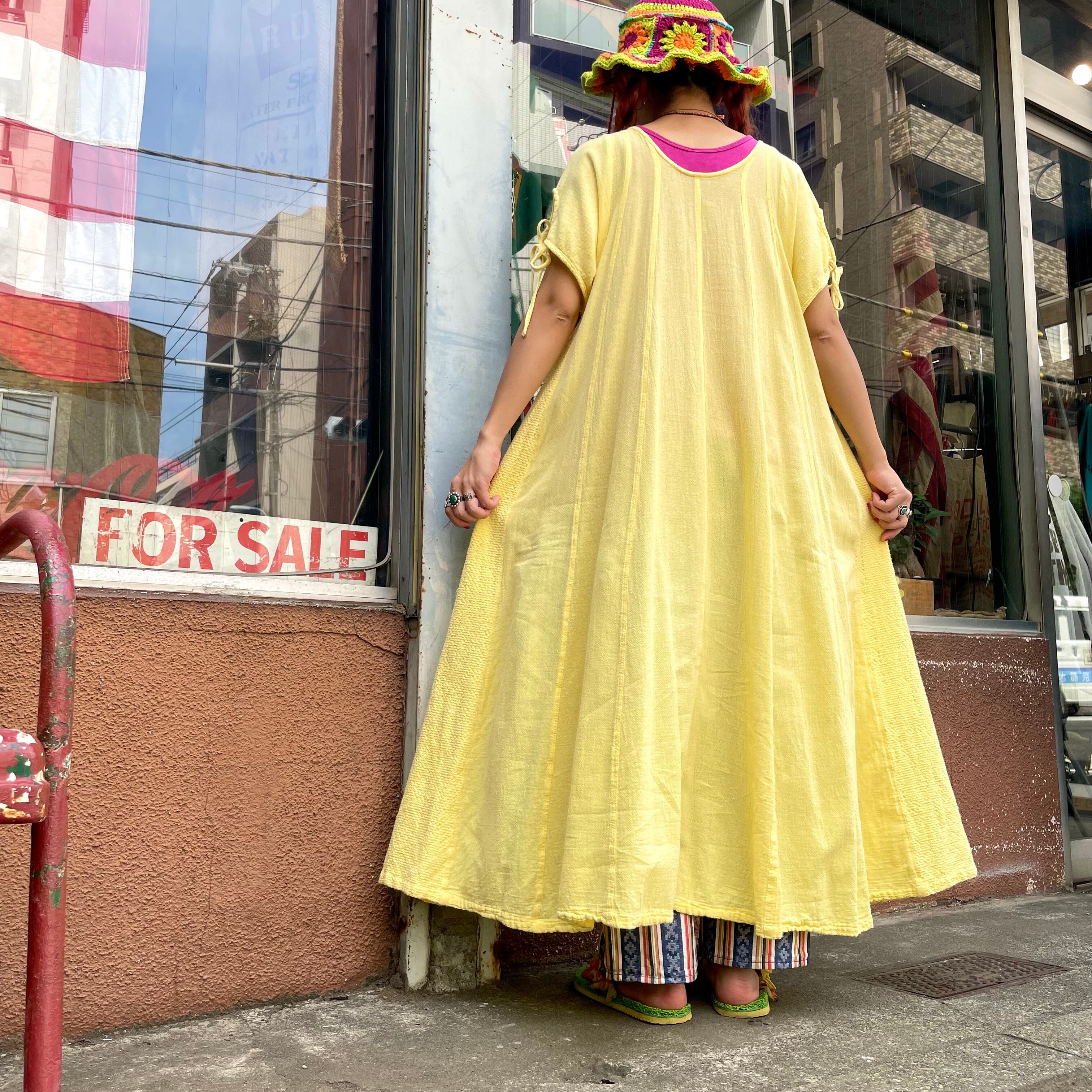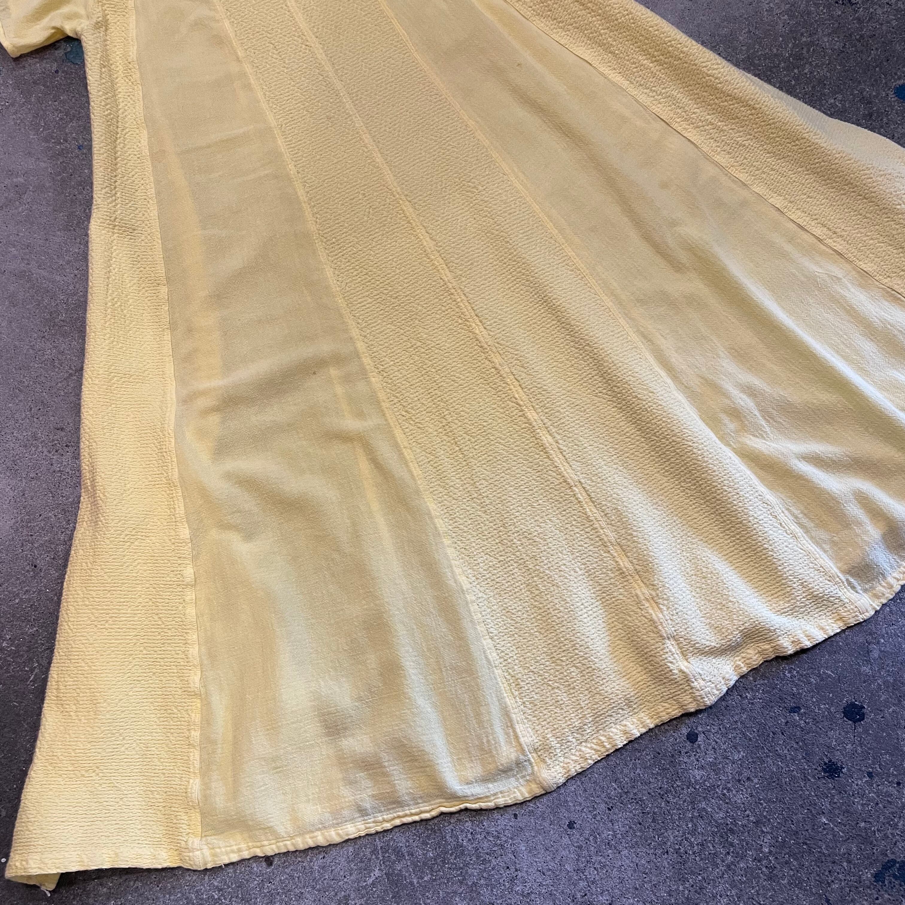 クリームイエローがかわいいロングワンピースです。写真では丸い穴の方を前に着ていますが、逆に着てもかわいいと思います。丸の方は凹凸のある素材と切り替えになっていたり、全体的に放射状の切り替えがきれいなシルエットになっています。袖のデザインも凝っていてすてきです。