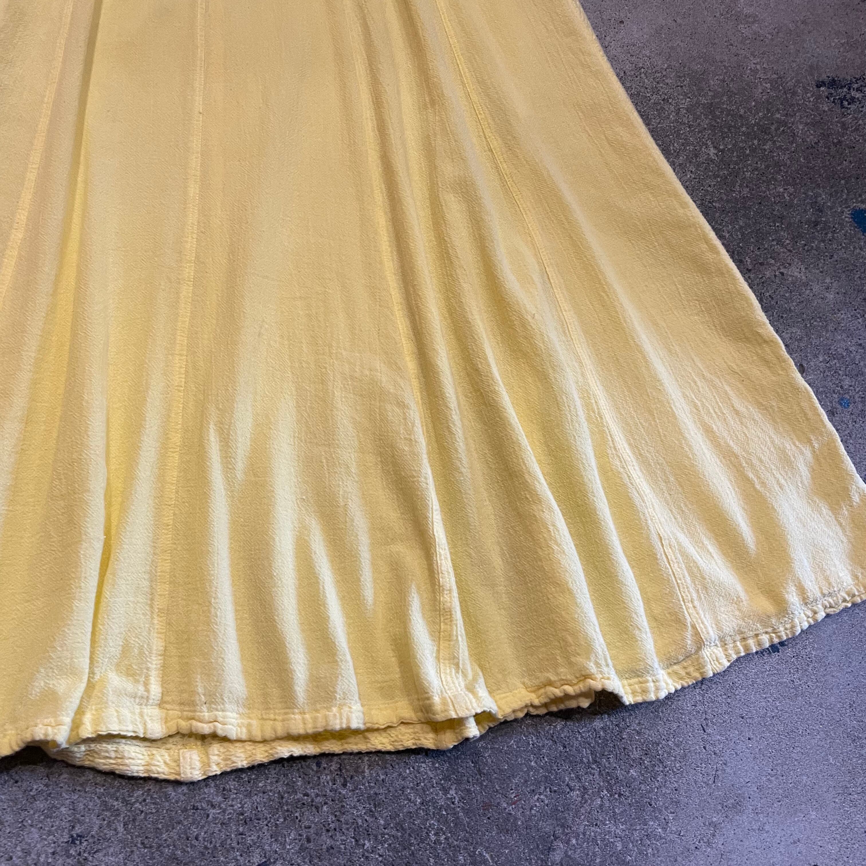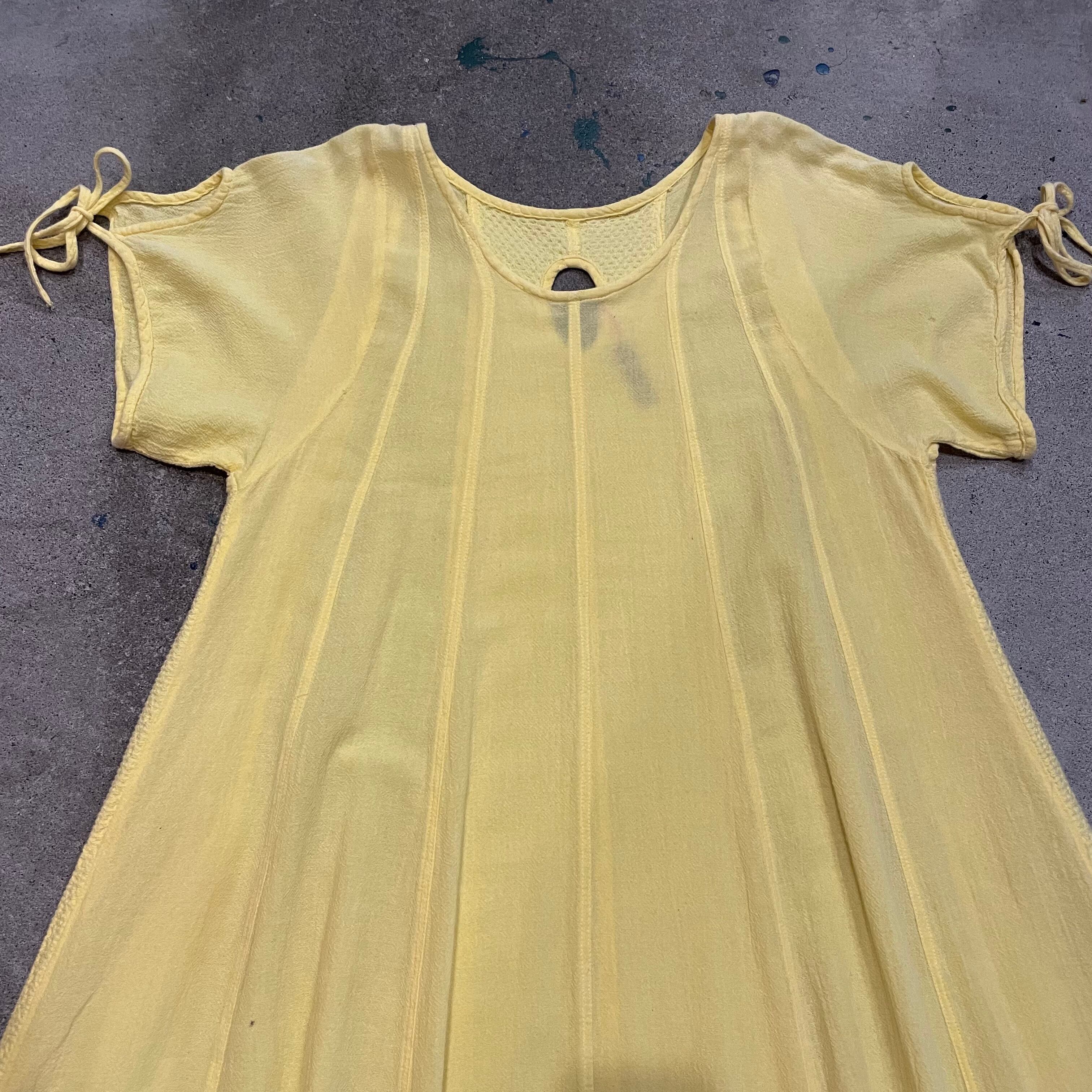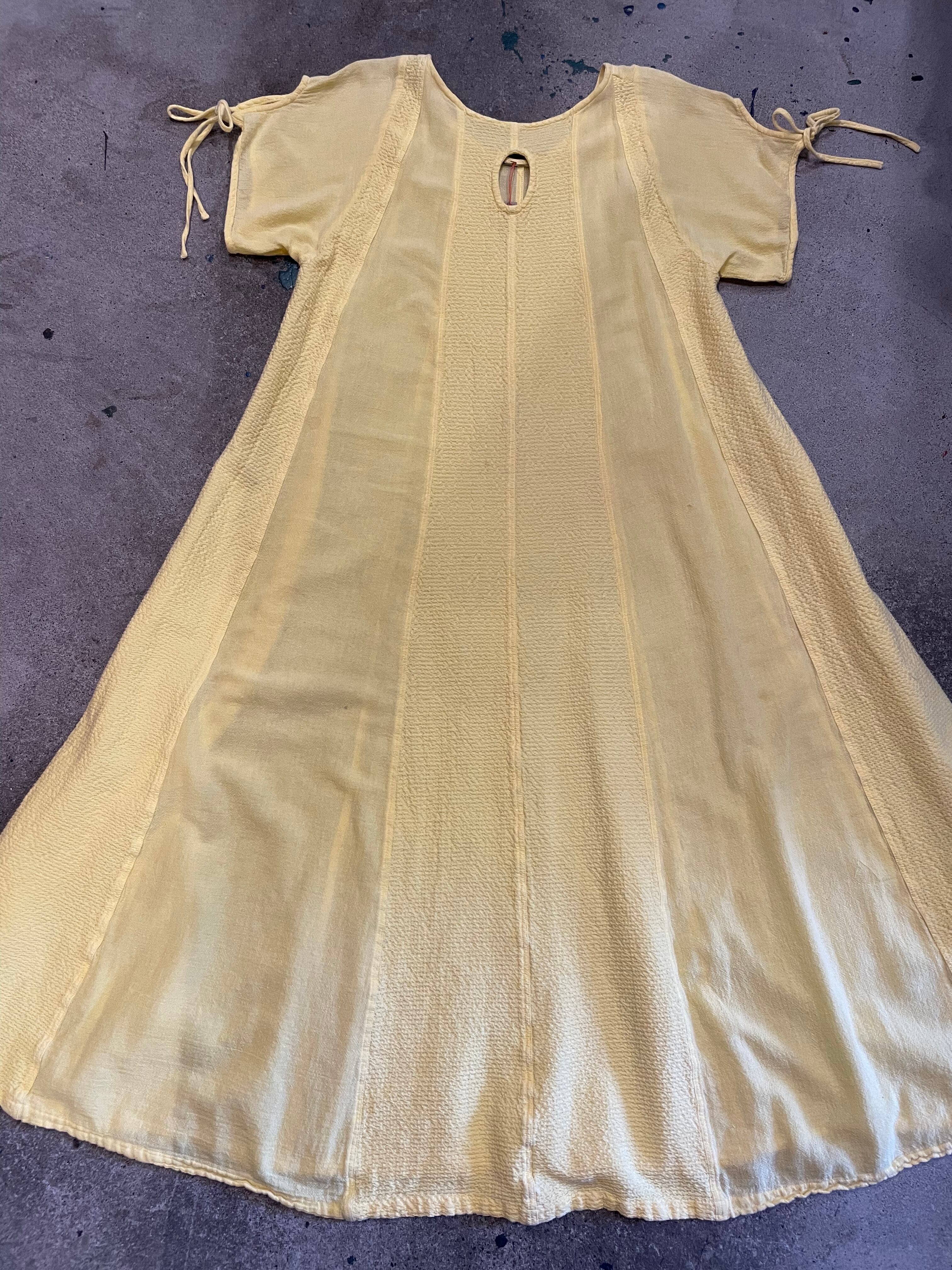 クリームイエローがかわいいロングワンピースです。写真では丸い穴の方を前に着ていますが、逆に着てもかわいいと思います。丸の方は凹凸のある素材と切り替えになっていたり、全体的に放射状の切り替えがきれいなシルエットになっています。袖のデザインも凝っていてすてきです。