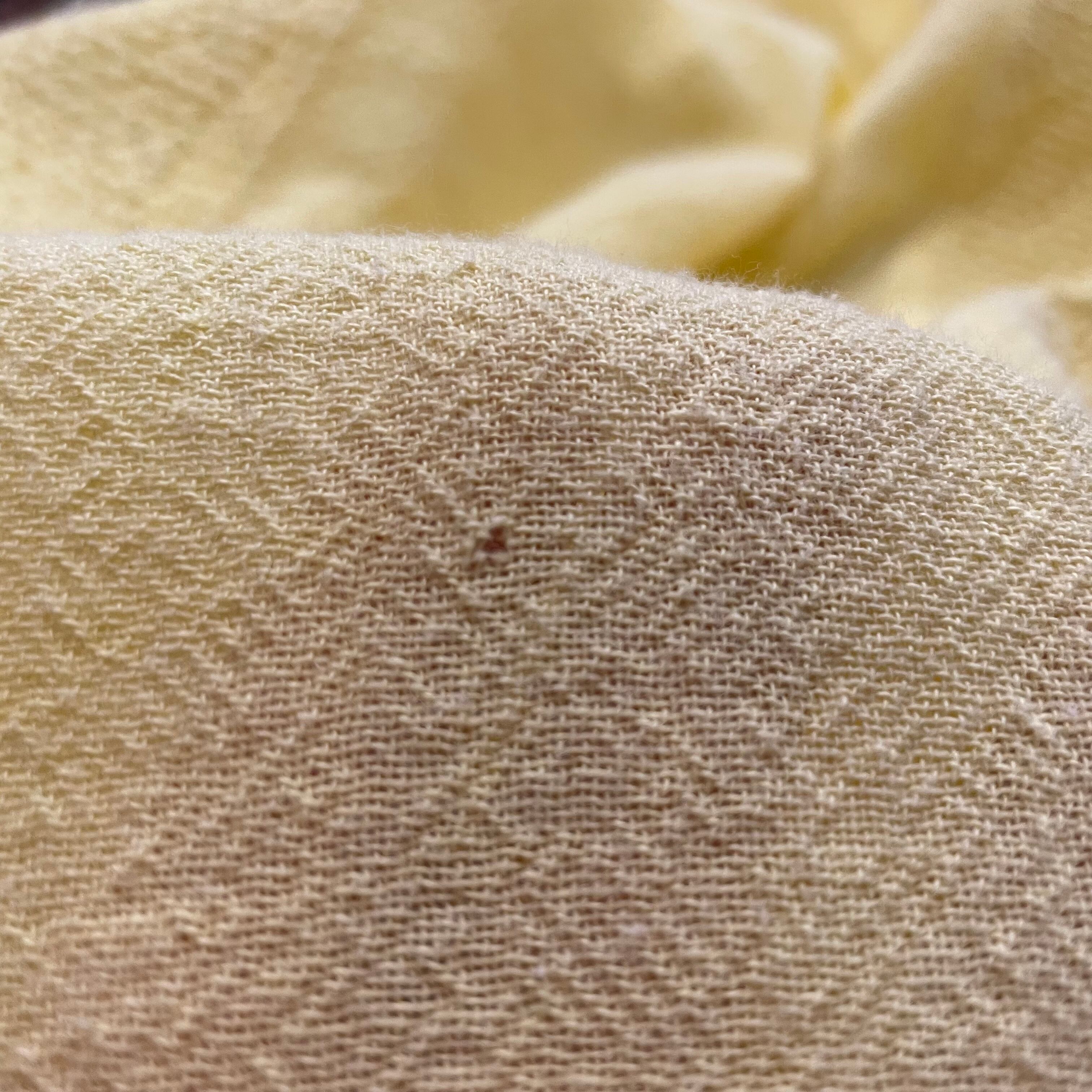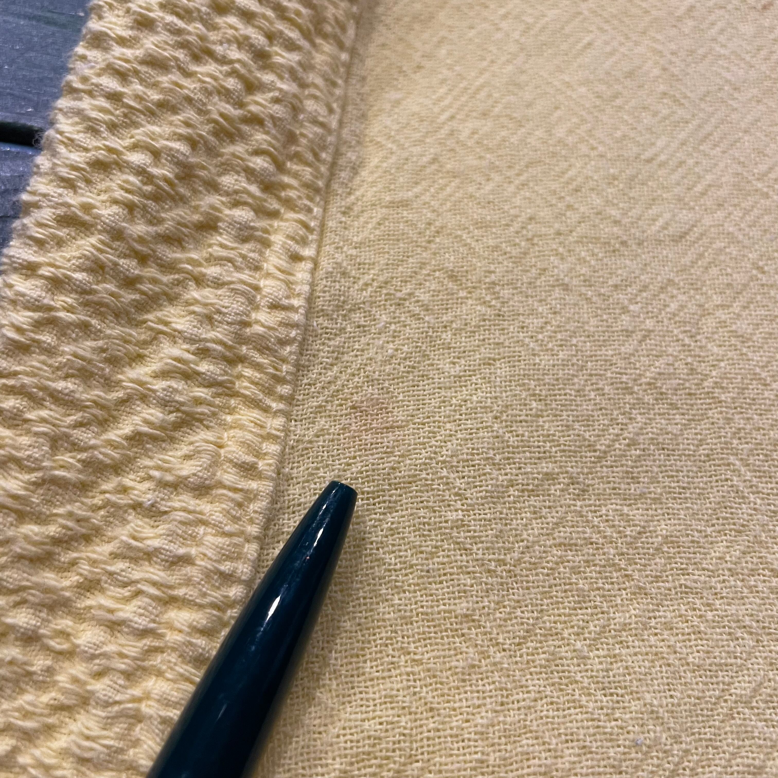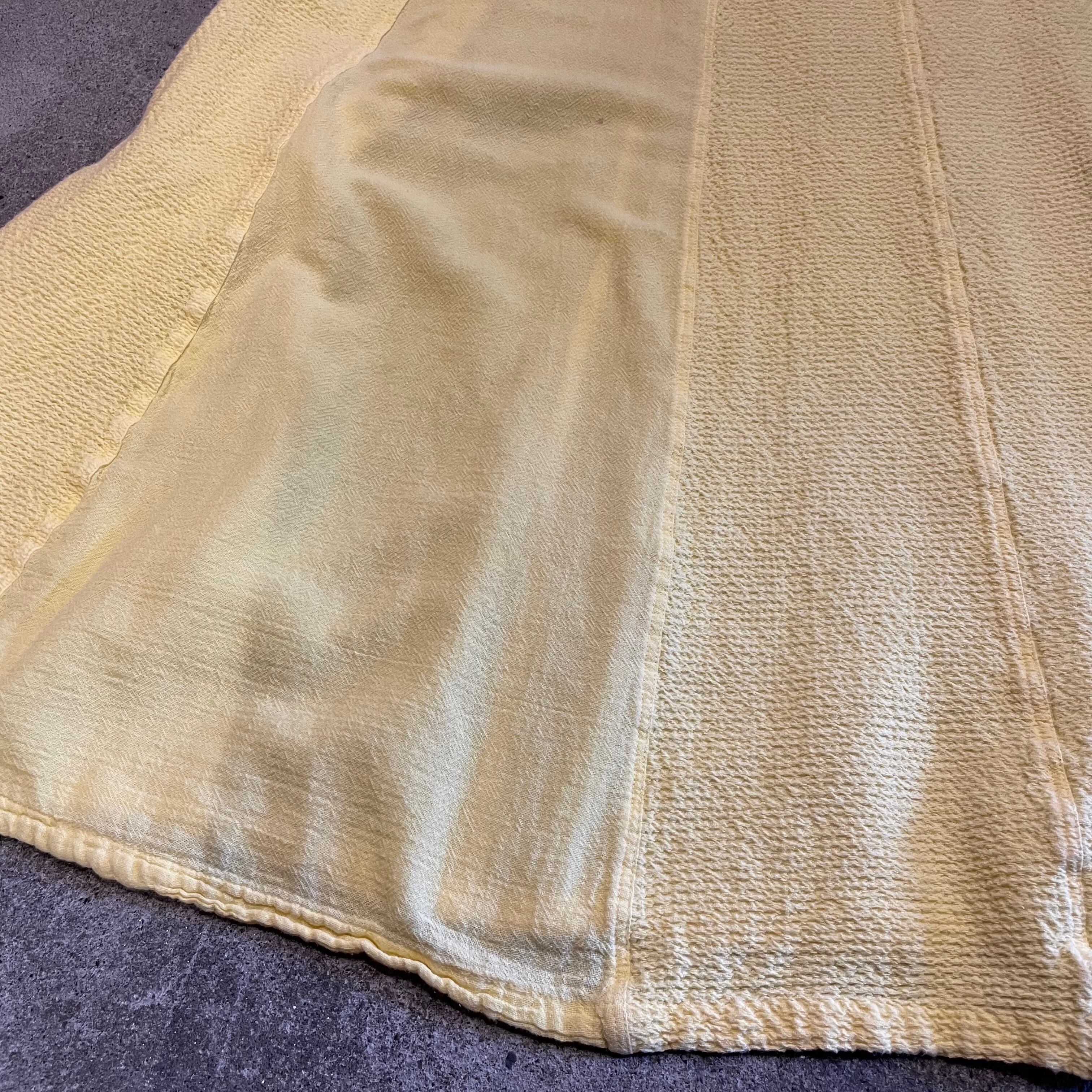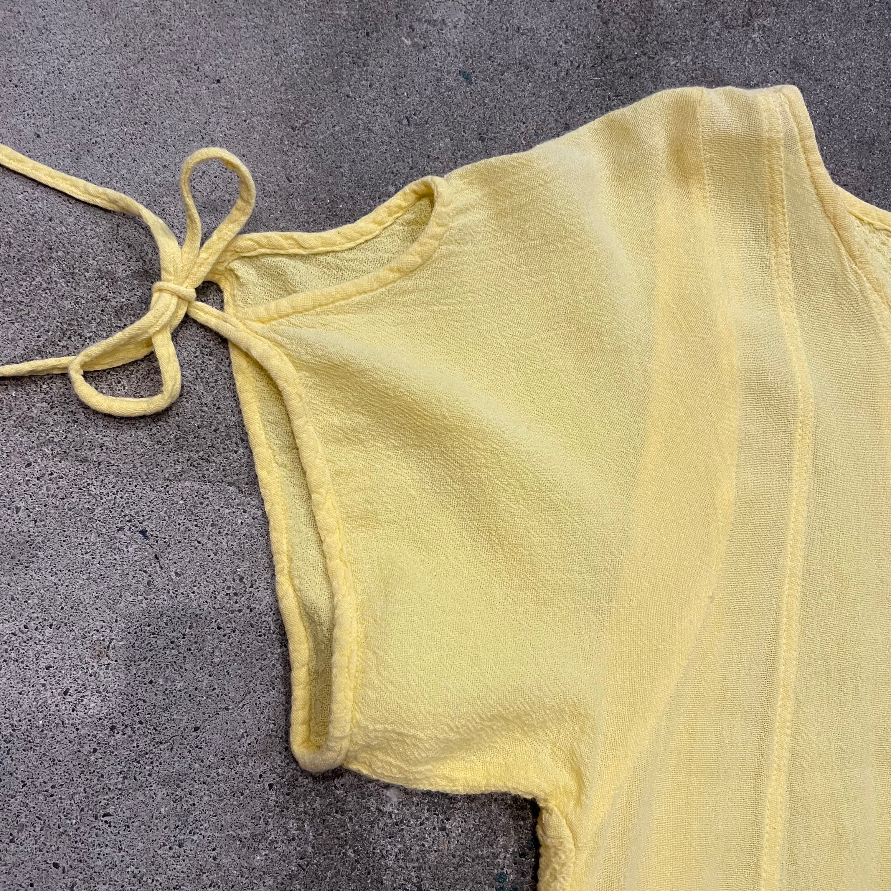 クリームイエローがかわいいロングワンピースです。写真では丸い穴の方を前に着ていますが、逆に着てもかわいいと思います。丸の方は凹凸のある素材と切り替えになっていたり、全体的に放射状の切り替えがきれいなシルエットになっています。袖のデザインも凝っていてすてきです。