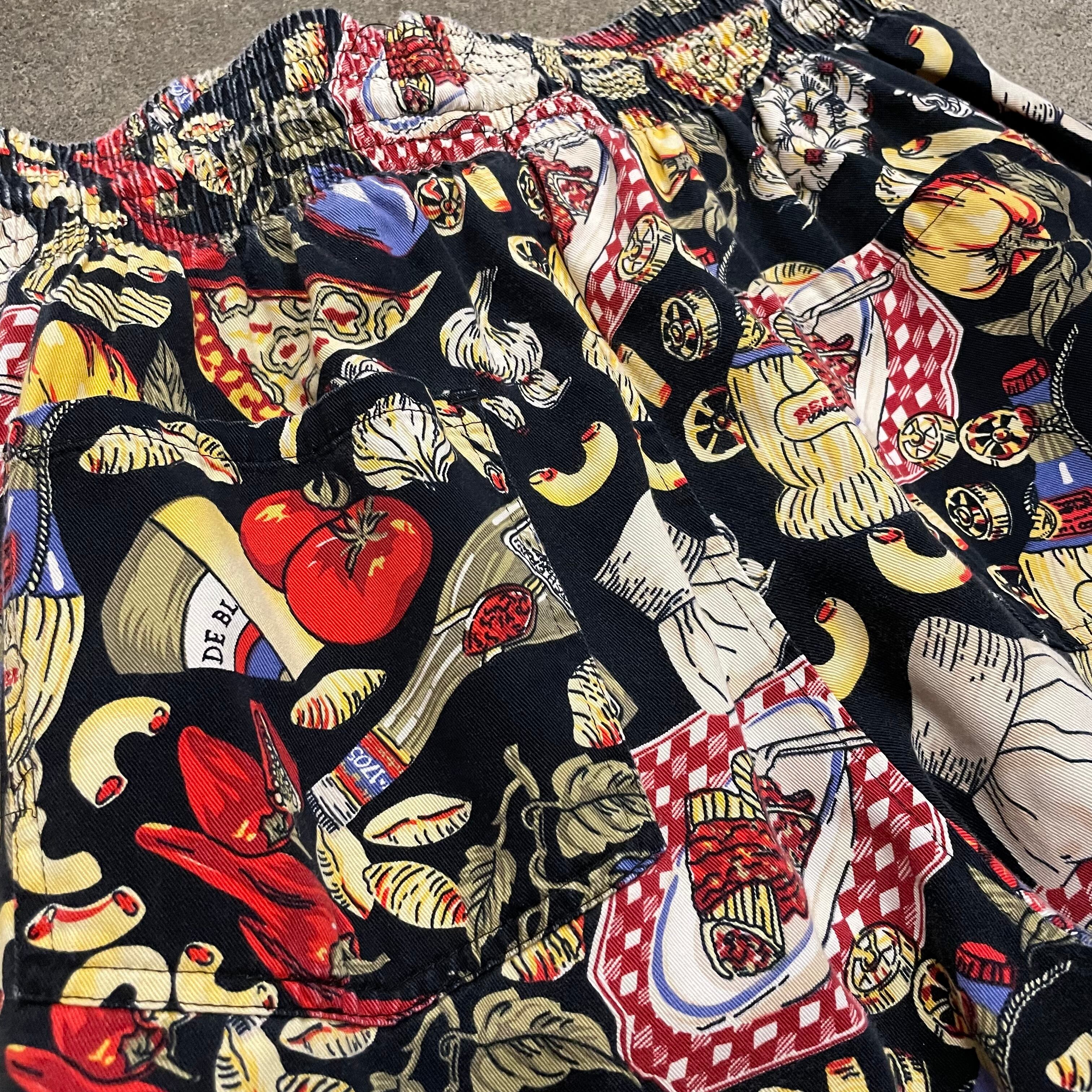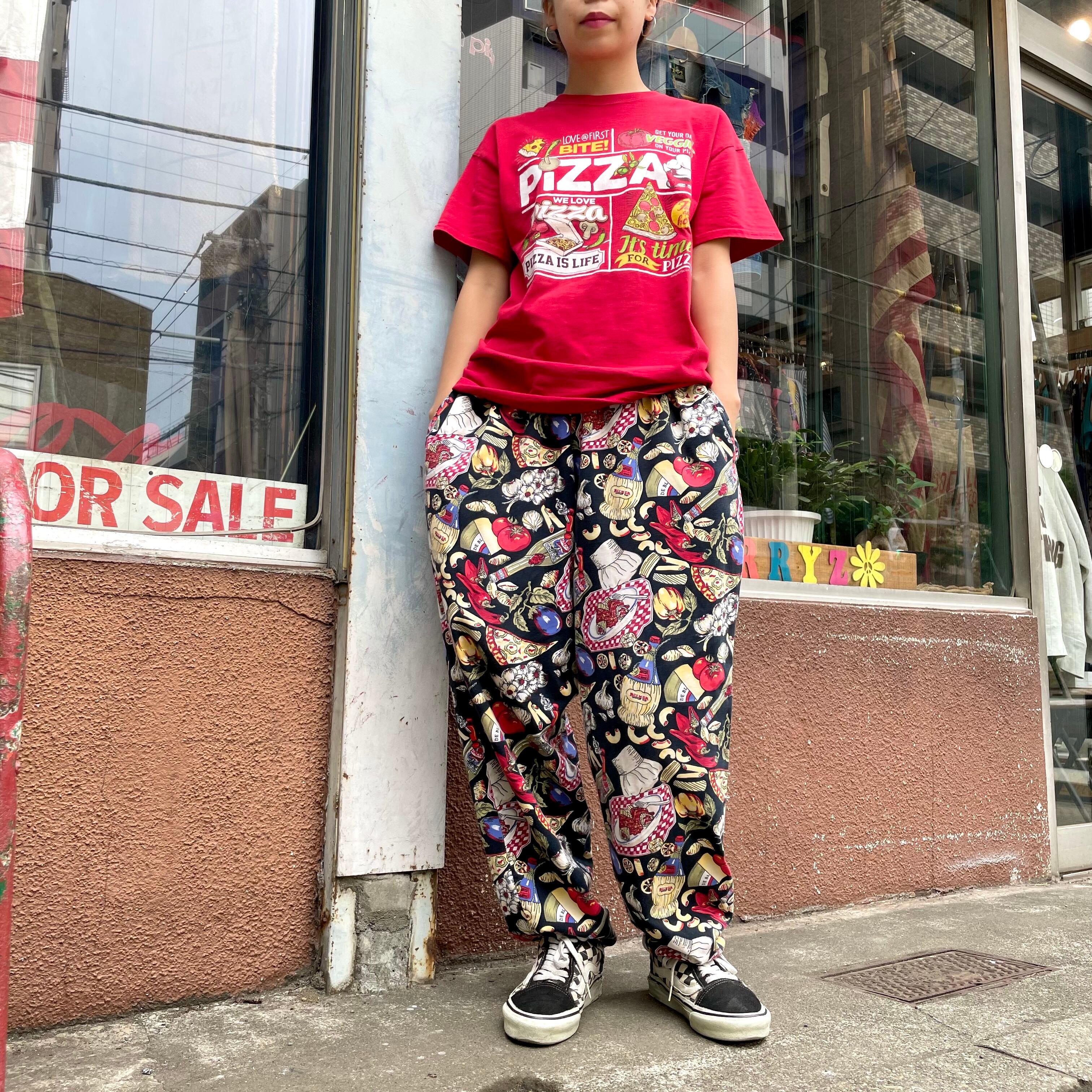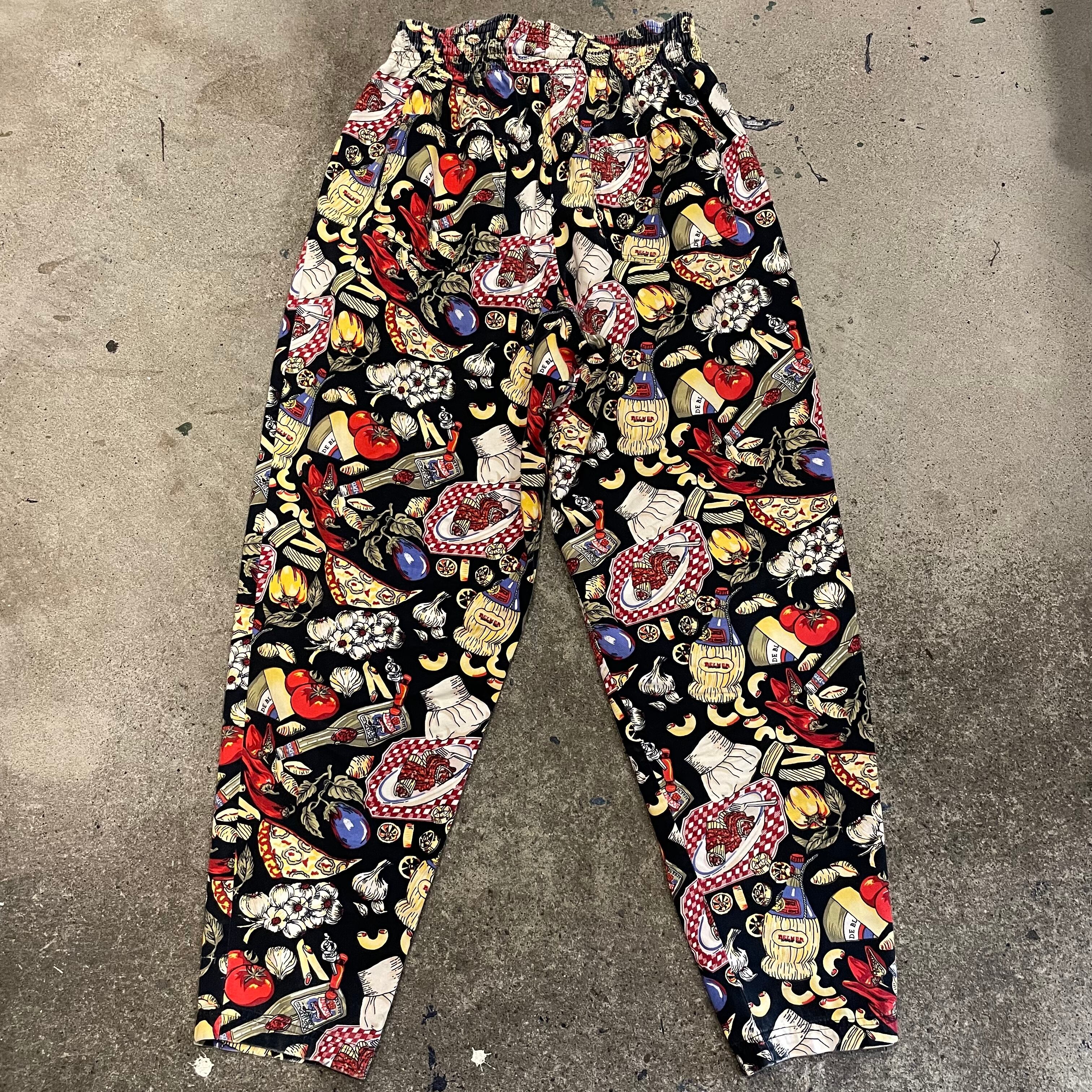 ピザやマカロニ、野菜など材料のプリントがかわいいイージーパンツです。