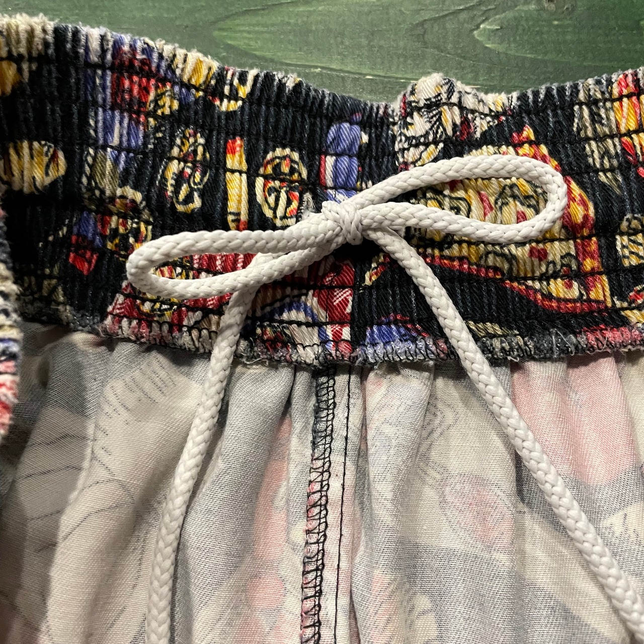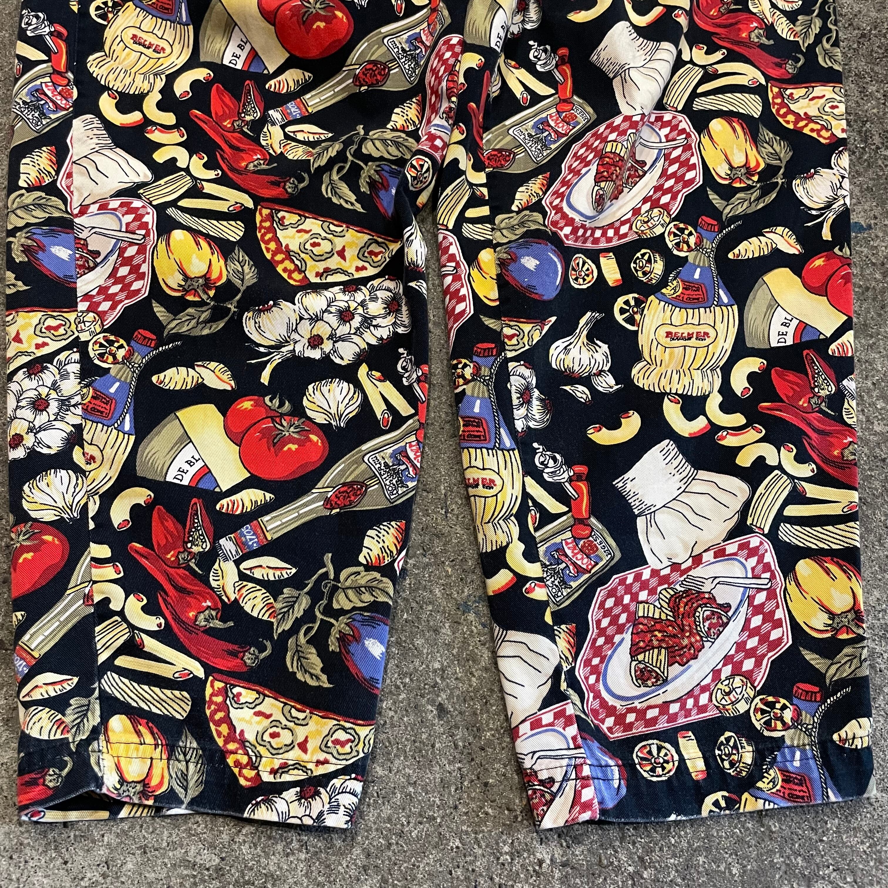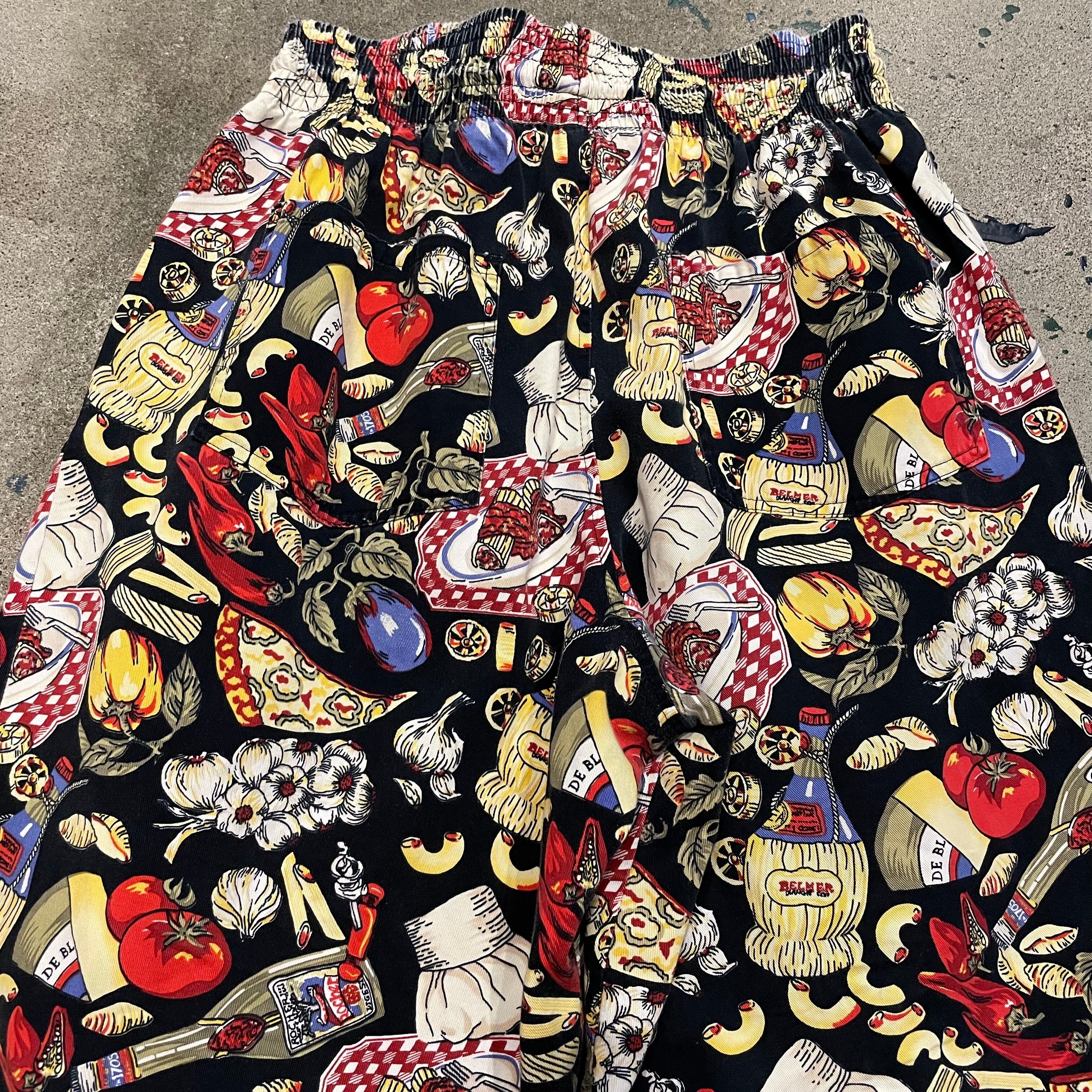 ピザやマカロニ、野菜など材料のプリントがかわいいイージーパンツです。