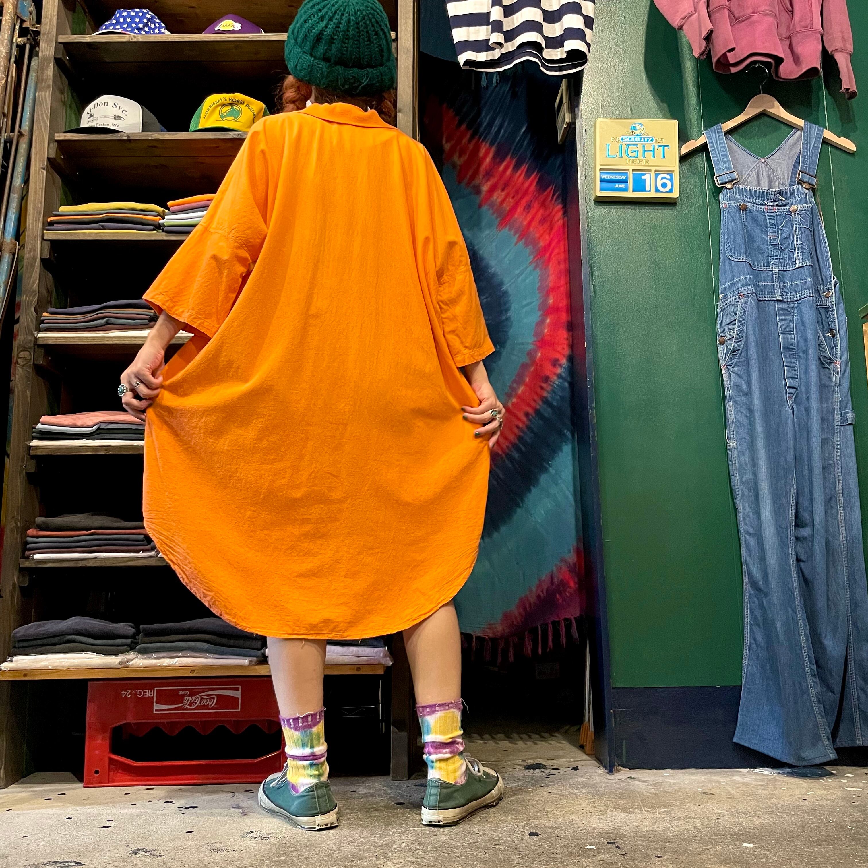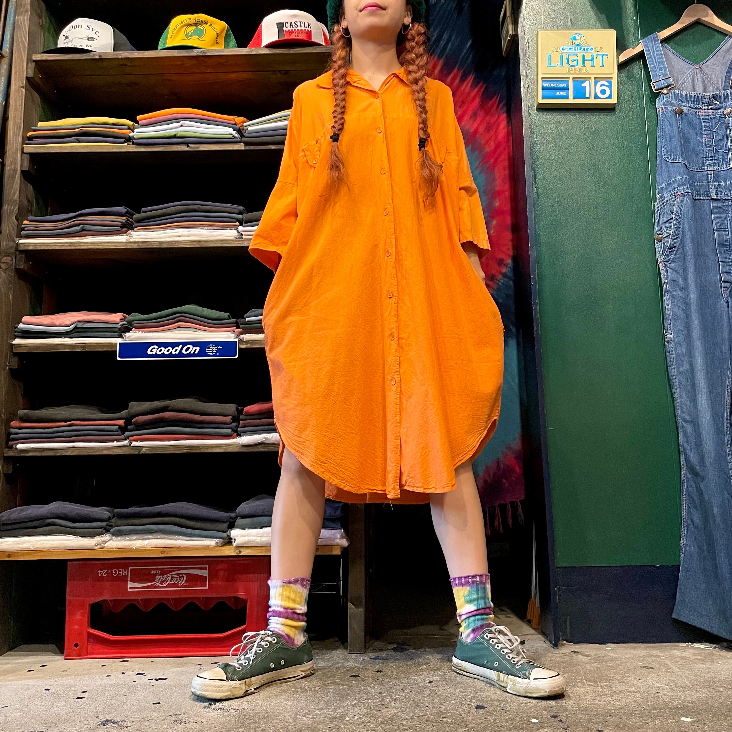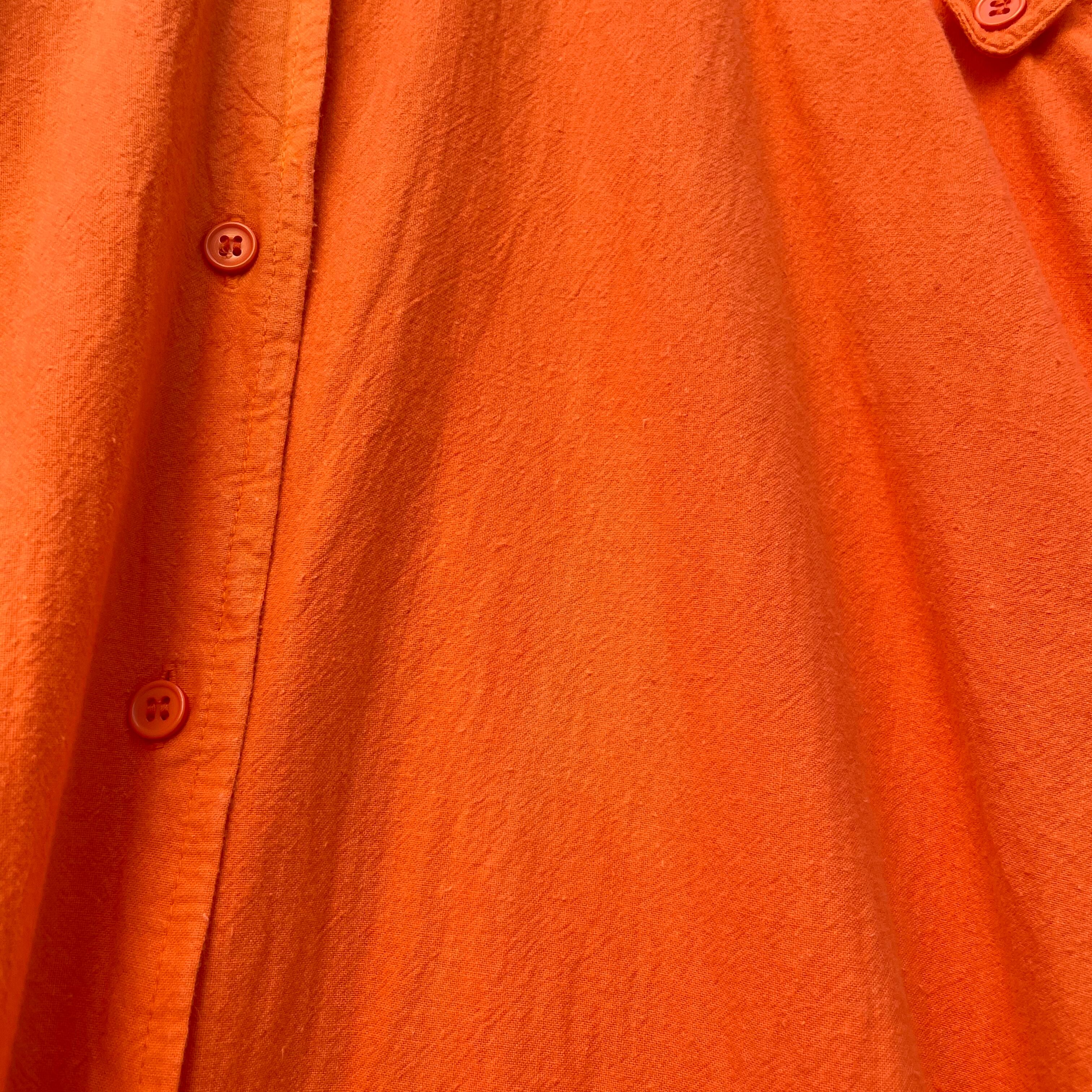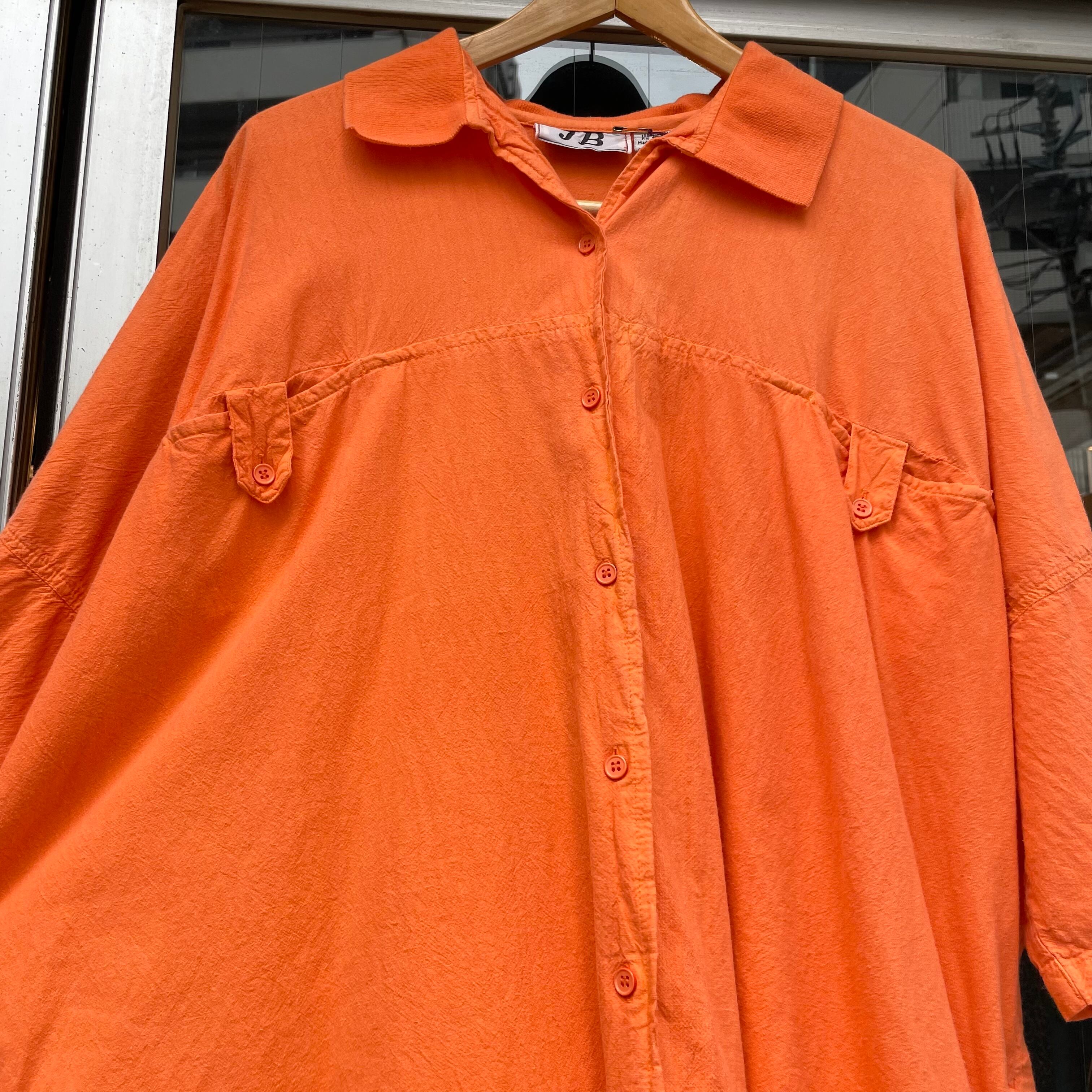 柔らかいオレンジがかわいいゆったりしたシャツワンピースです。