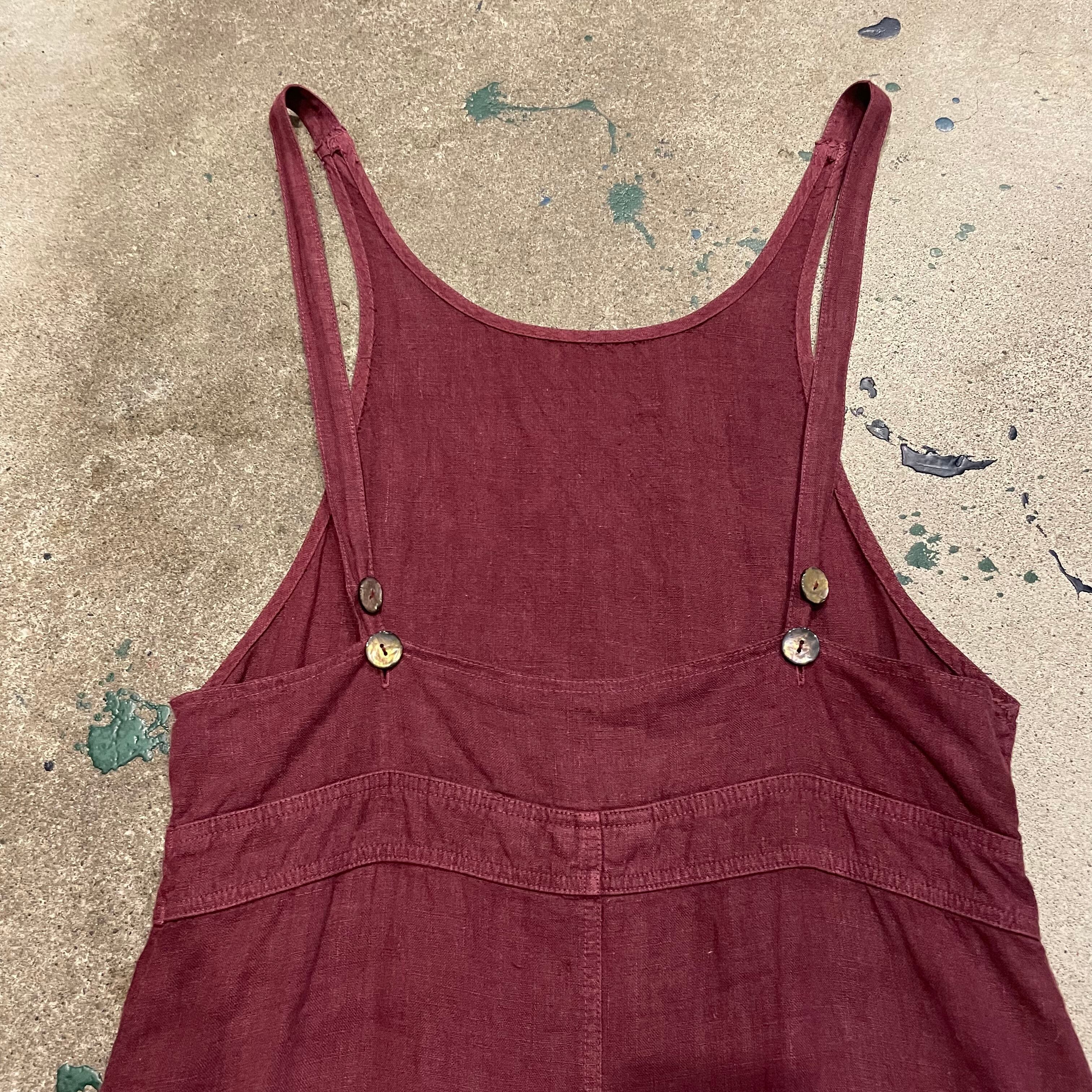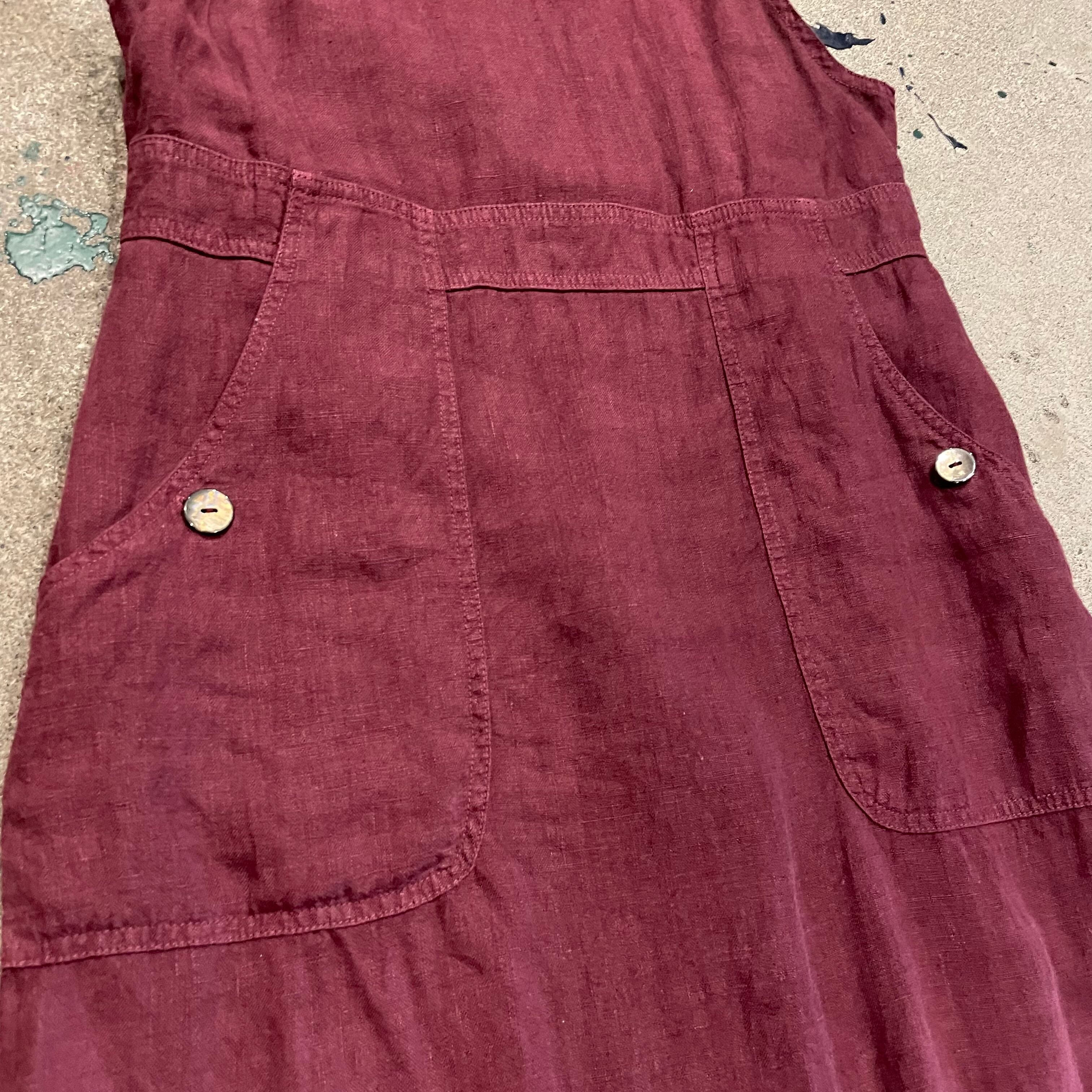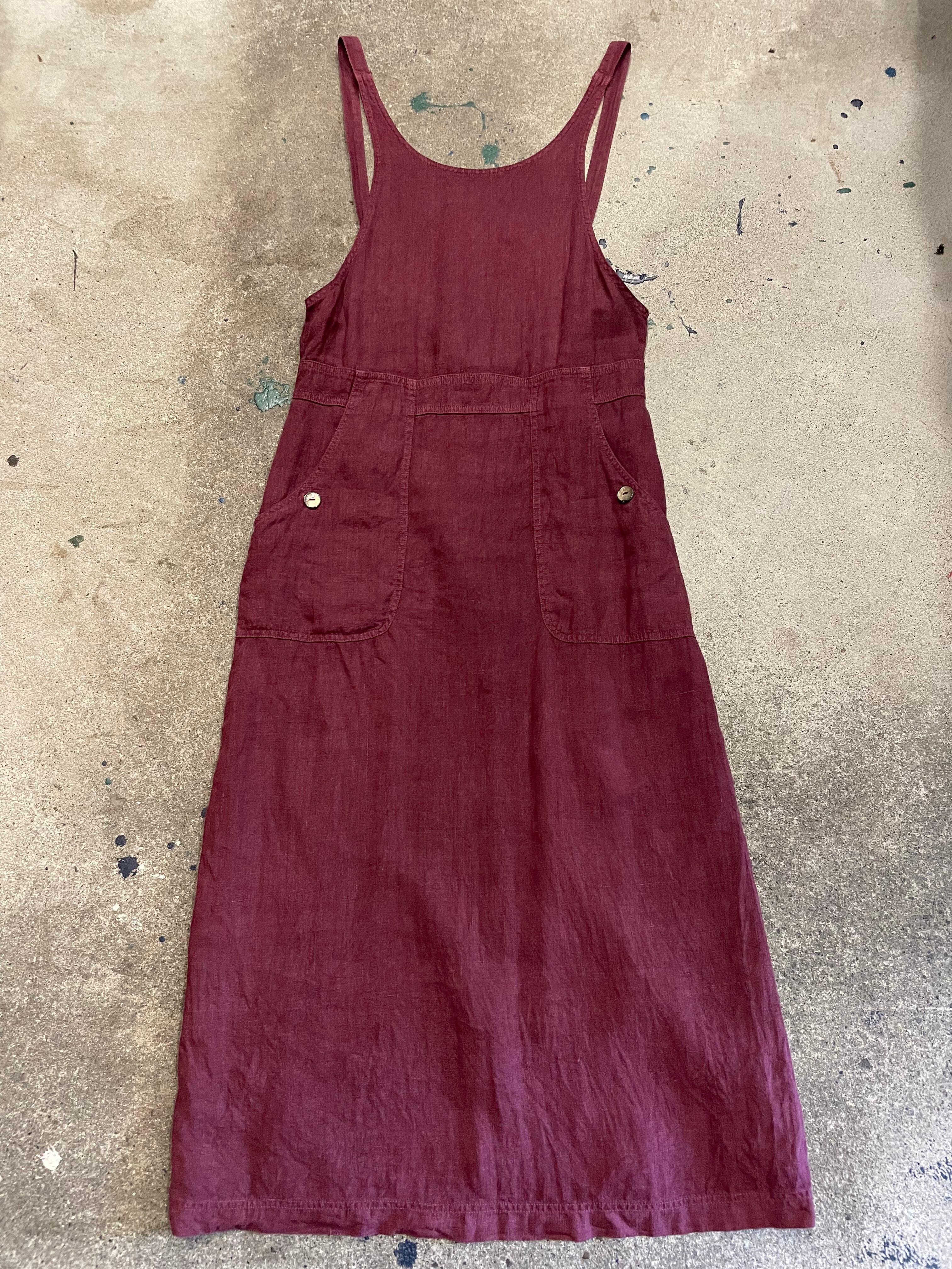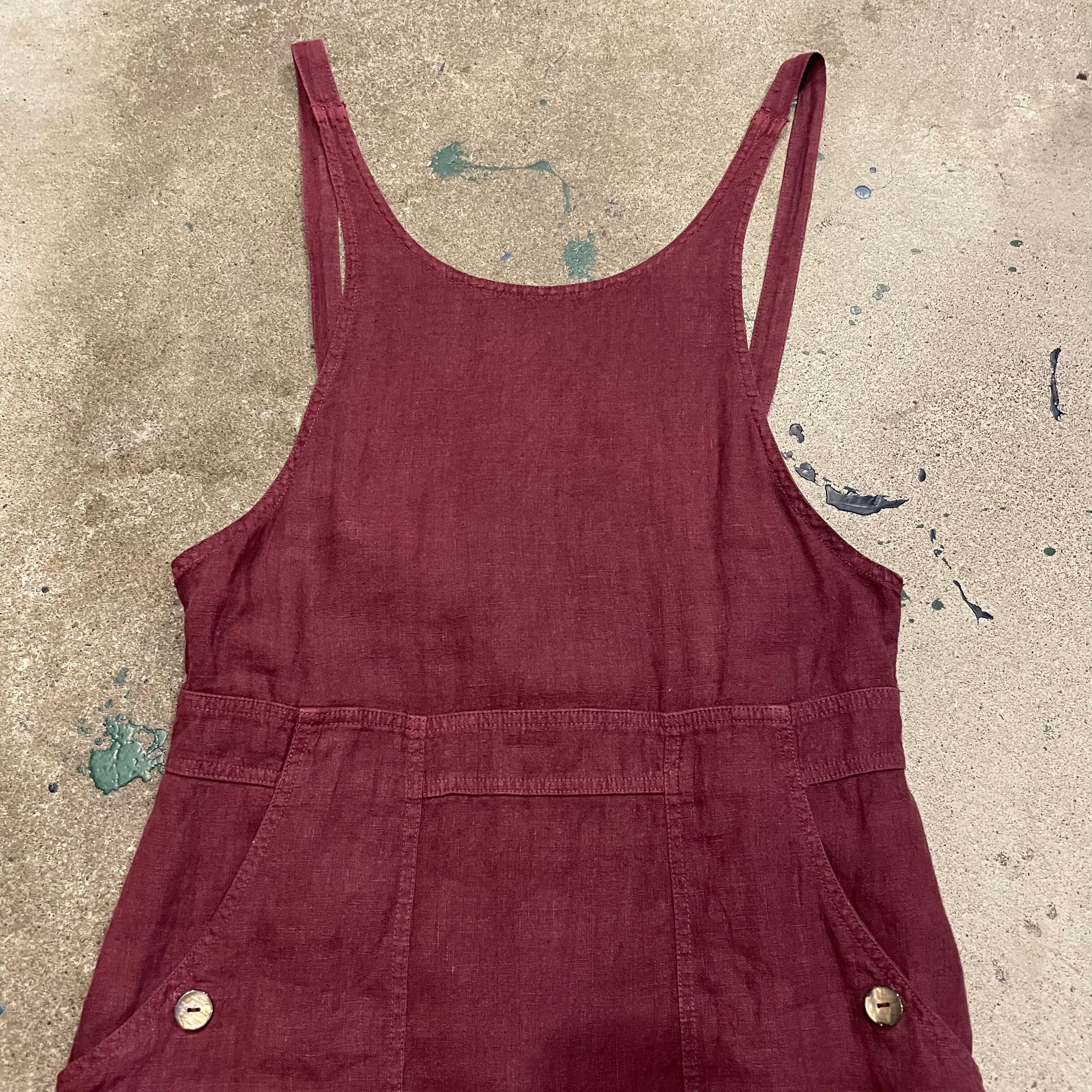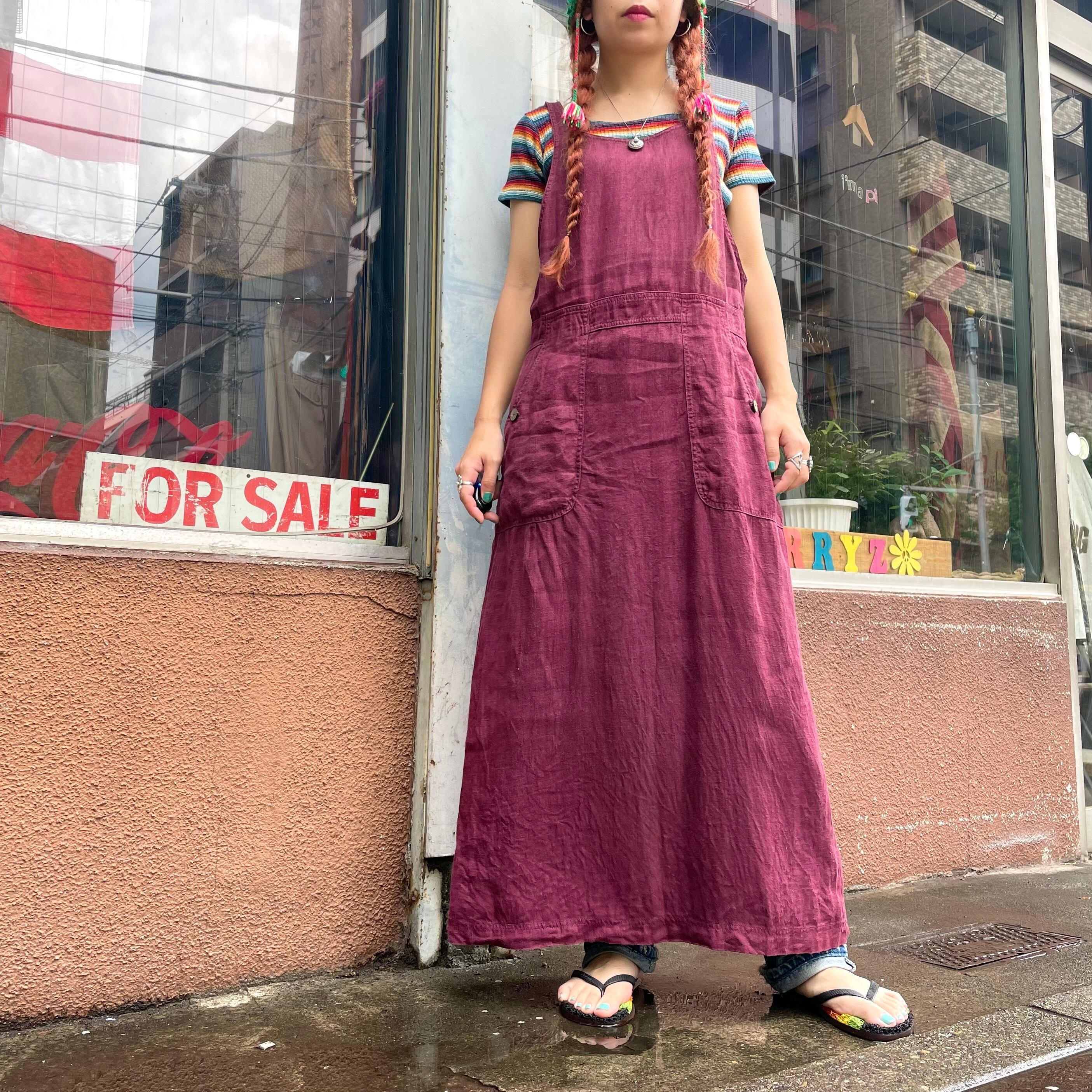 ボルドーなカラーが素敵なリネン素材のワンピースです。サロペットのようになっており肩紐が細めでかわいいです。大人な雰囲気もありつつ、ヤンチャな印象もあってどちらにも転がれそうな一着です。