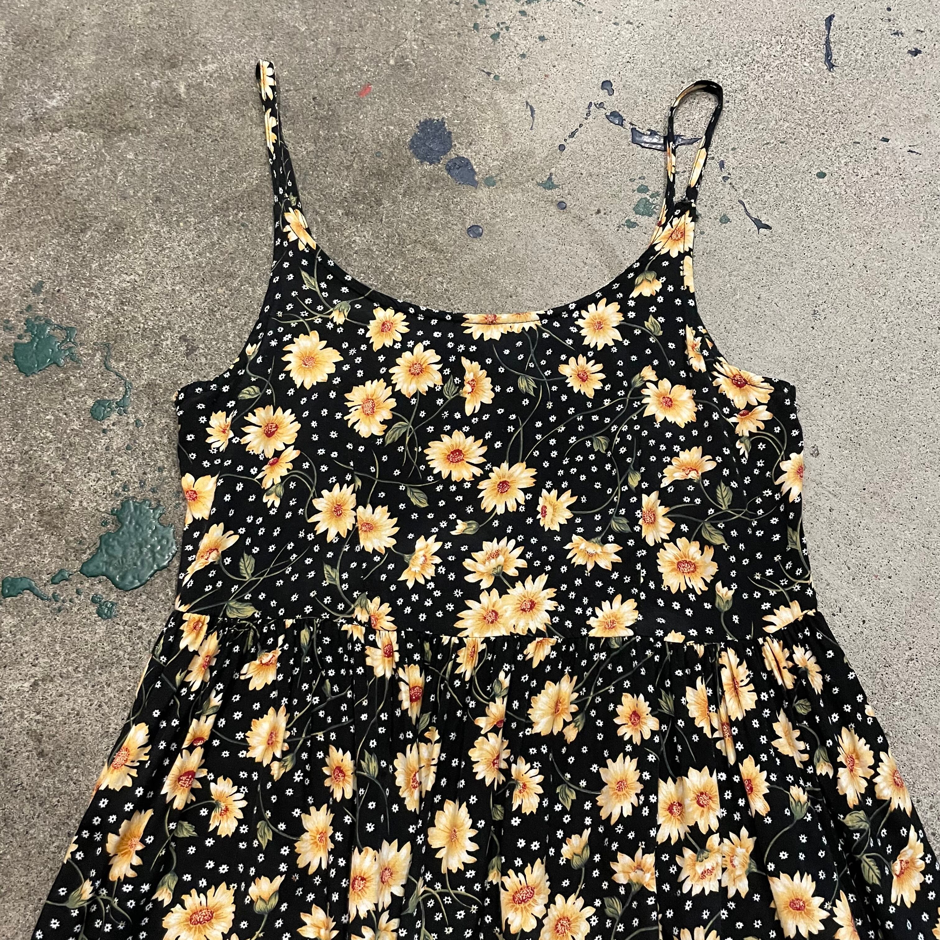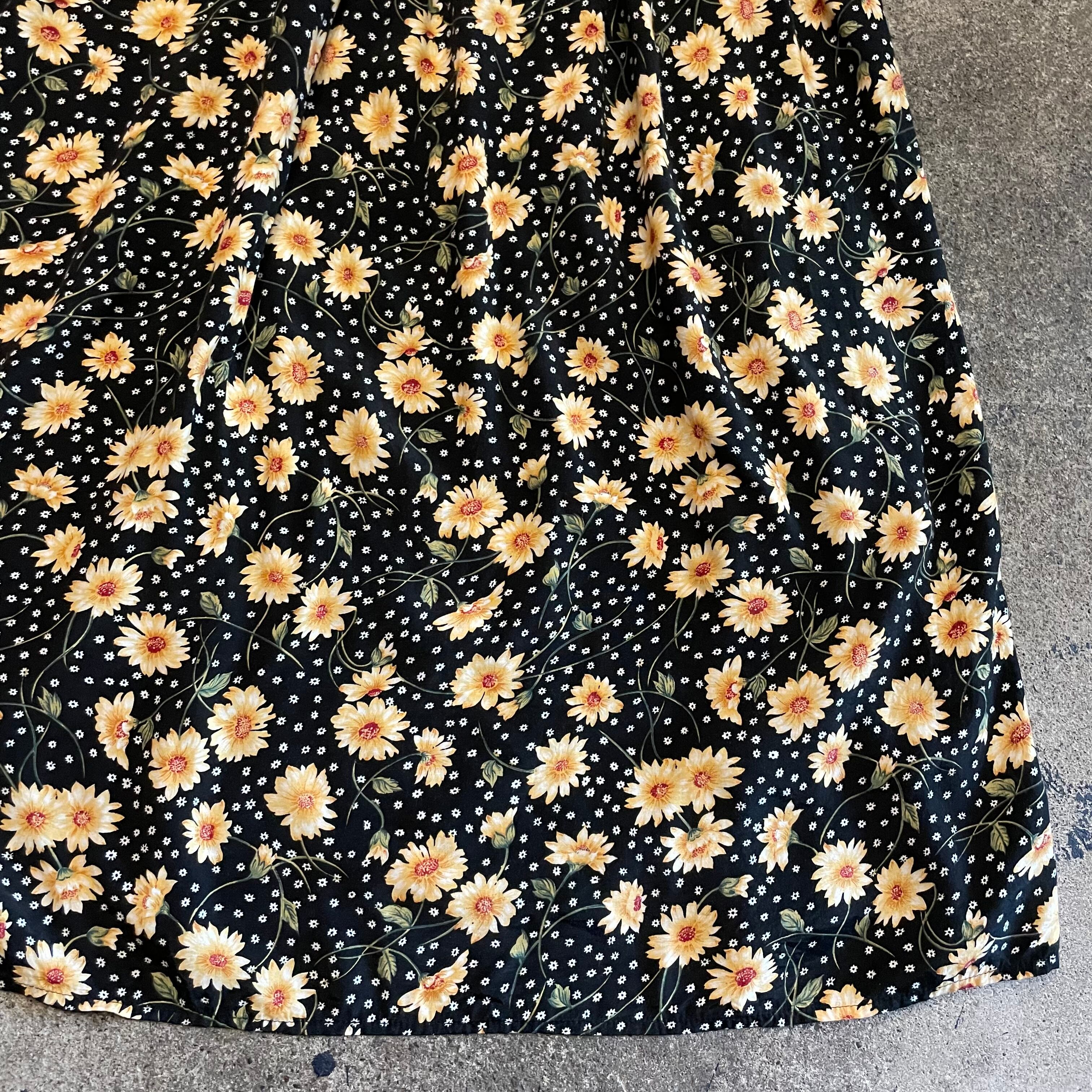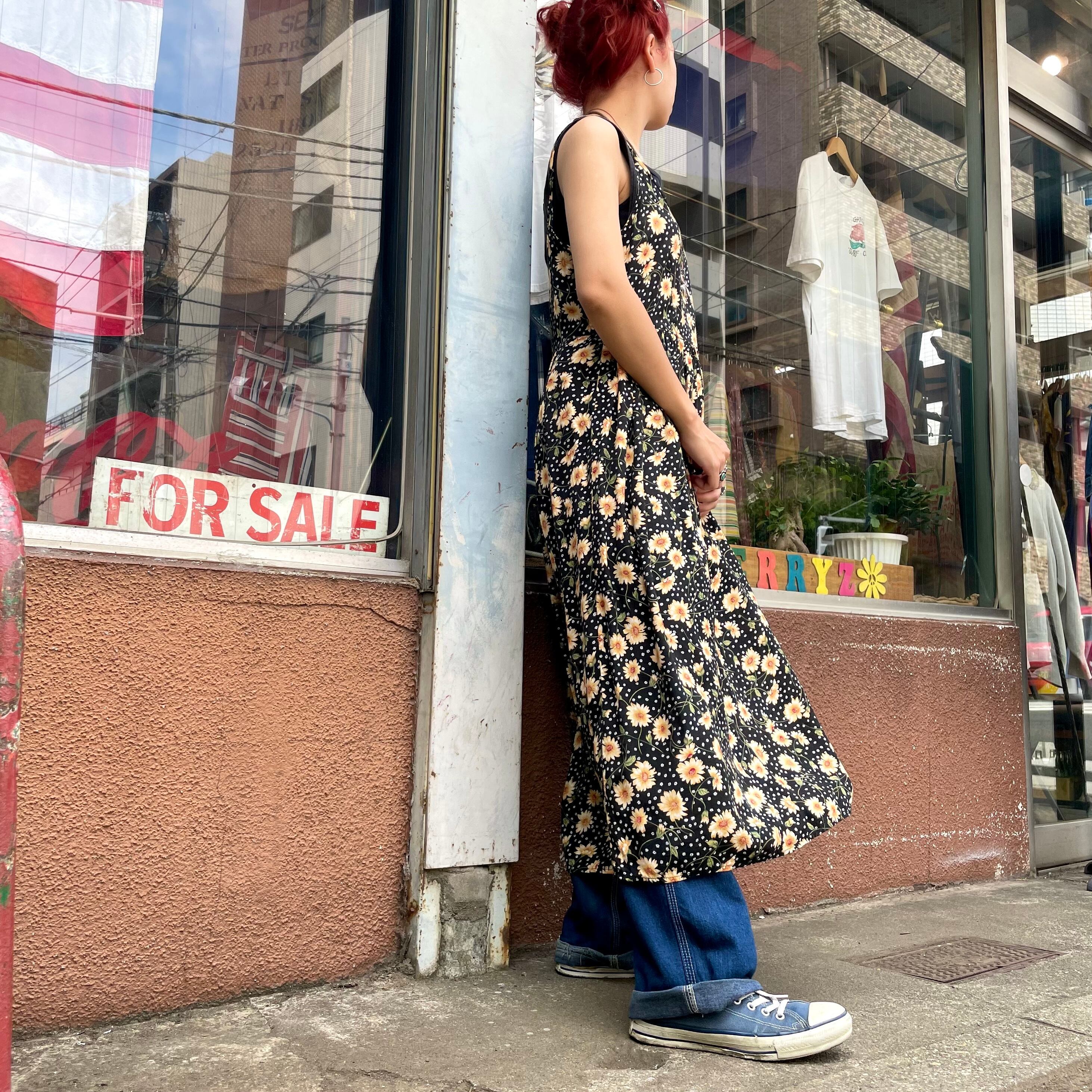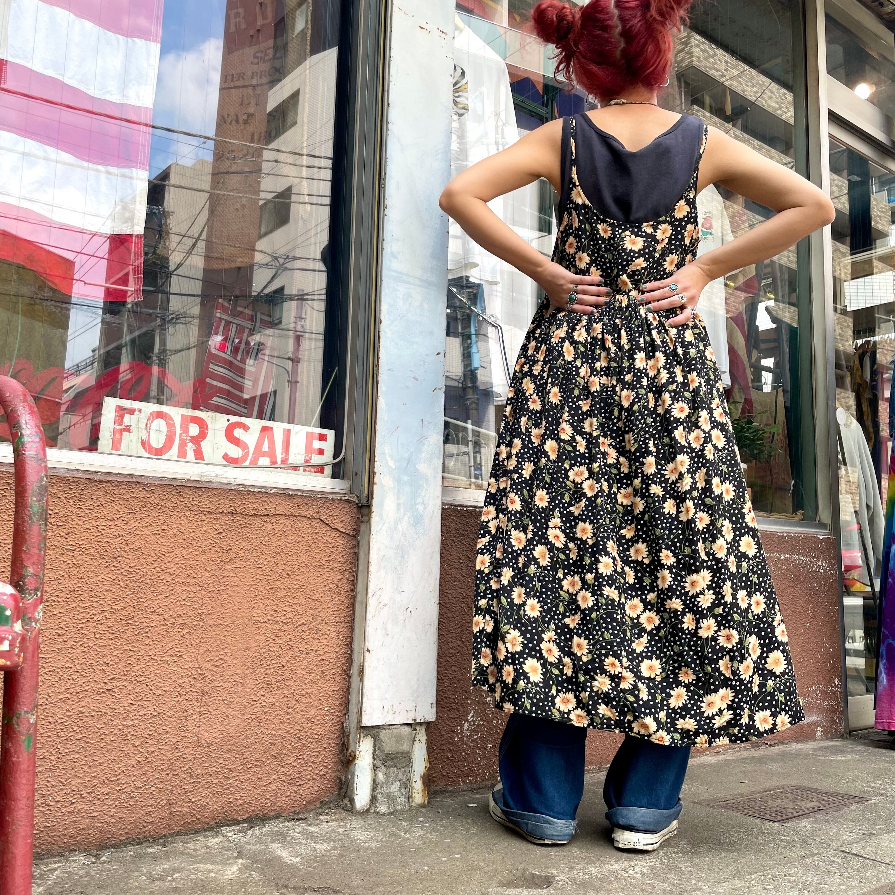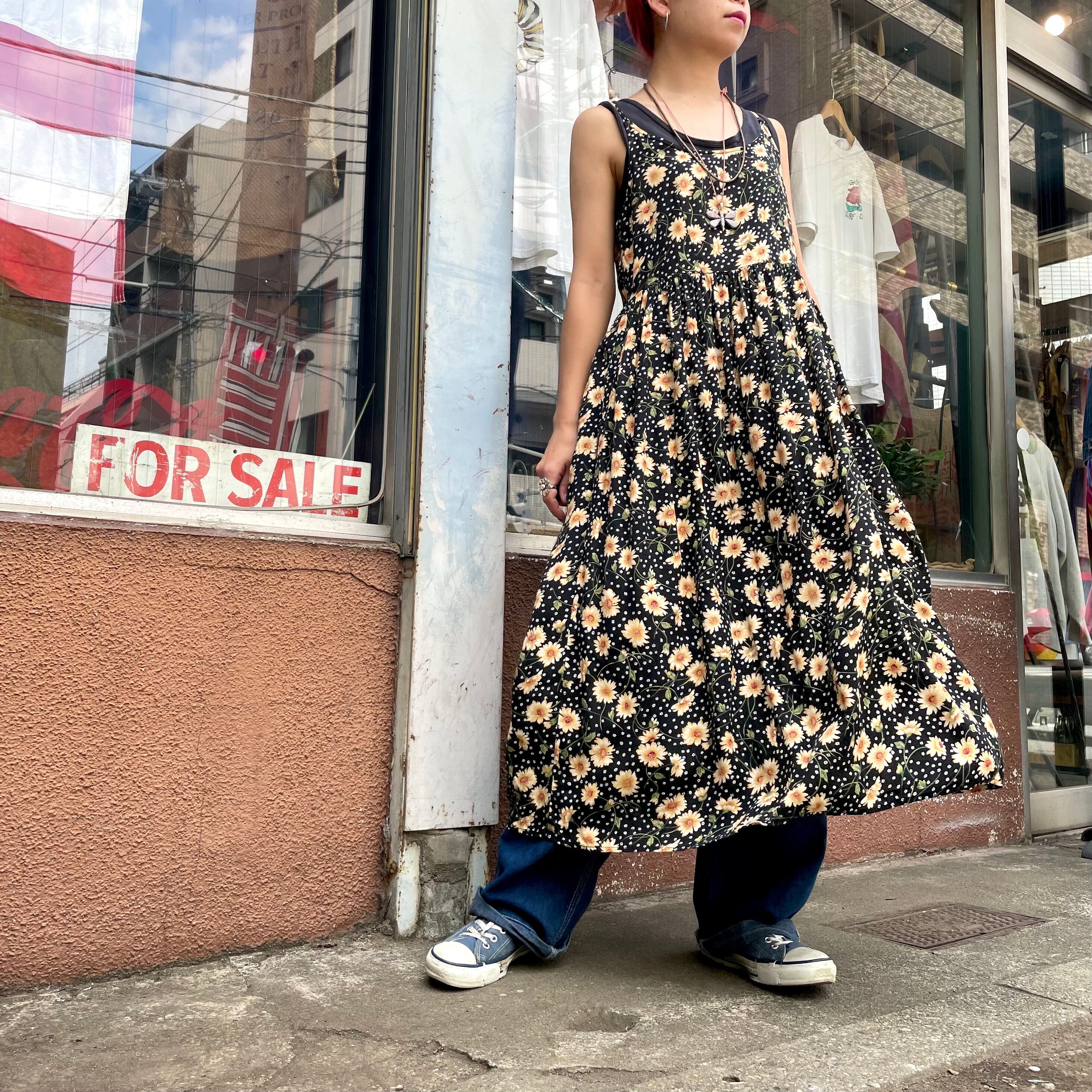 黒地に小さい白い花と黄色っぽい可憐な花がかわいいワンピースです。