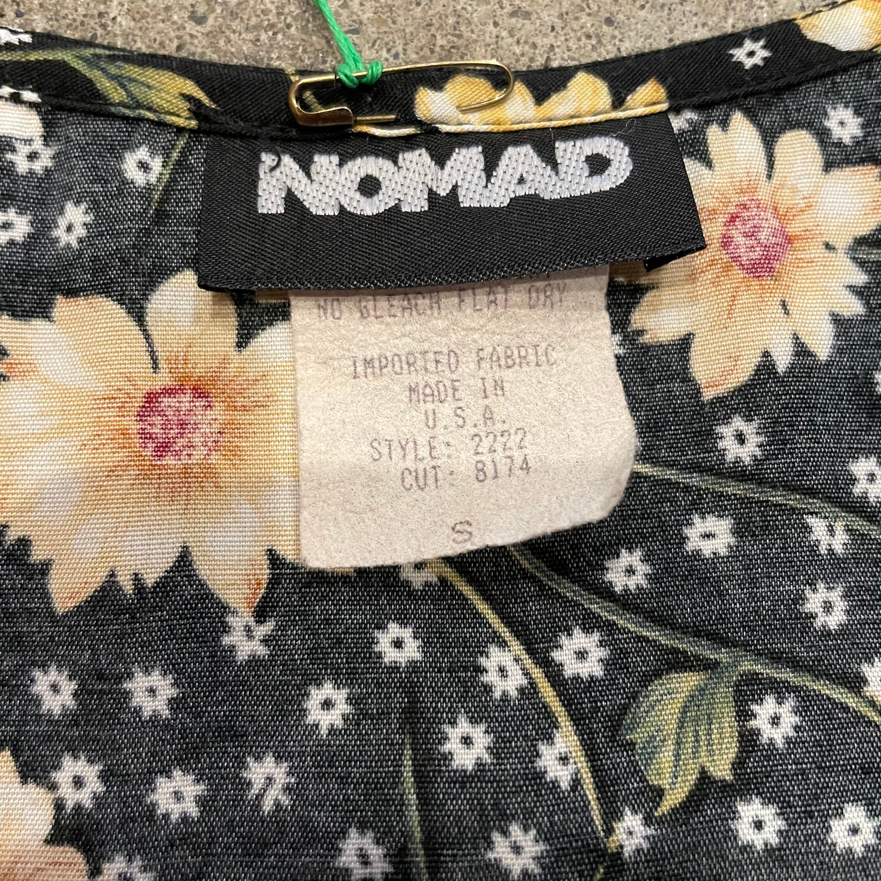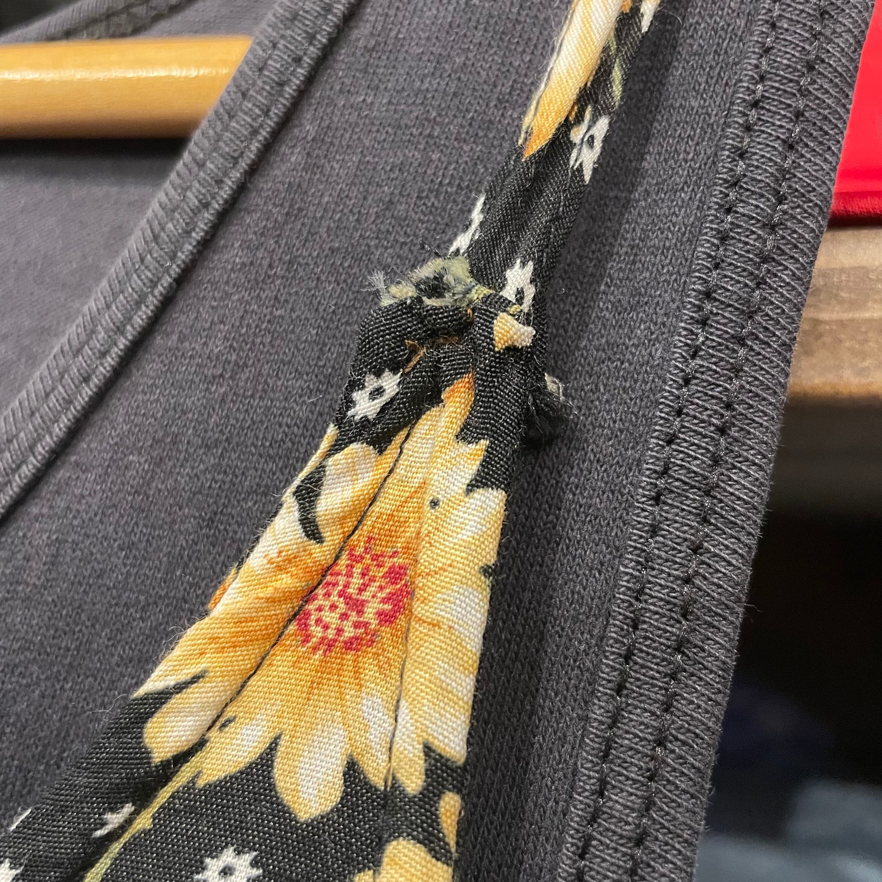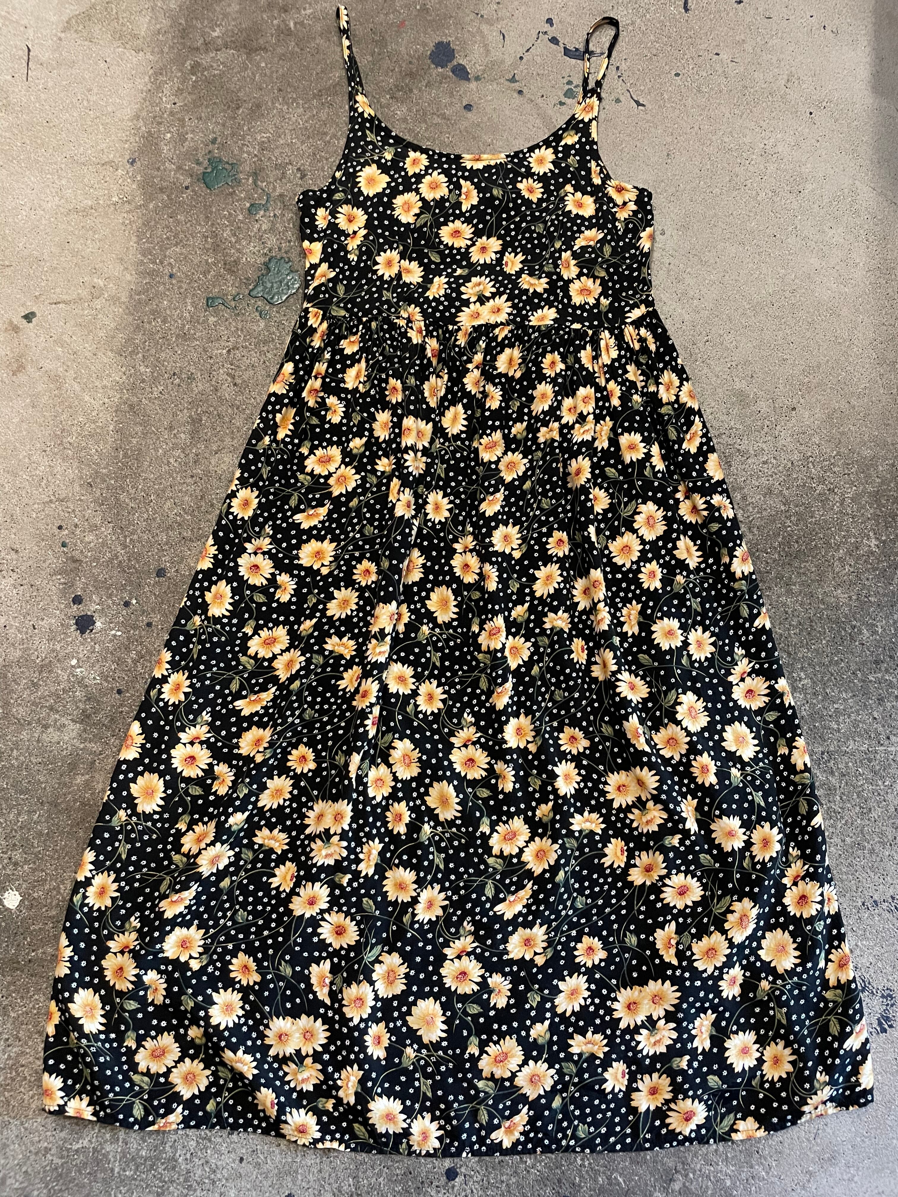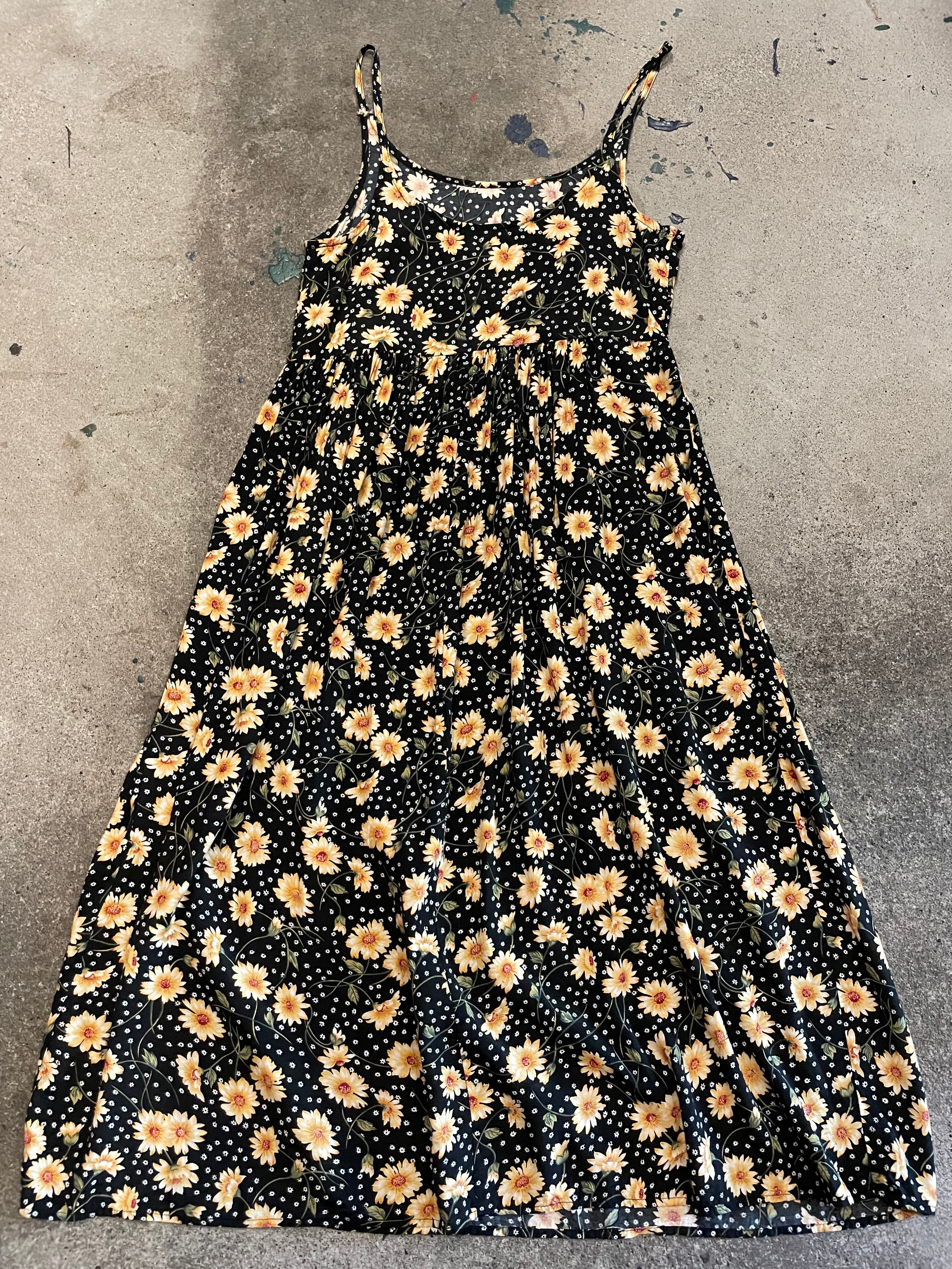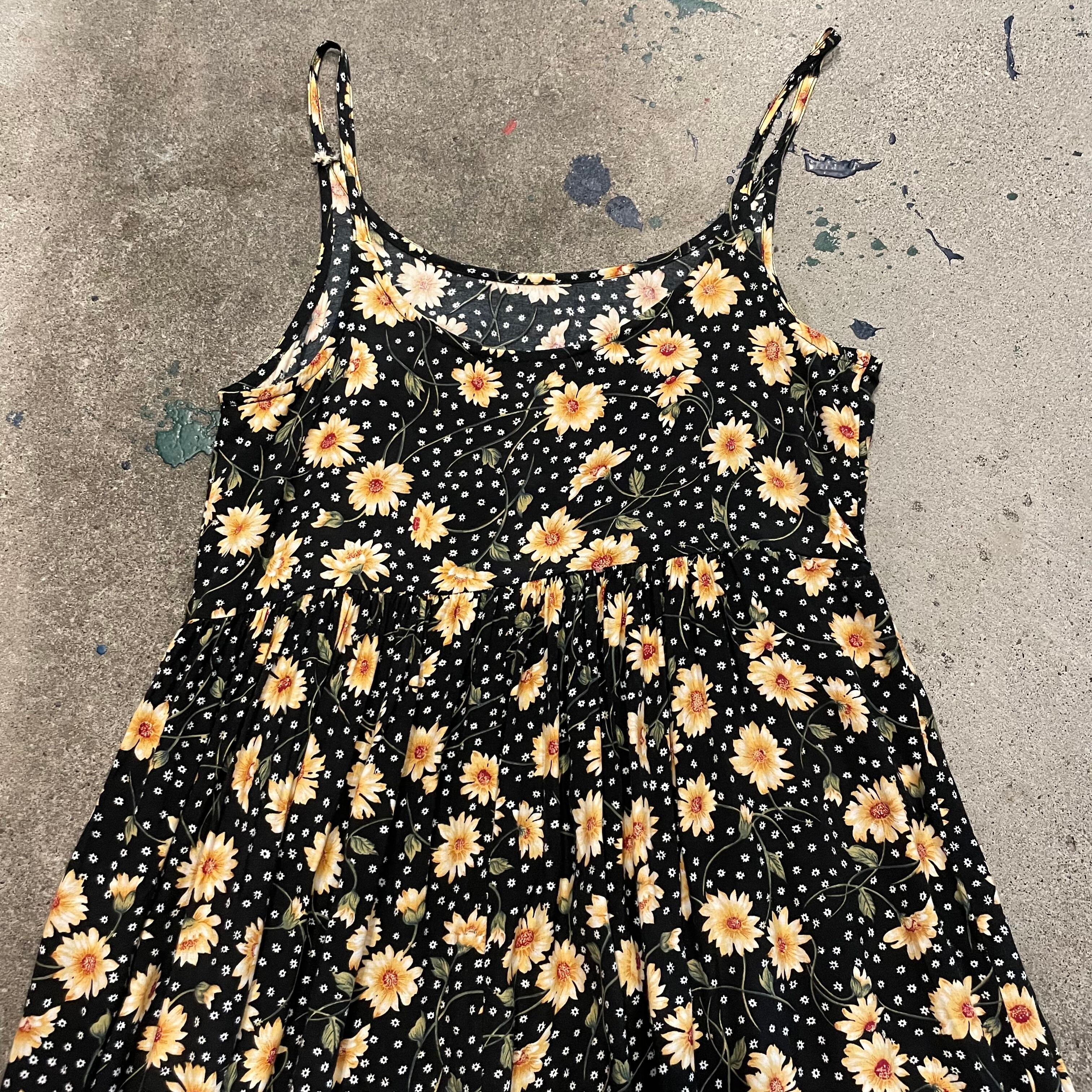 黒地に小さい白い花と黄色っぽい可憐な花がかわいいワンピースです。