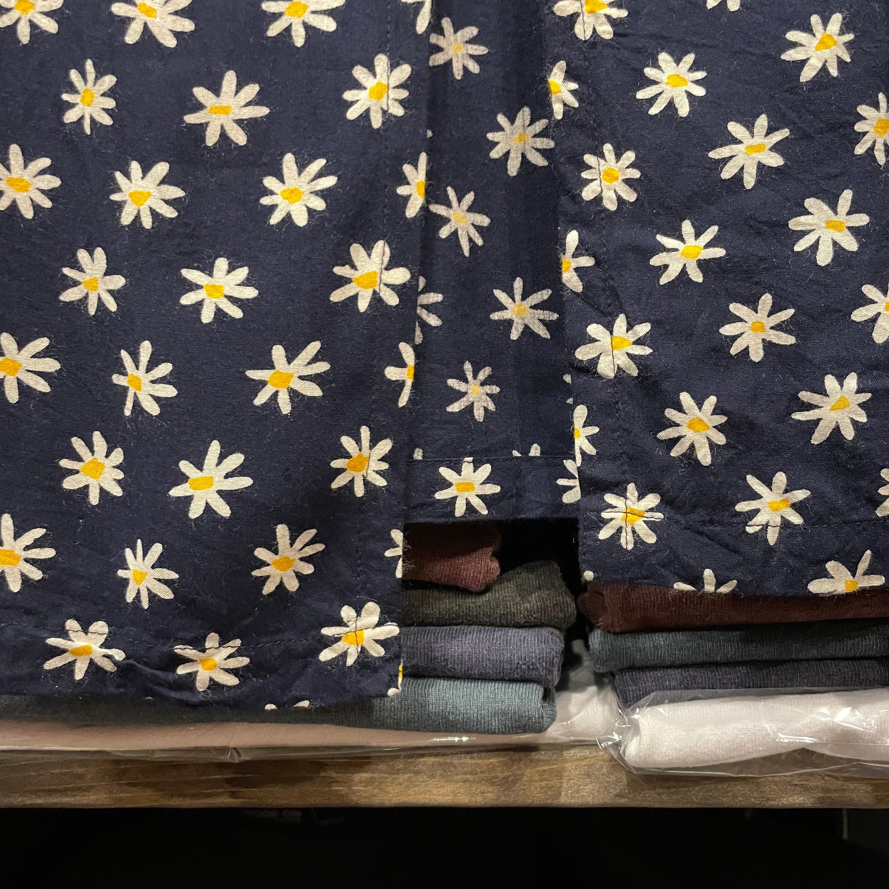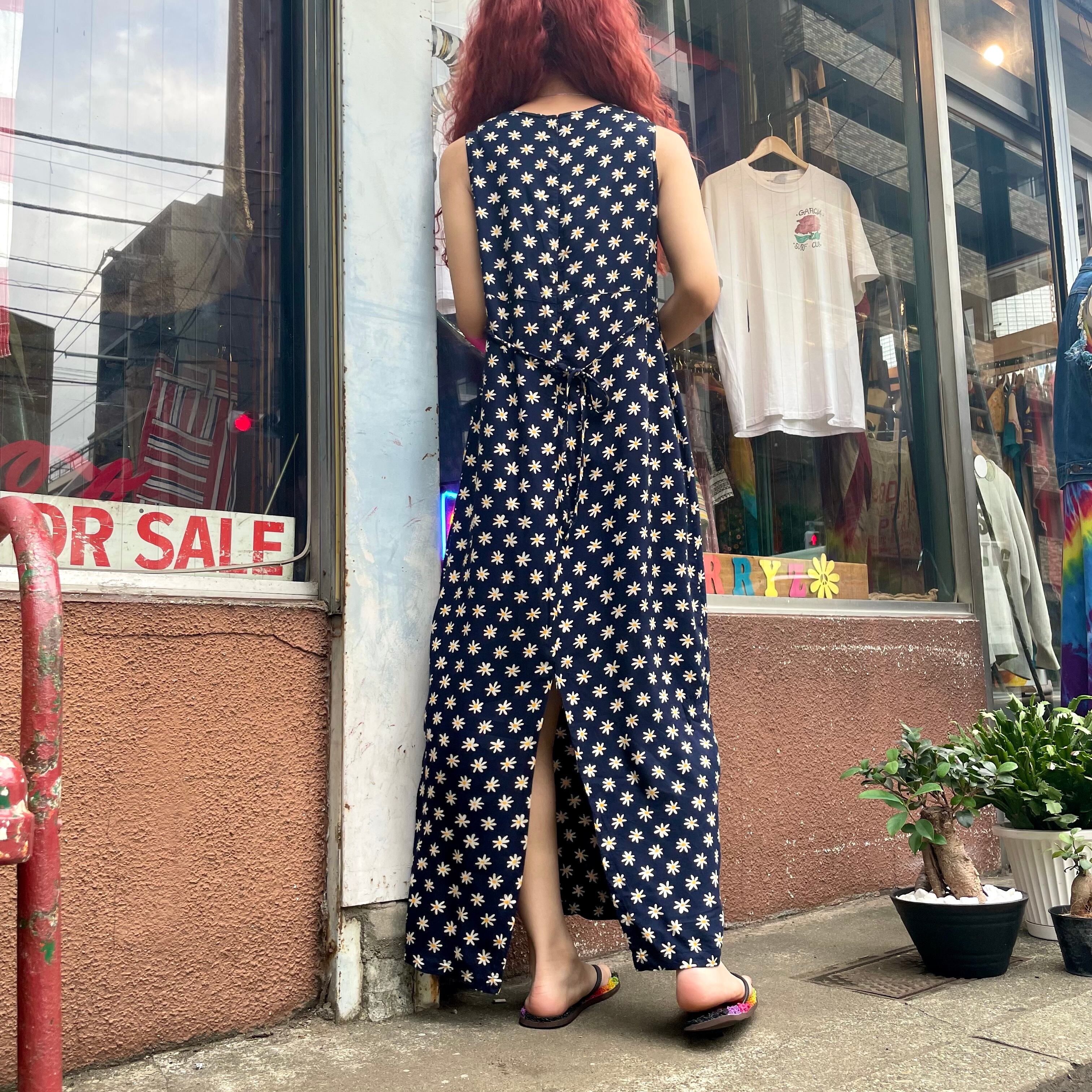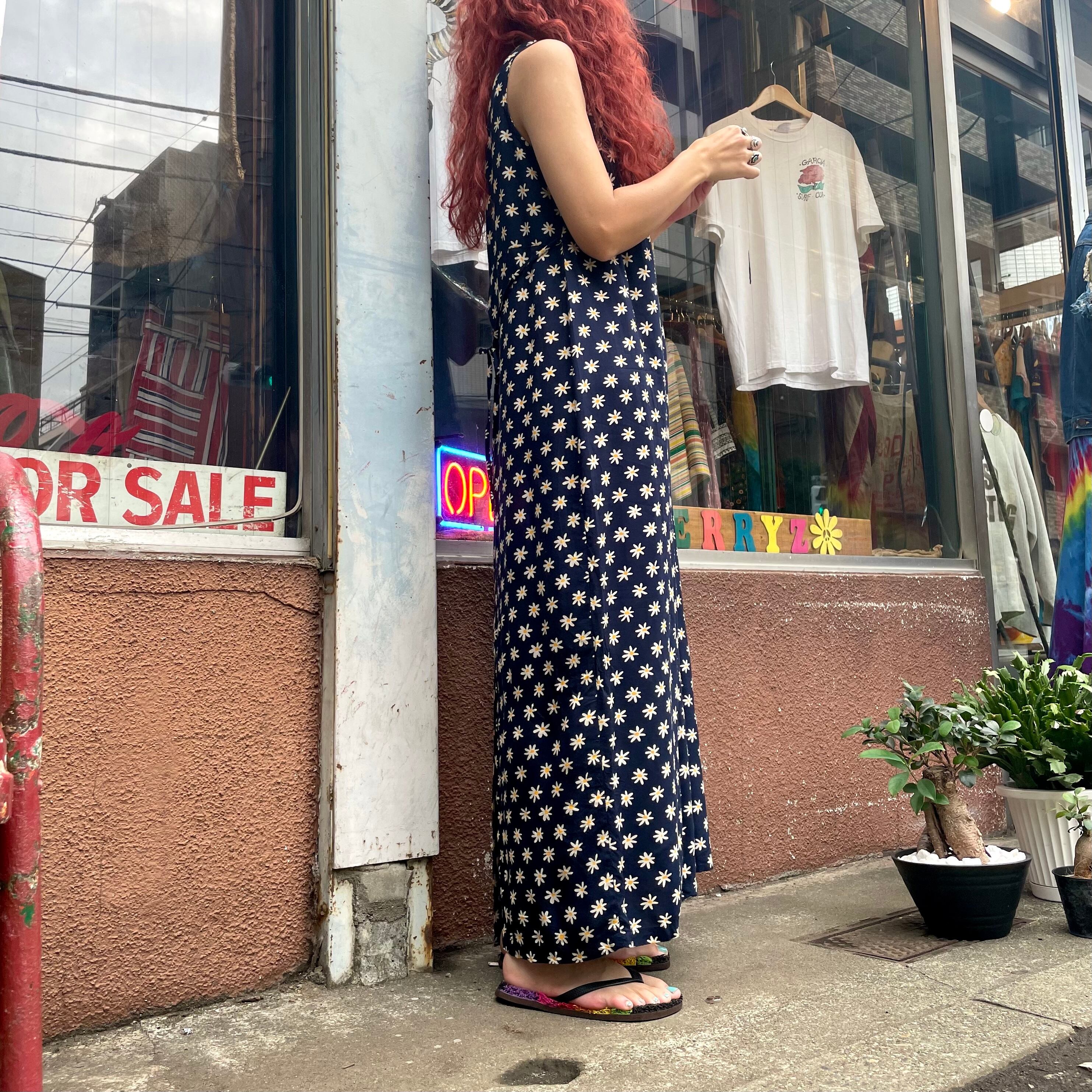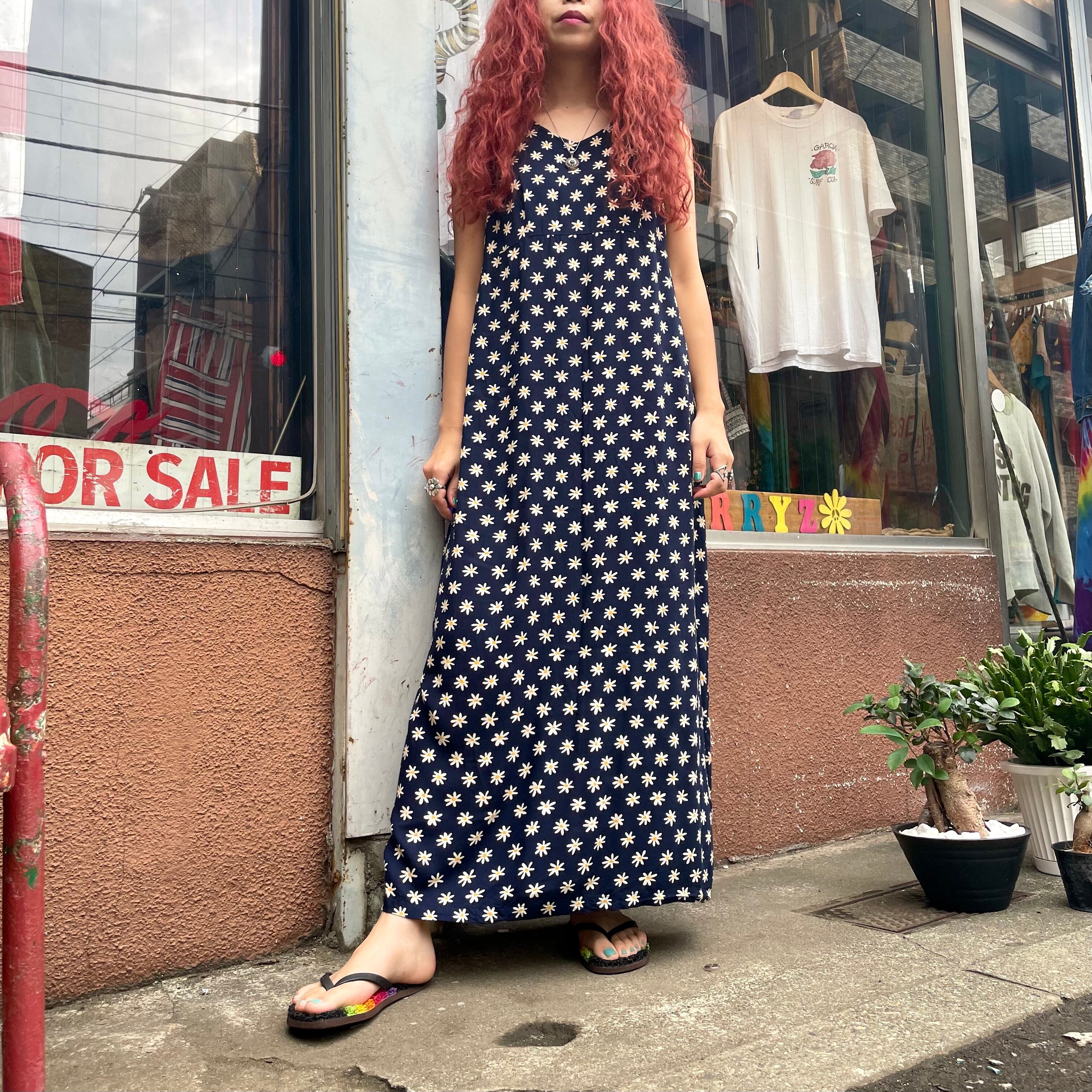 ネイビー地に適当に描いたような白いお花がかわいいワンピースです。