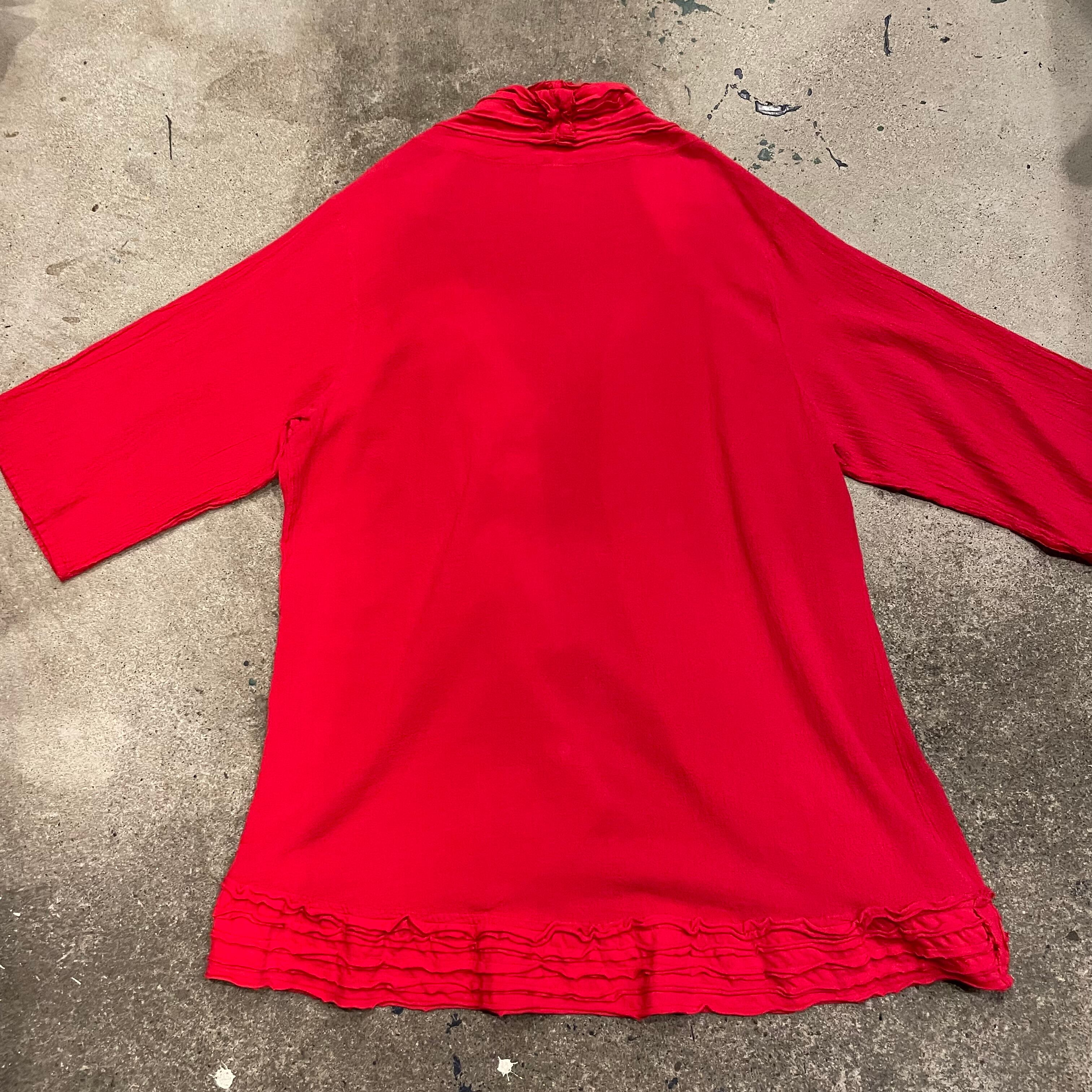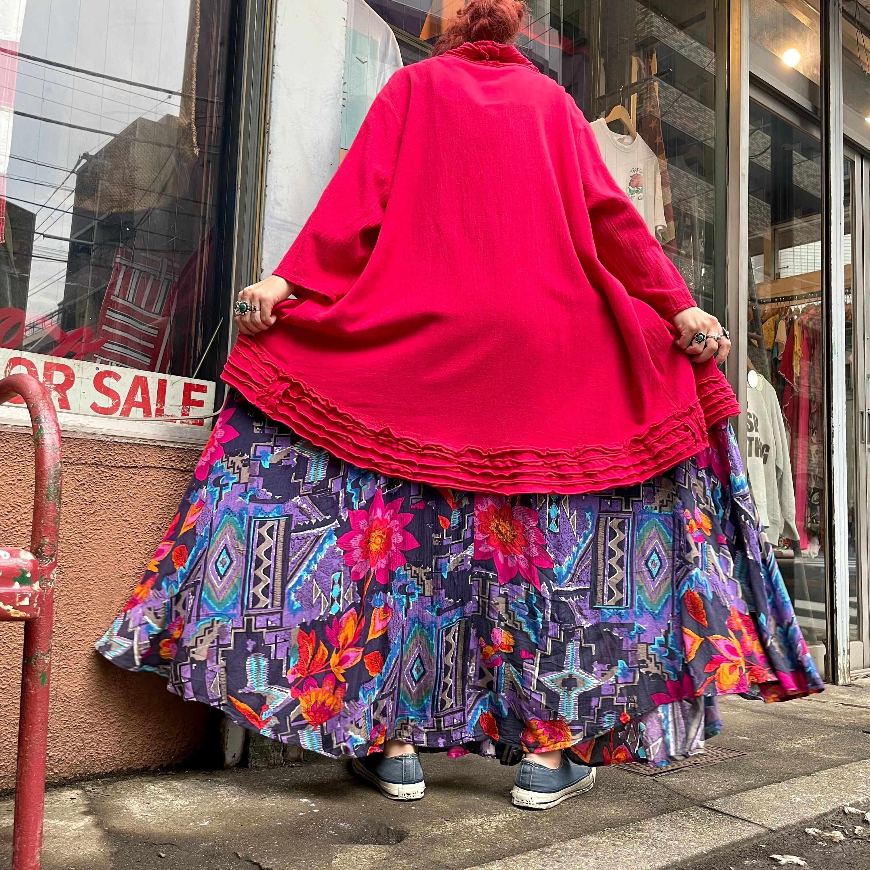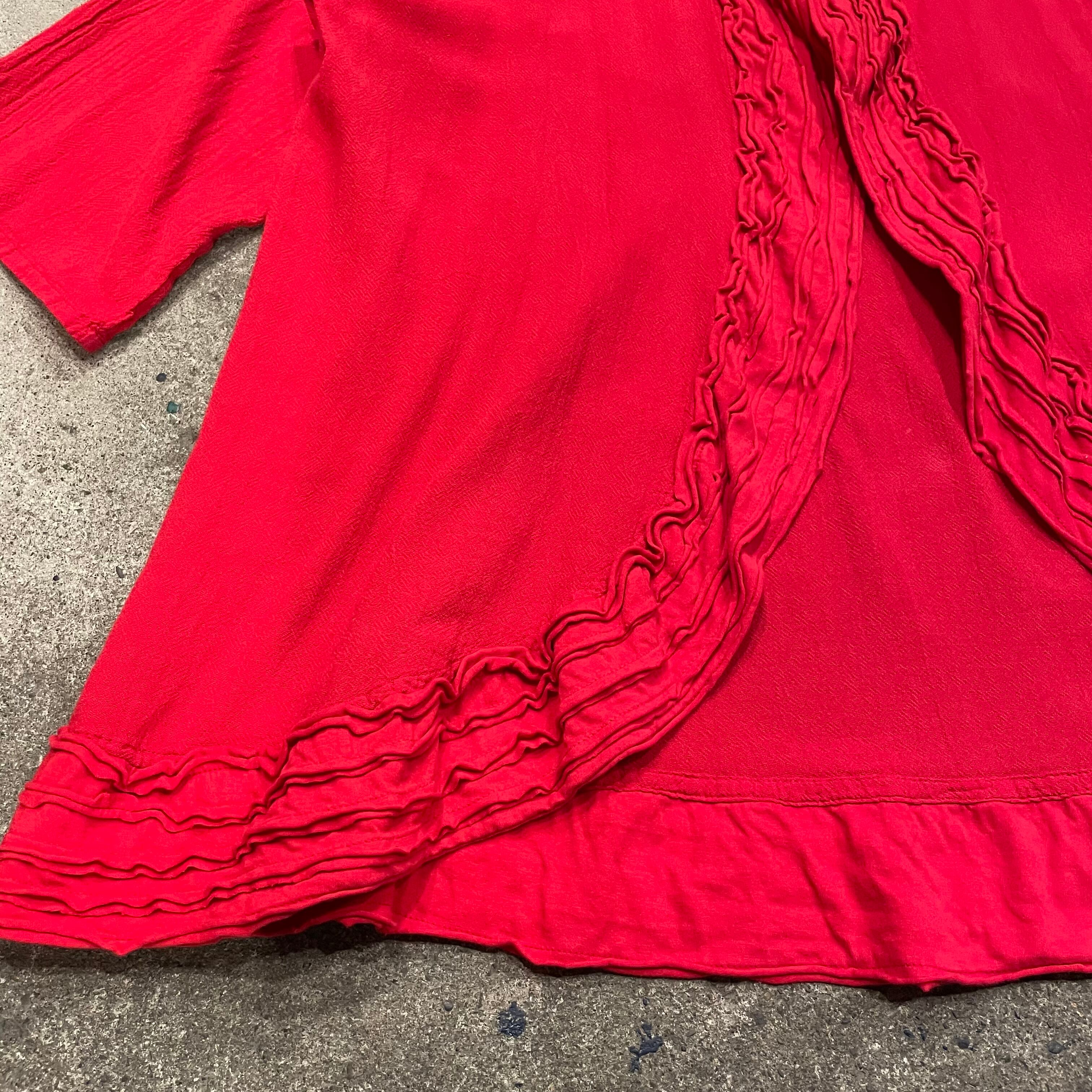 前が丸いカットで襟ぐりから裾までぐるっとフリルがついていてかわいいデザインです。