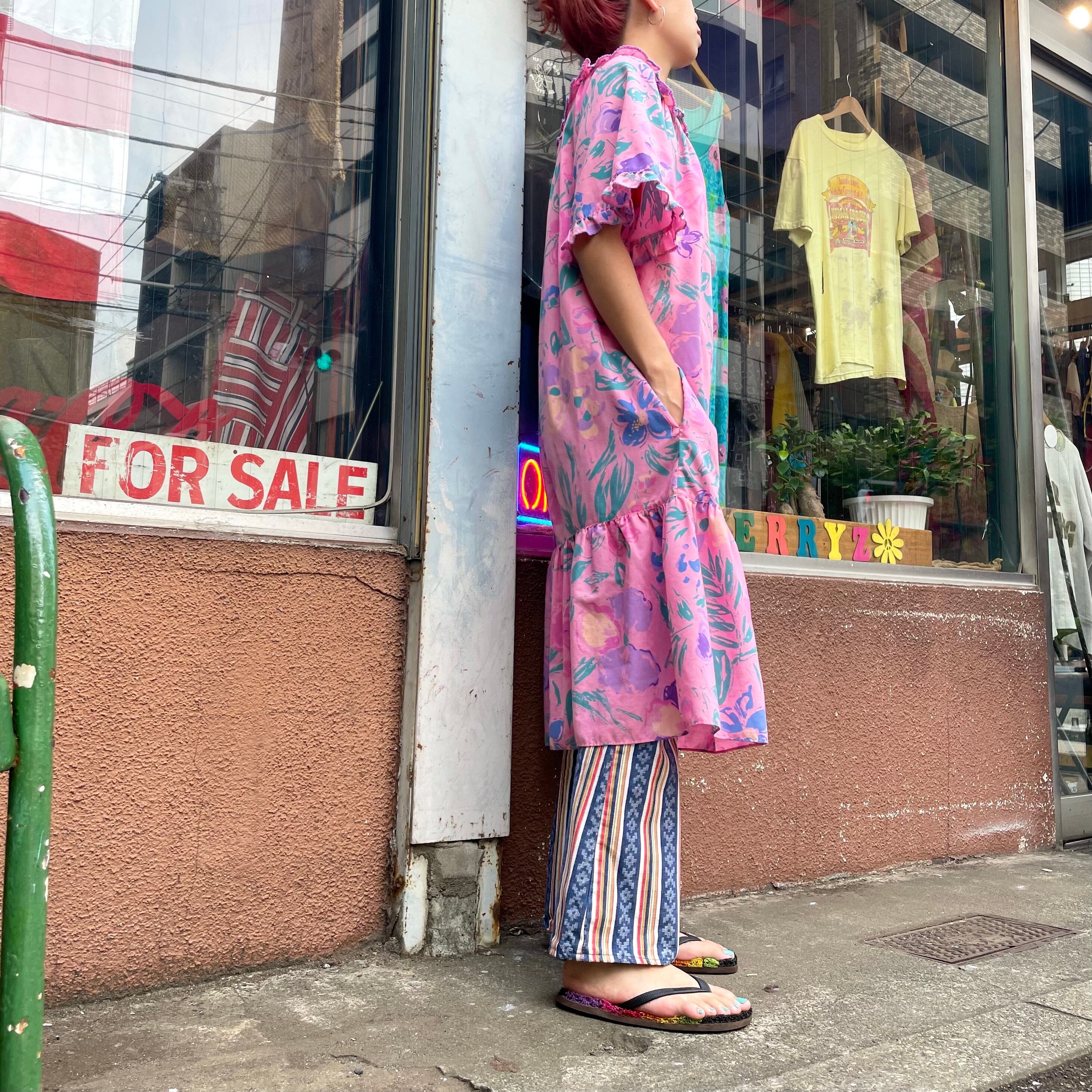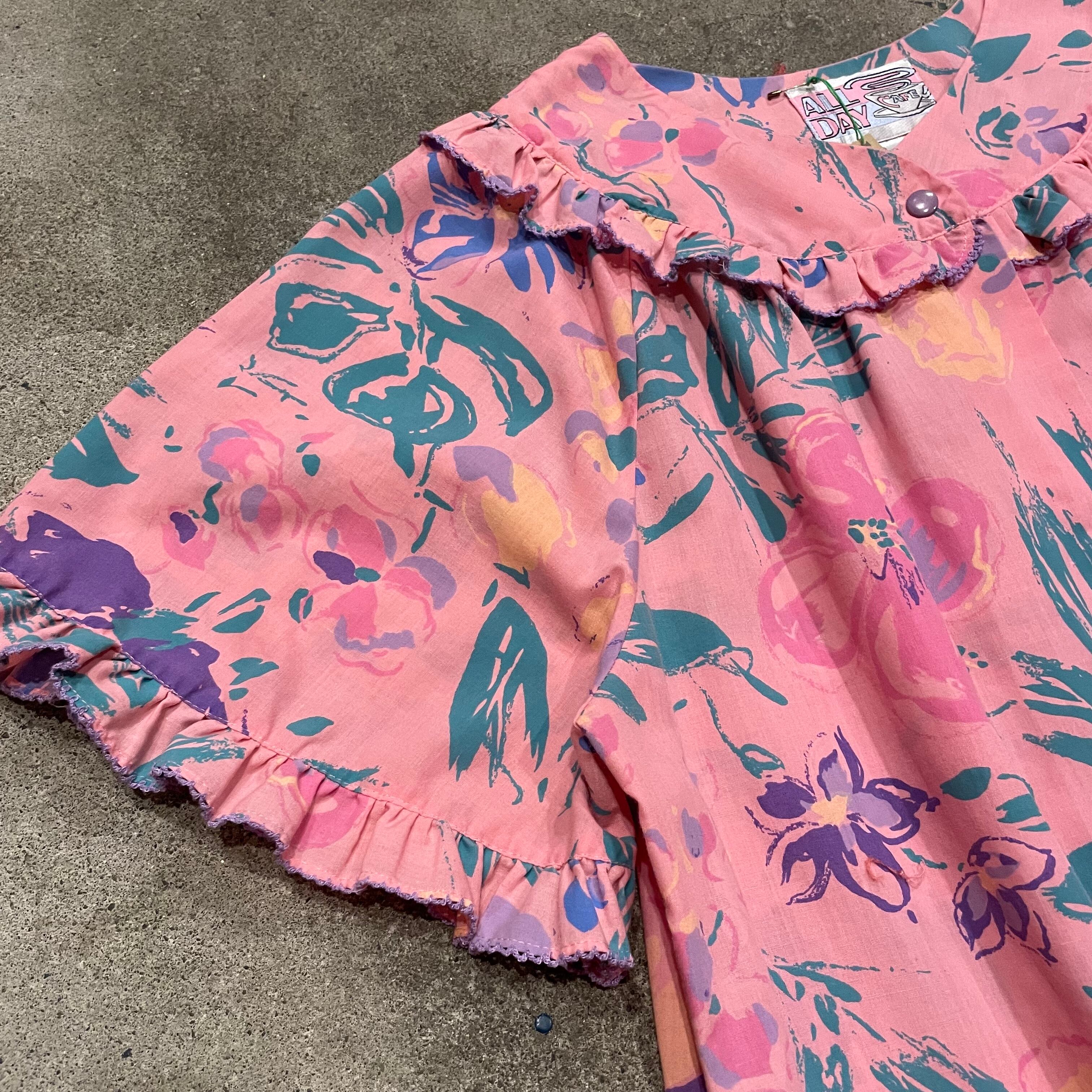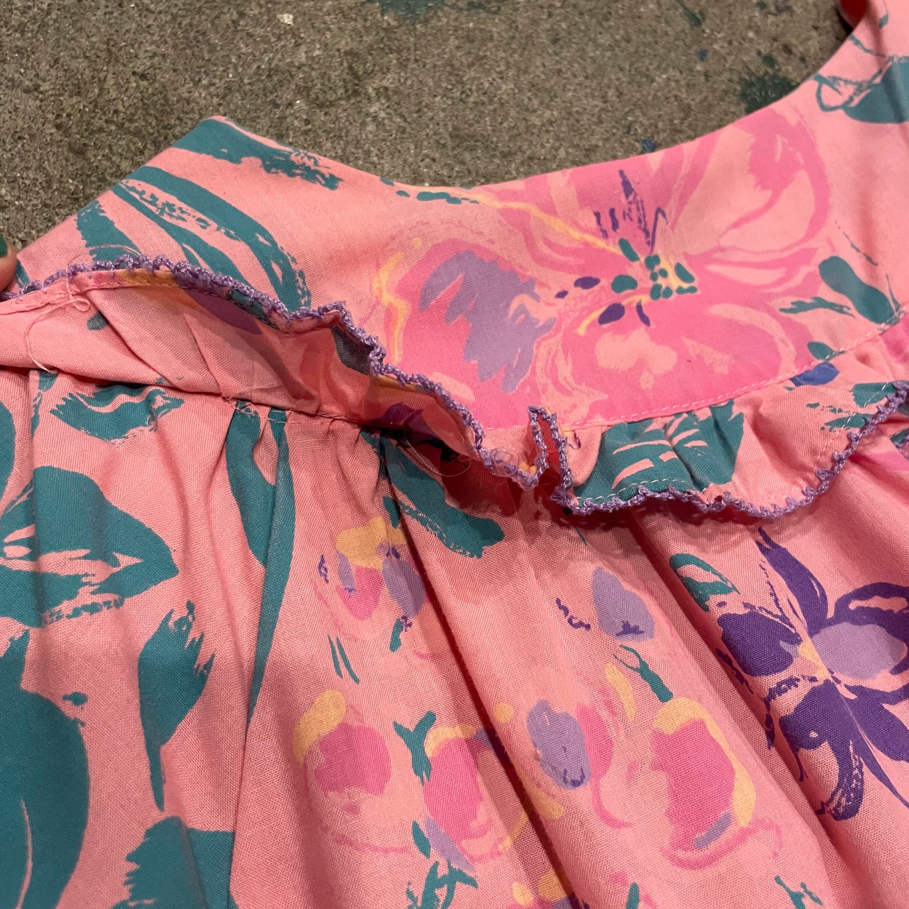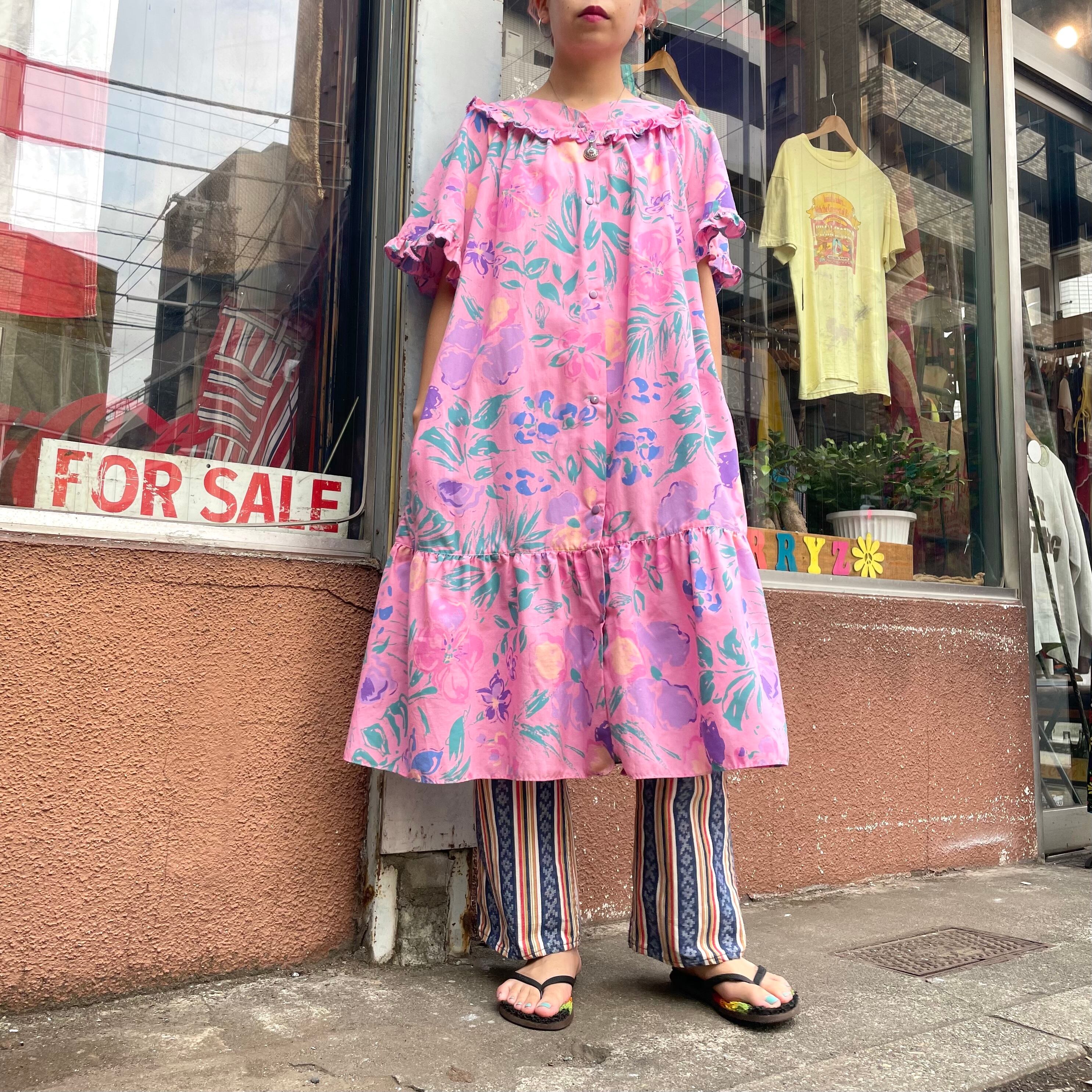 優しいピンク地に絵の具でぴっぴっと描いたような花柄がかわいいワンピースです。