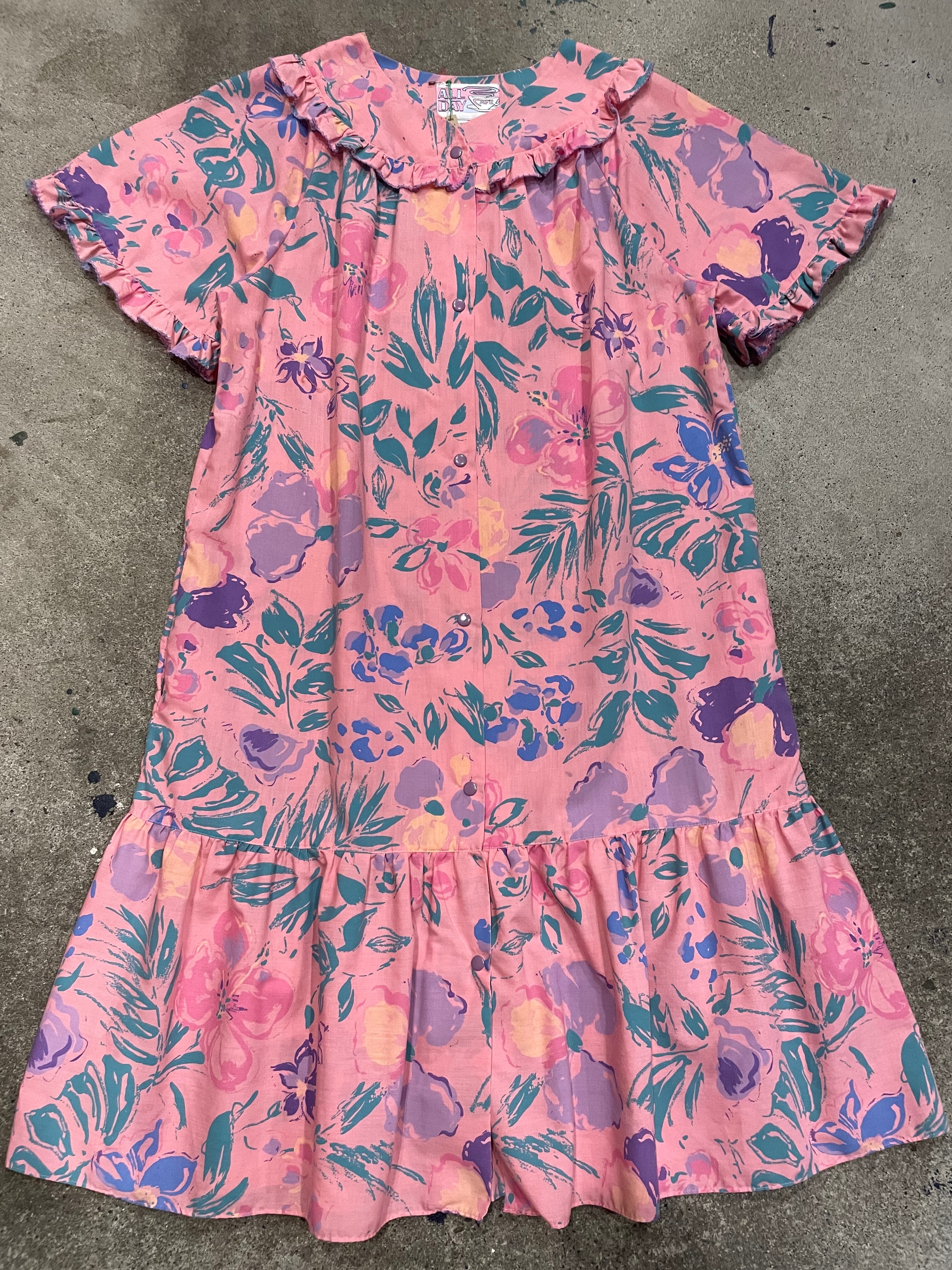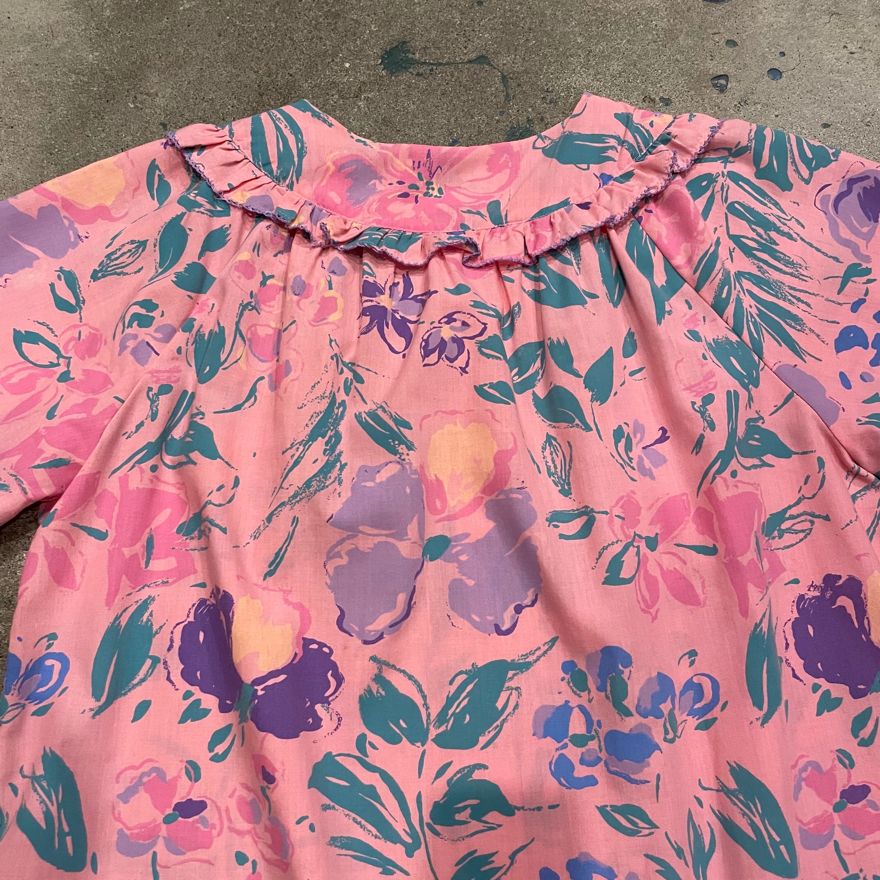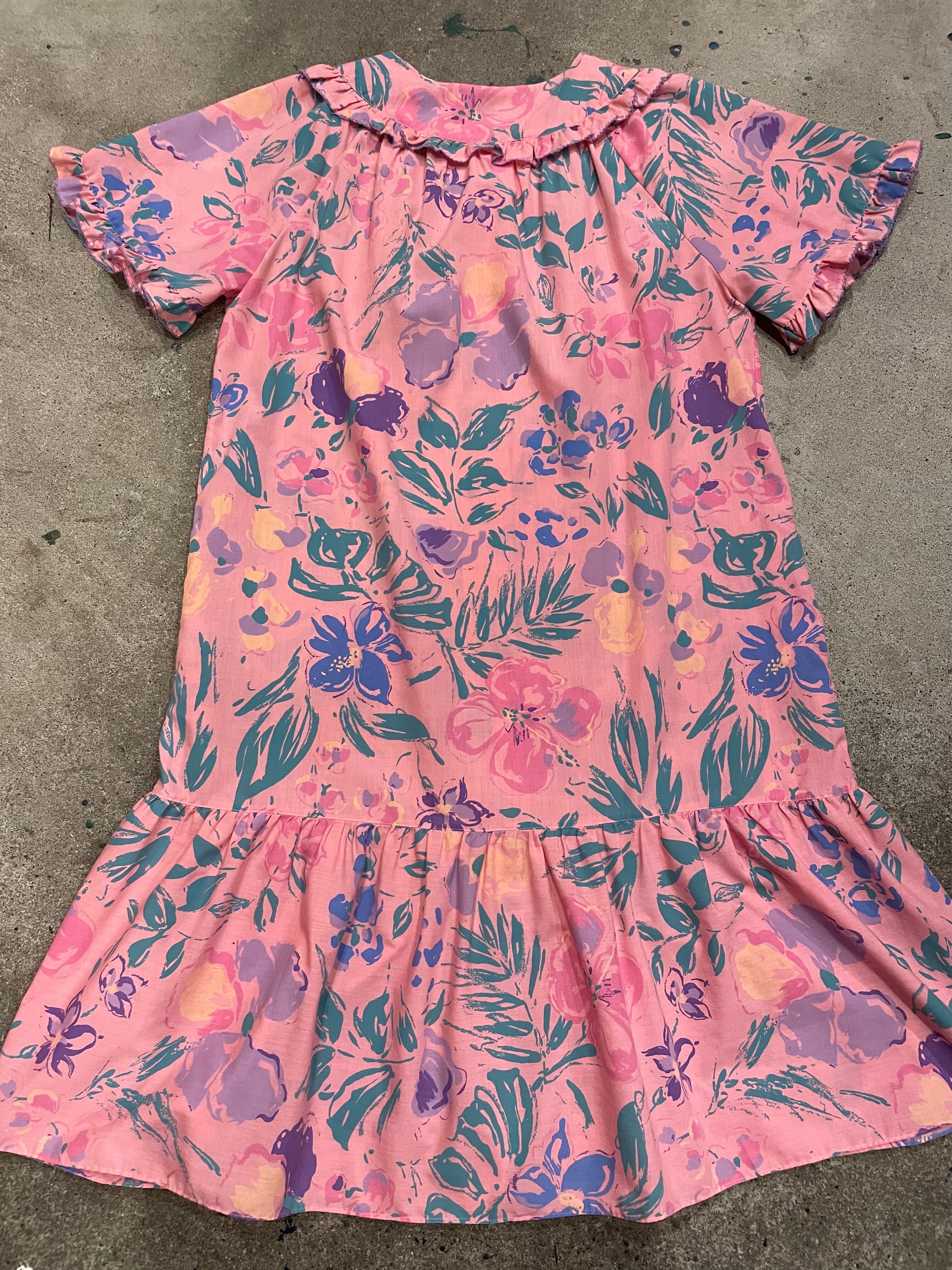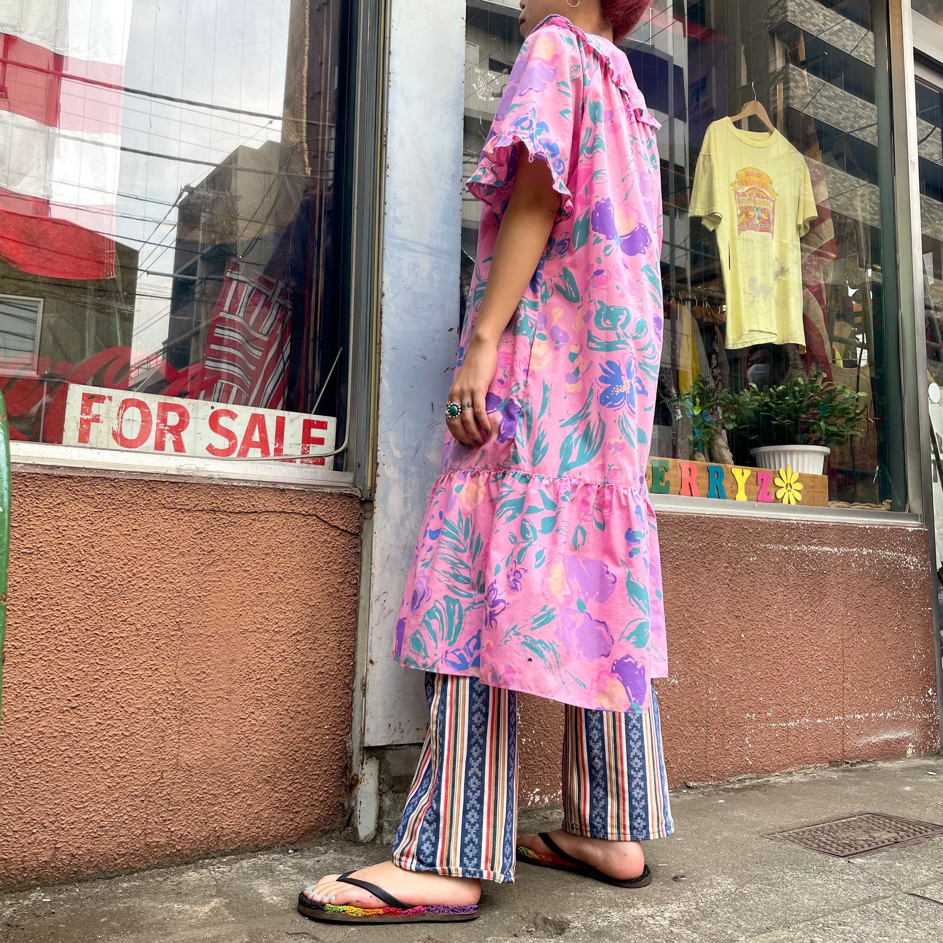 優しいピンク地に絵の具でぴっぴっと描いたような花柄がかわいいワンピースです。
