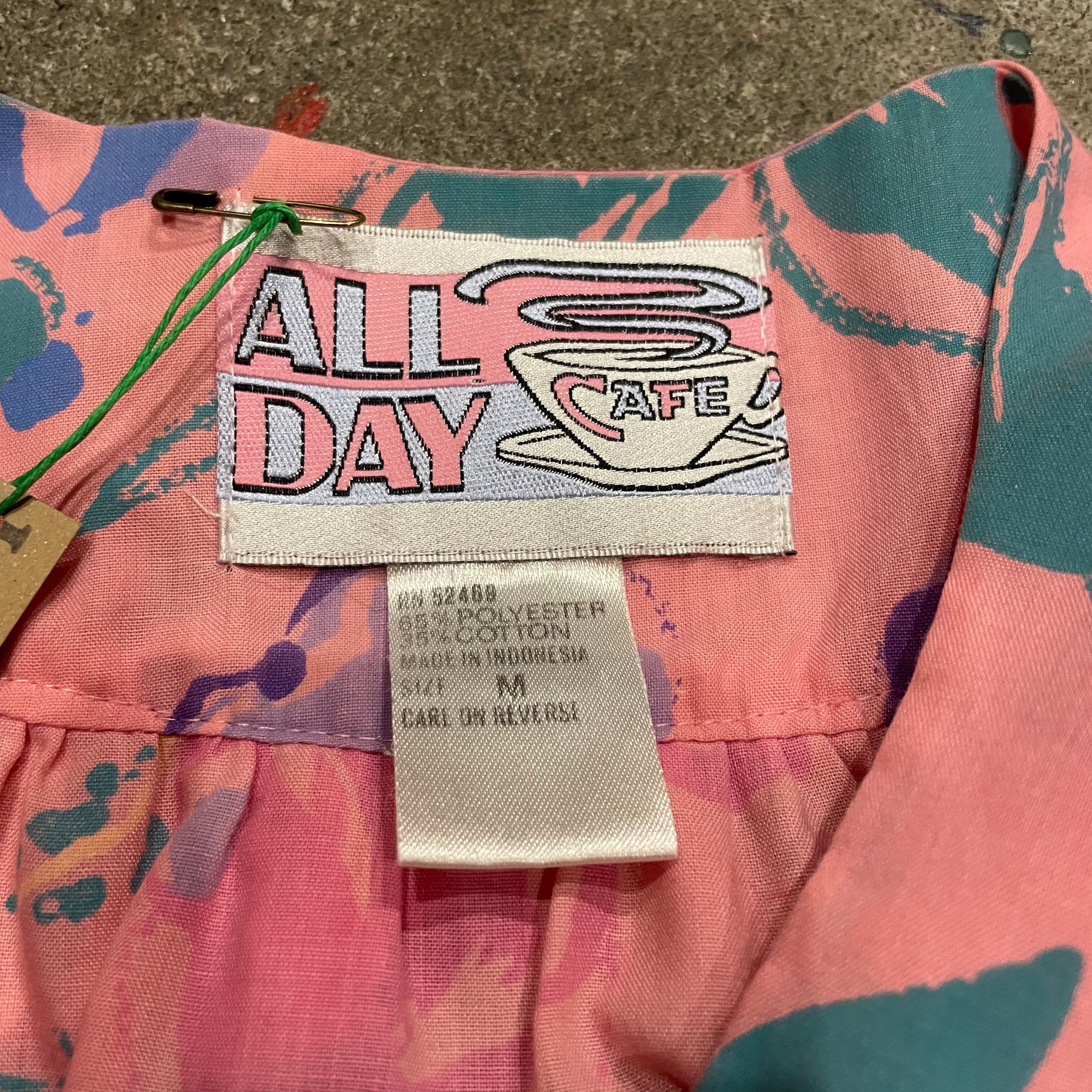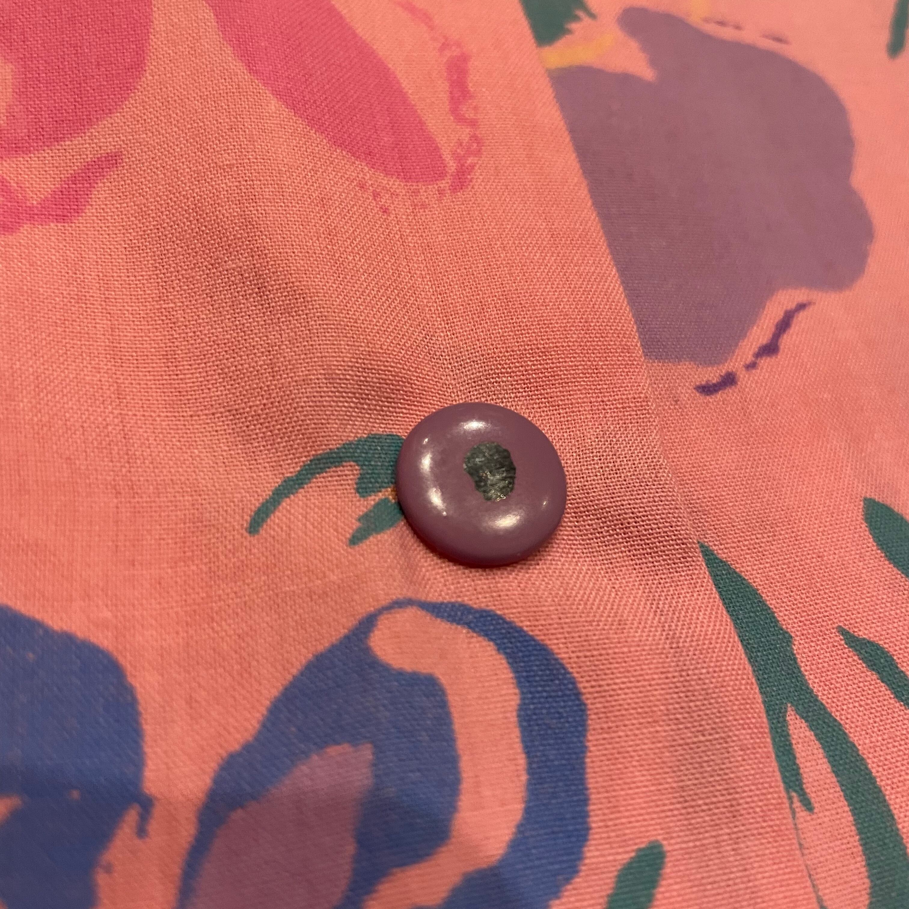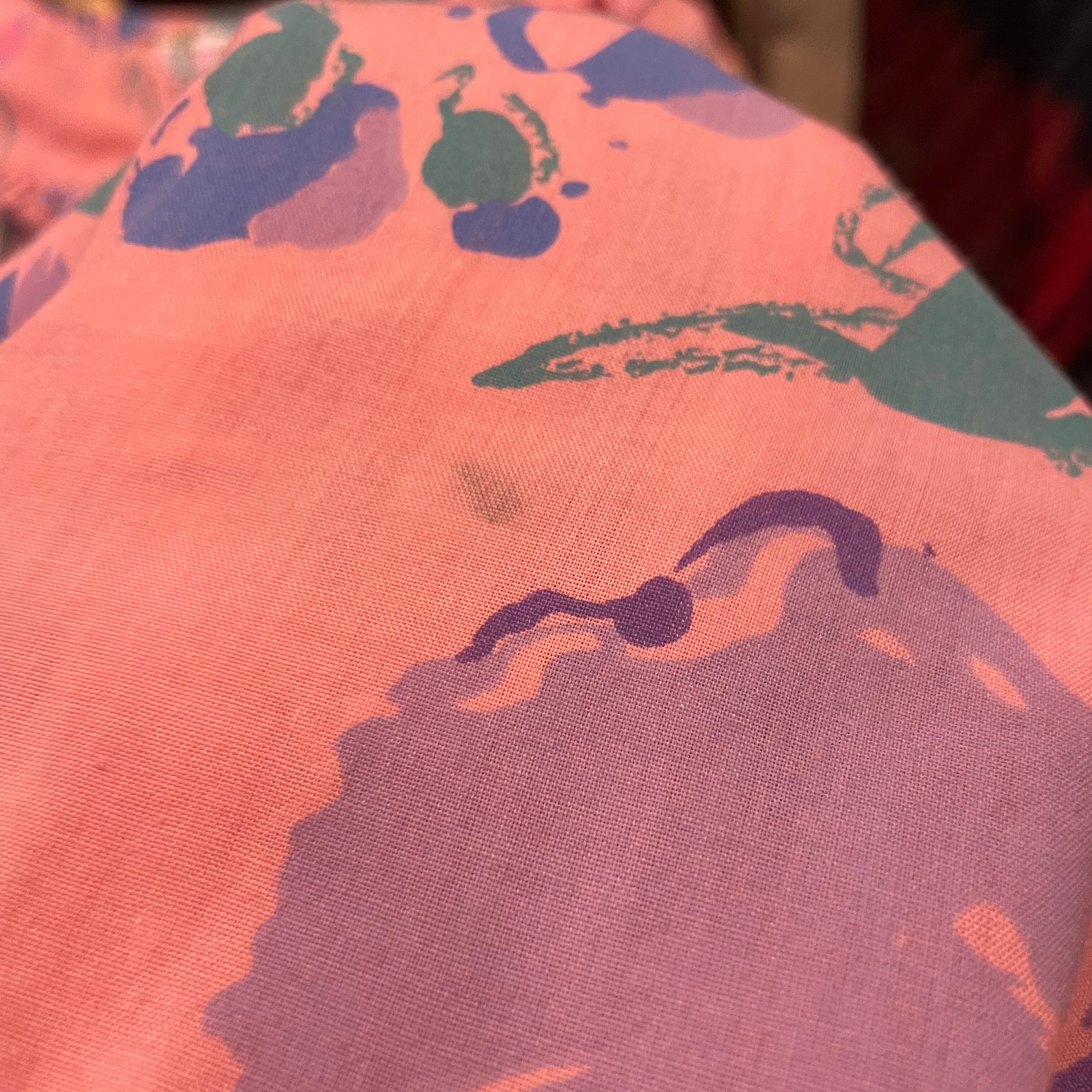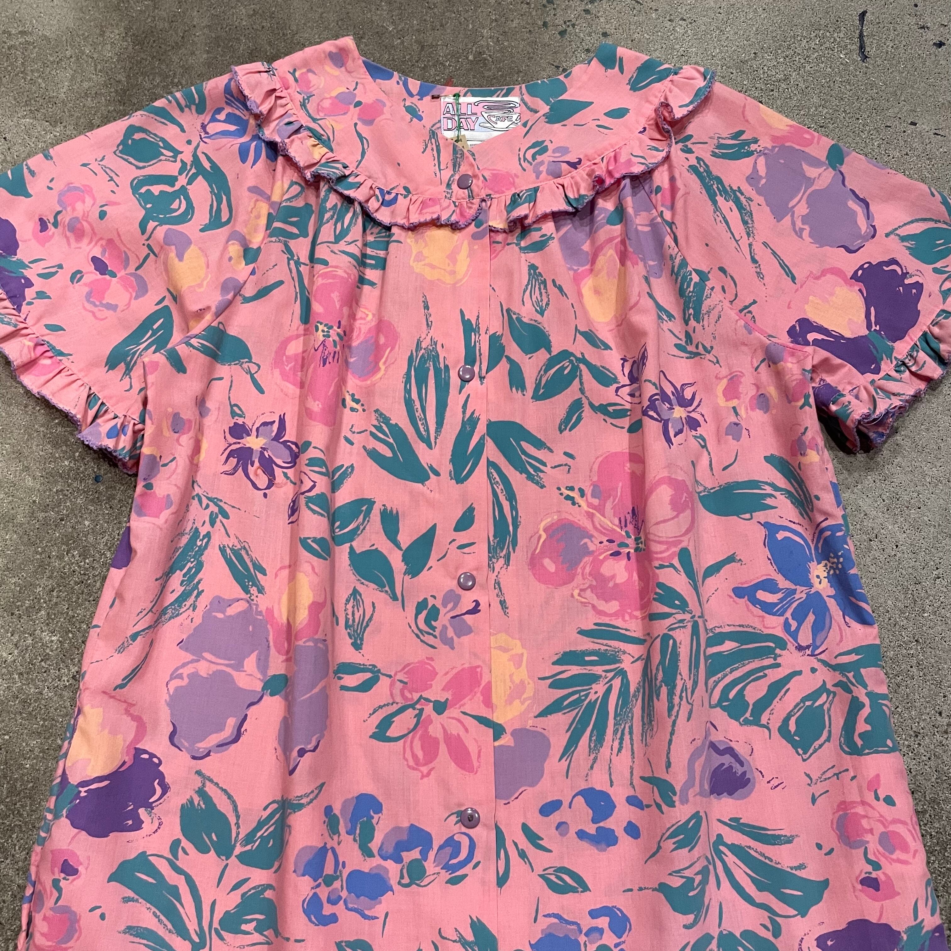 優しいピンク地に絵の具でぴっぴっと描いたような花柄がかわいいワンピースです。