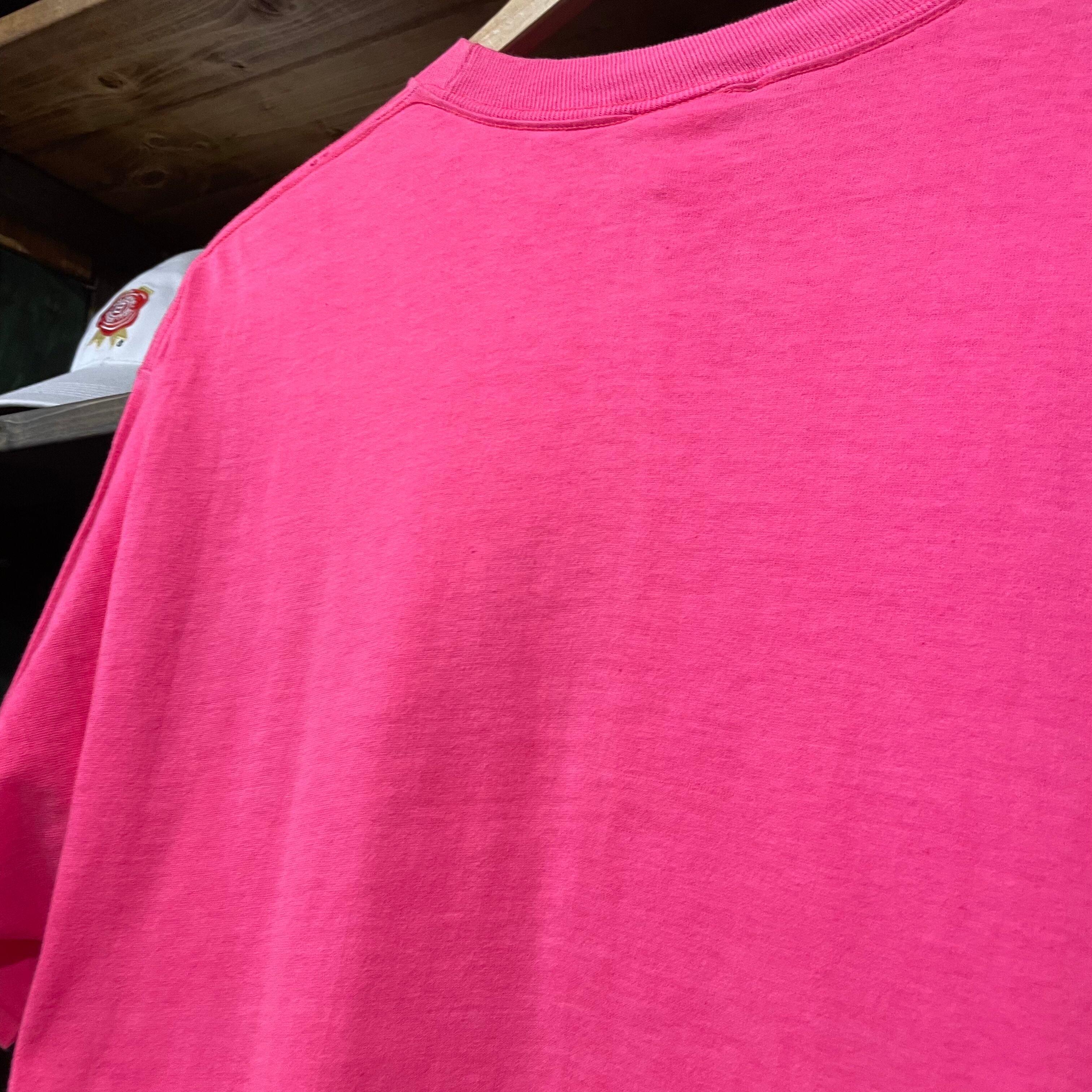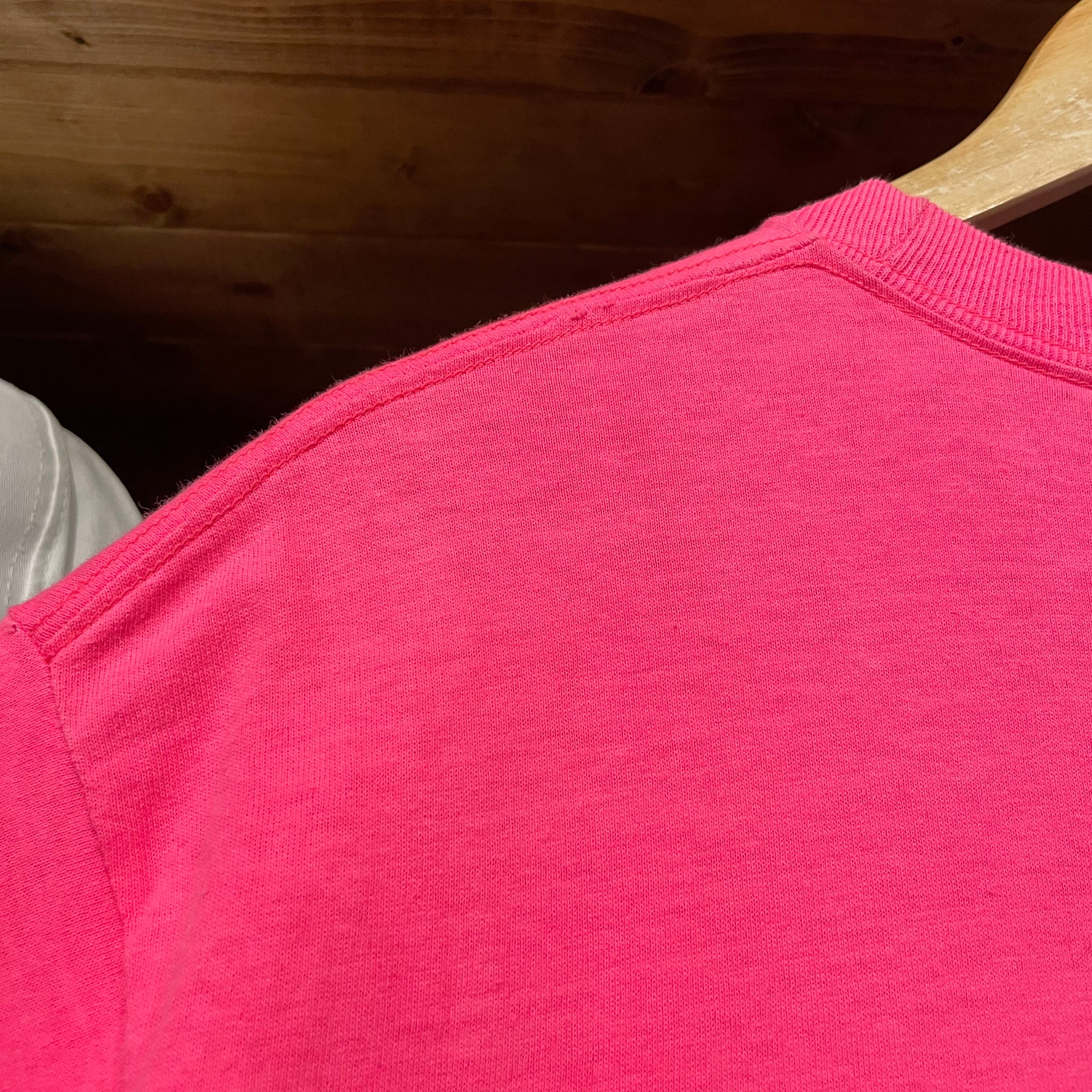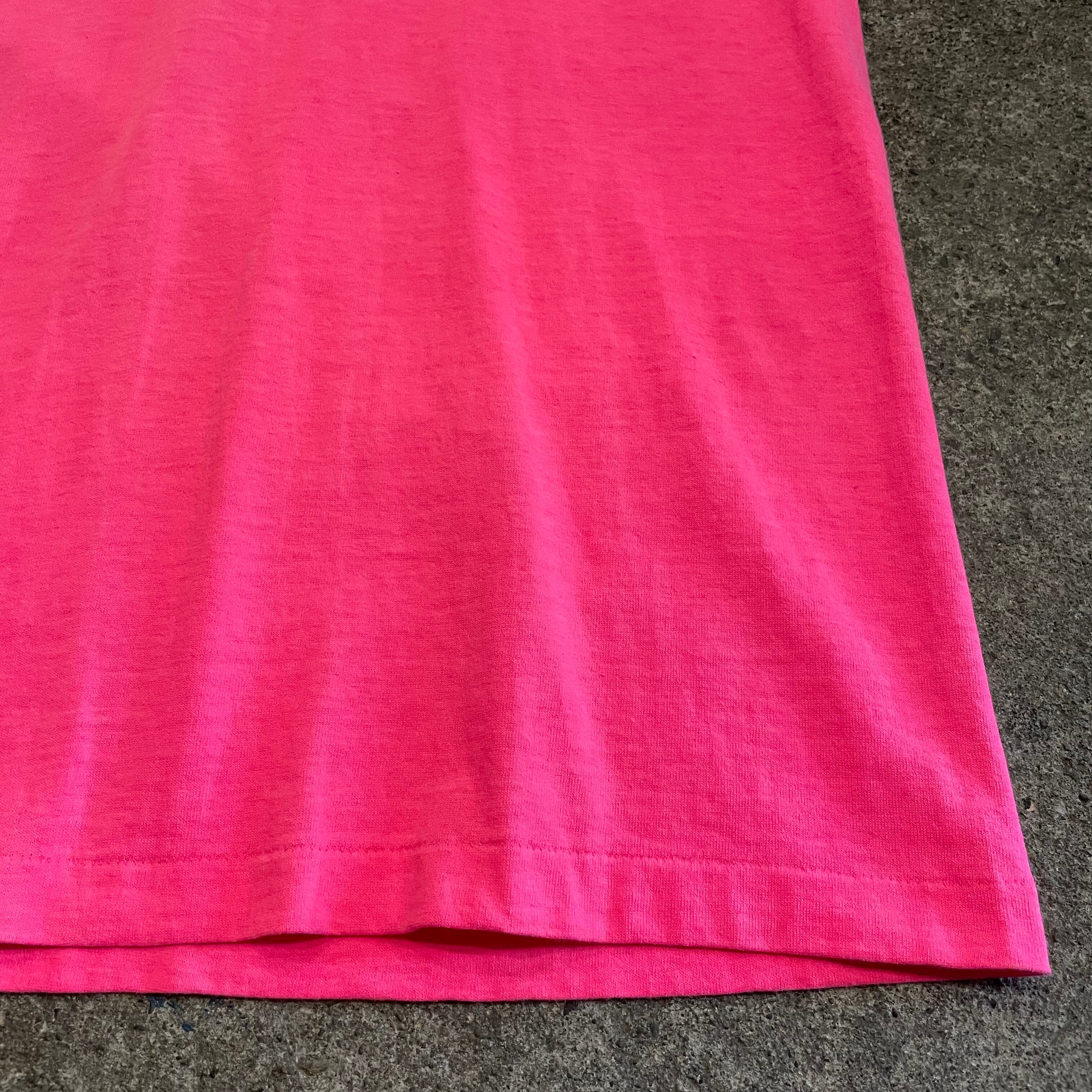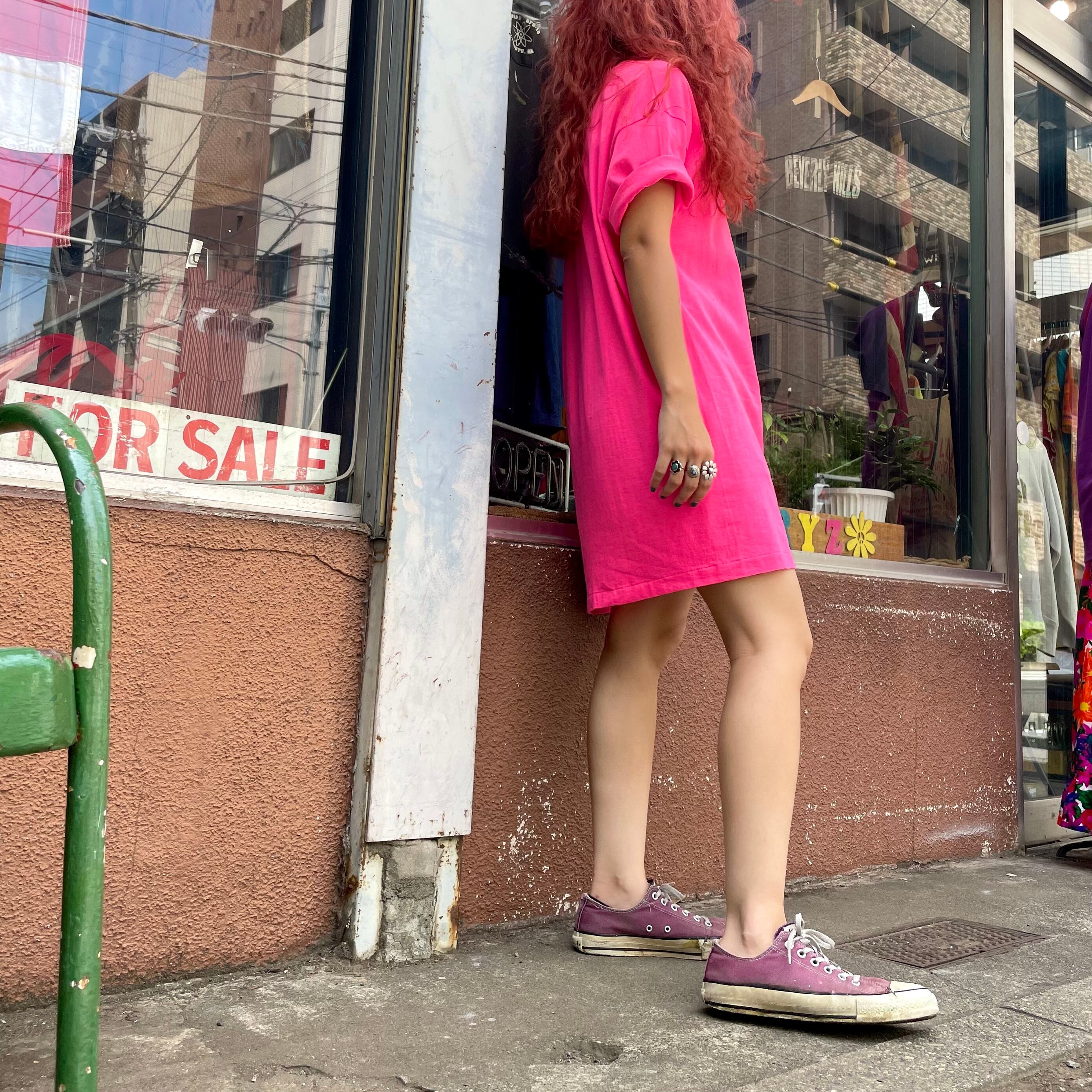 90年代アメリカ製の蛍光ピンクがまぶしい大きいサイズのTシャツです。全体的に大きいというより、丈が長めで身幅はそんなに大きすぎないのでミニワンピースっぽく着るのがおすすめです。