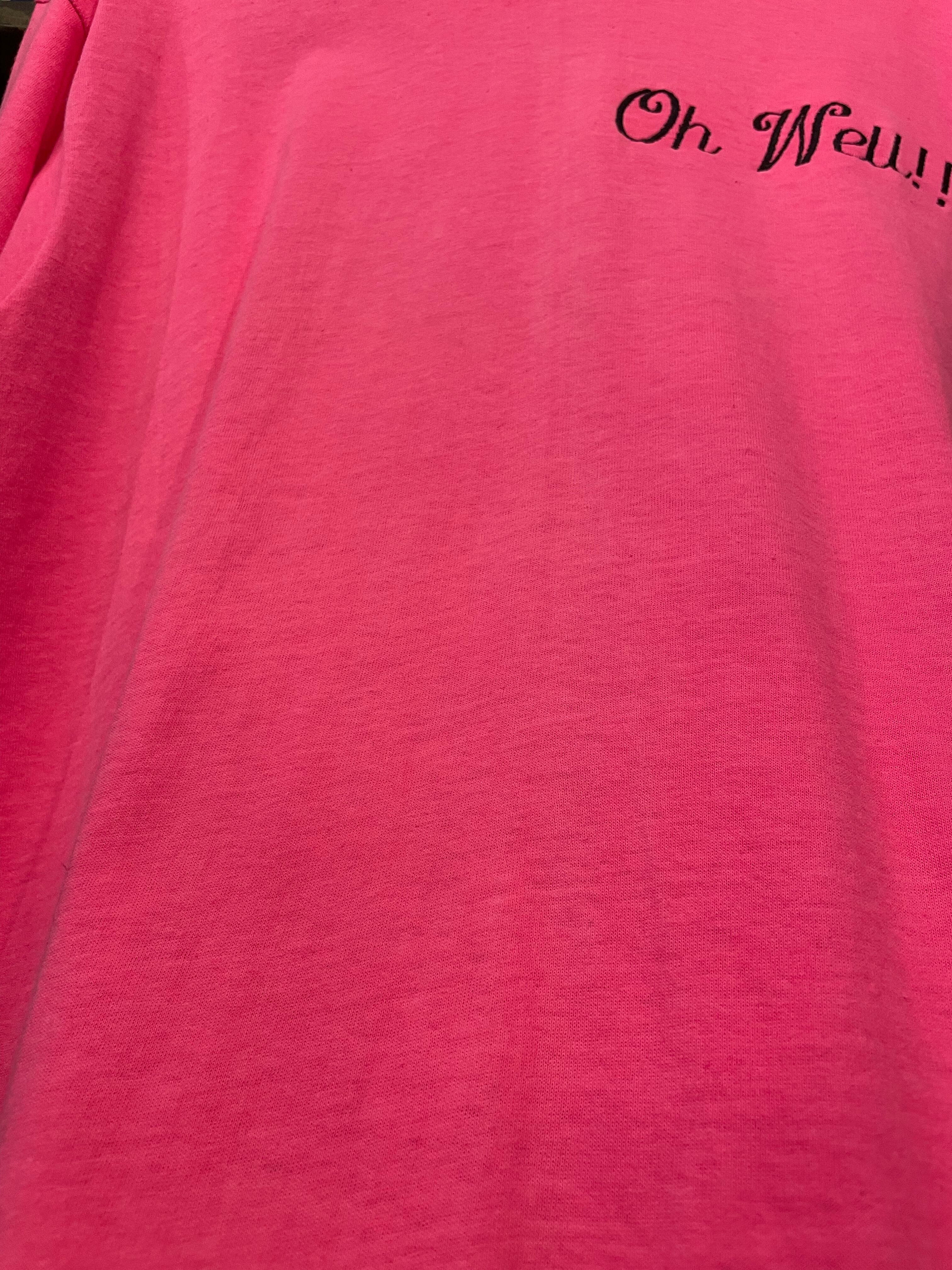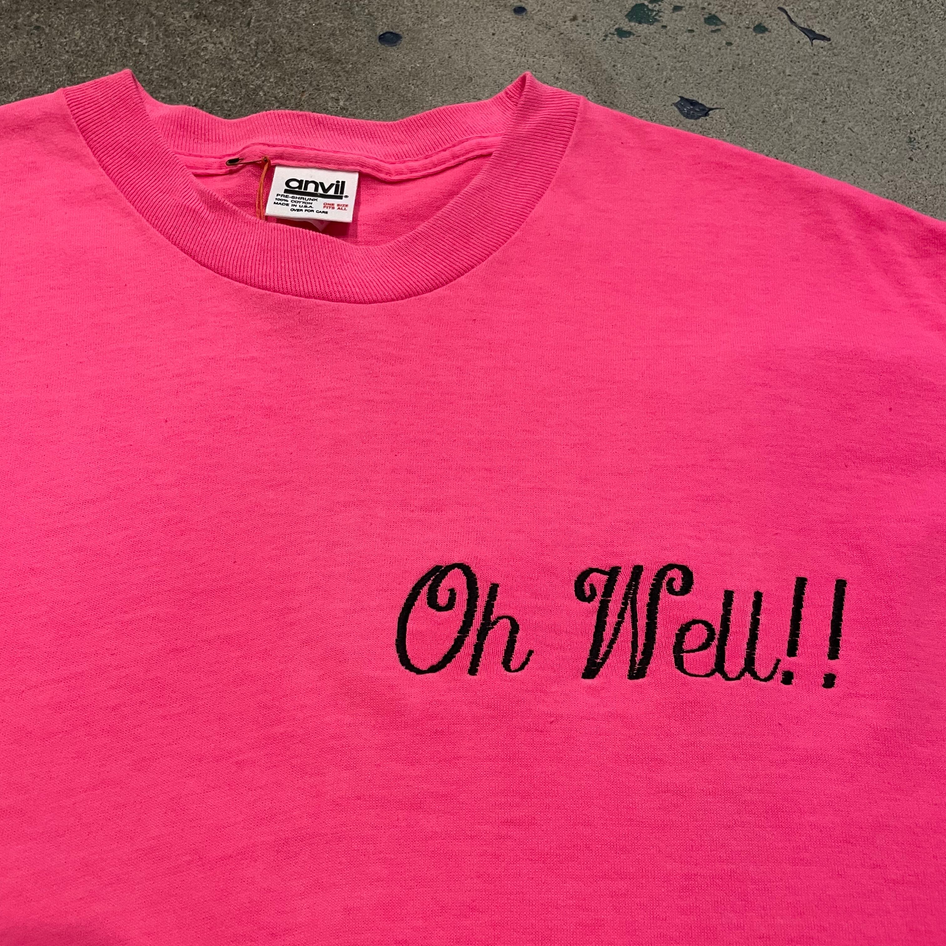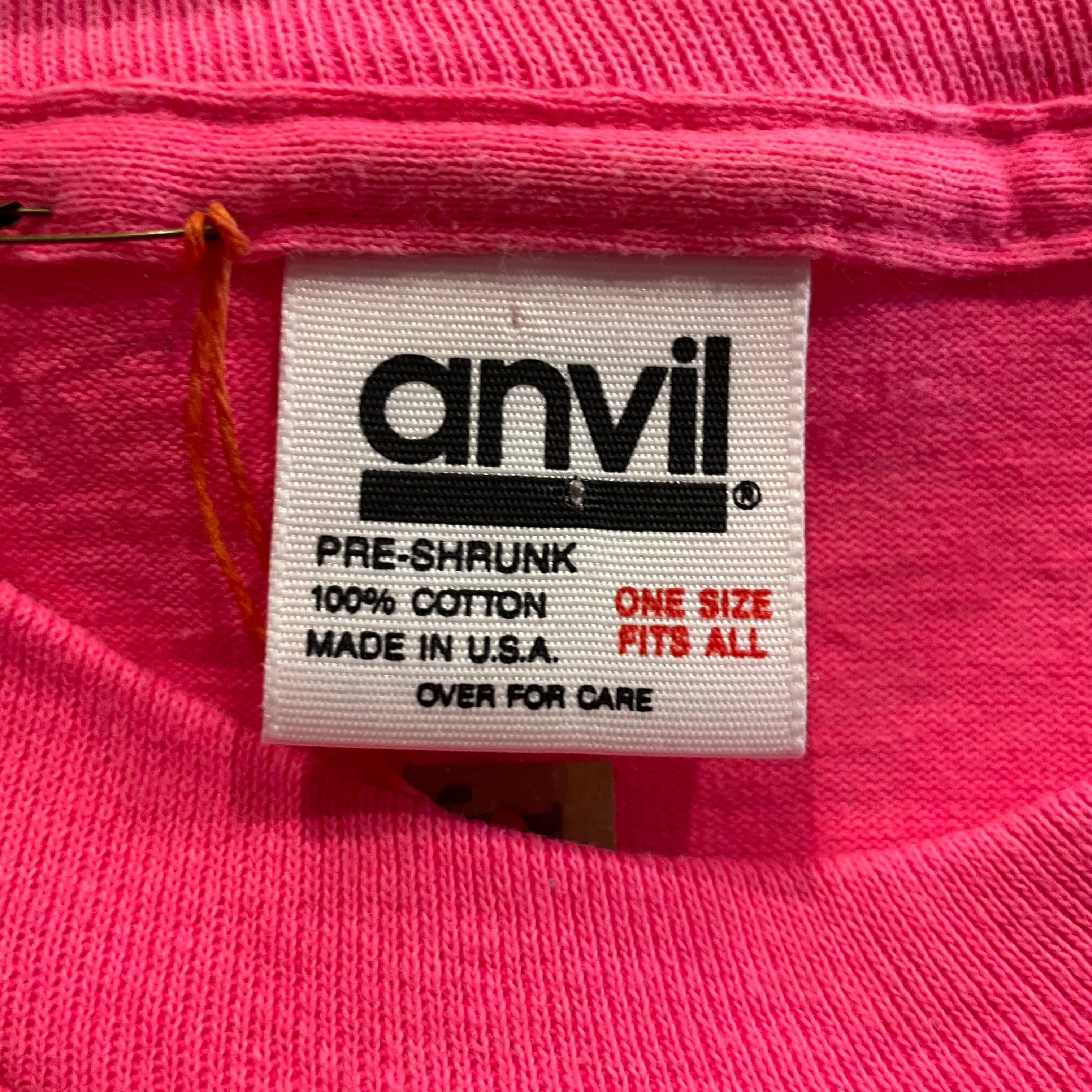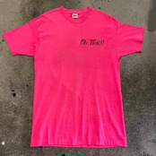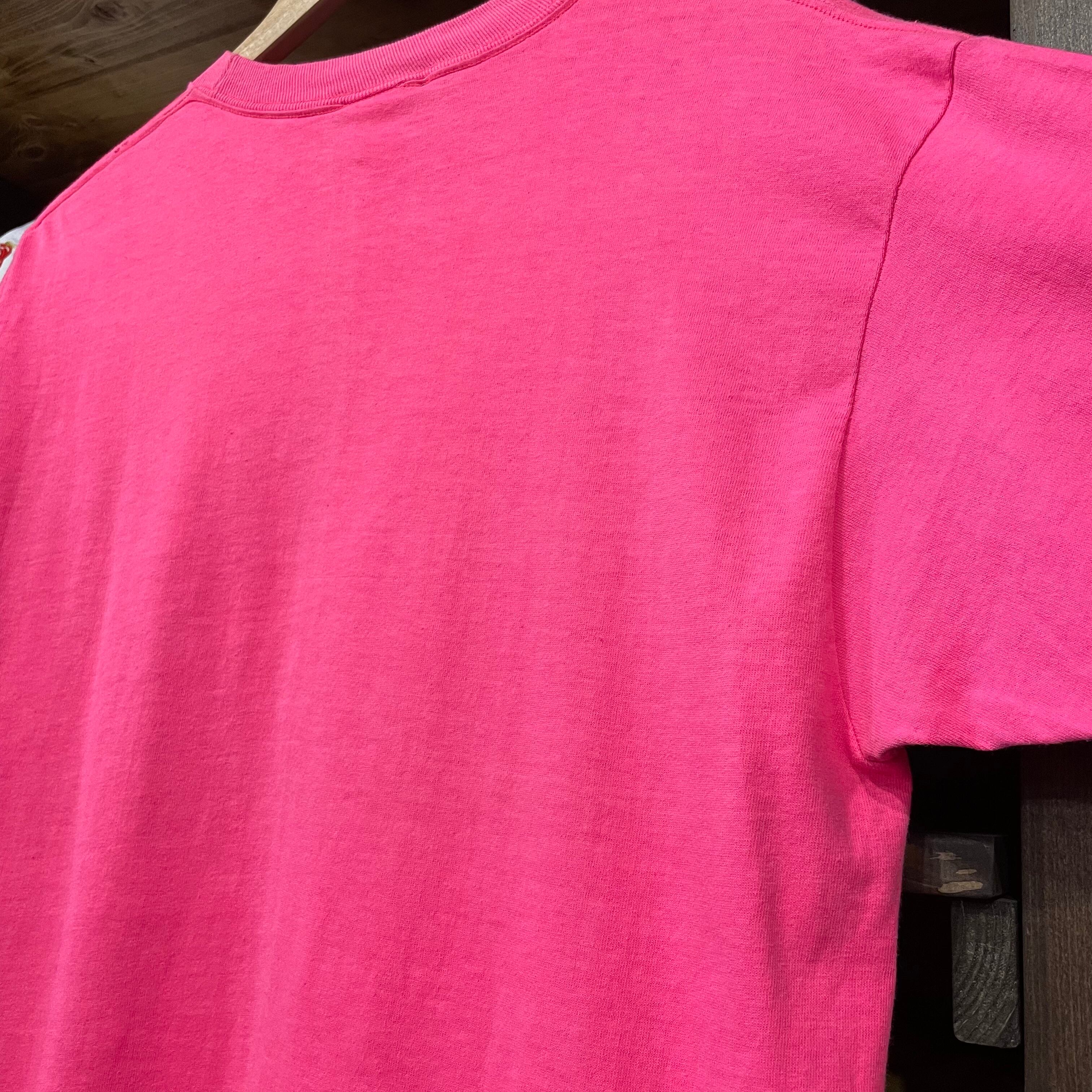 90年代アメリカ製の蛍光ピンクがまぶしい大きいサイズのTシャツです。全体的に大きいというより、丈が長めで身幅はそんなに大きすぎないのでミニワンピースっぽく着るのがおすすめです。