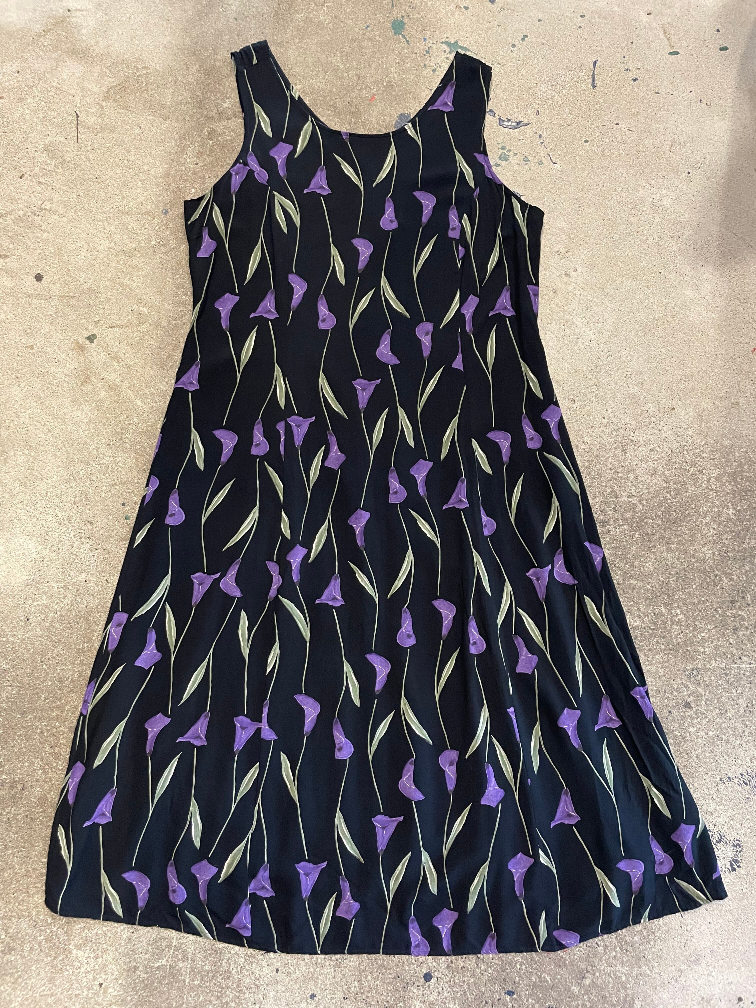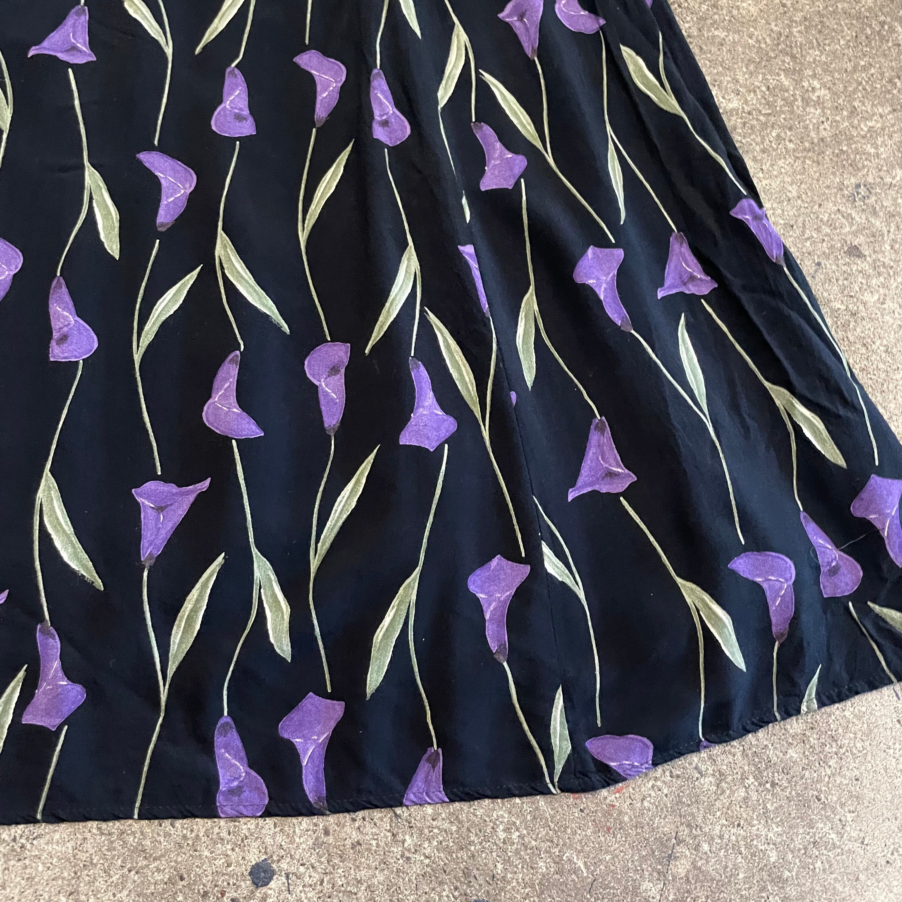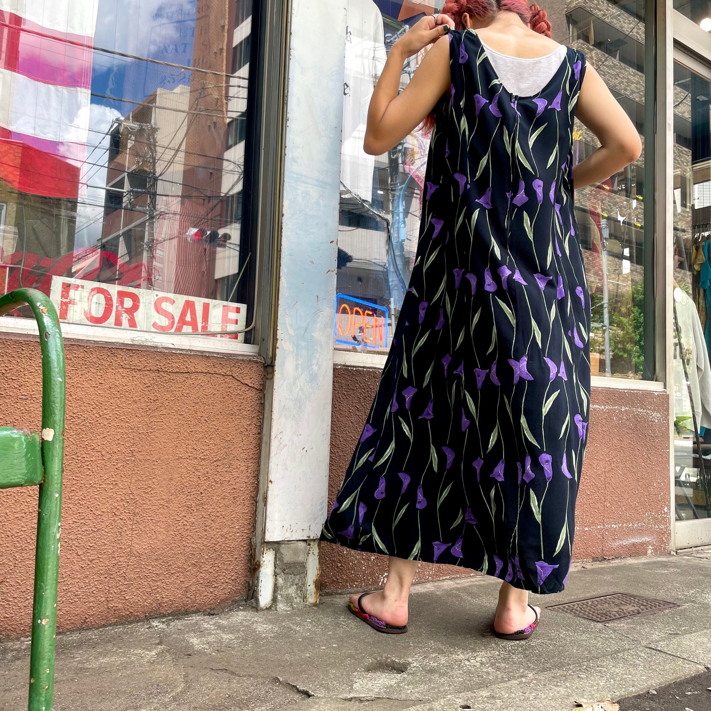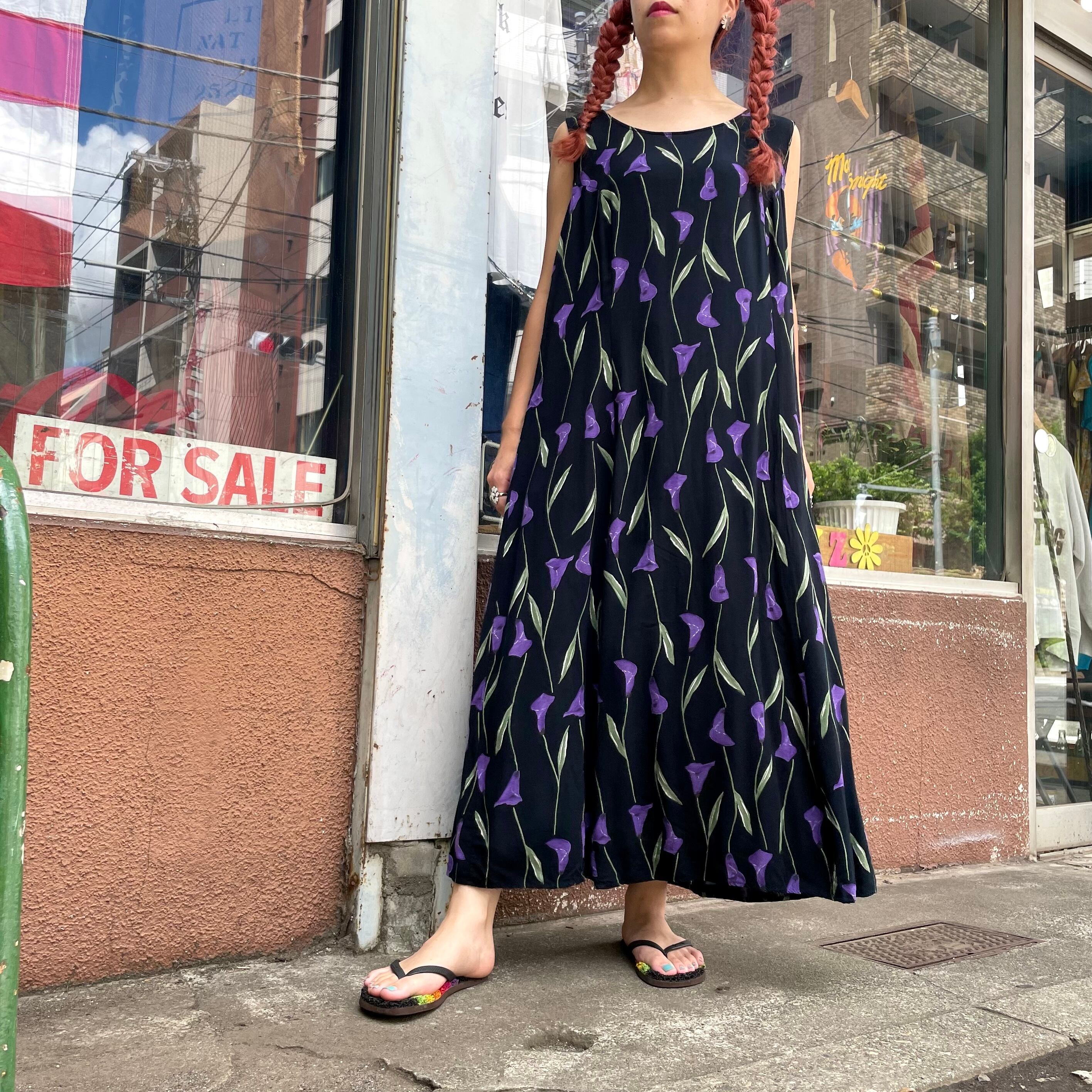 黒地にカラーらしき紫の花柄が素敵なワンピースてす。薄手のレーヨンのゆったりしたシルエットで、軽い!涼しい!楽ちん!な一着です。