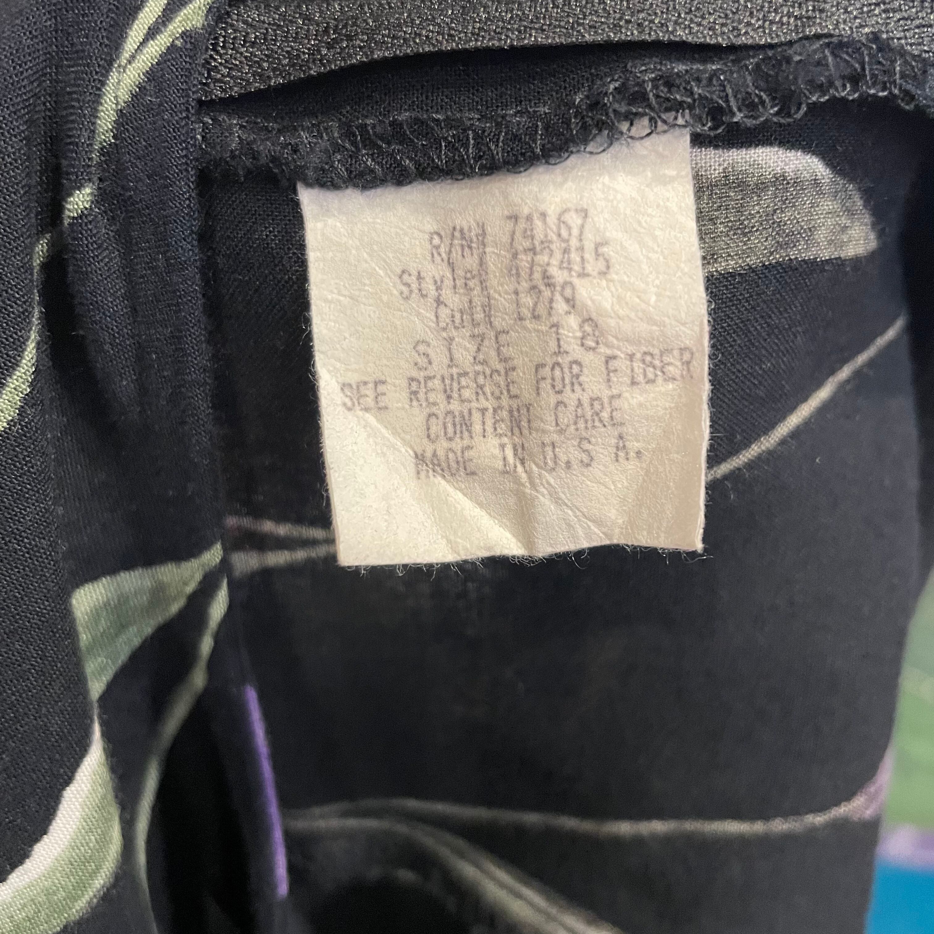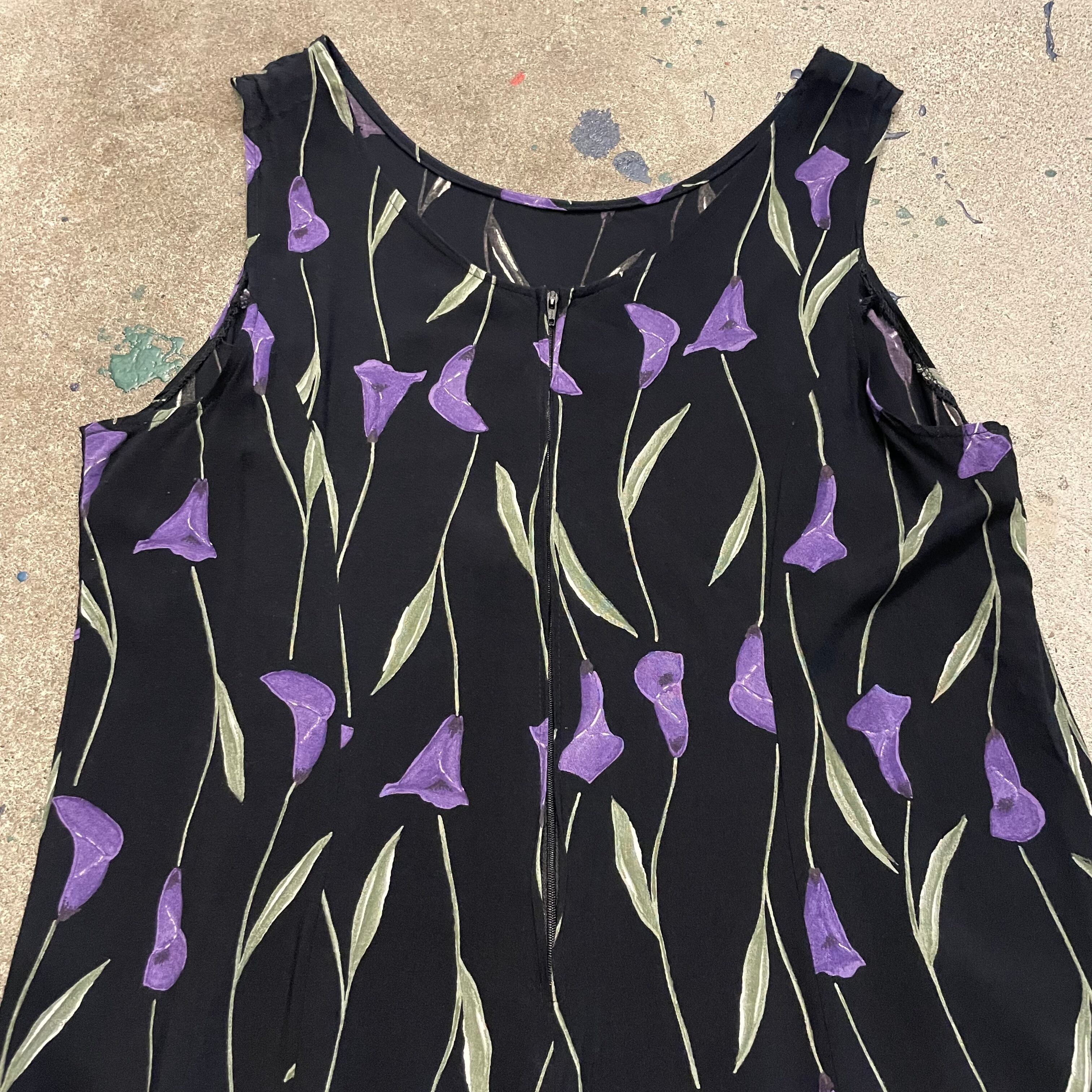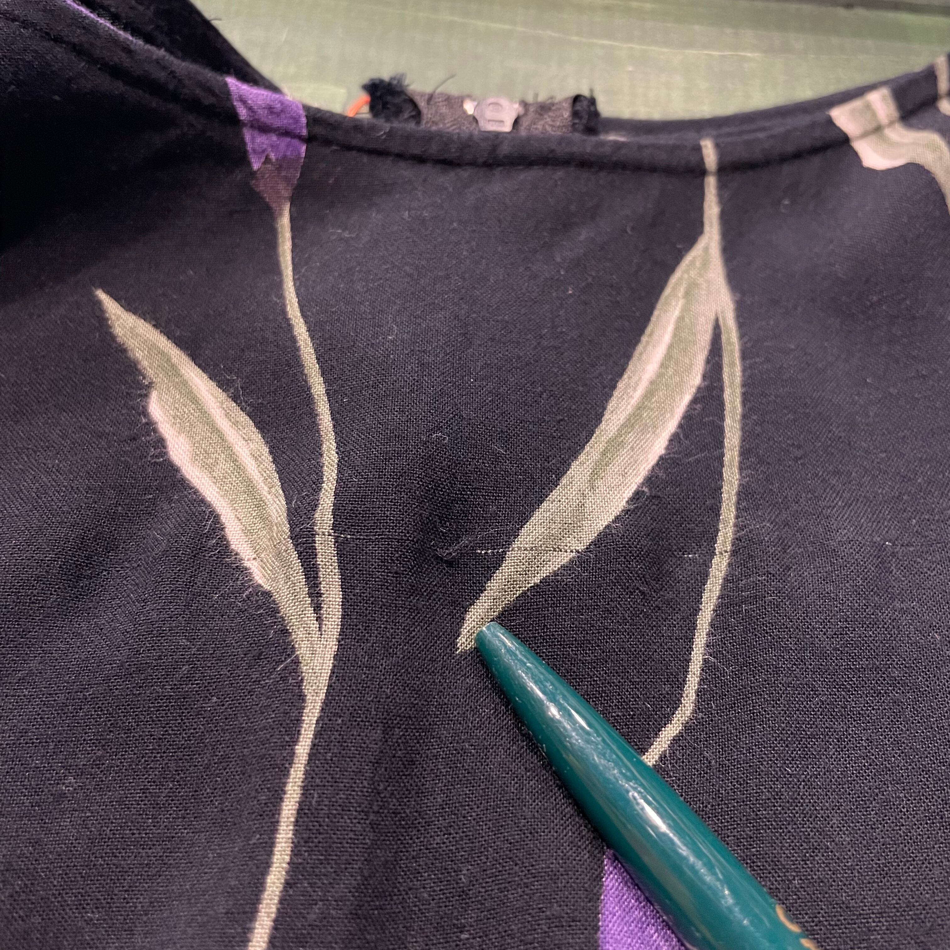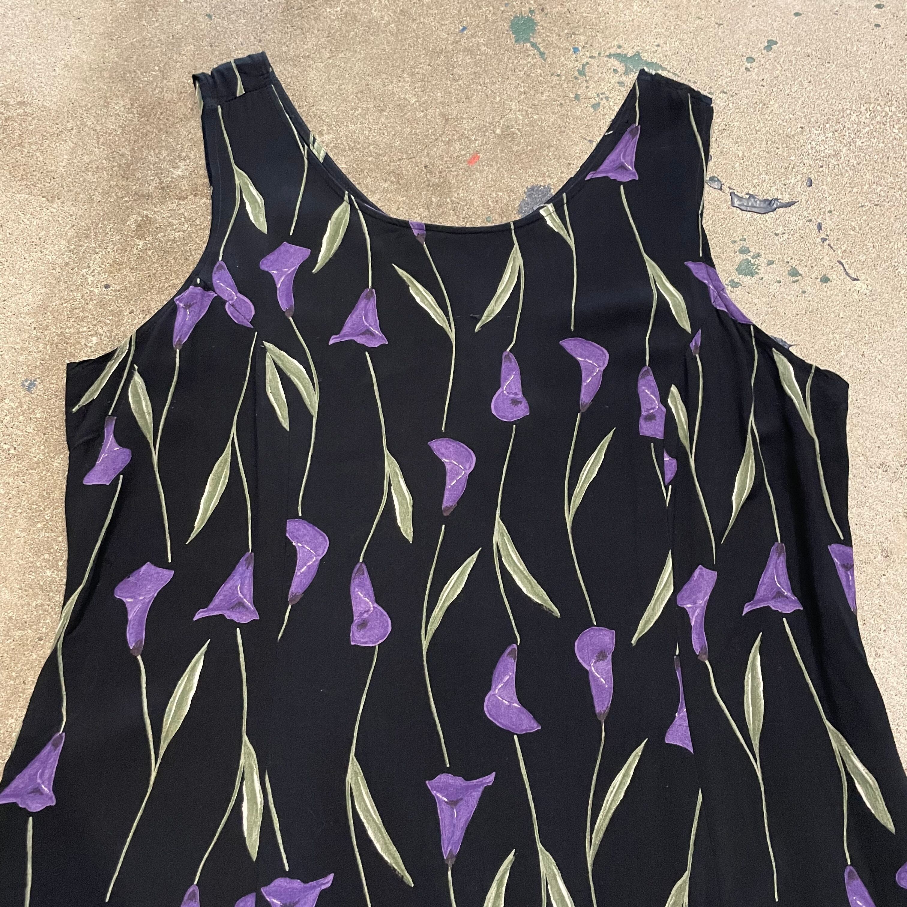 黒地にカラーらしき紫の花柄が素敵なワンピースてす。薄手のレーヨンのゆったりしたシルエットで、軽い!涼しい!楽ちん!な一着です。
