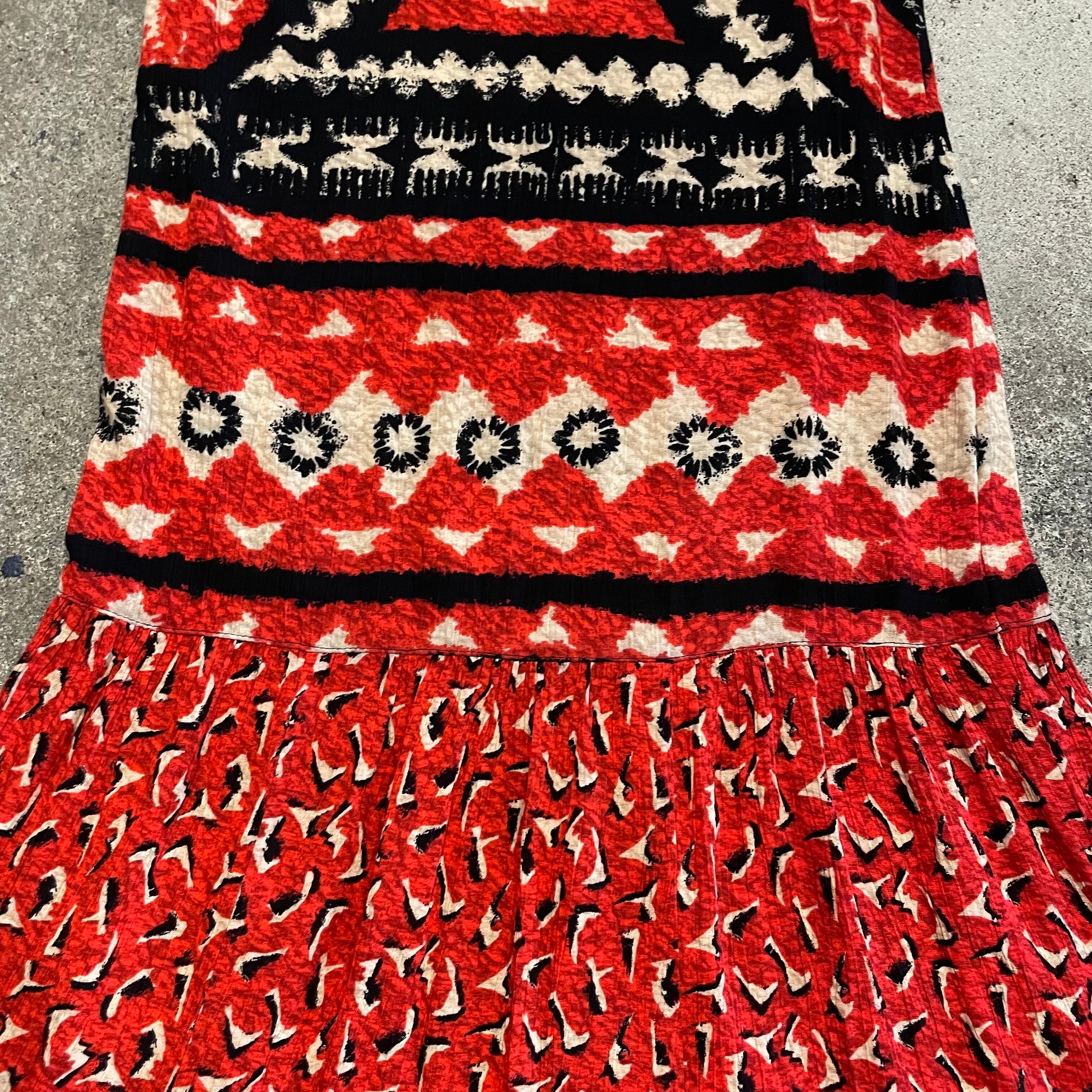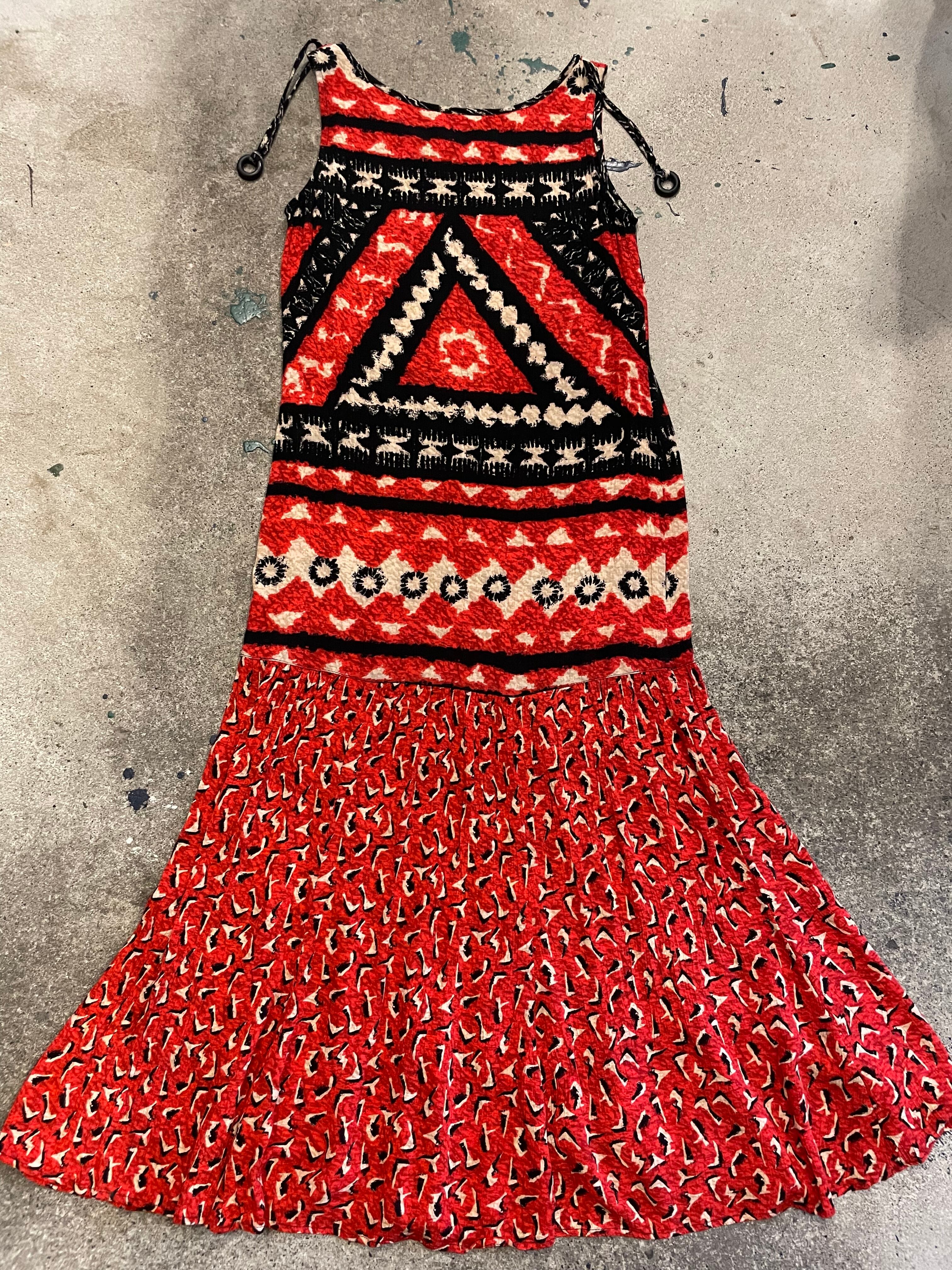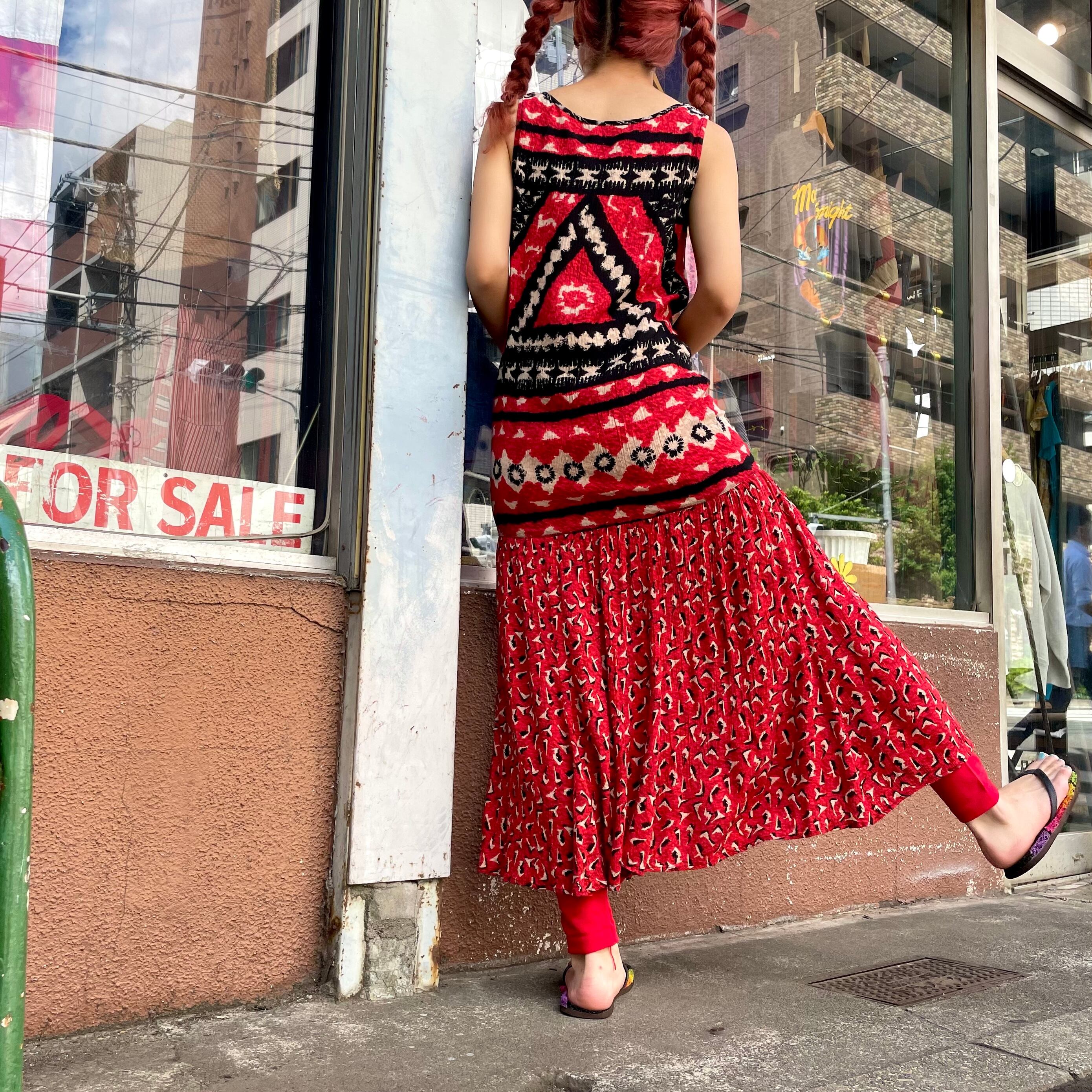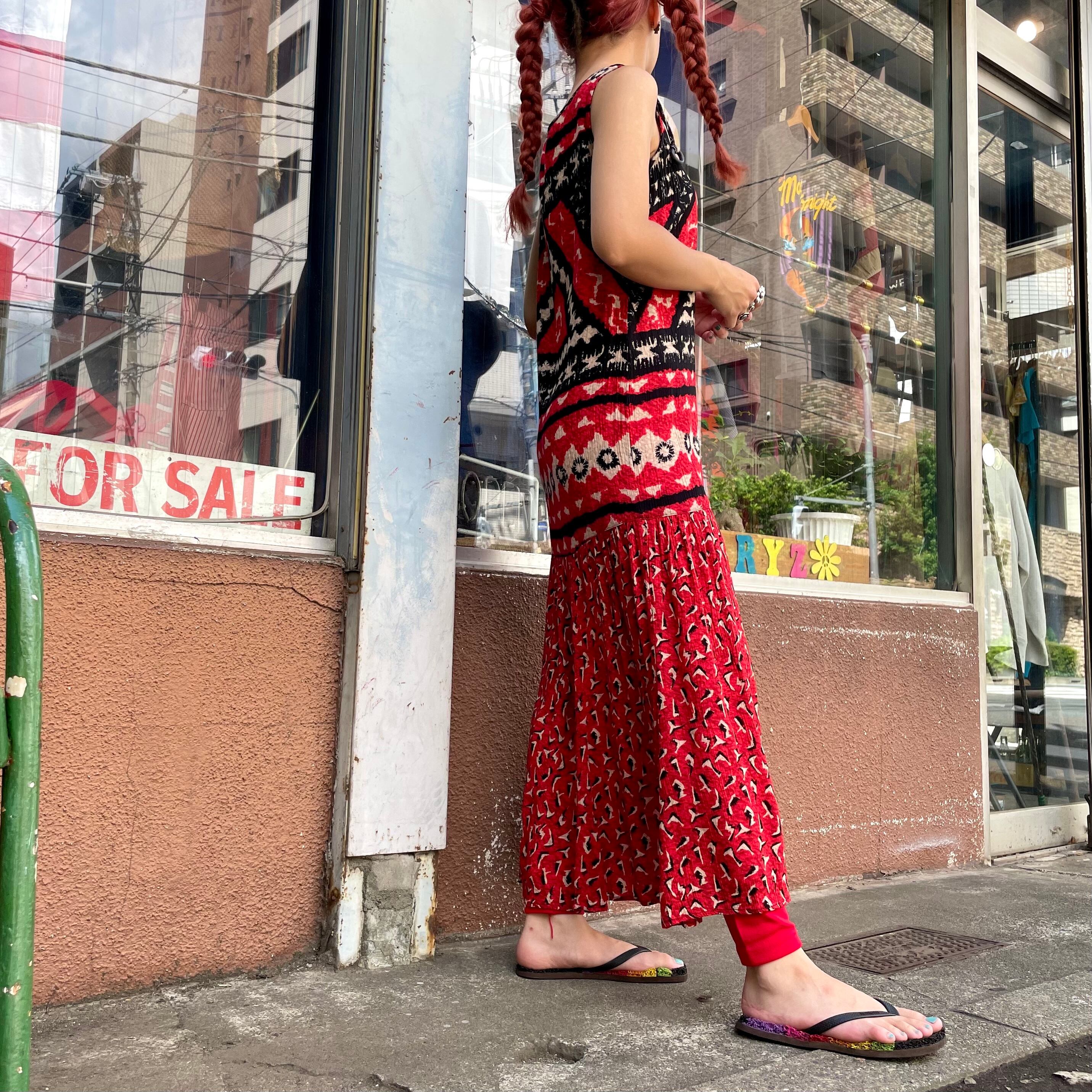 赤×黒のエスニックな柄がかわいいワンピースです。ローウエストでお尻の下までタイトめなシルエットになっており、そこからのフレアが大人っぽくて素敵です。肩から紐が出ており先に黒いビーズが付いていて不思議でおもしろいです。