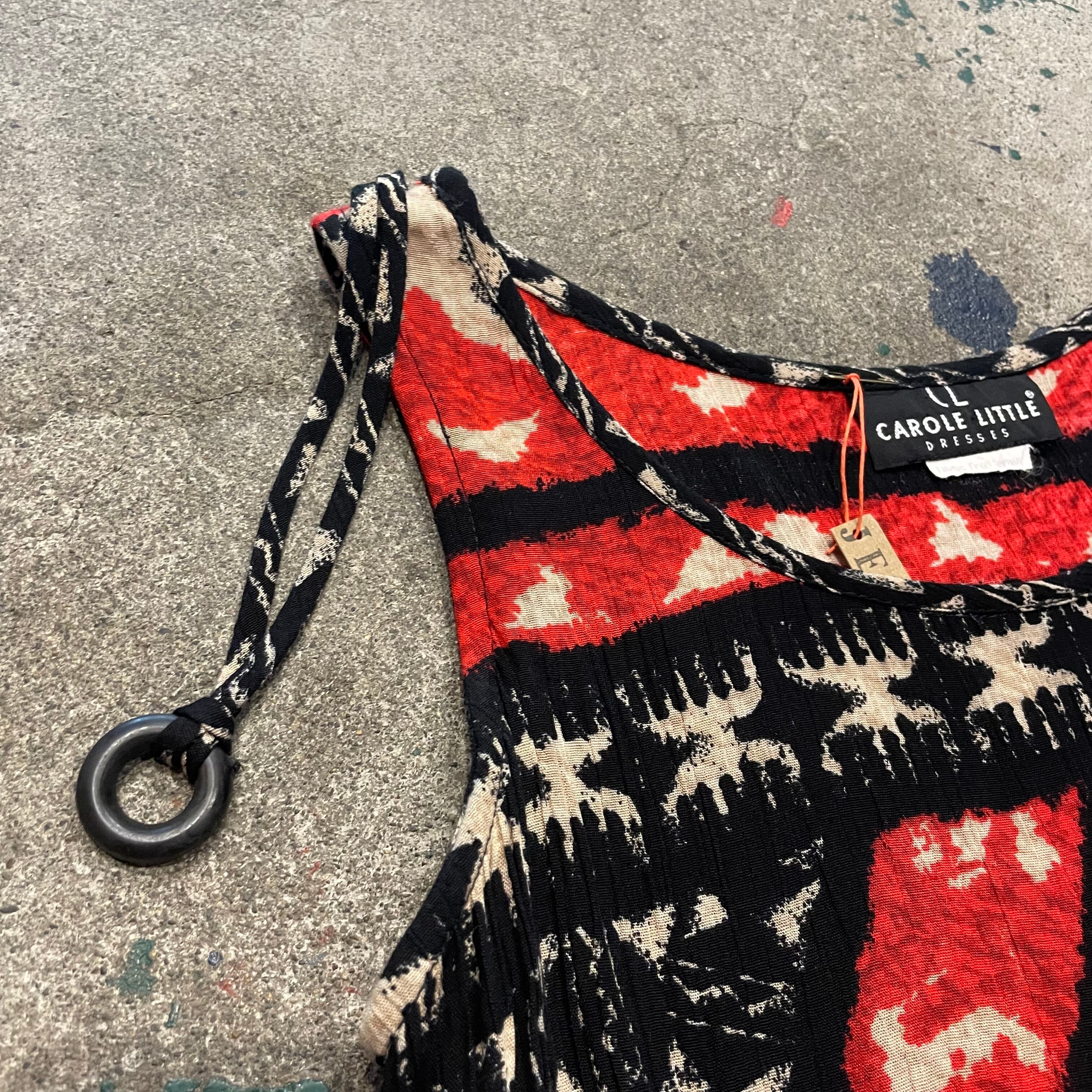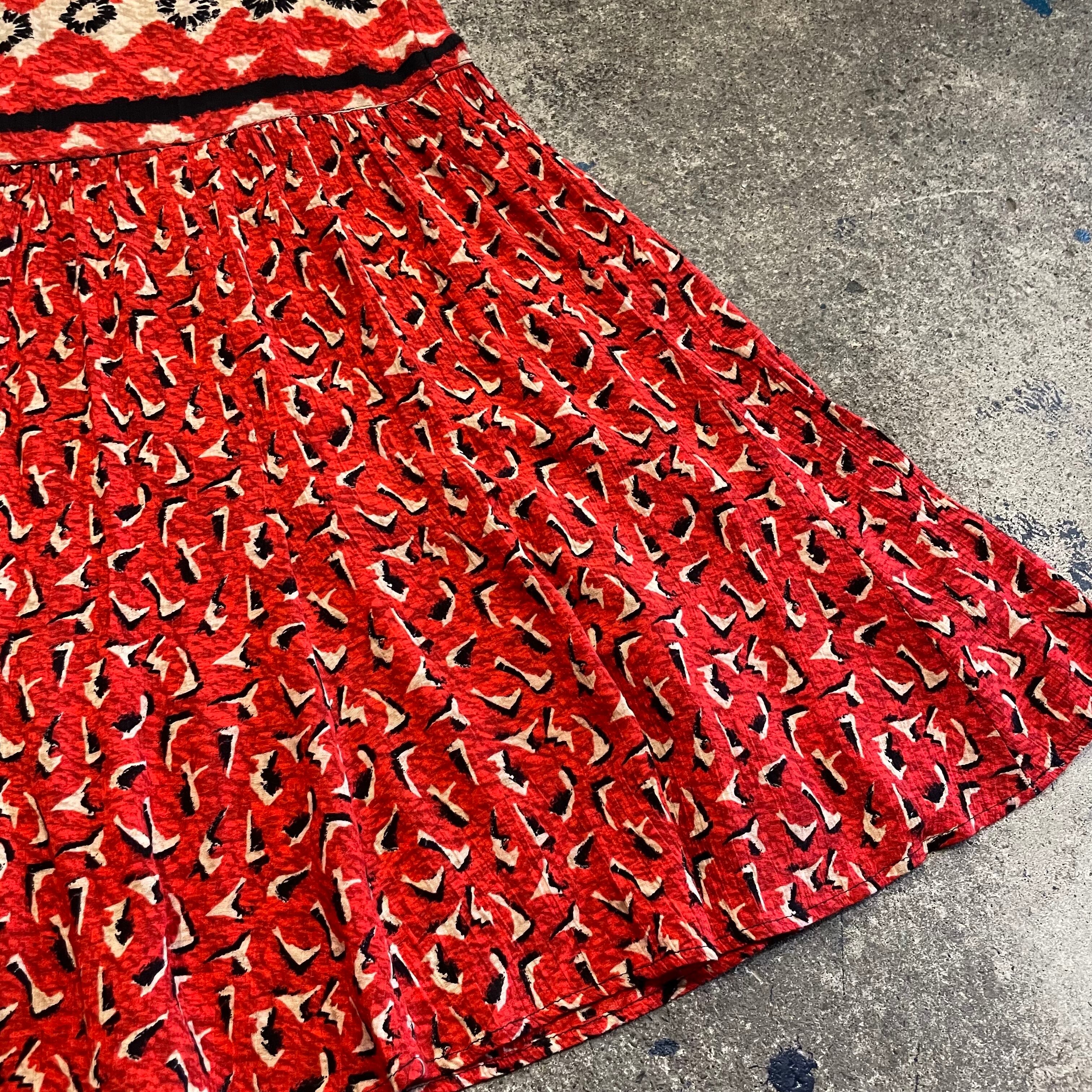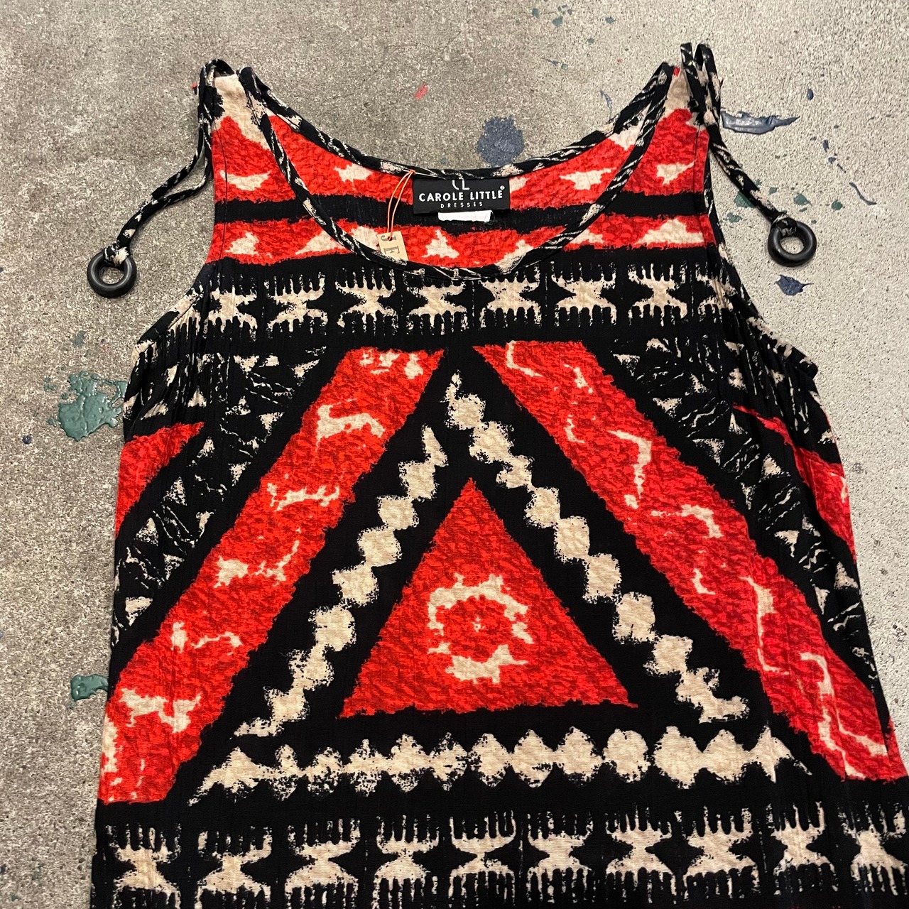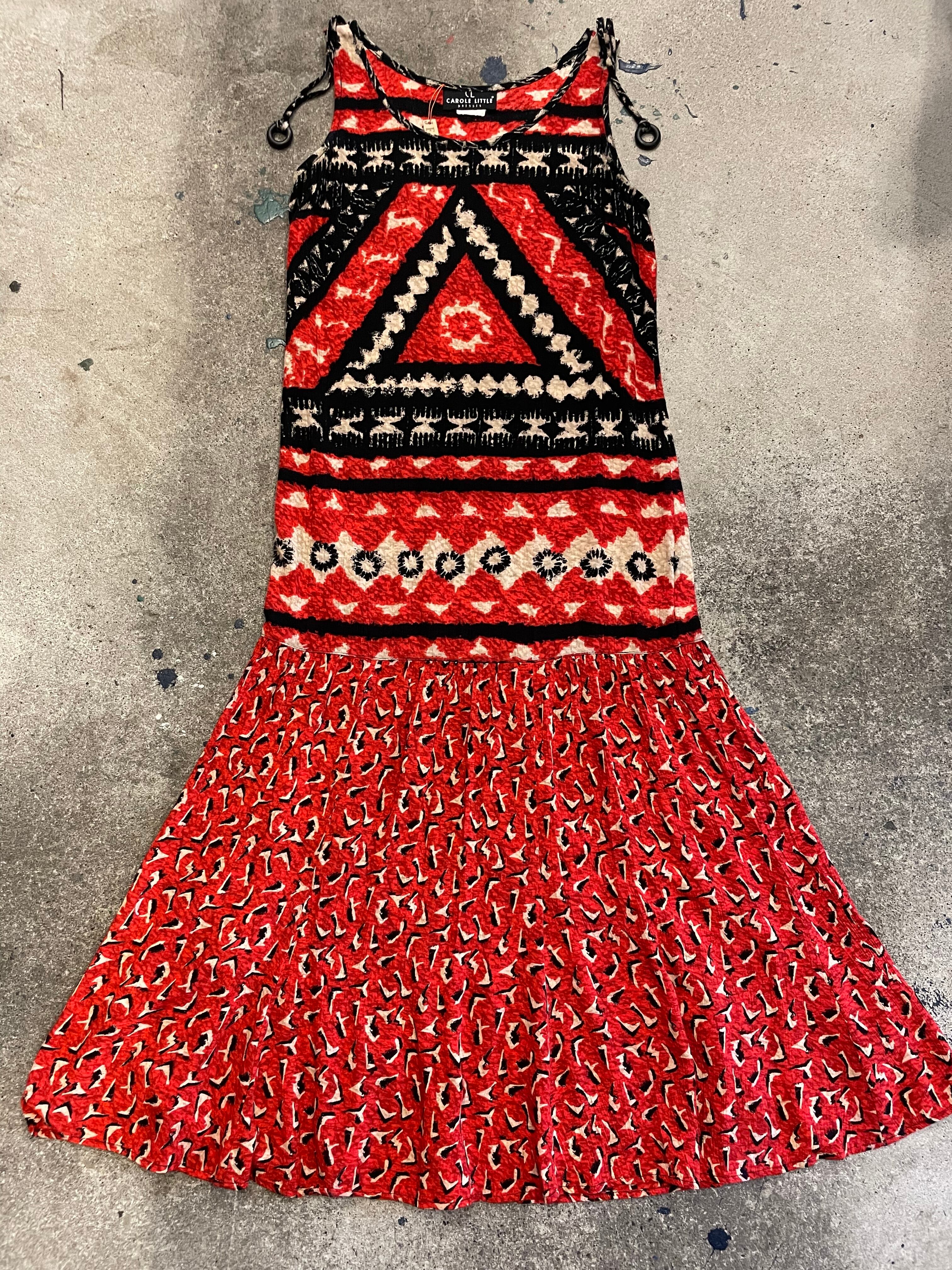 赤×黒のエスニックな柄がかわいいワンピースです。ローウエストでお尻の下までタイトめなシルエットになっており、そこからのフレアが大人っぽくて素敵です。肩から紐が出ており先に黒いビーズが付いていて不思議でおもしろいです。