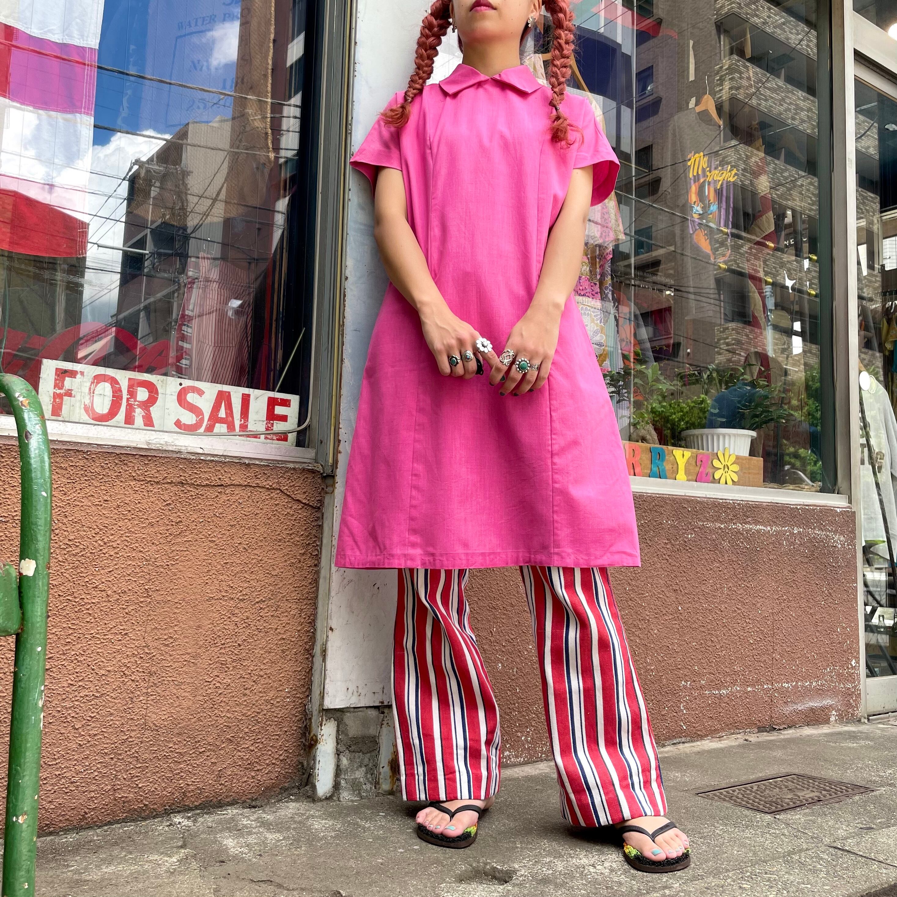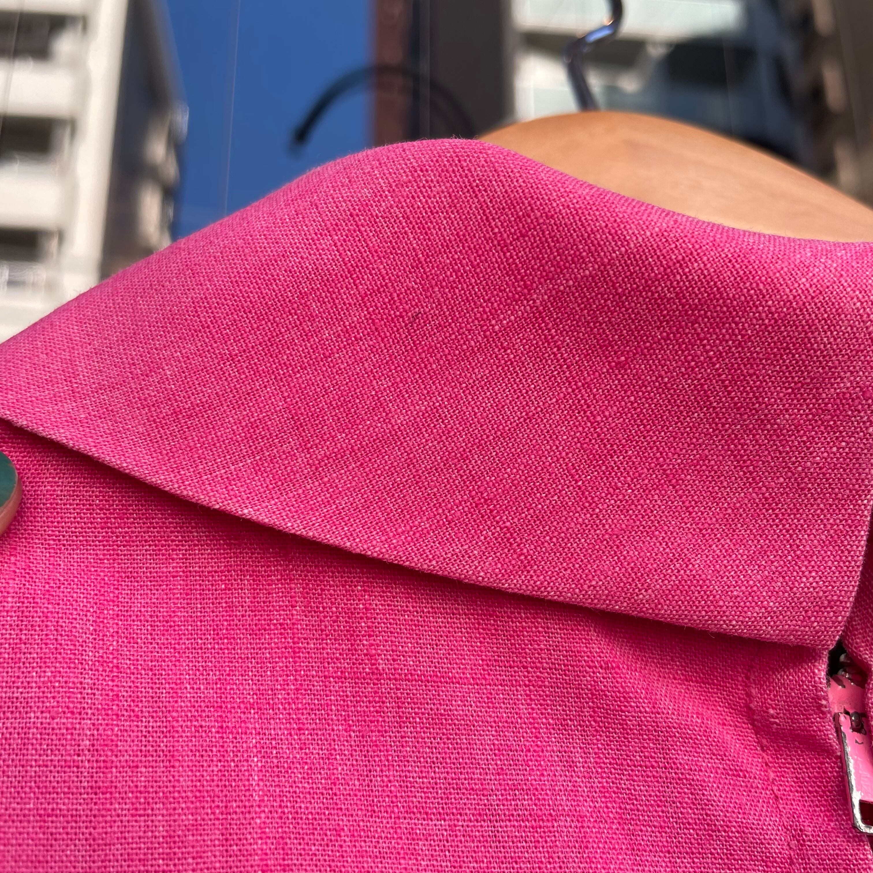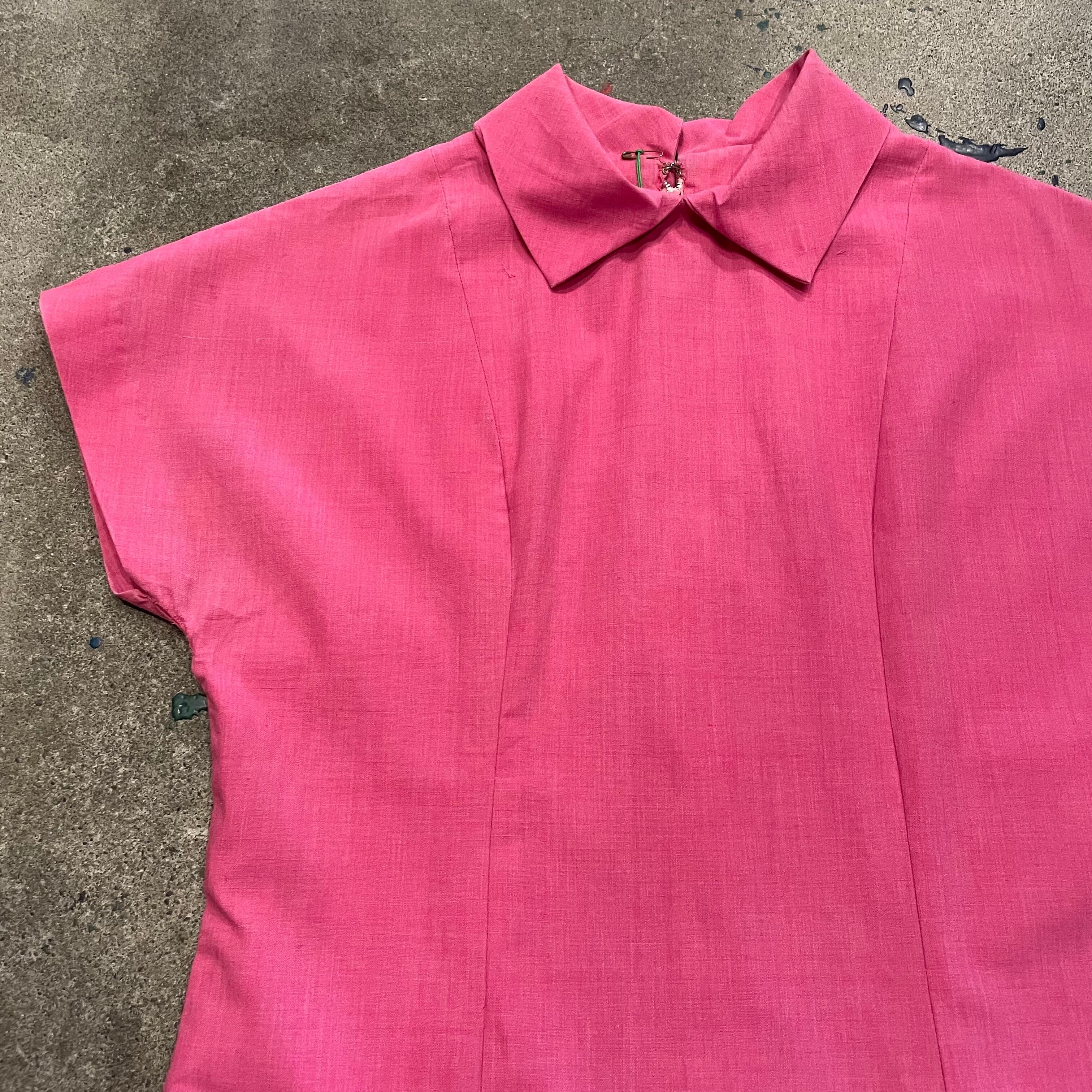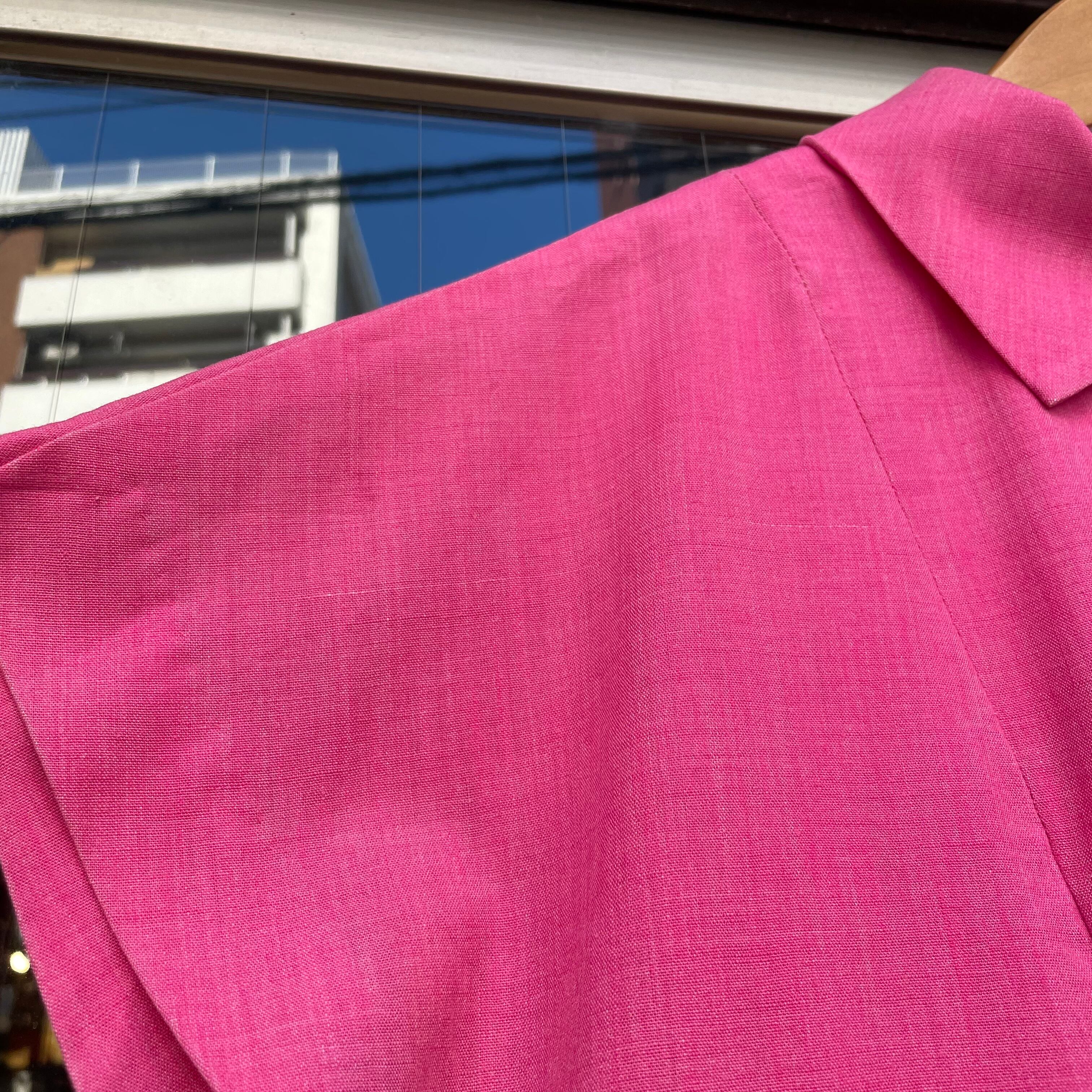 襟の形や全体のシルエットがかわいいワンピースです。袖がドルマンスリーブっぽくなっていて着た時にかっちりしすぎず良い感じです。無地でシンプルなデザインですが、ハッピーなピンク色が弾けていて印象的な一着です。