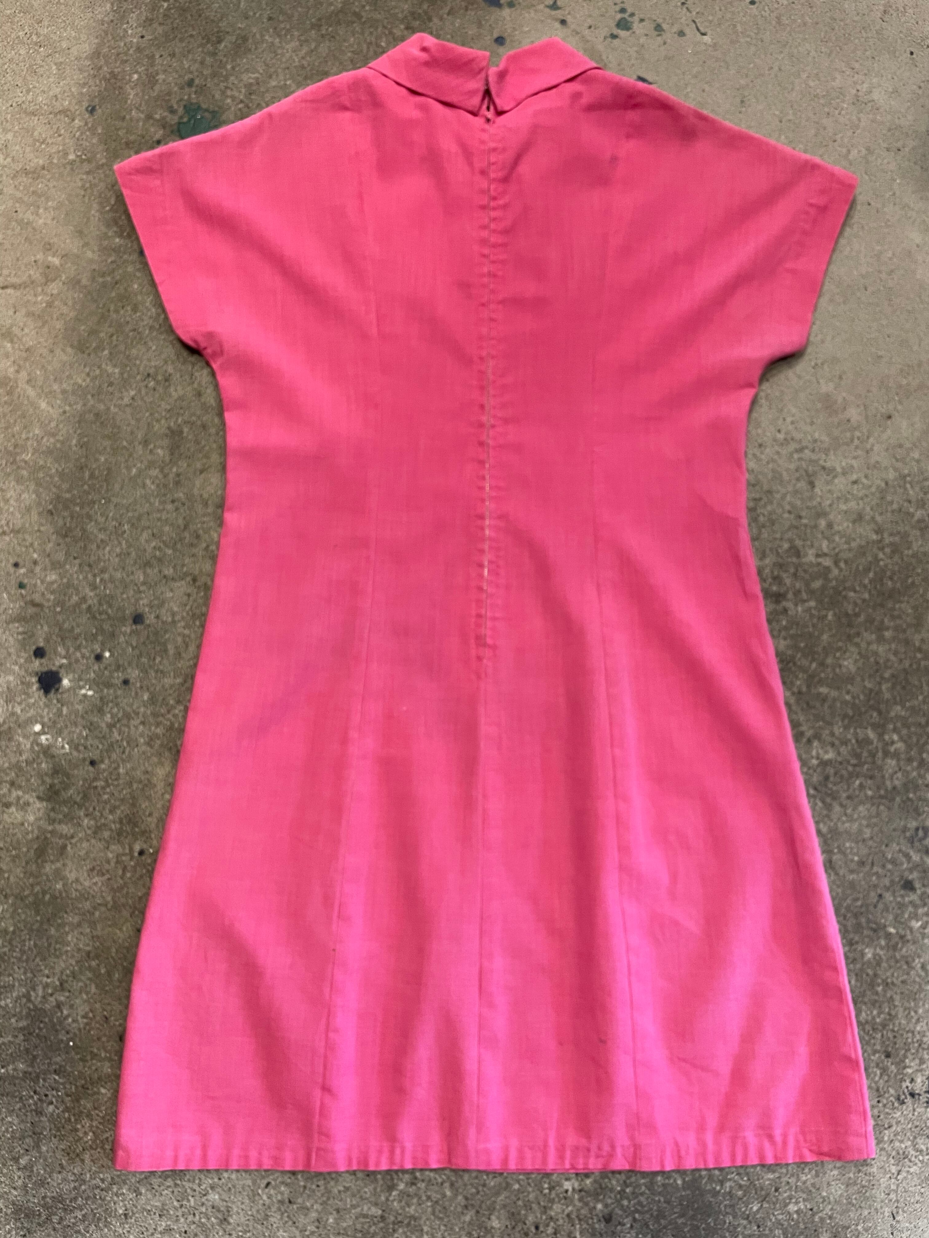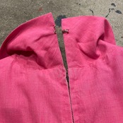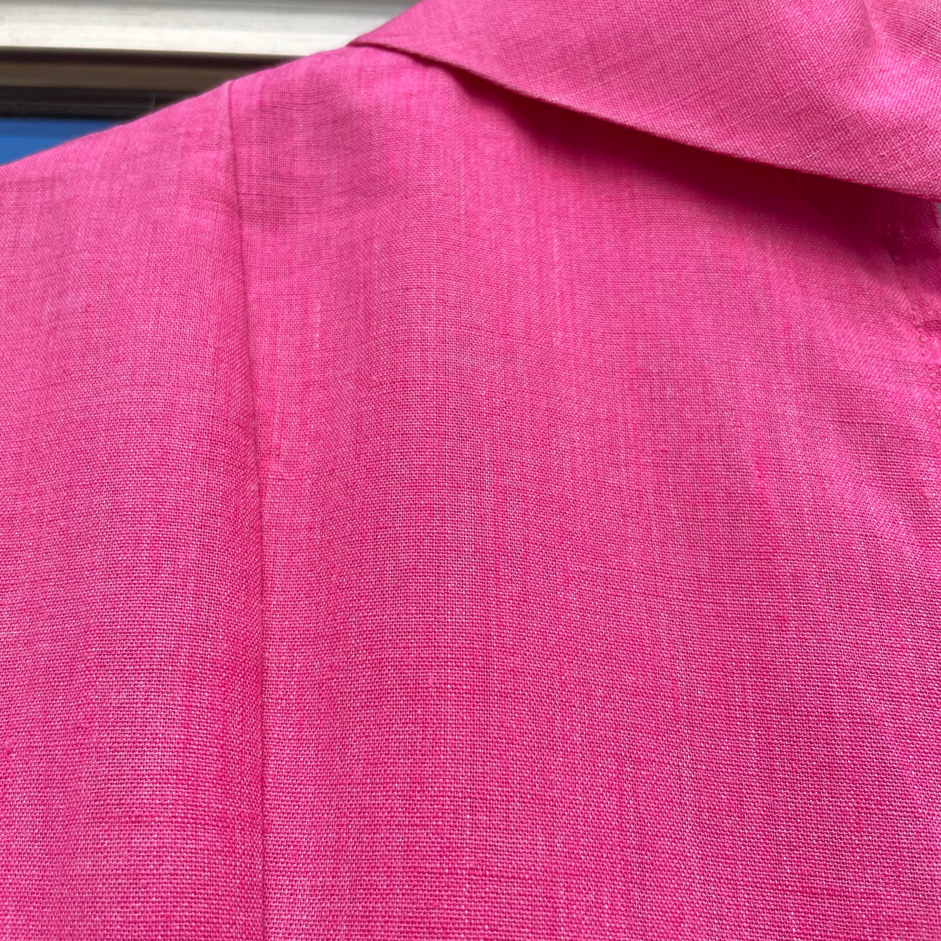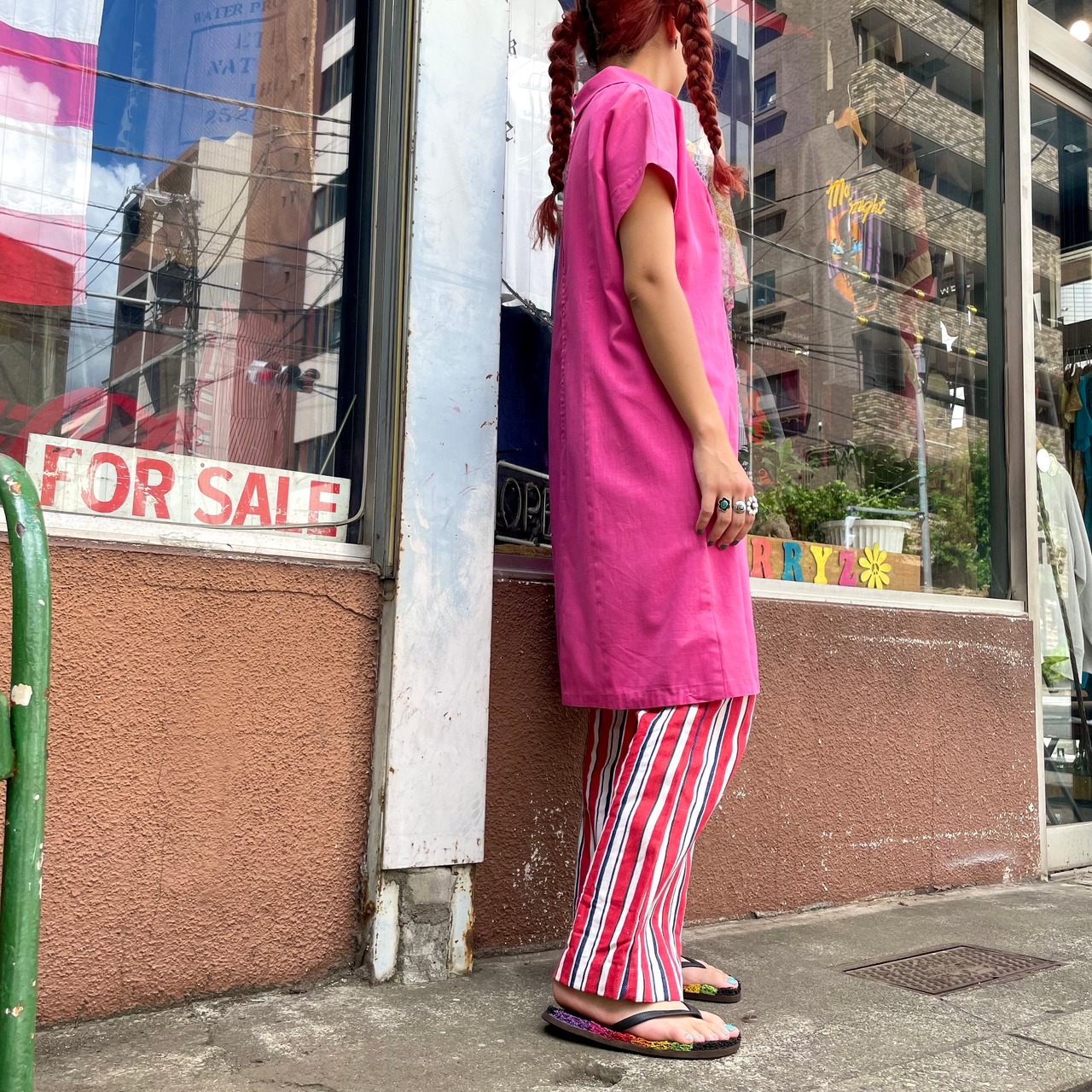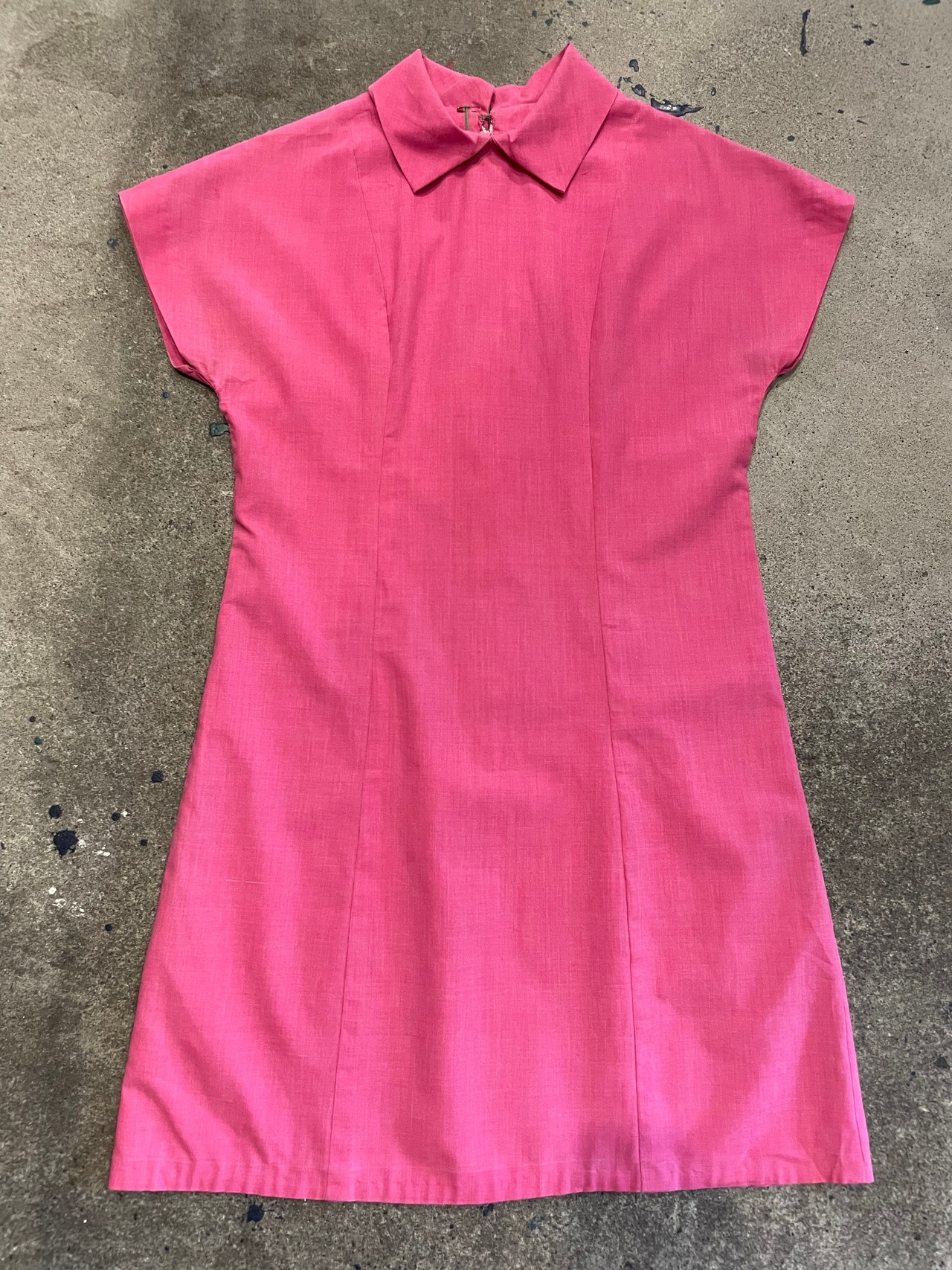 襟の形や全体のシルエットがかわいいワンピースです。袖がドルマンスリーブっぽくなっていて着た時にかっちりしすぎず良い感じです。無地でシンプルなデザインですが、ハッピーなピンク色が弾けていて印象的な一着です。