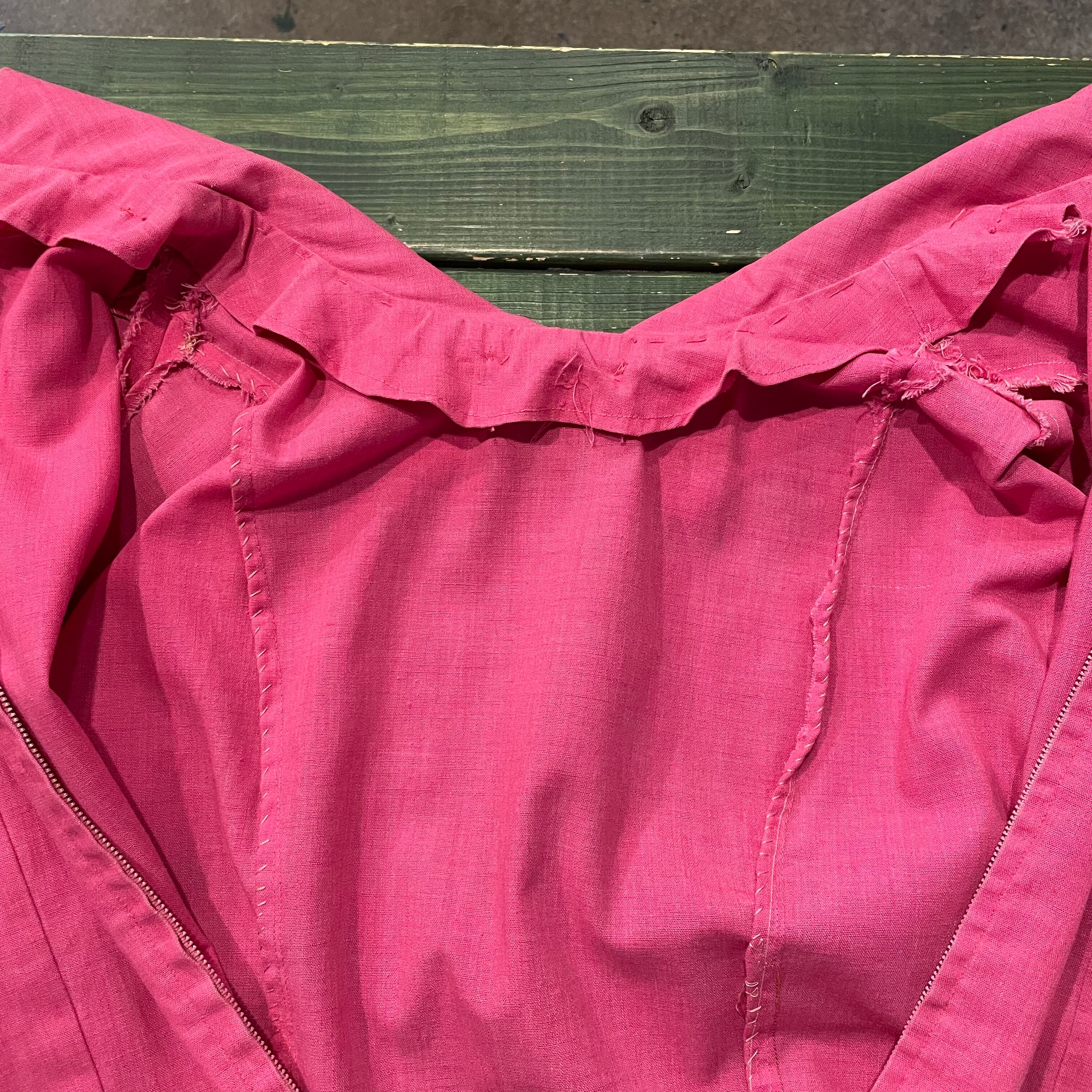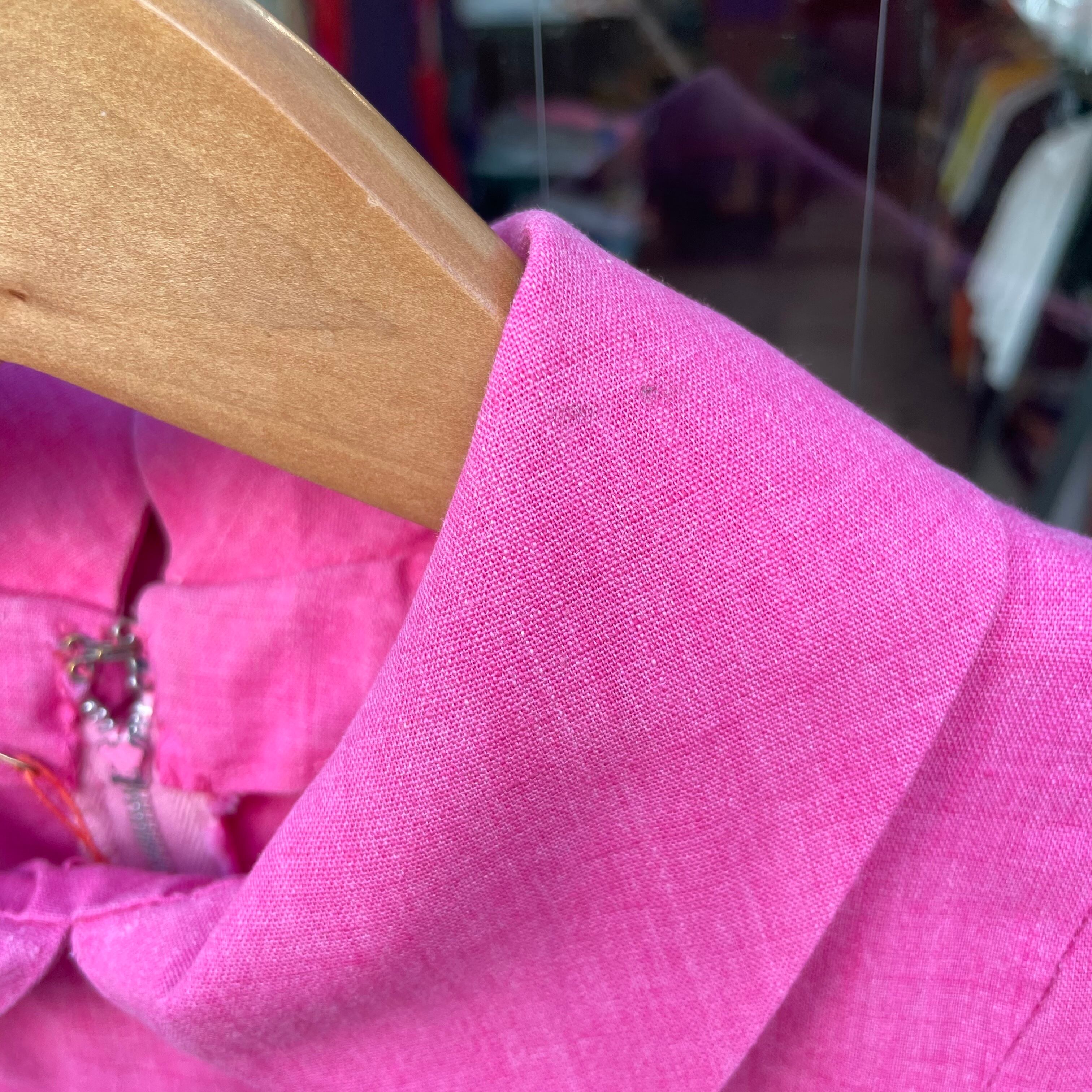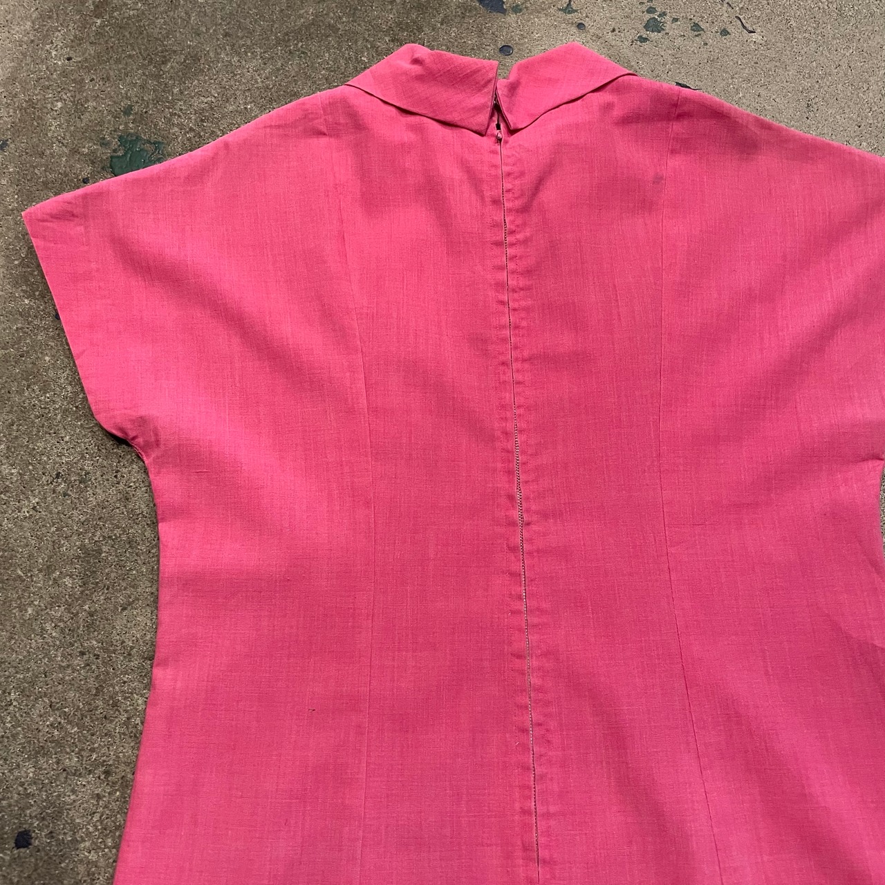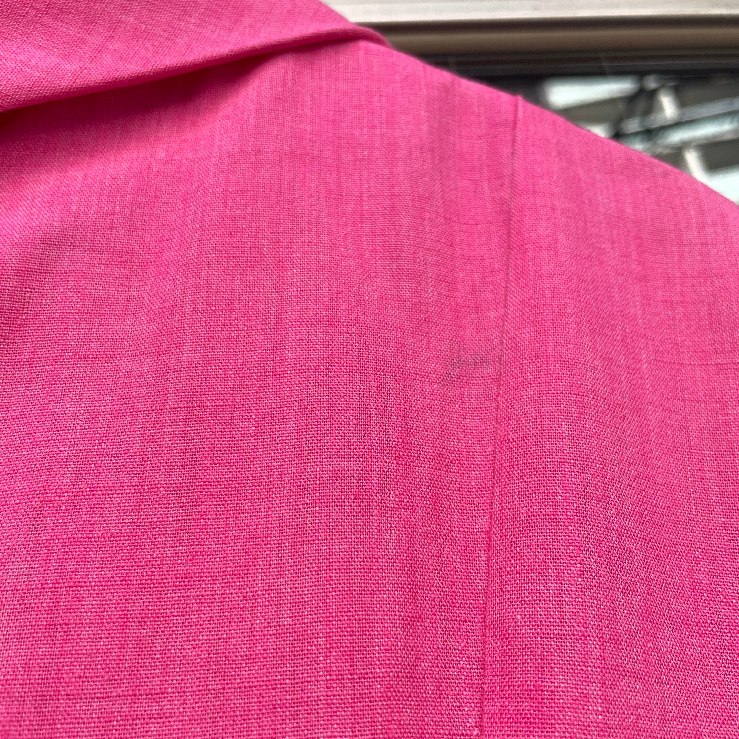 襟の形や全体のシルエットがかわいいワンピースです。袖がドルマンスリーブっぽくなっていて着た時にかっちりしすぎず良い感じです。無地でシンプルなデザインですが、ハッピーなピンク色が弾けていて印象的な一着です。