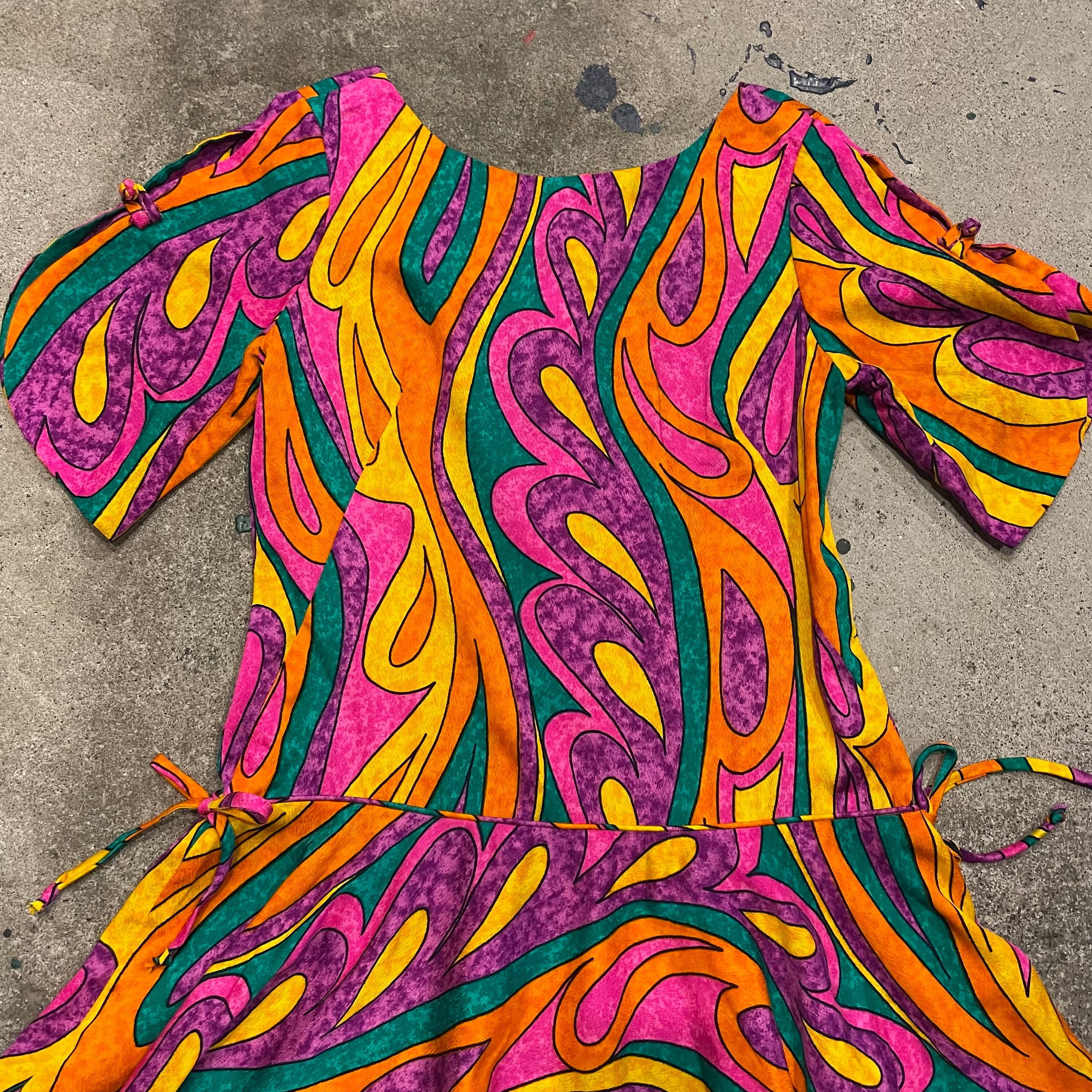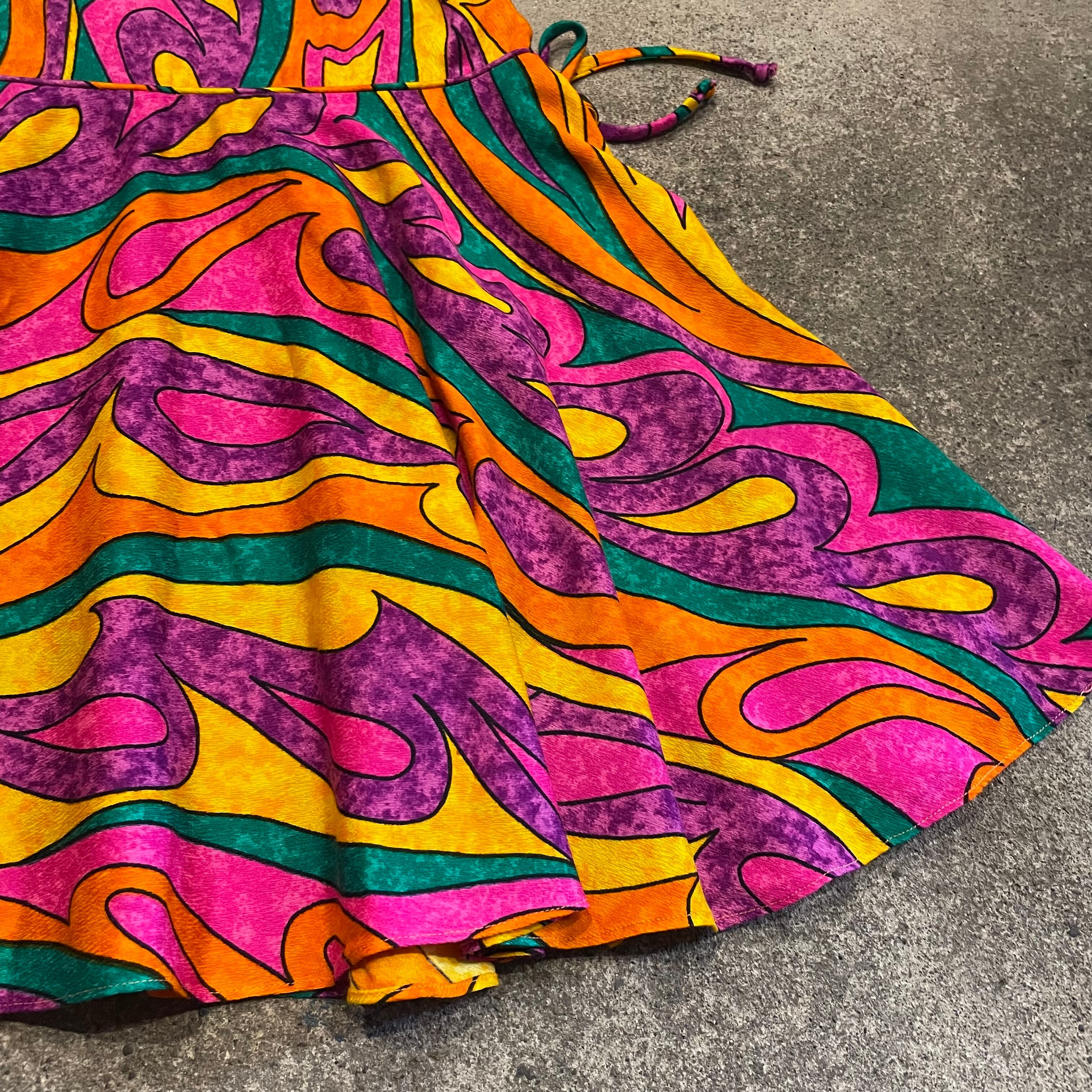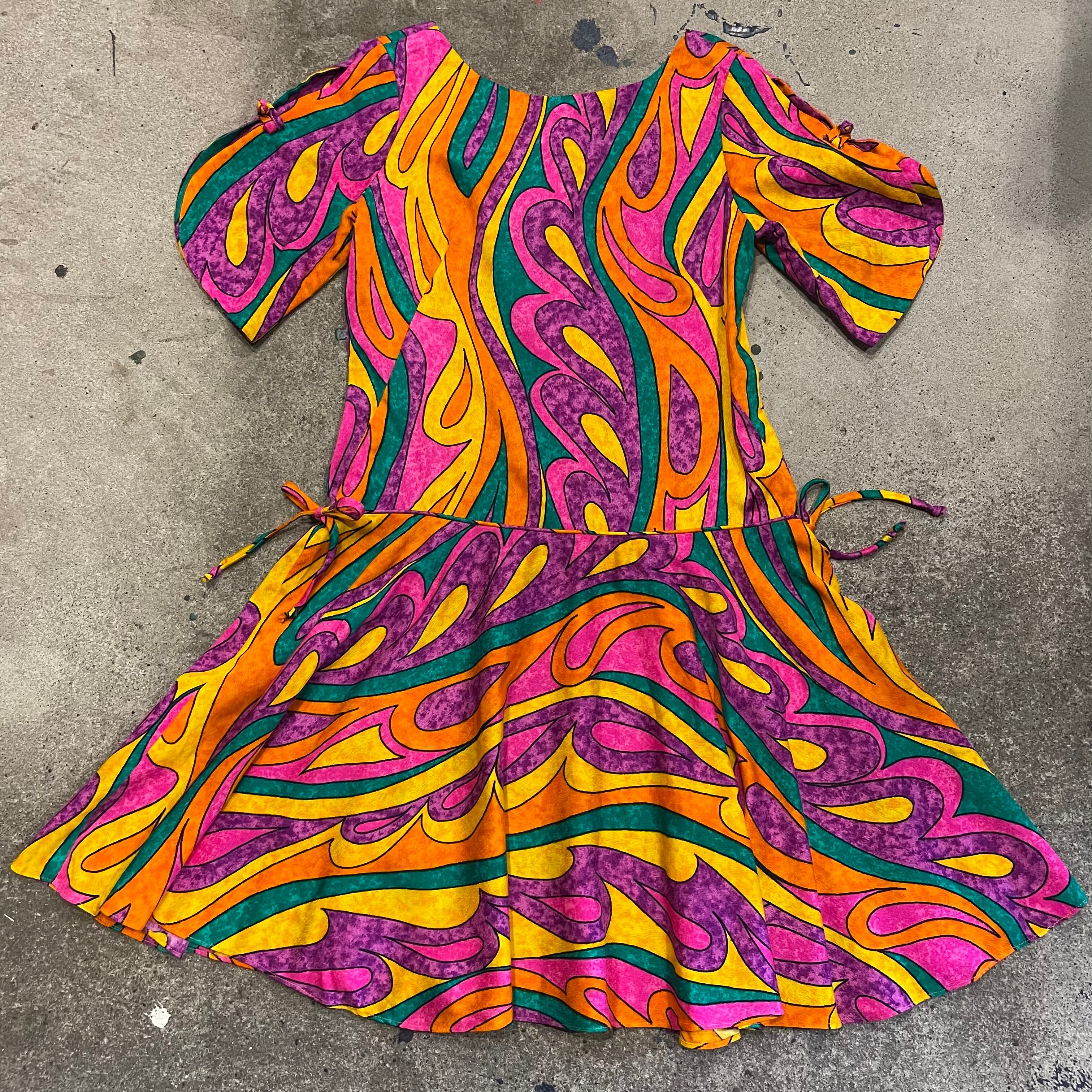 大胆でサイケデリックな柄がとてもかわいいです。袖に切り込みが入っていたり、ローウエストのサイドにリボンがついていたり、ディテールも素敵ですし、背中が広めに開いていてスカート部分はサーキュラーでひらひらとシルエットもかわいいとっておきの一着です。