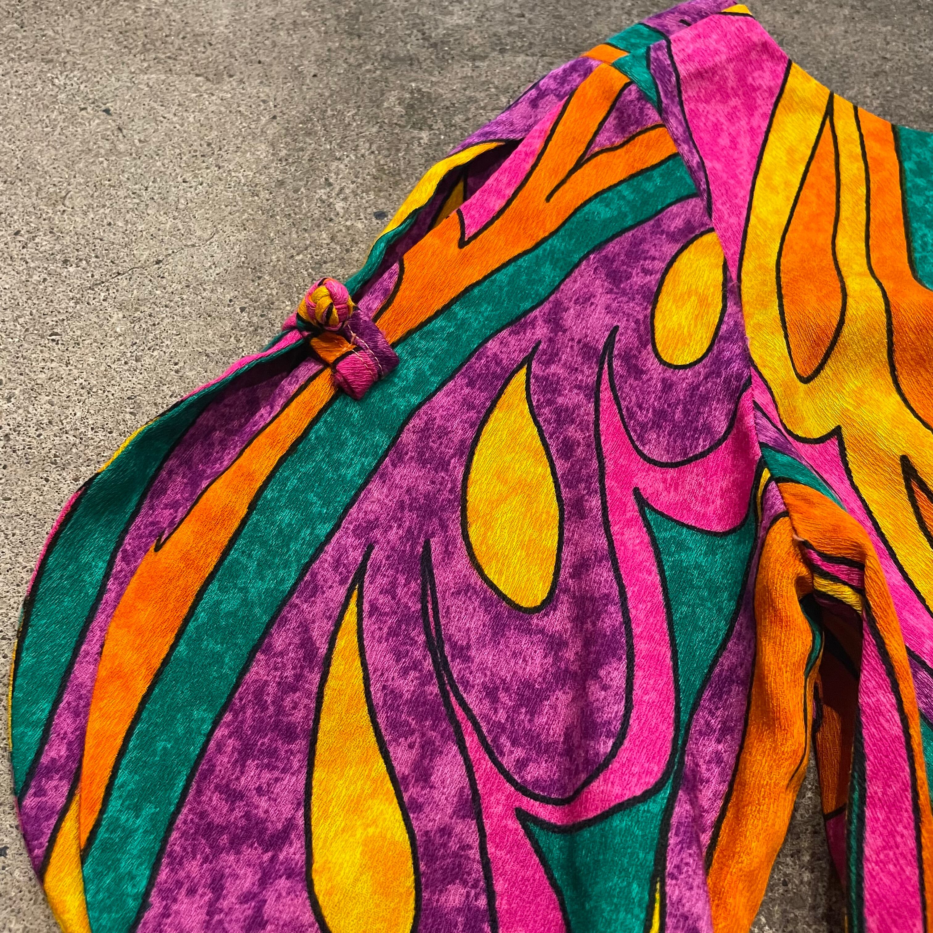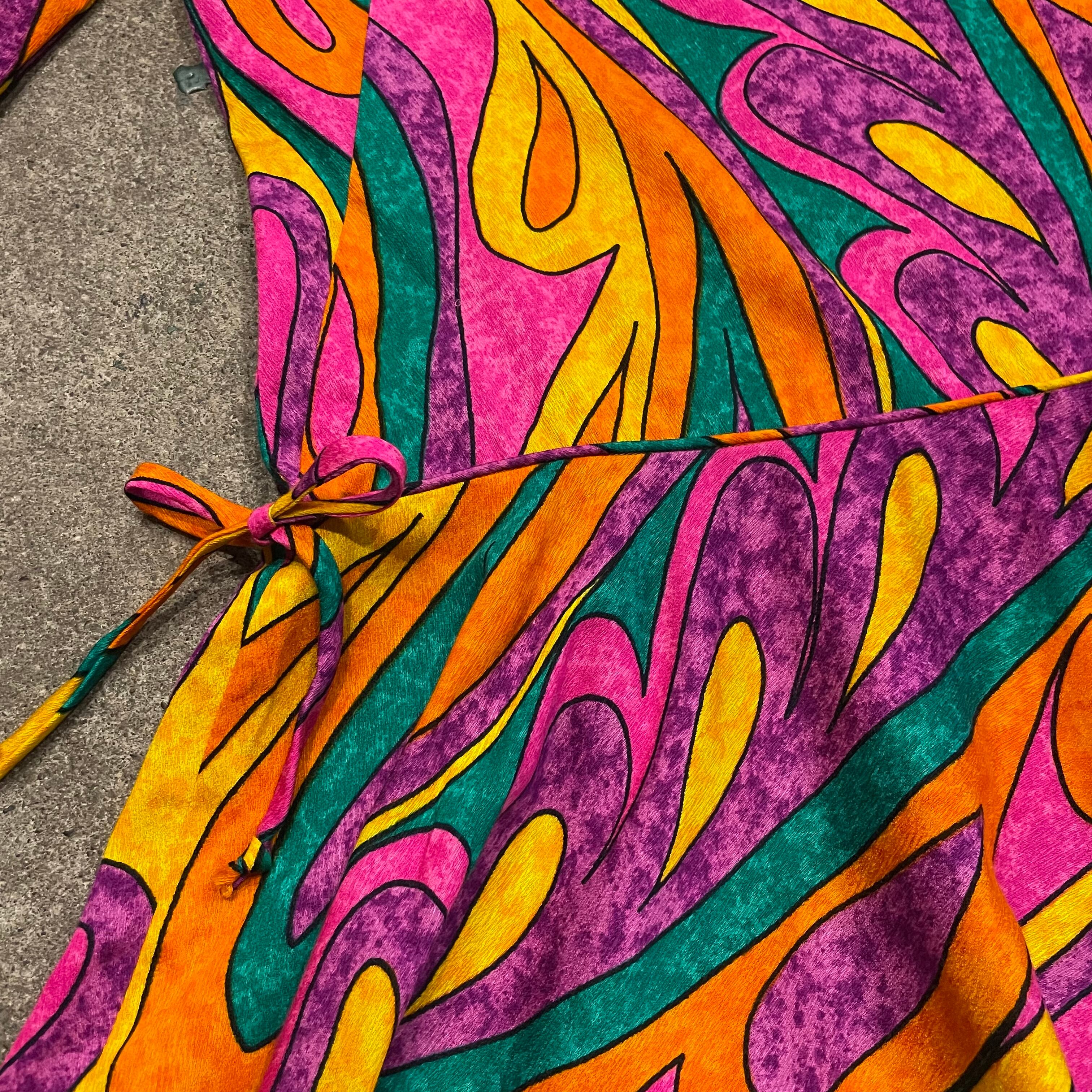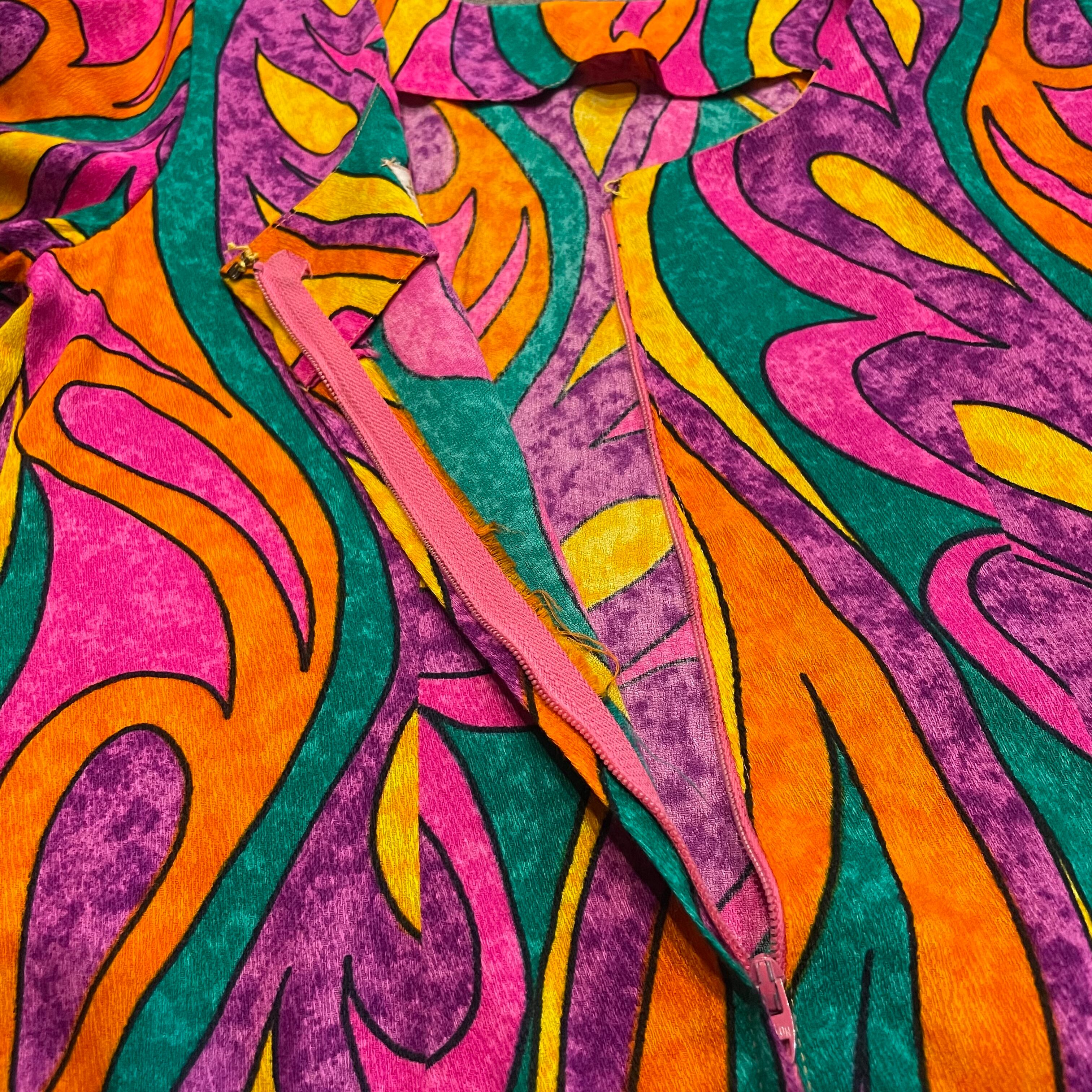 大胆でサイケデリックな柄がとてもかわいいです。袖に切り込みが入っていたり、ローウエストのサイドにリボンがついていたり、ディテールも素敵ですし、背中が広めに開いていてスカート部分はサーキュラーでひらひらとシルエットもかわいいとっておきの一着です。