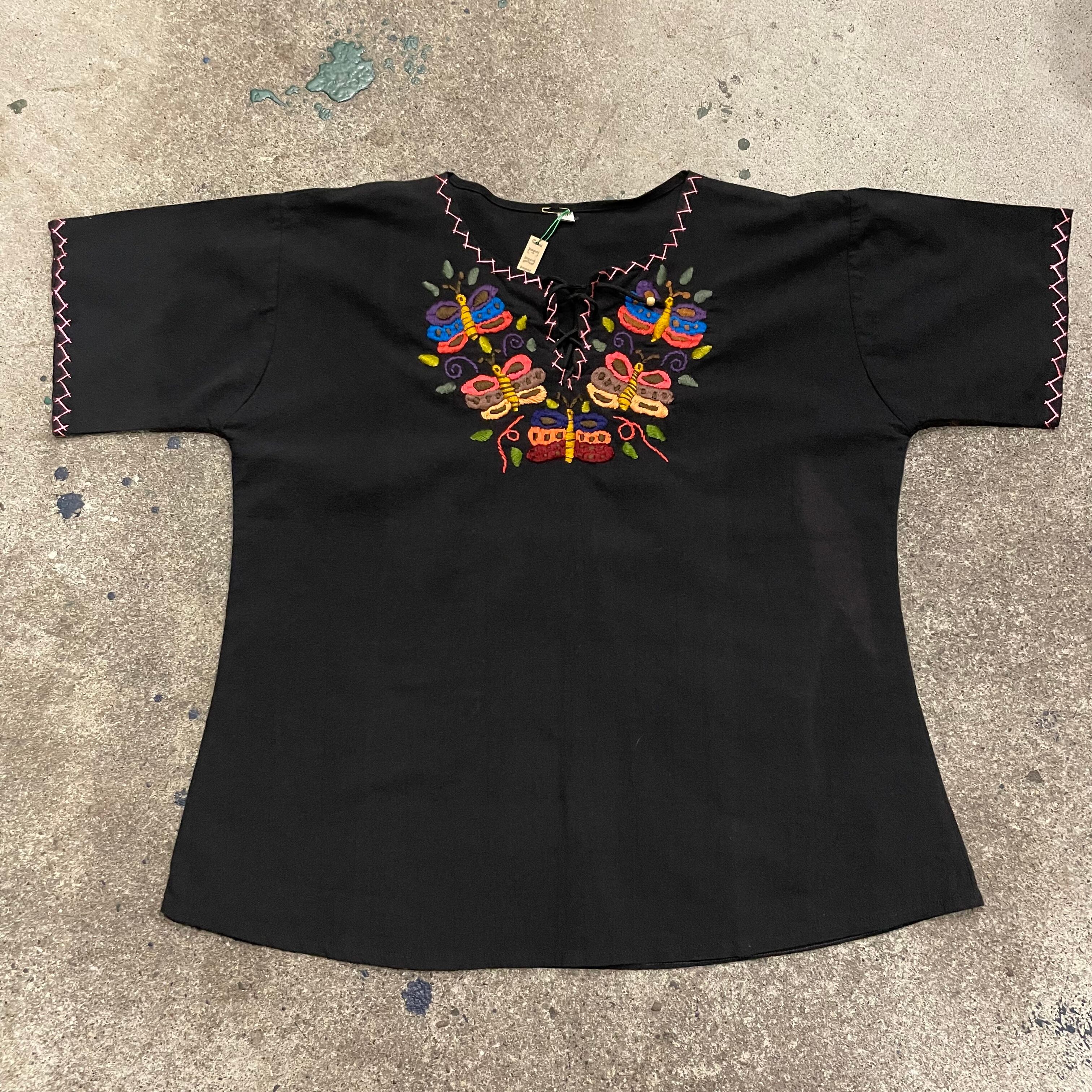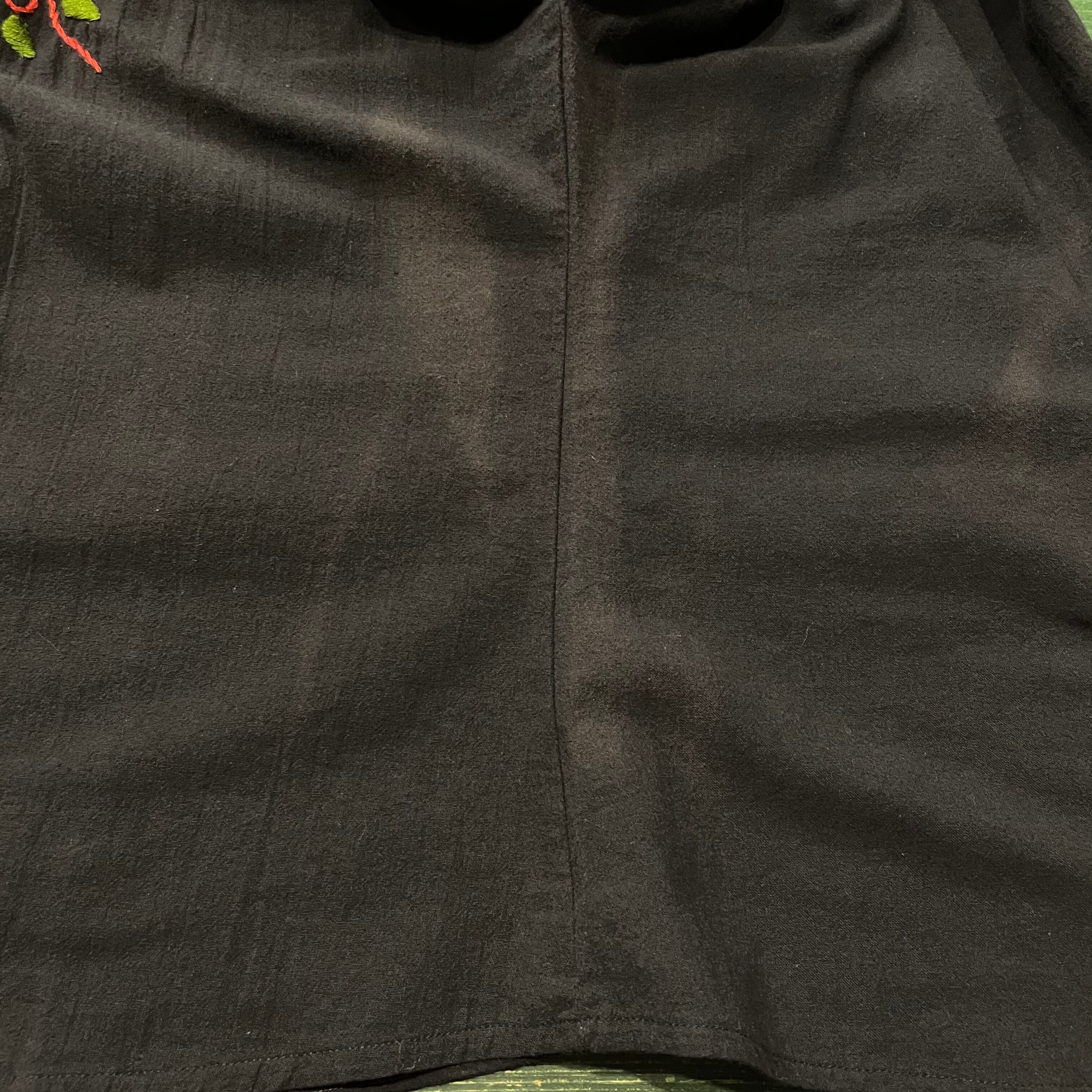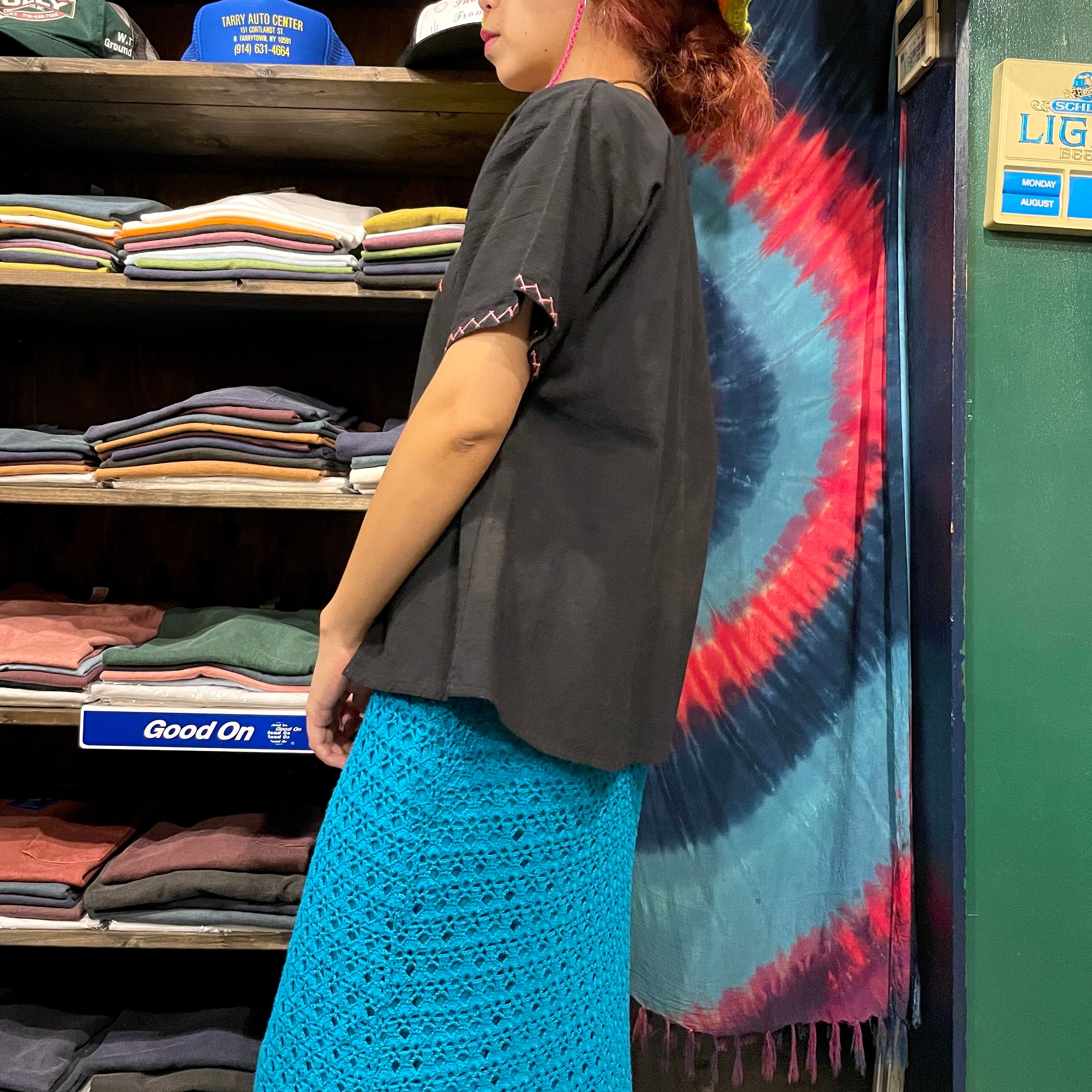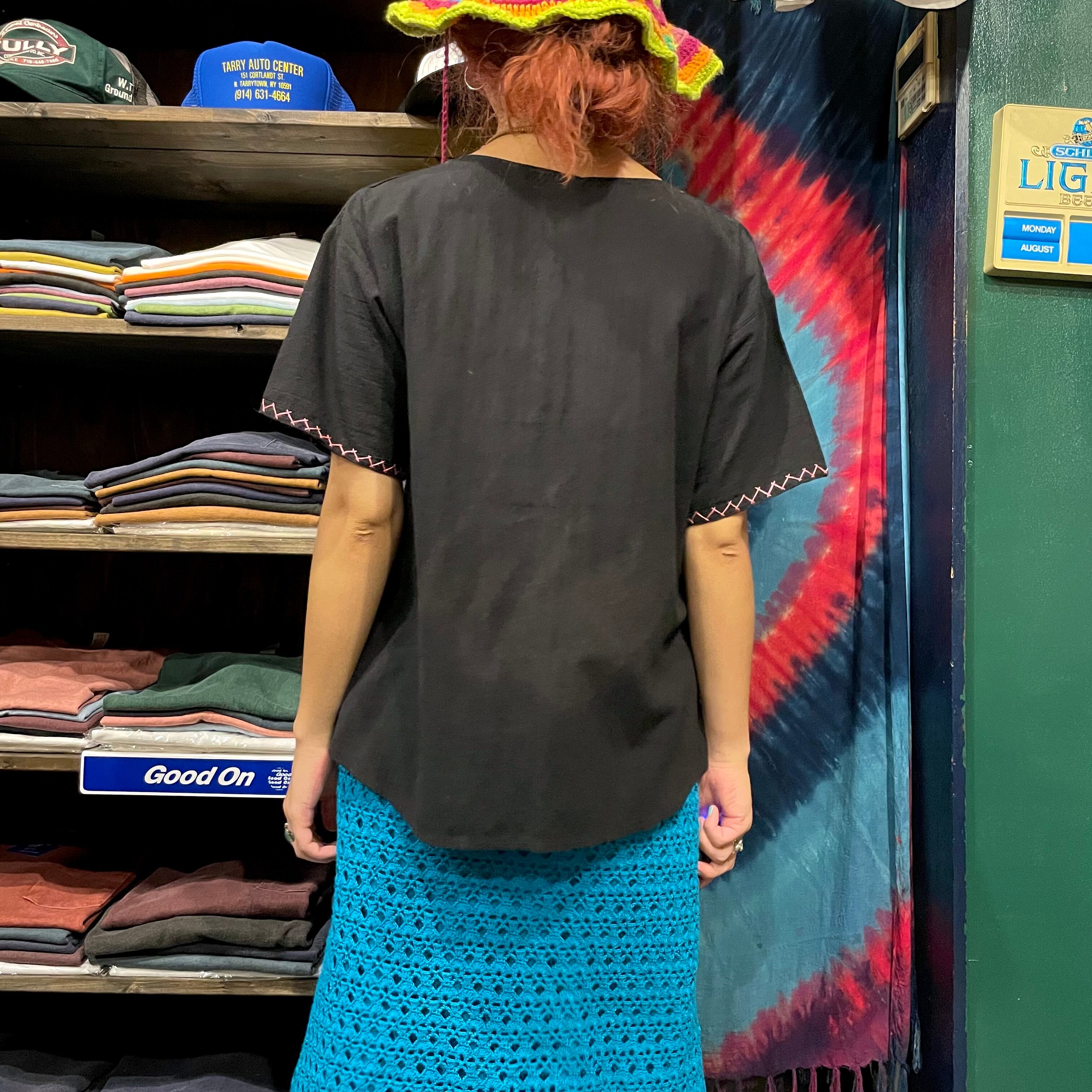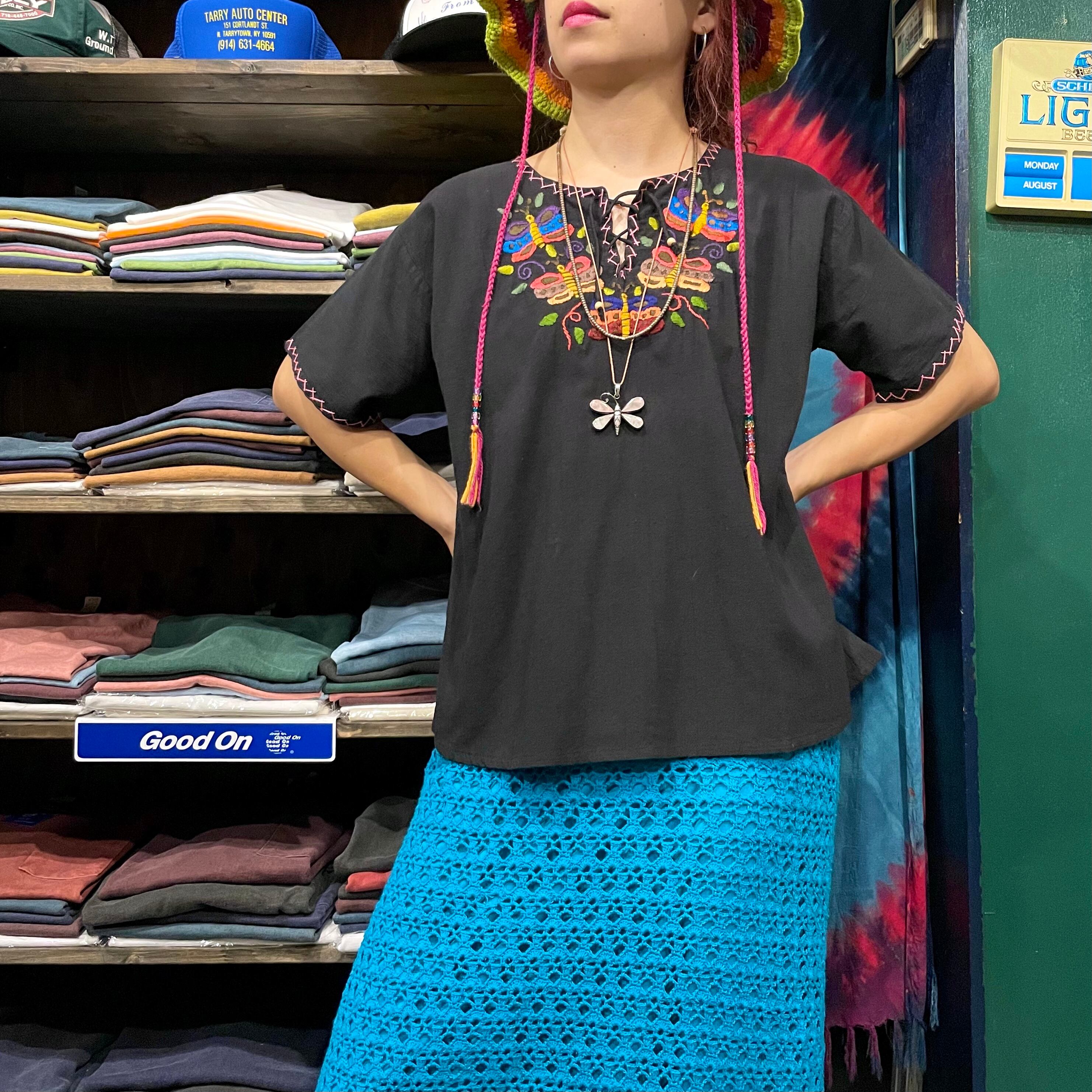 首元がレースアップになっていたり、襟ぐりや袖口にギザギザの刺繍が施されていたりボヘミアンな雰囲気が良い感じです。
