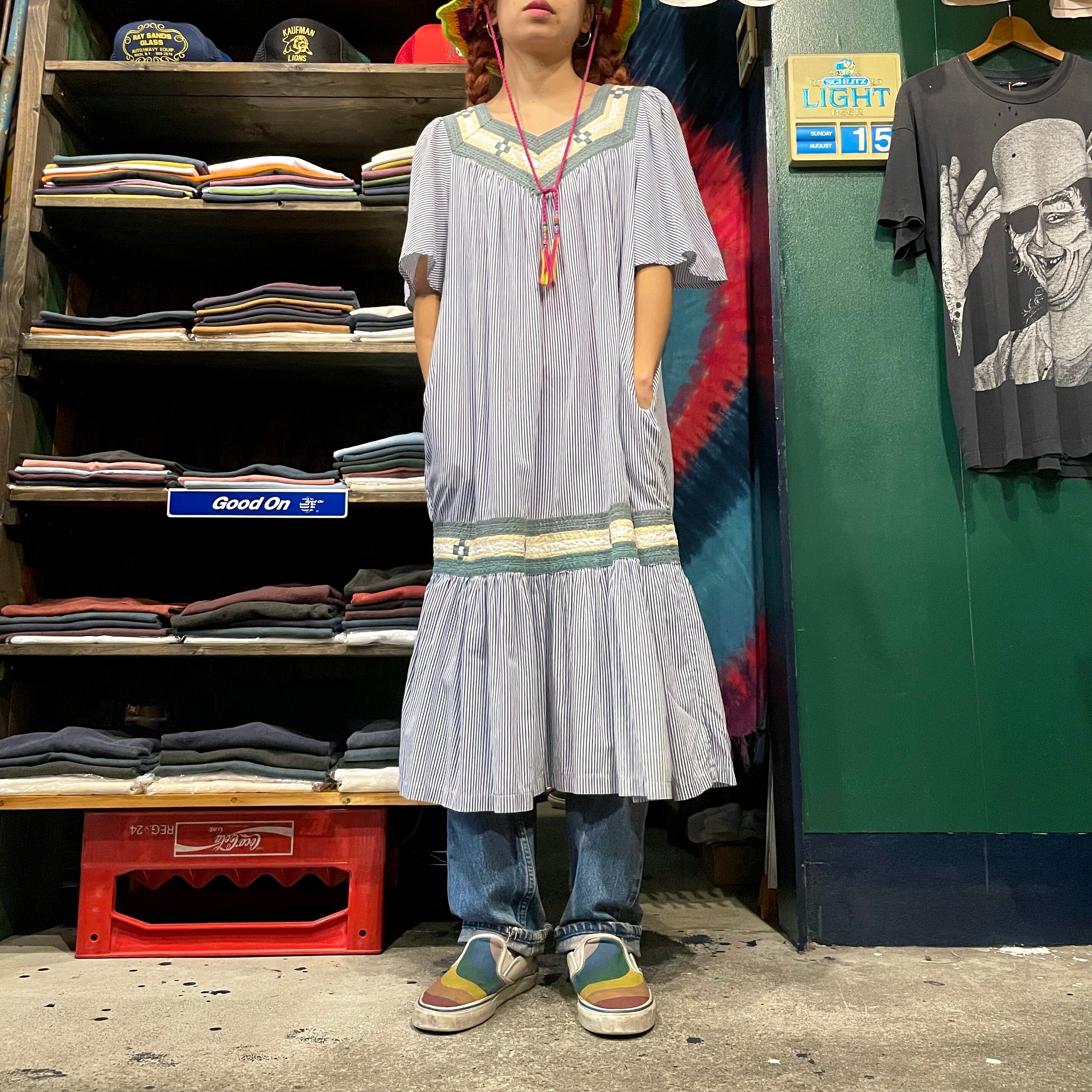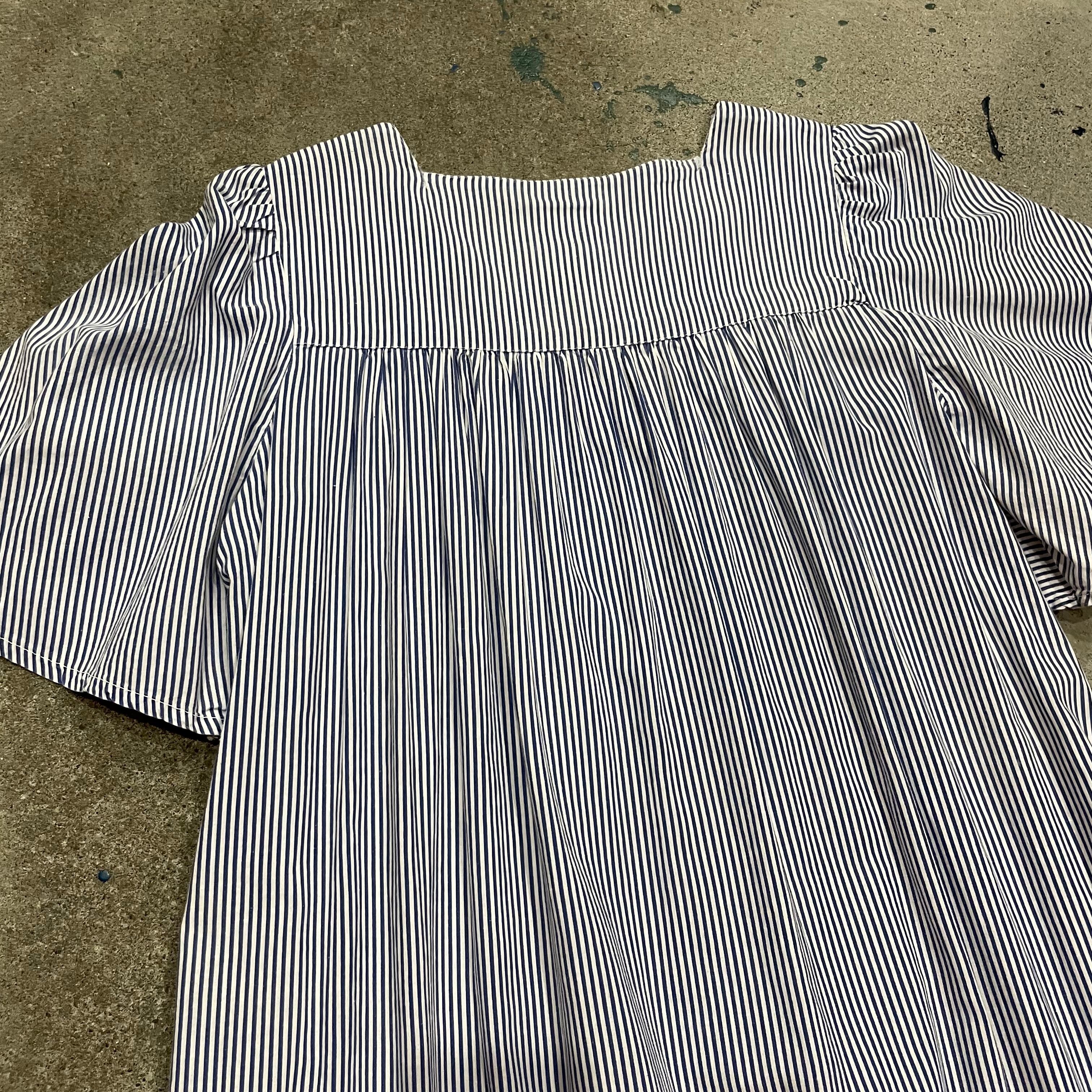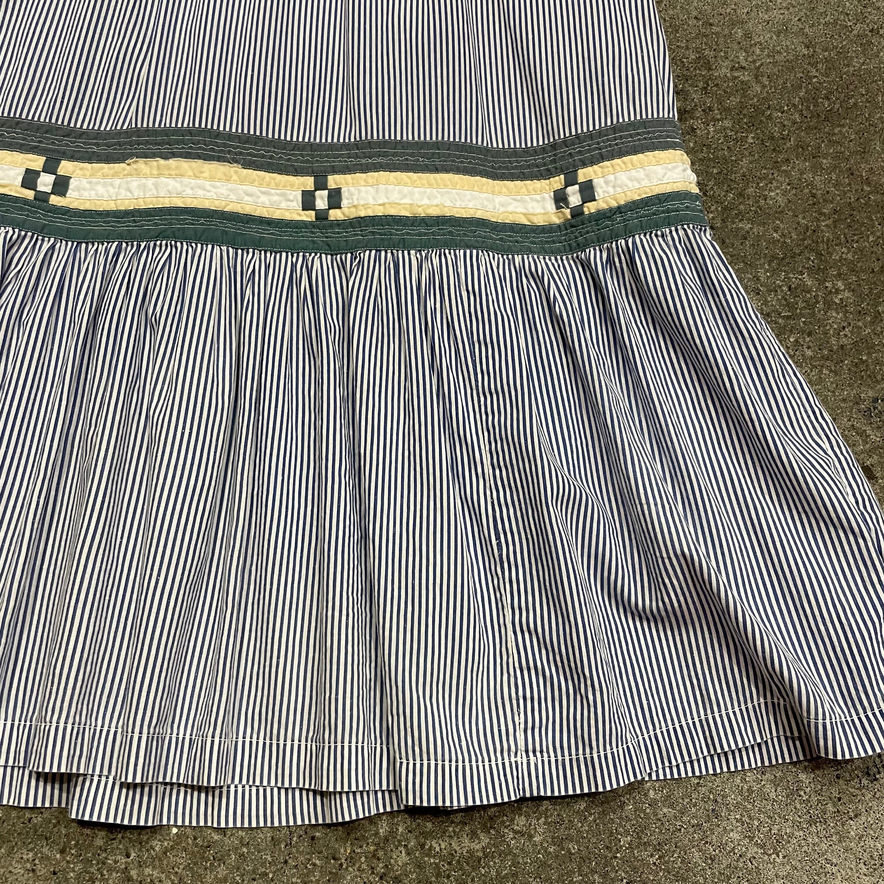 胸元と裾のパッチワークがかわいいストライプのワンピースです。青×白のストライプがとても爽やかですし、ボリュームのある袖やゆったり締め付けのないデザインで風通しが良く夏にぴったりな一着です。
