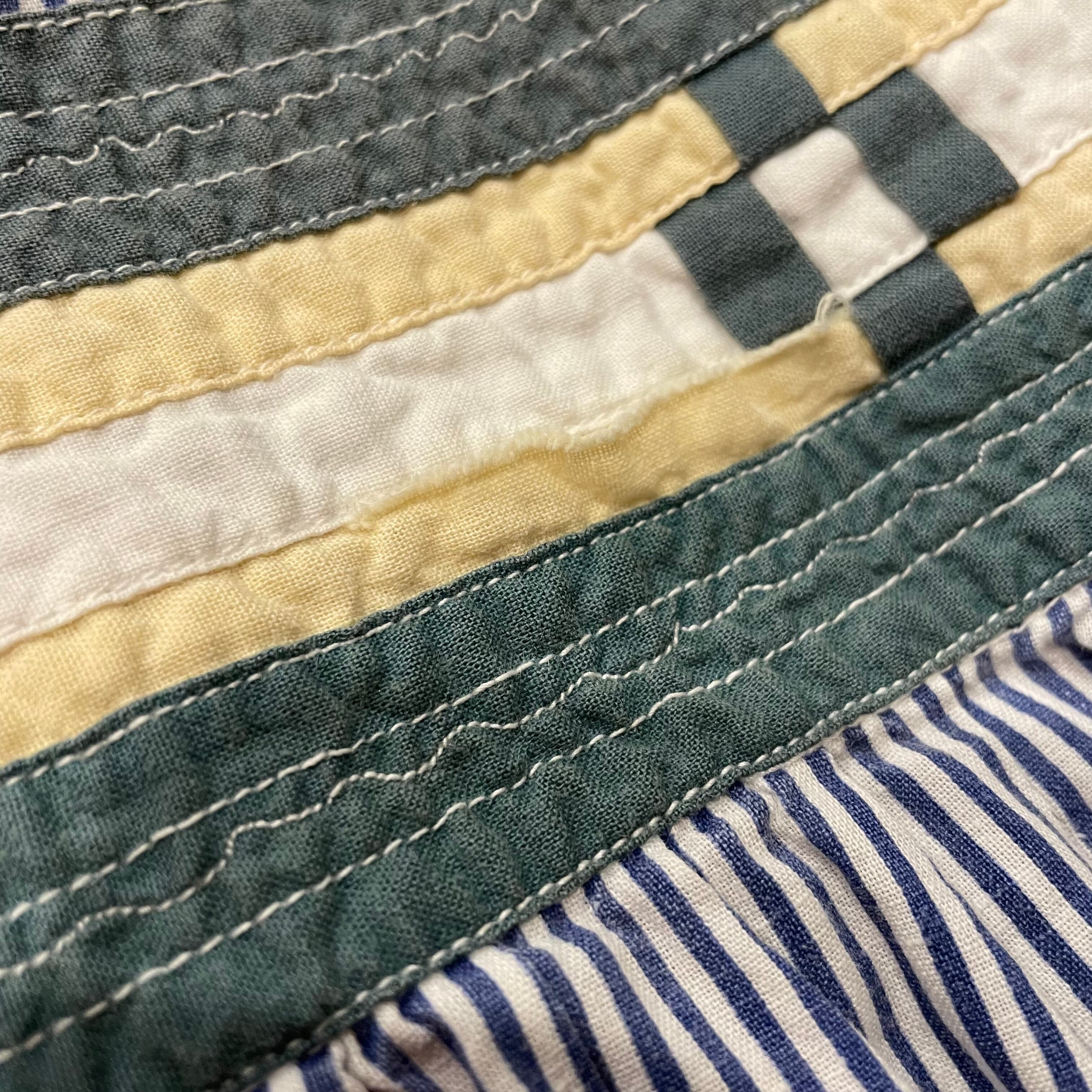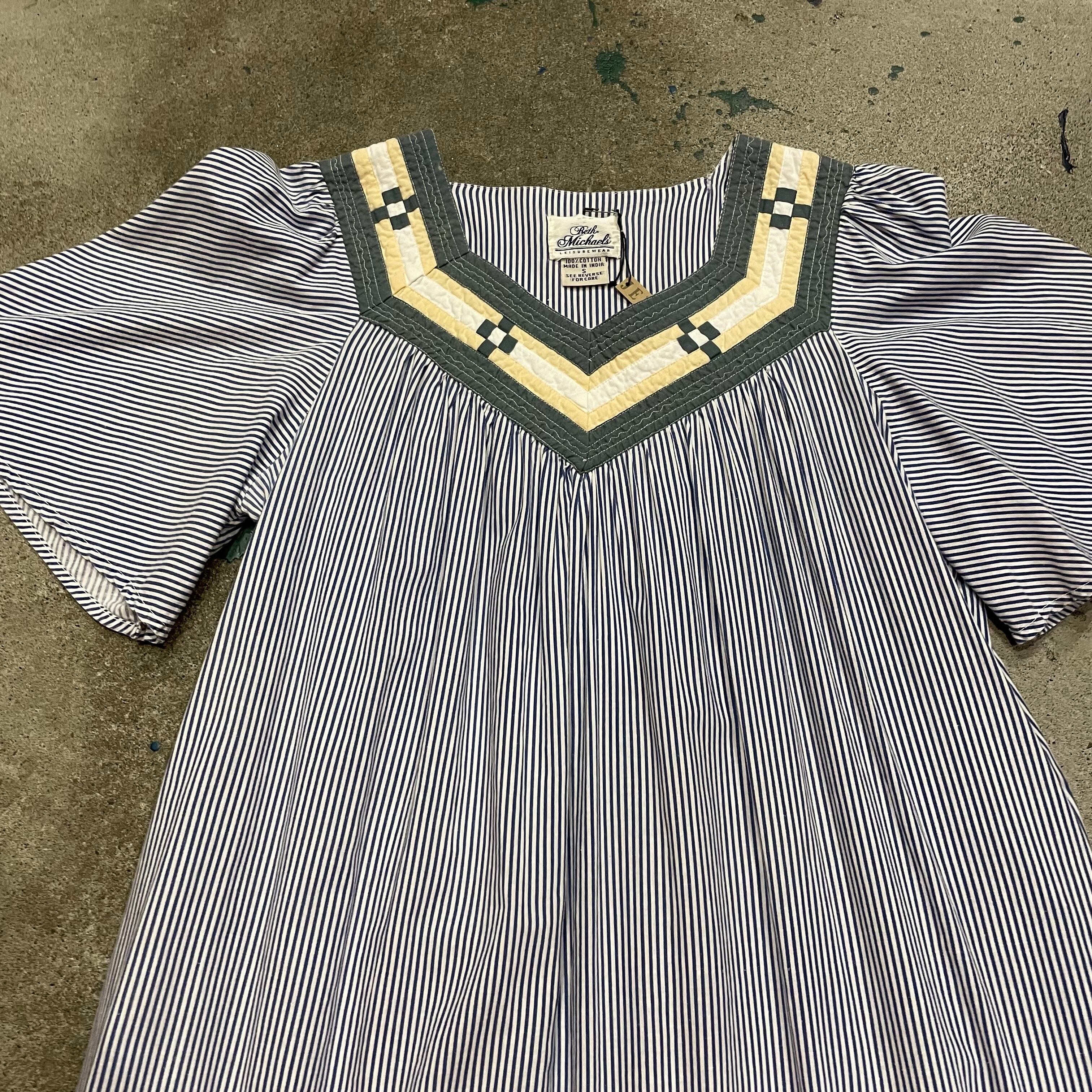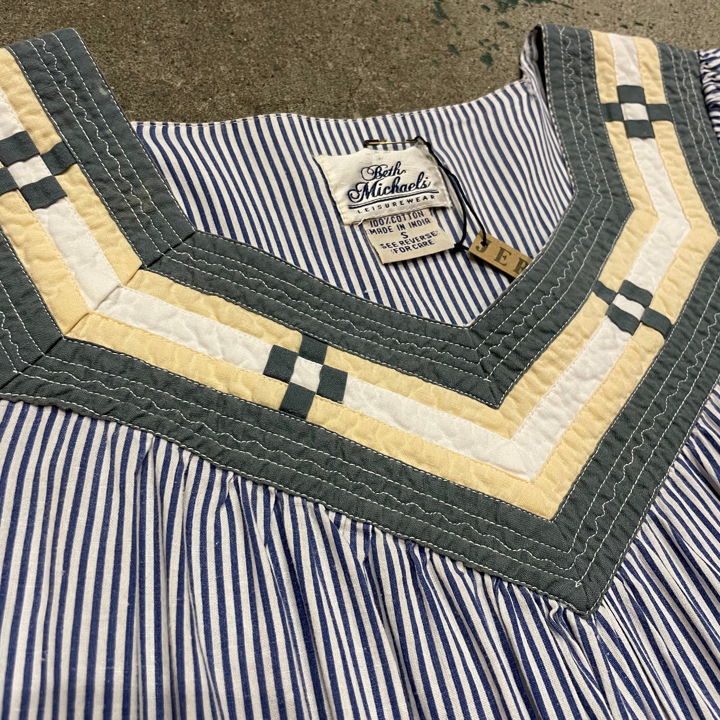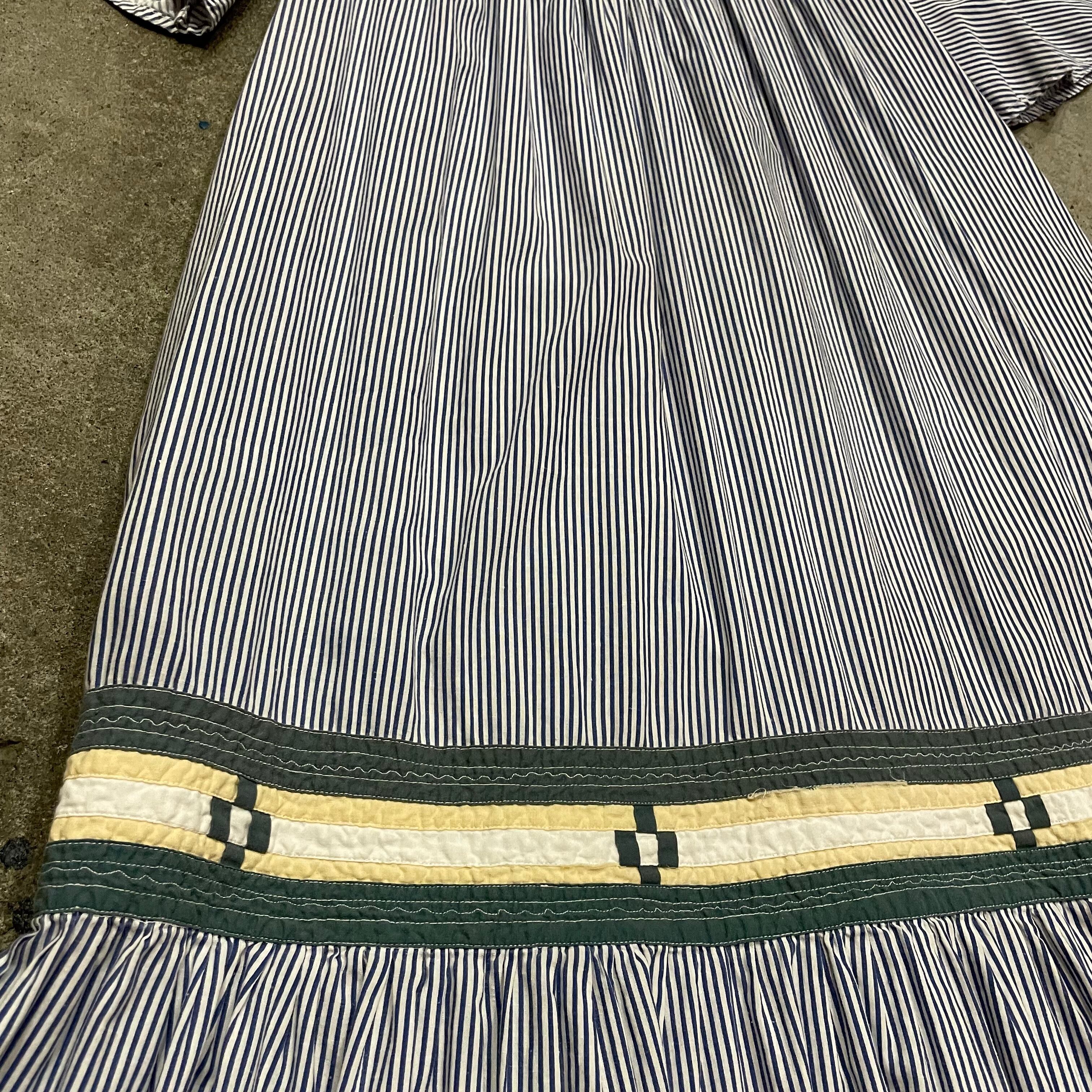 胸元と裾のパッチワークがかわいいストライプのワンピースです。青×白のストライプがとても爽やかですし、ボリュームのある袖やゆったり締め付けのないデザインで風通しが良く夏にぴったりな一着です。