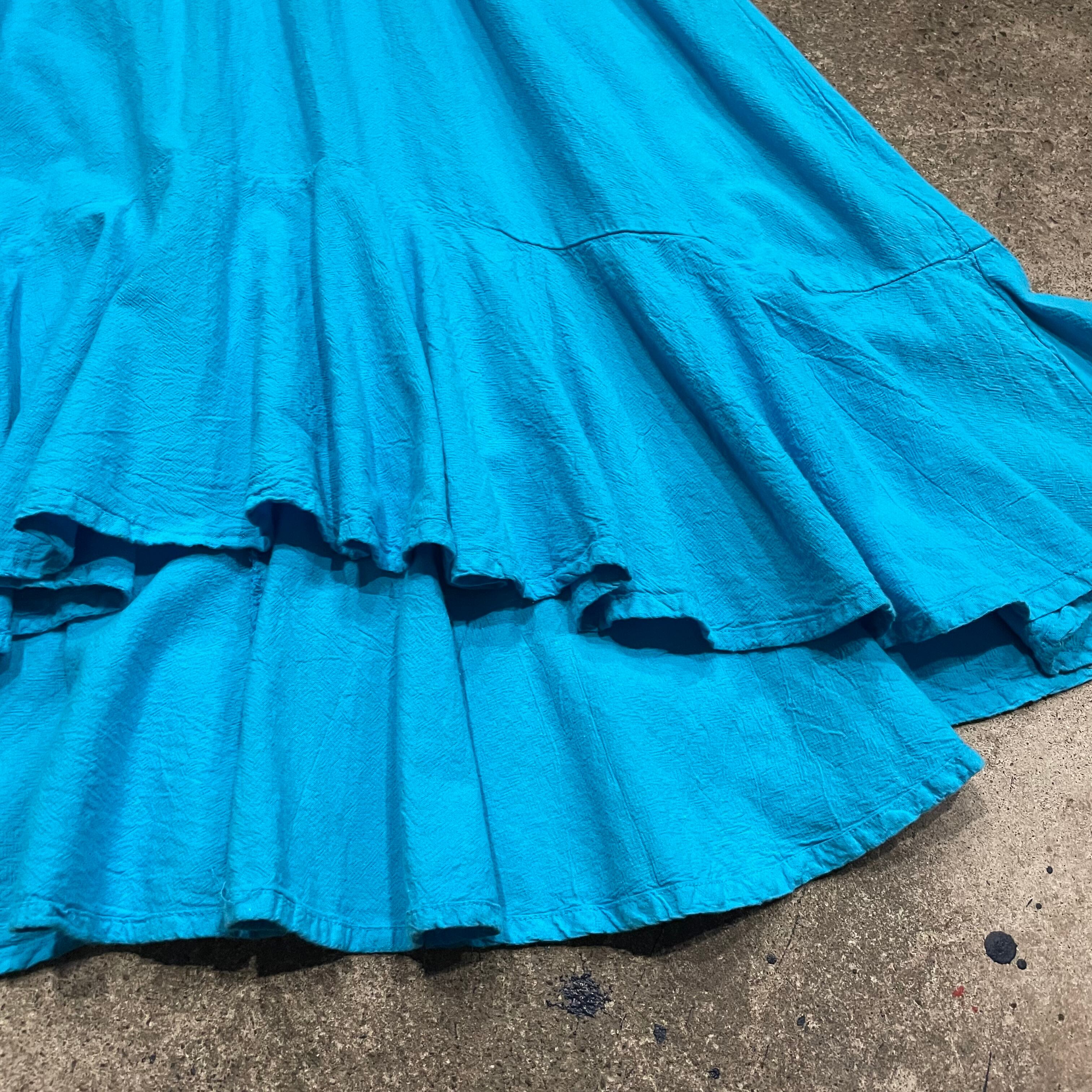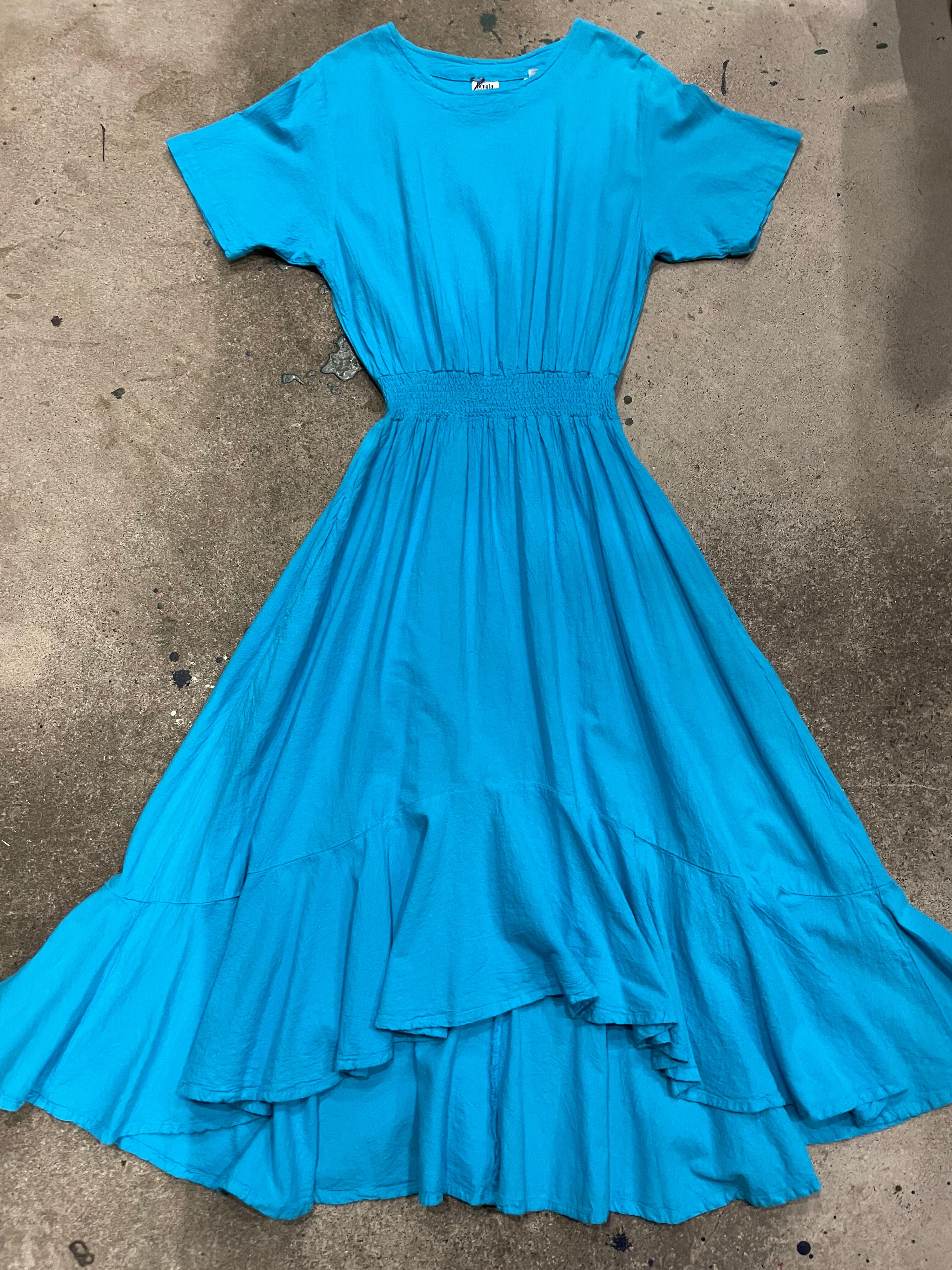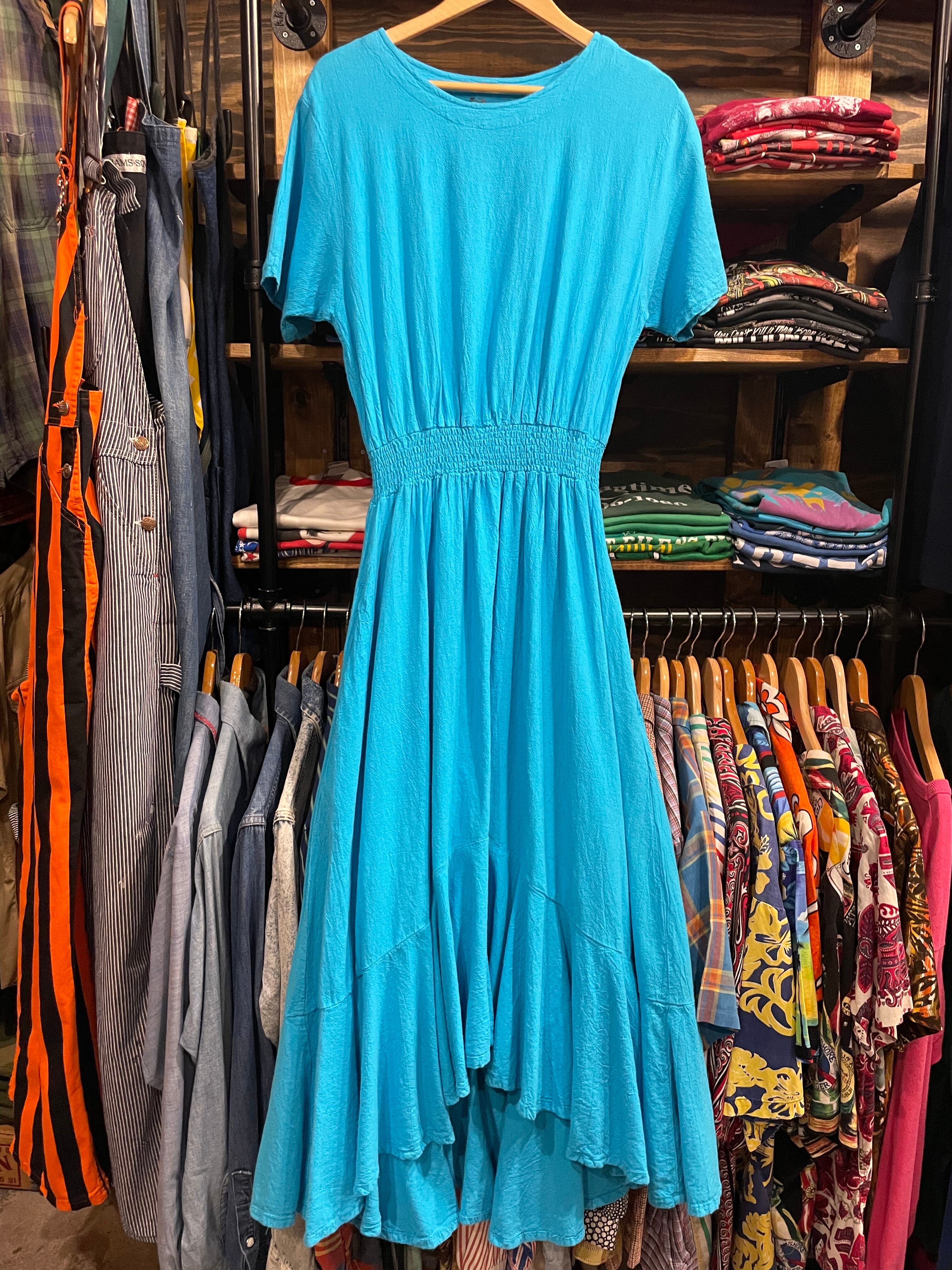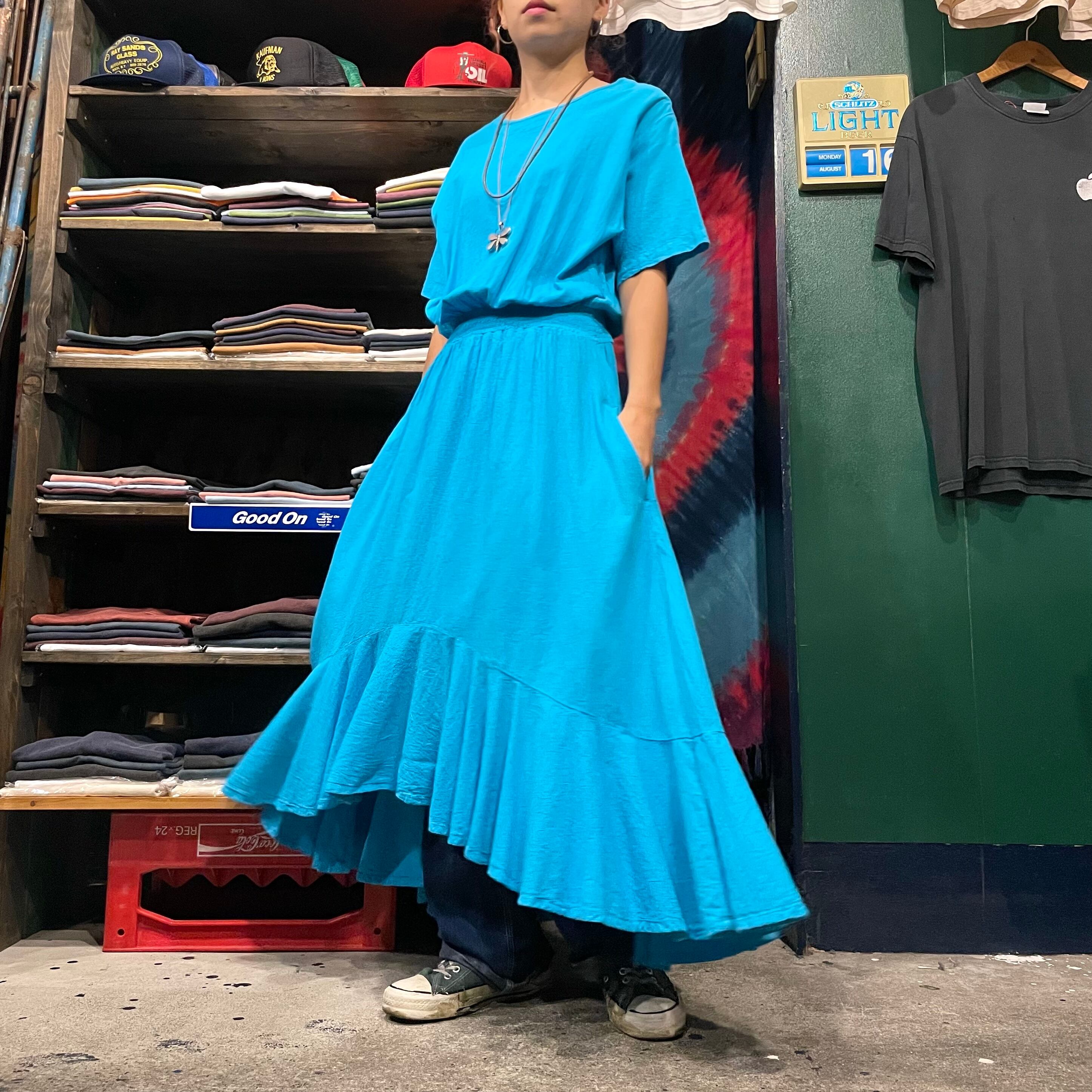 裾が前は短く、後ろは長くなっていてボリュームのあるフレアがかわいいデザインです。ウエストはシャーリングになっていてブラウジングのように着ていただけますし、メリハリがあって素敵な一着です。