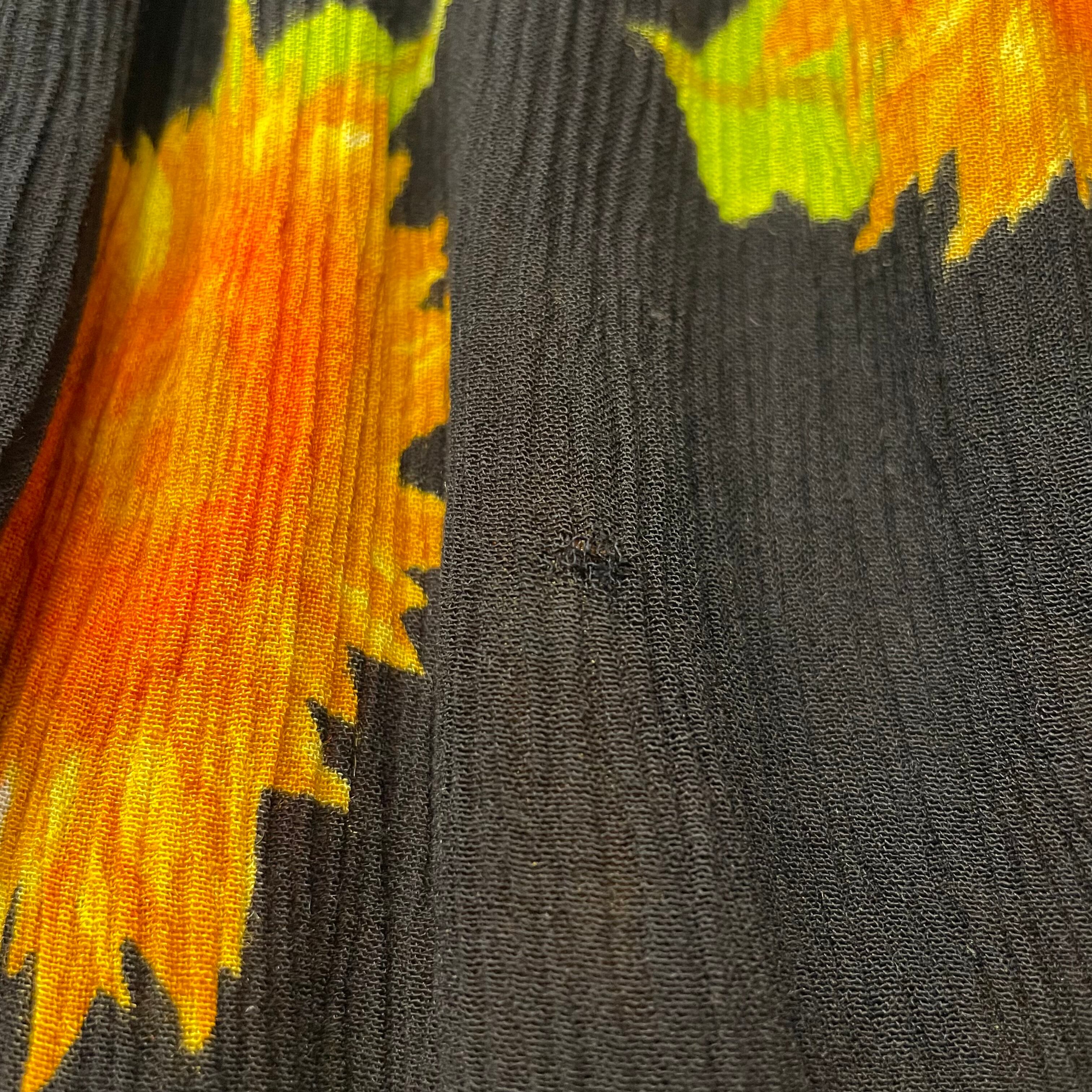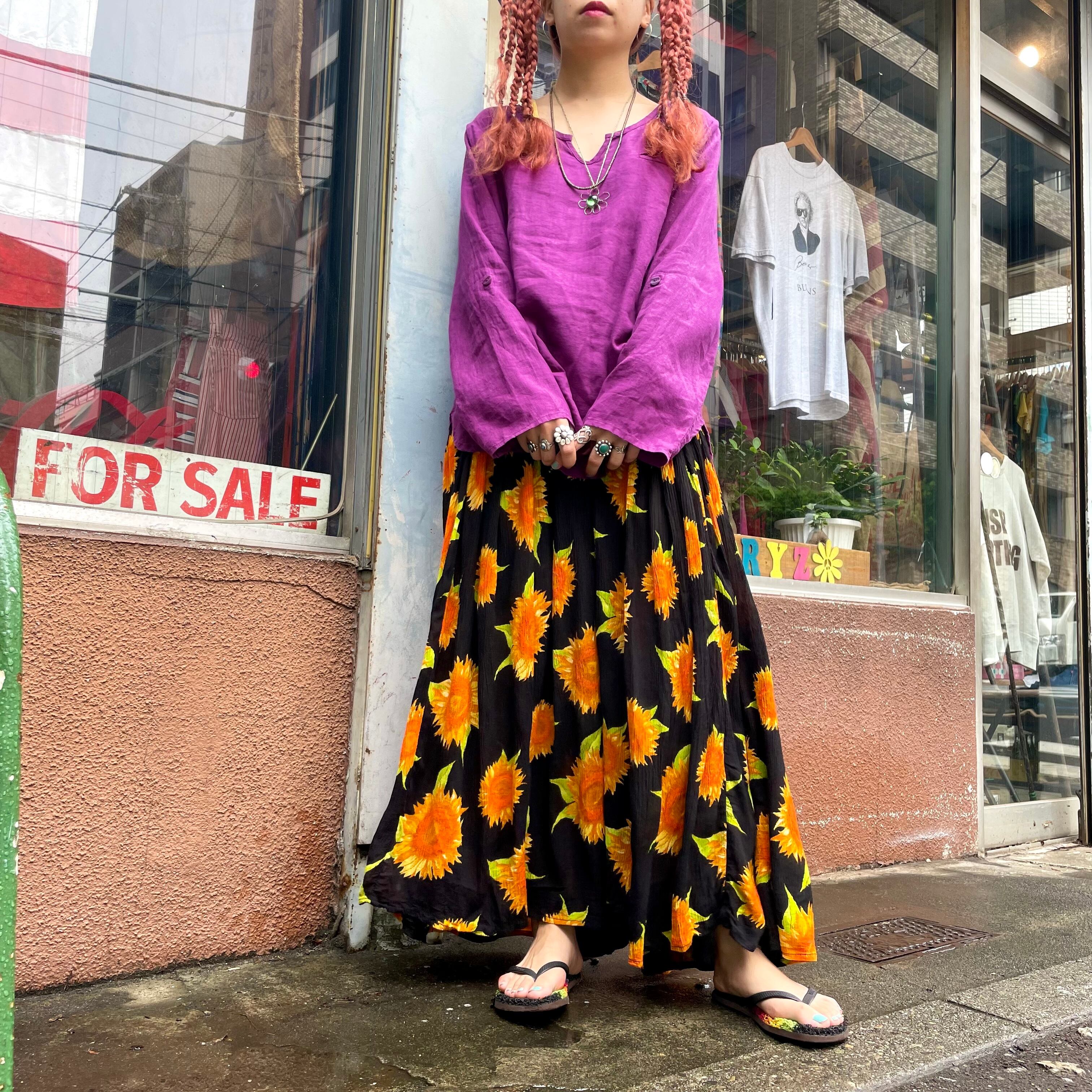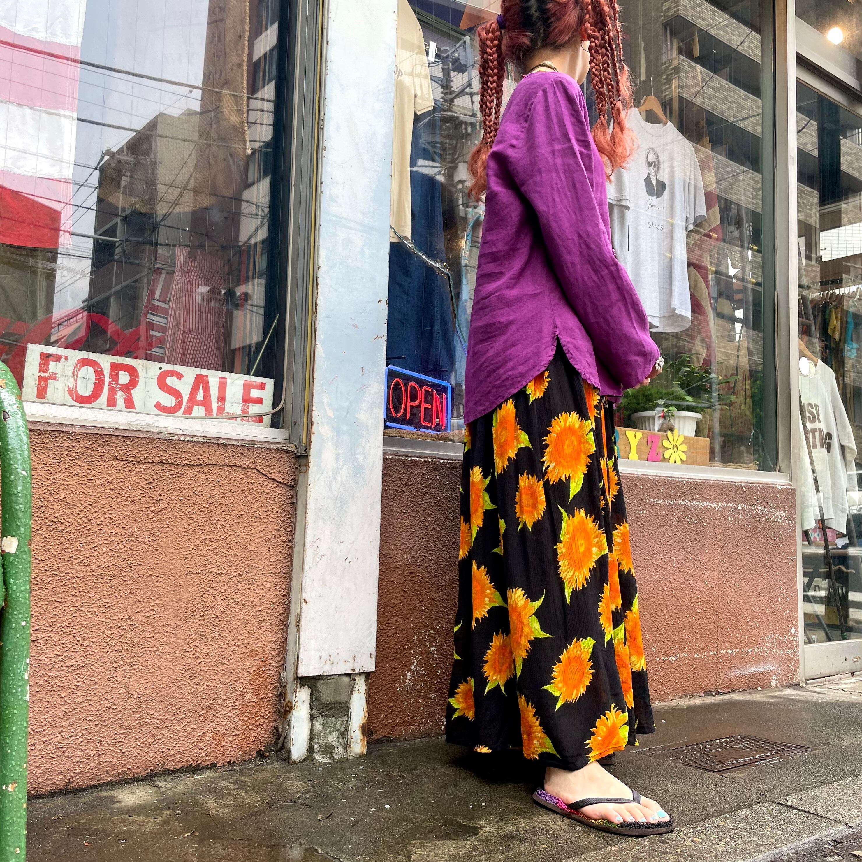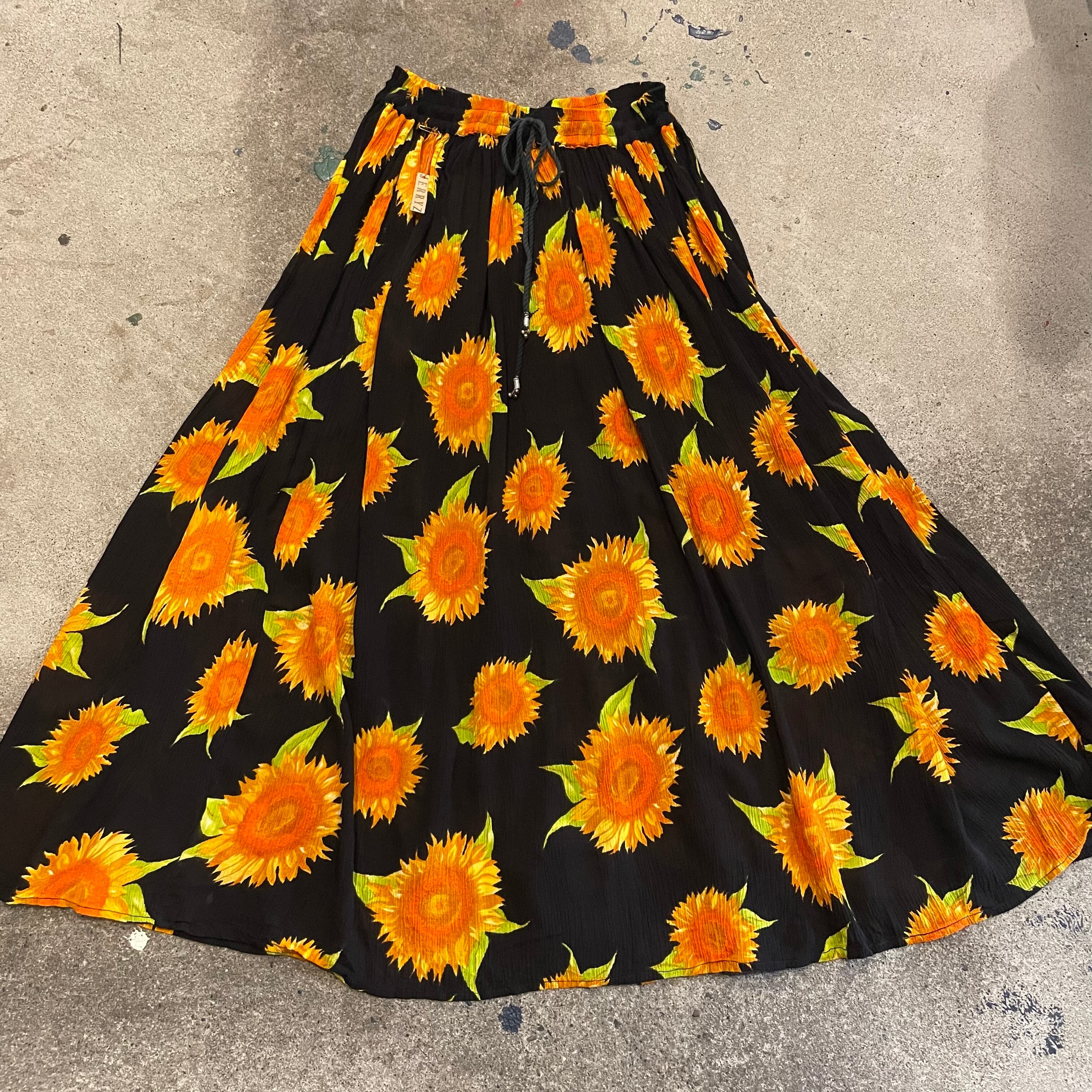 黒地に大きいひまわりの柄がとてもかわいいスカートです。元気が出る柄ですね!
