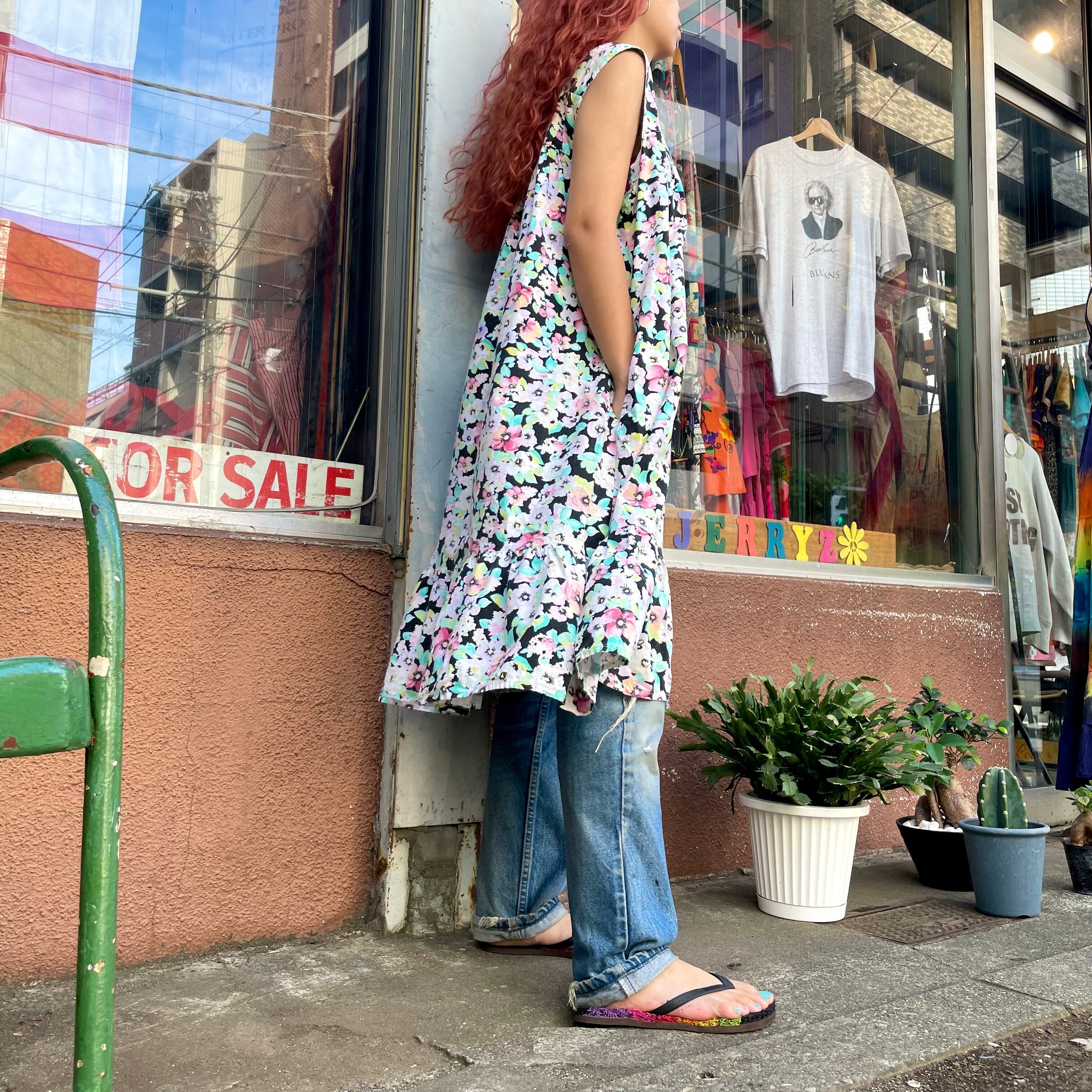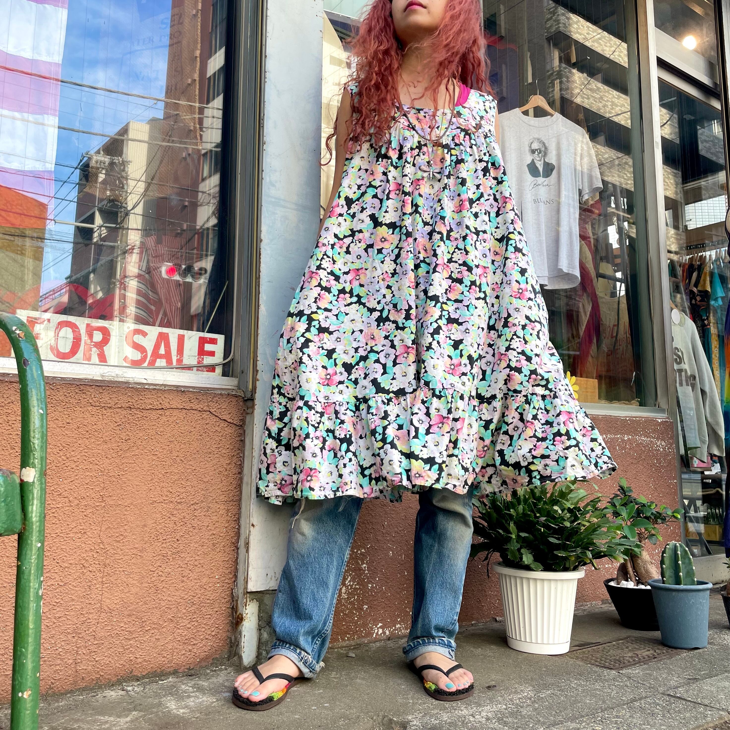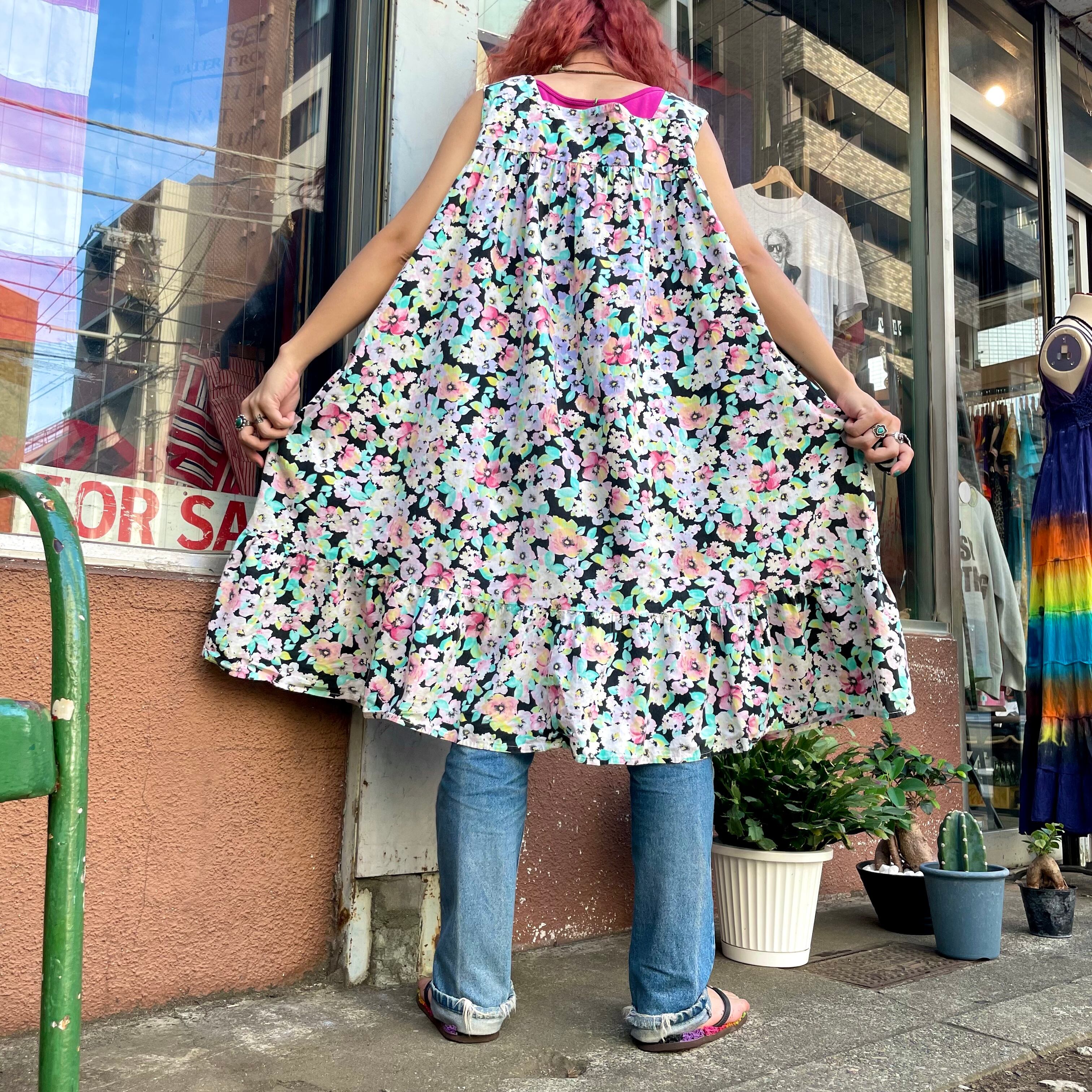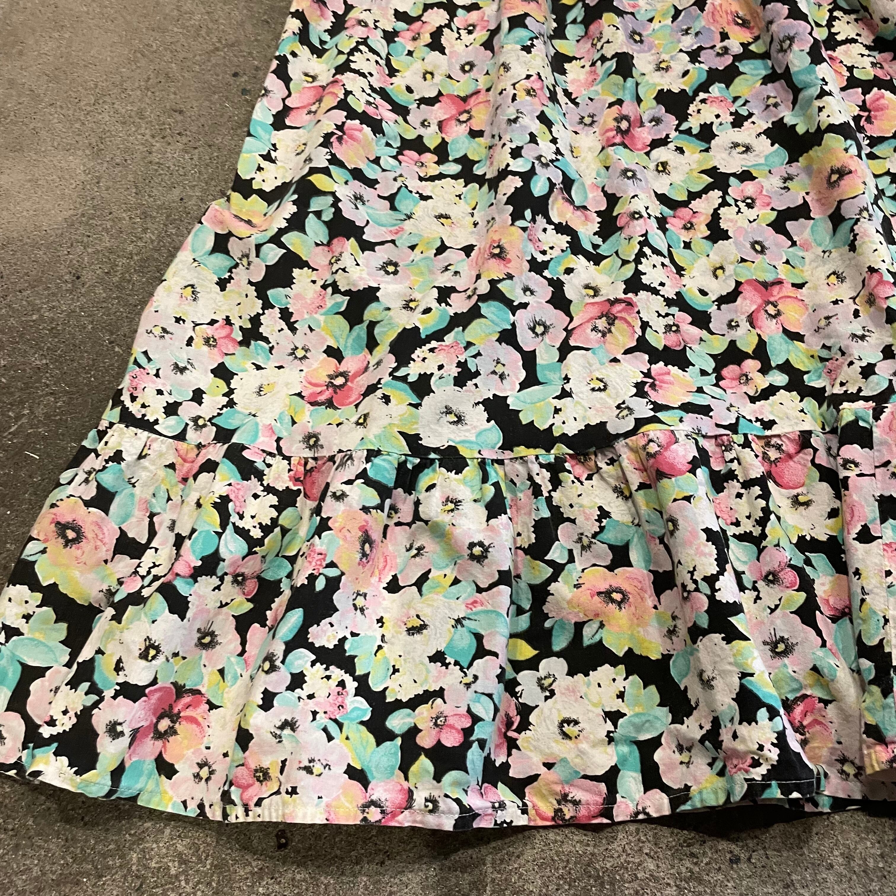 黒地にパステルカラーの花柄がかわいいワンピースです。