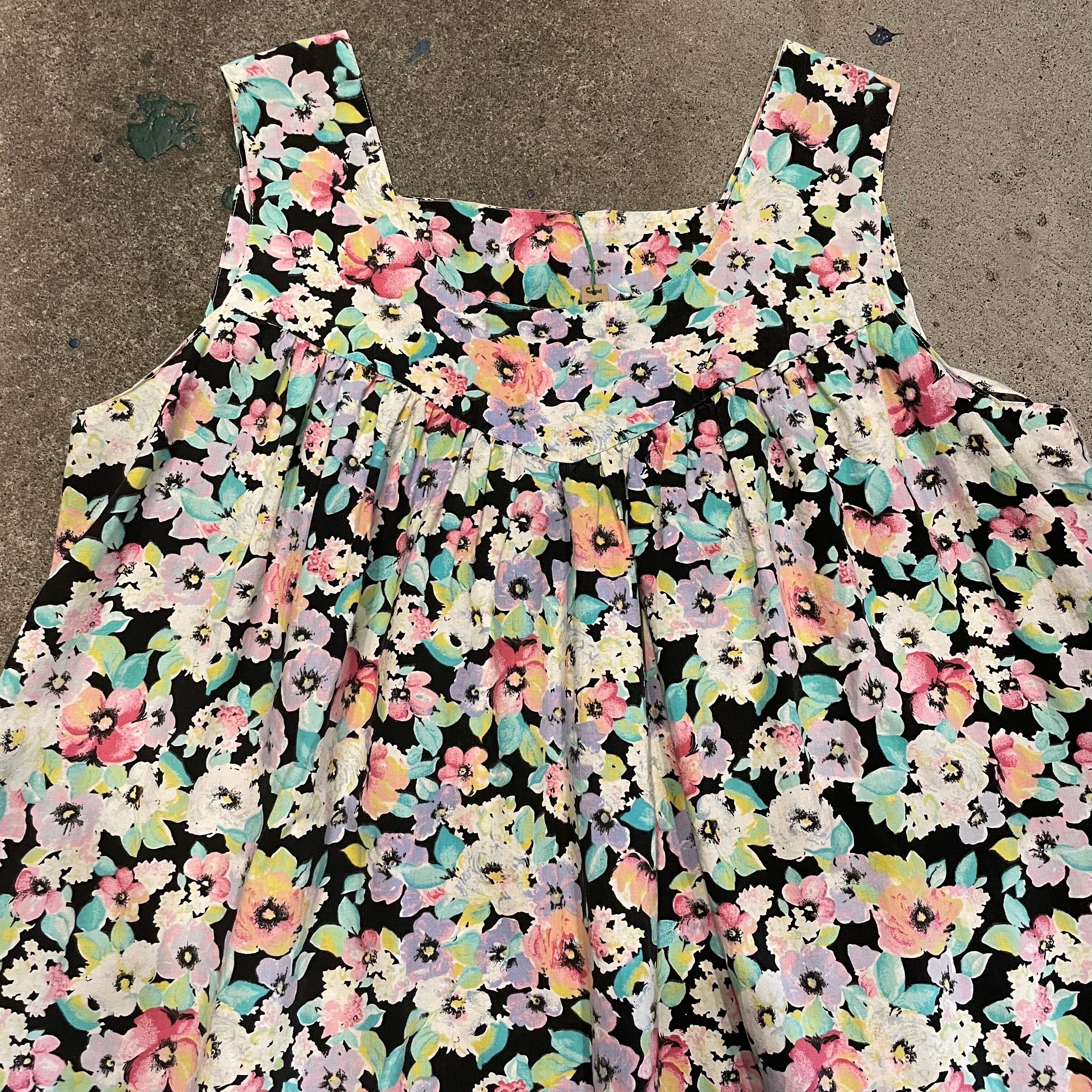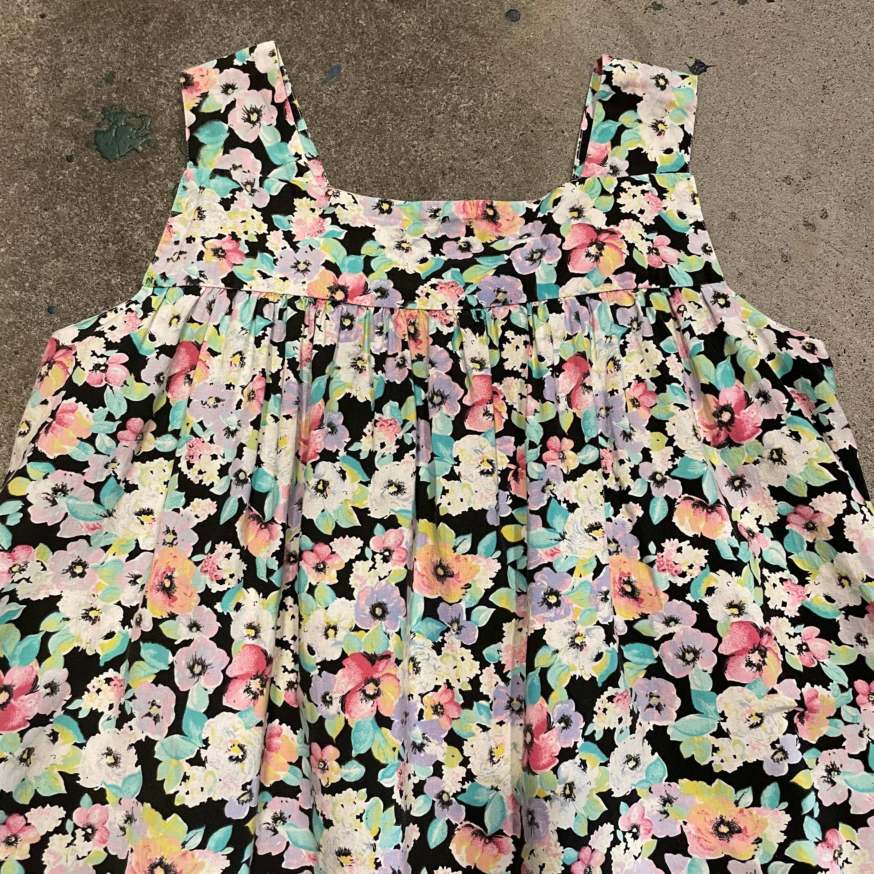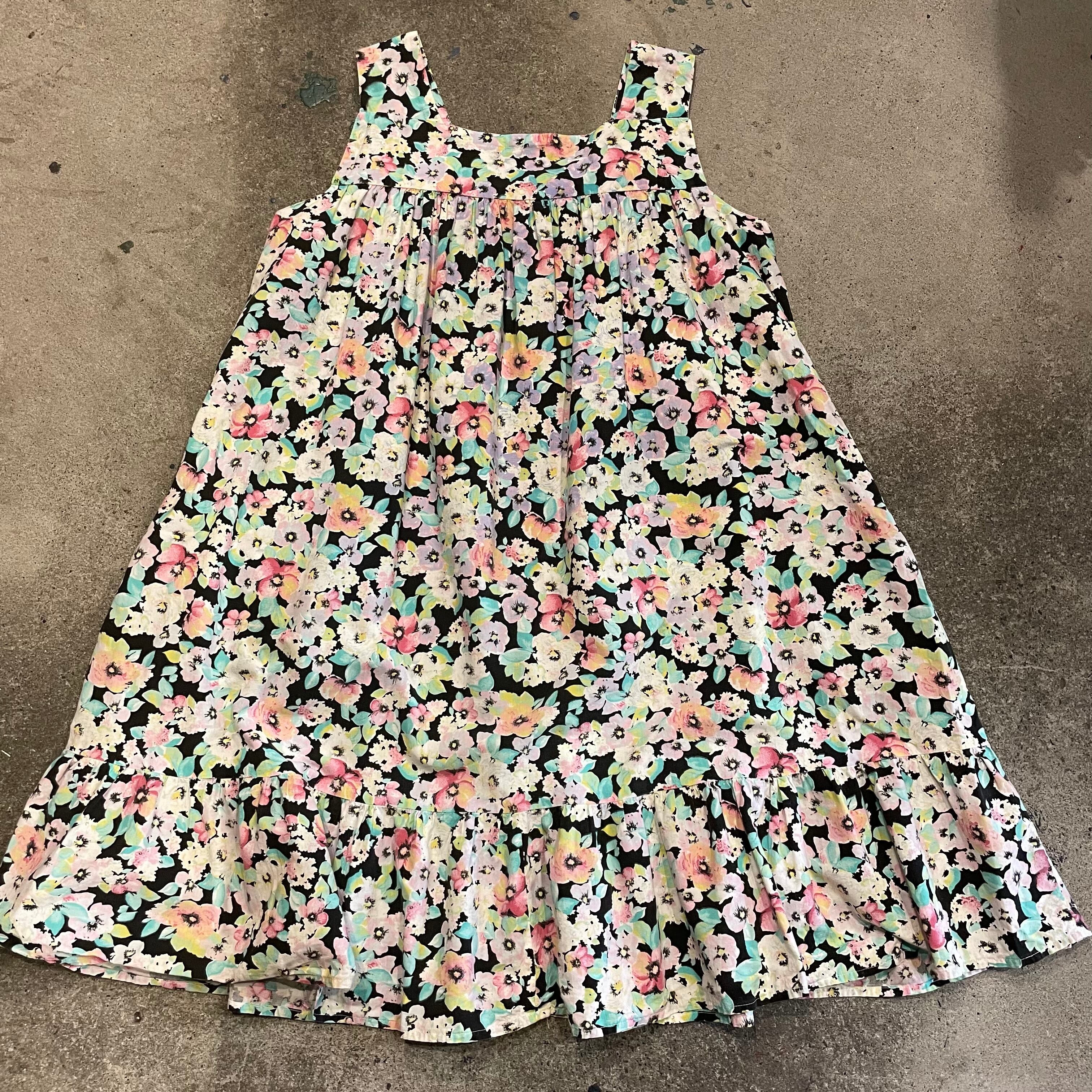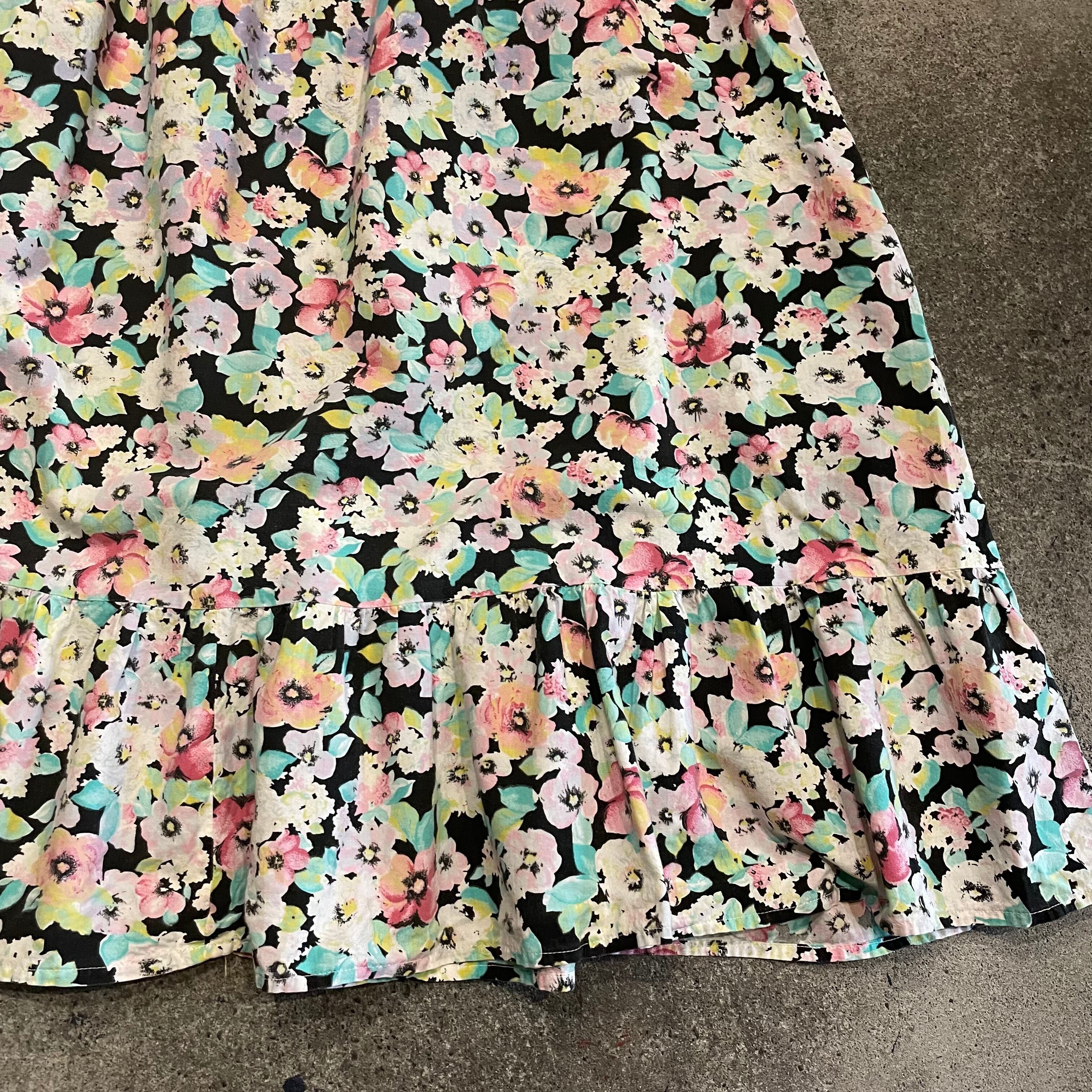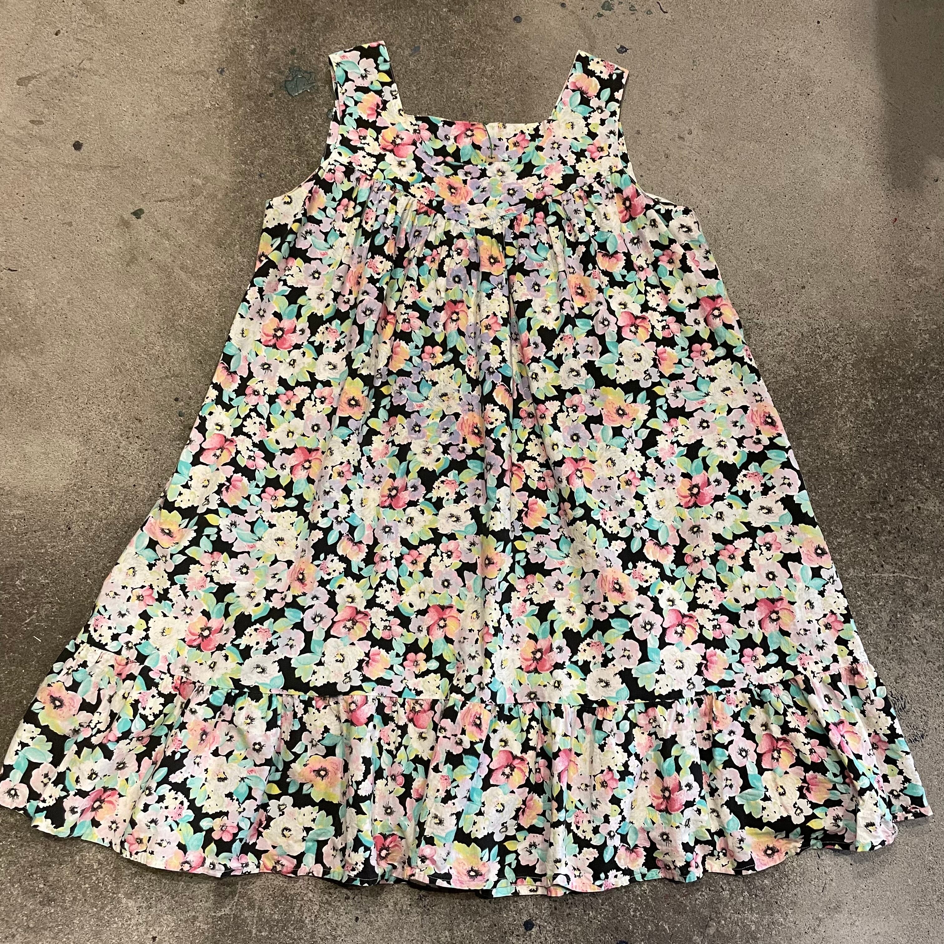黒地にパステルカラーの花柄がかわいいワンピースです。