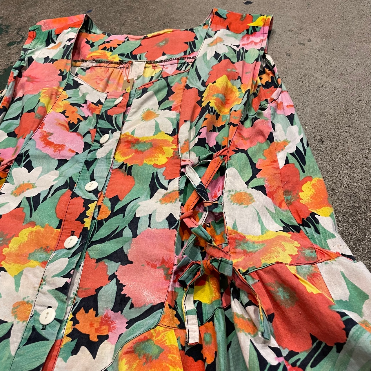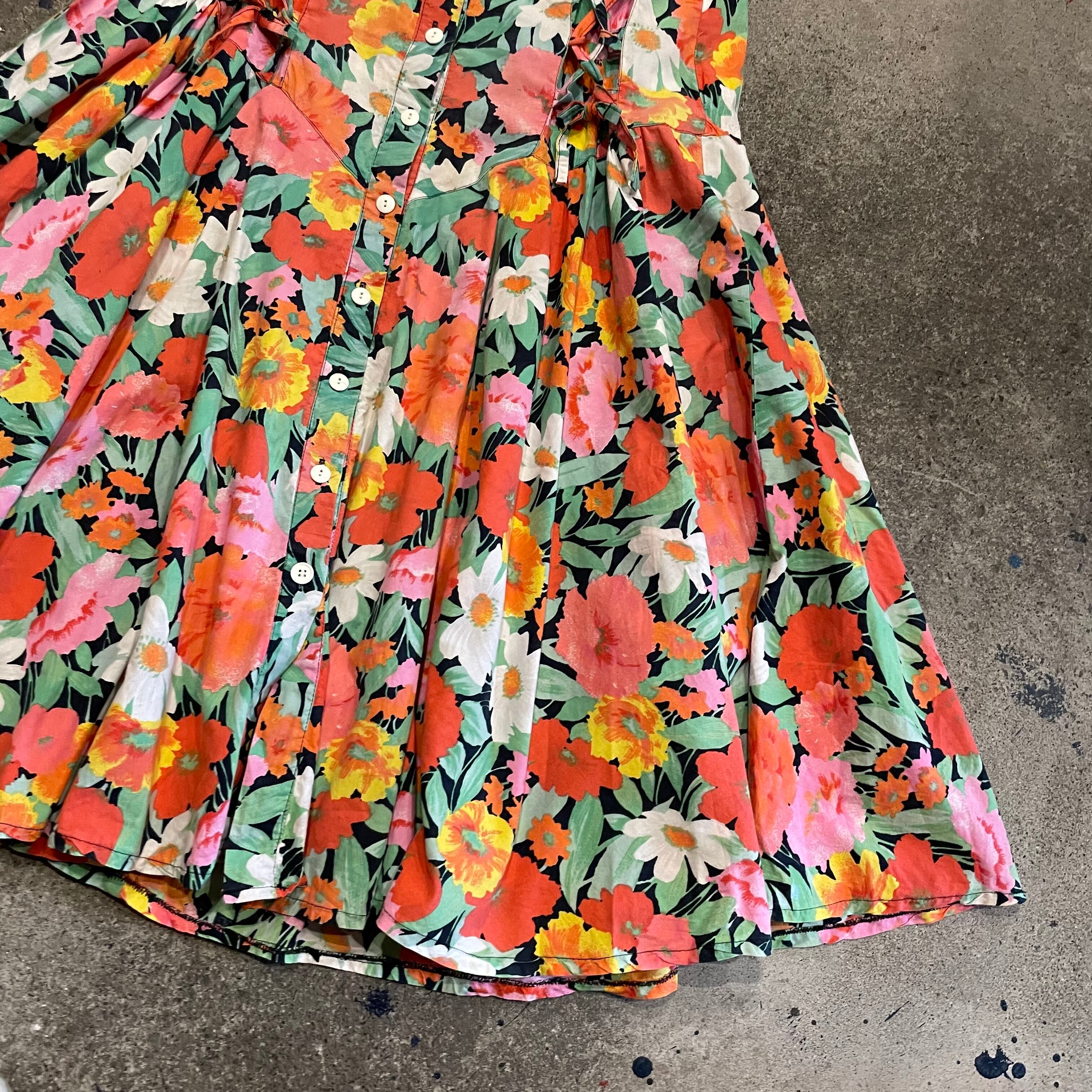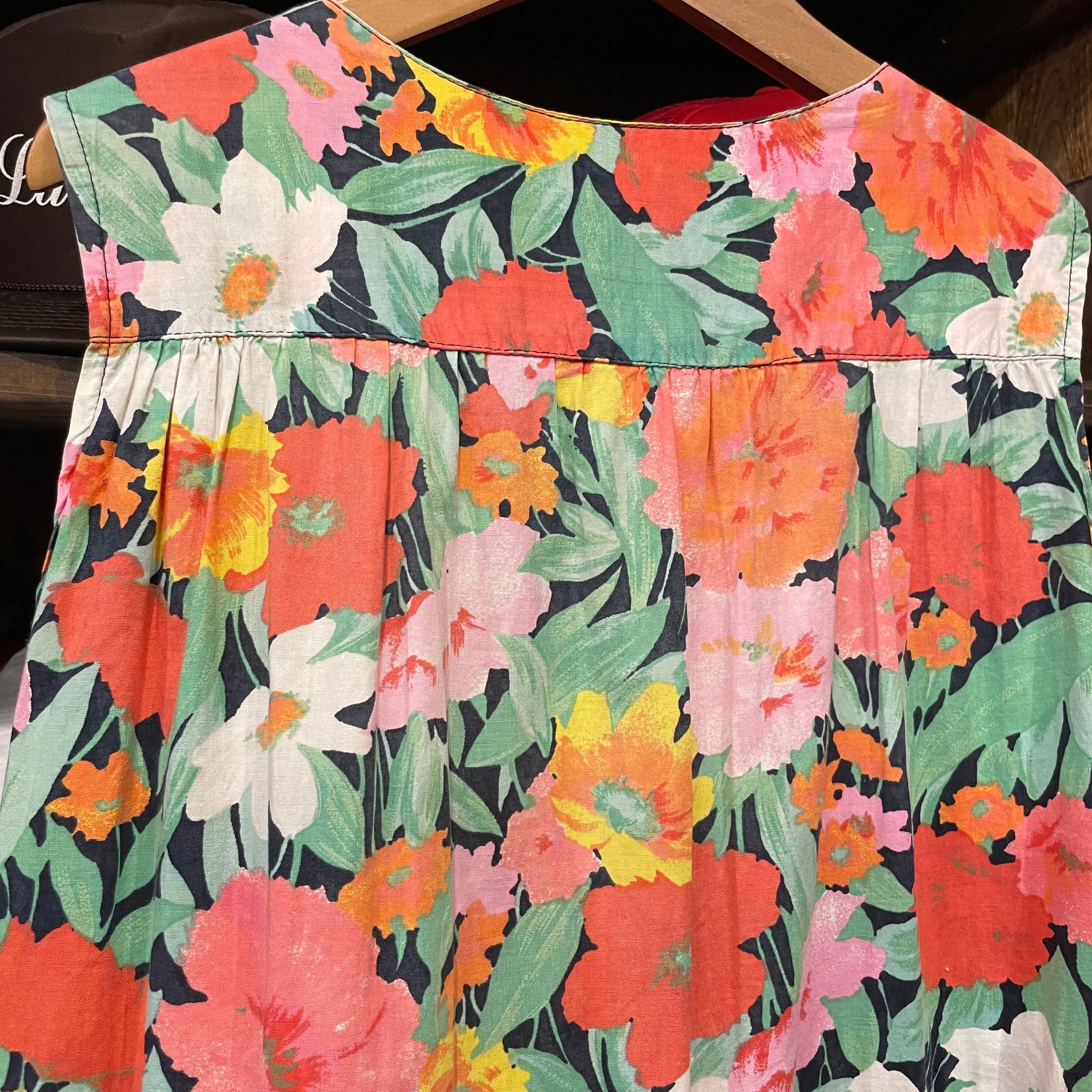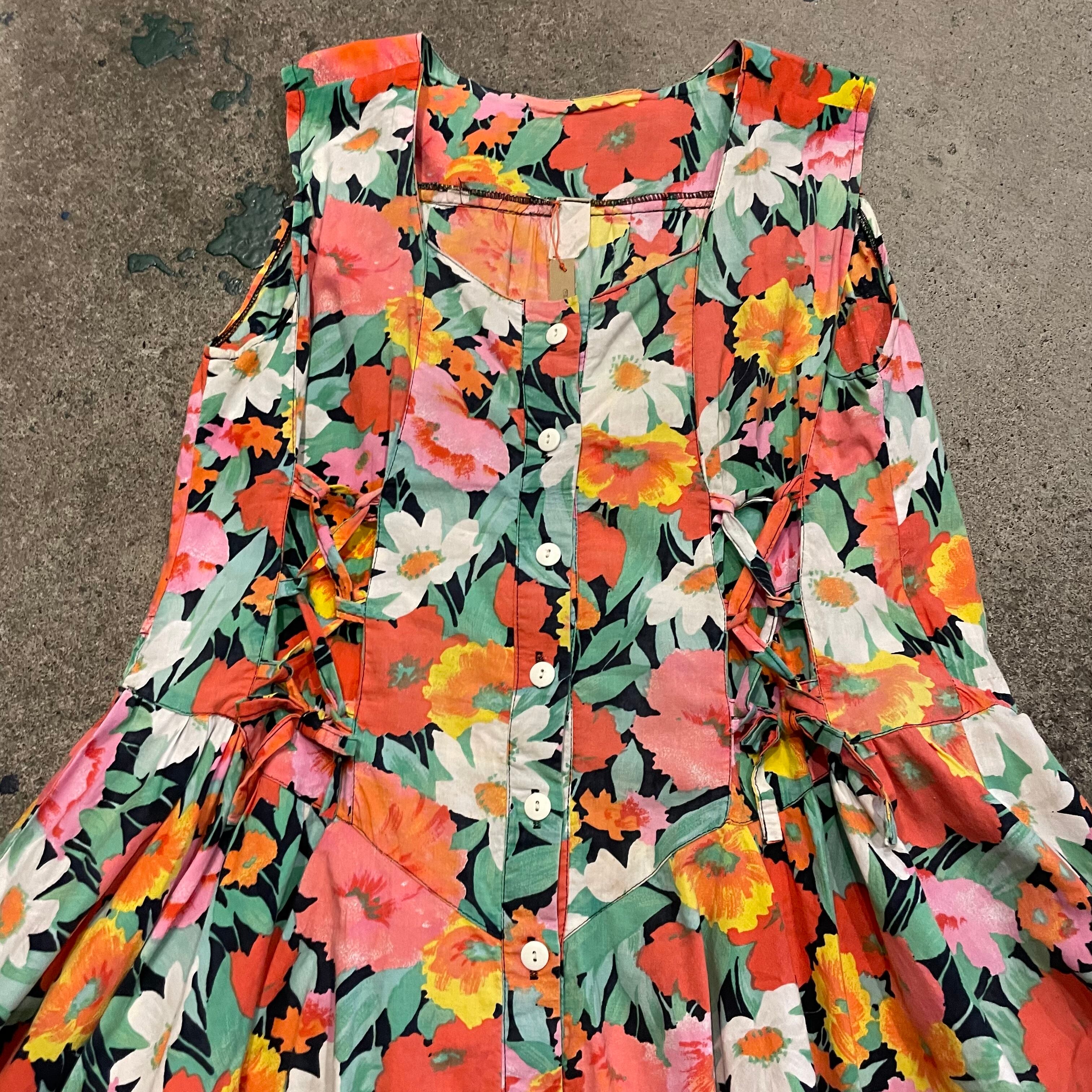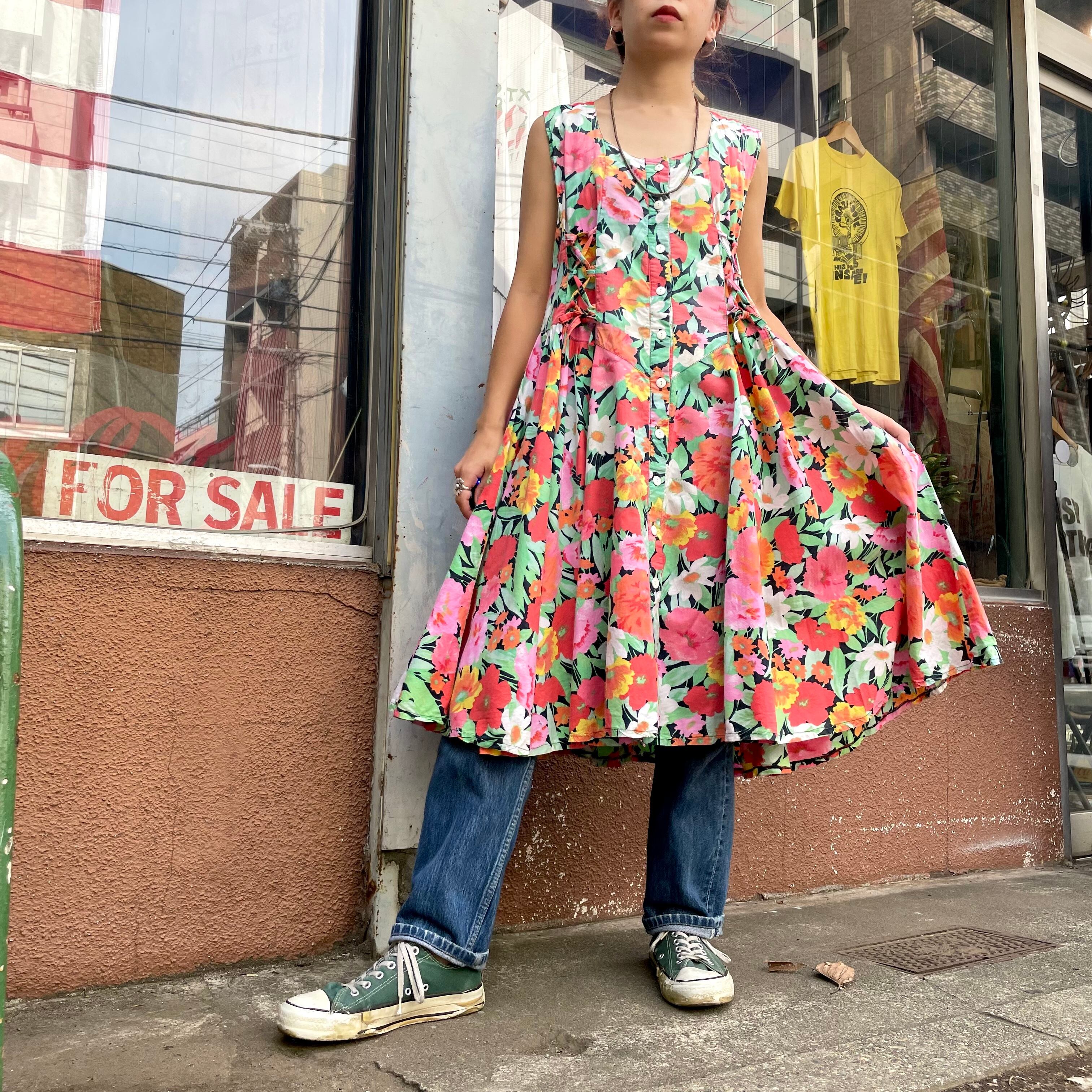 スカートのボリュームがたっぷりでかわいい花柄のワンピースです。前開きでボタンが付いており、両サイドにレースアップ、背中のヨークからのギャザーなど細部までこだわりの感じられる一着です。