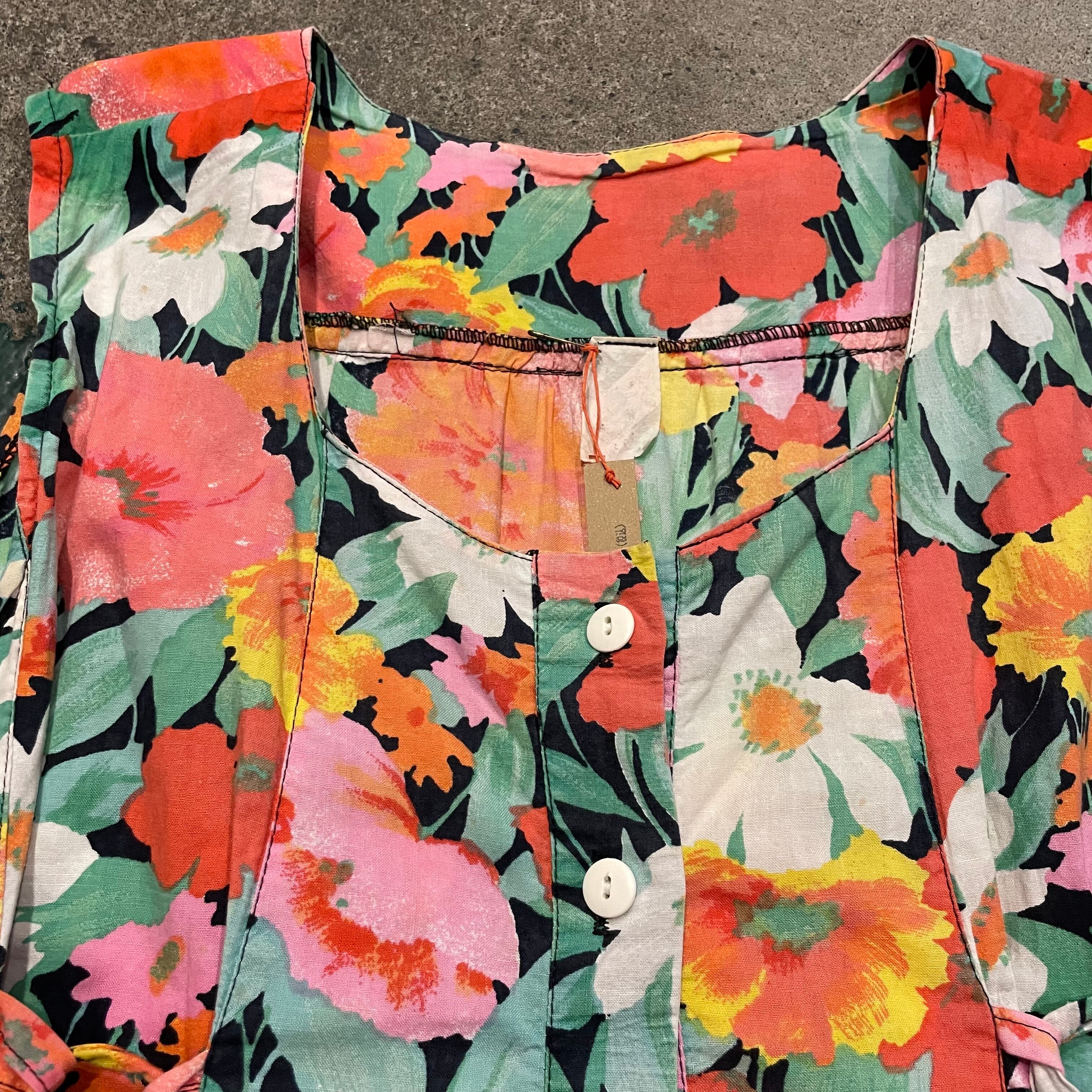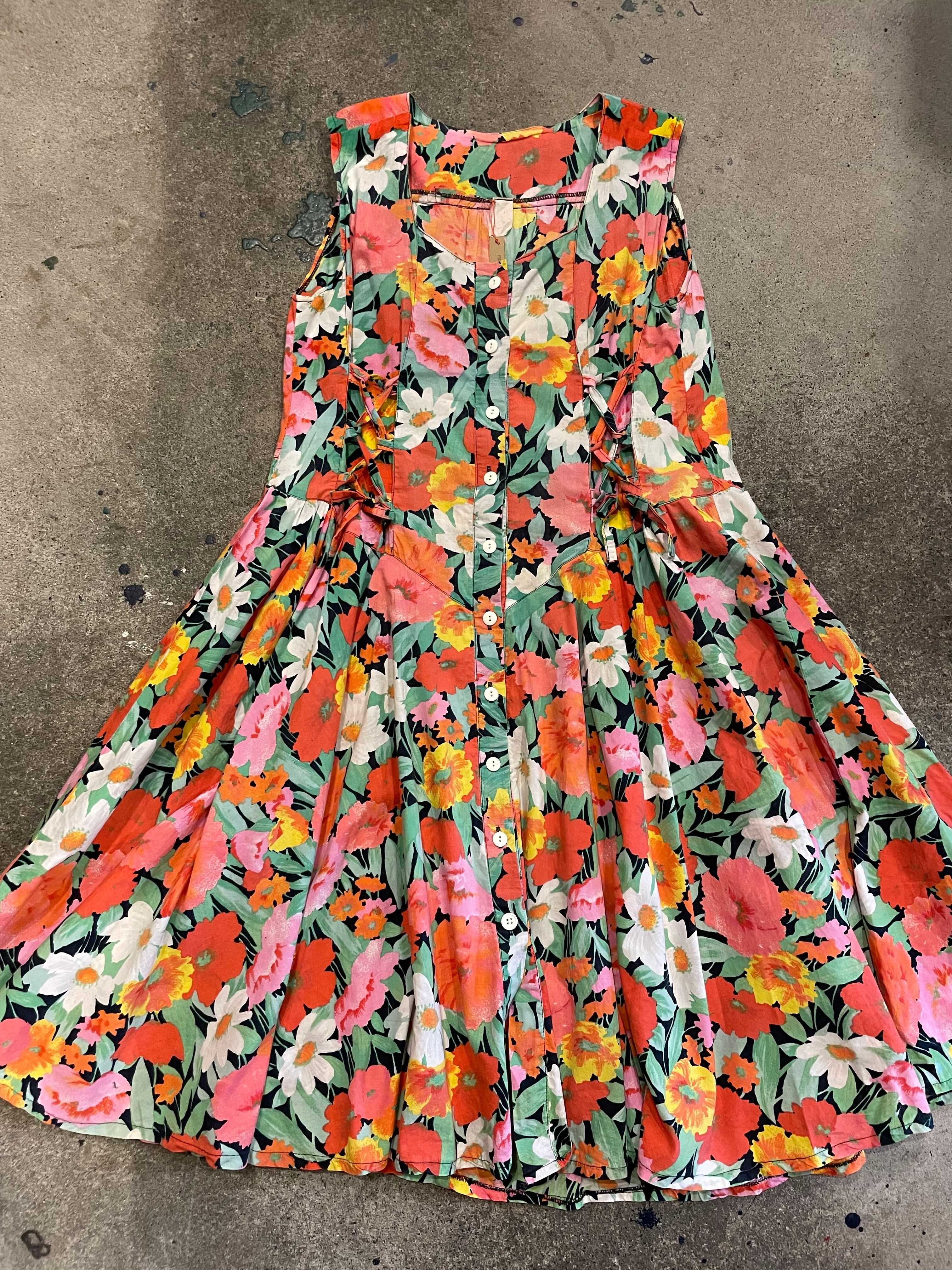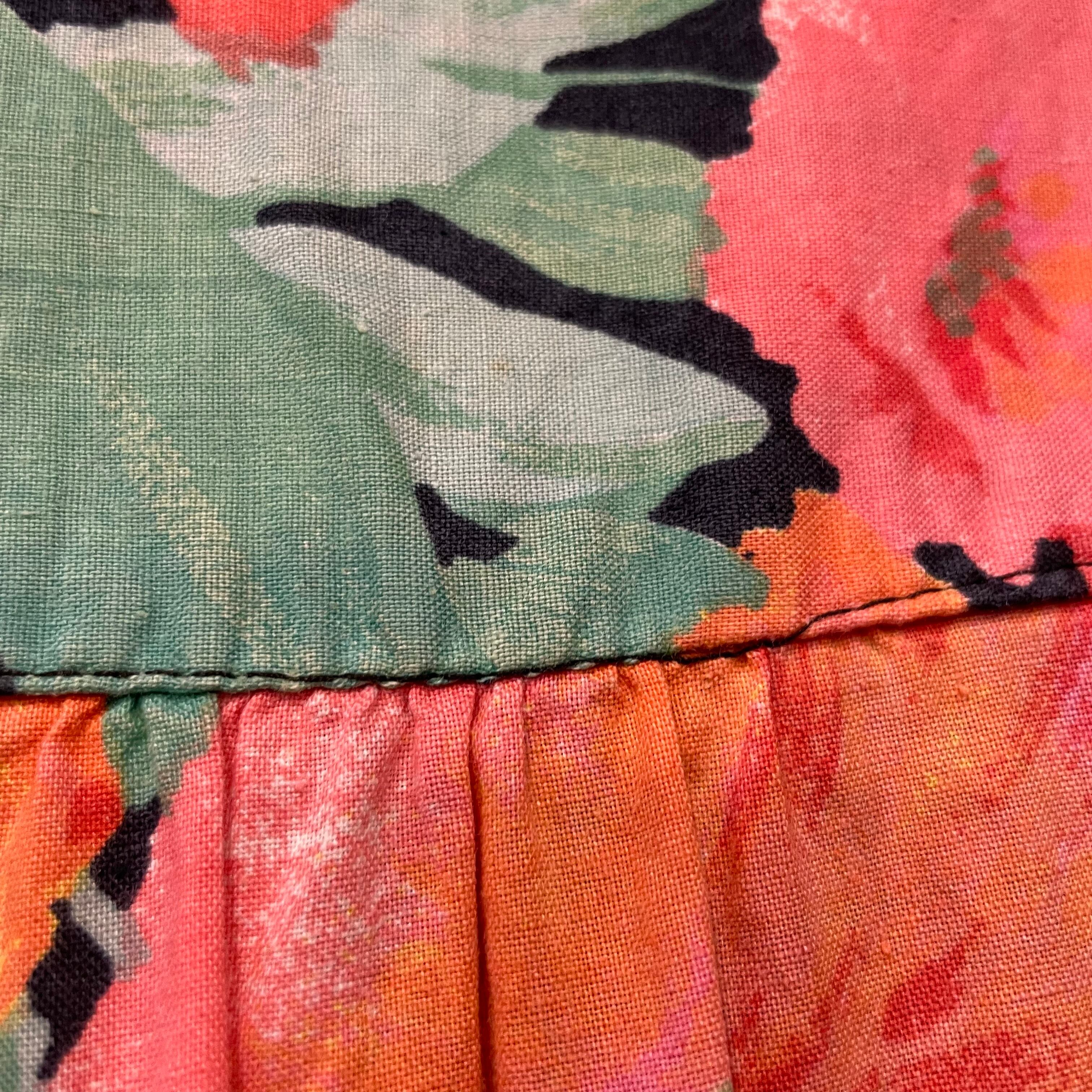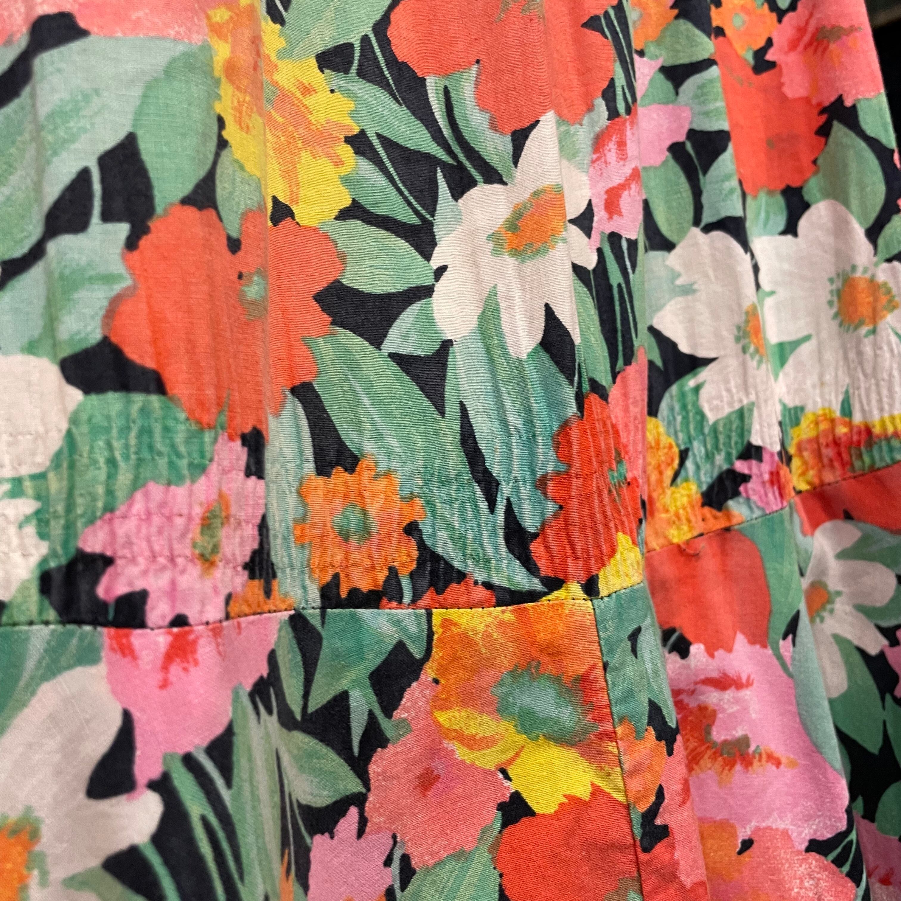 スカートのボリュームがたっぷりでかわいい花柄のワンピースです。前開きでボタンが付いており、両サイドにレースアップ、背中のヨークからのギャザーなど細部までこだわりの感じられる一着です。