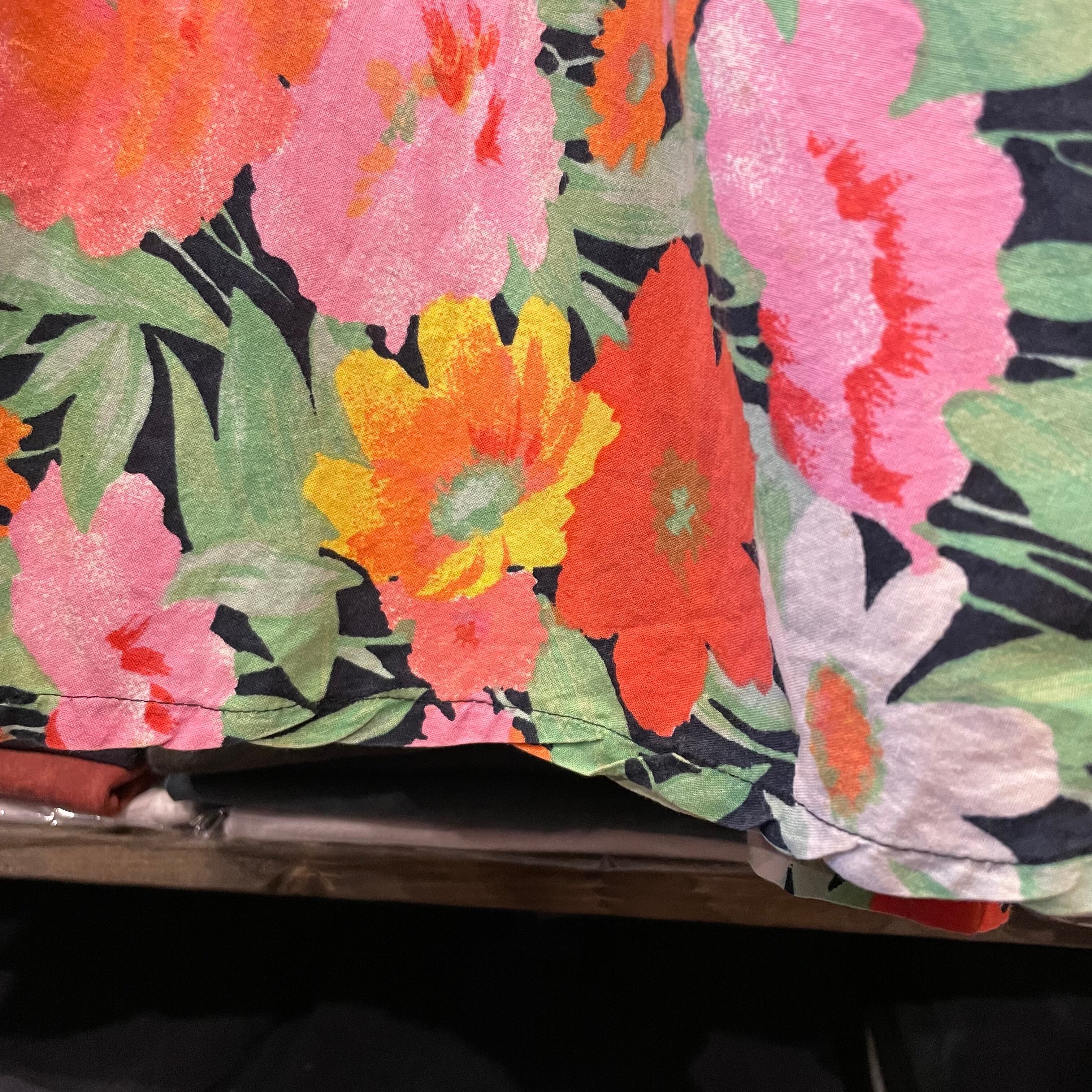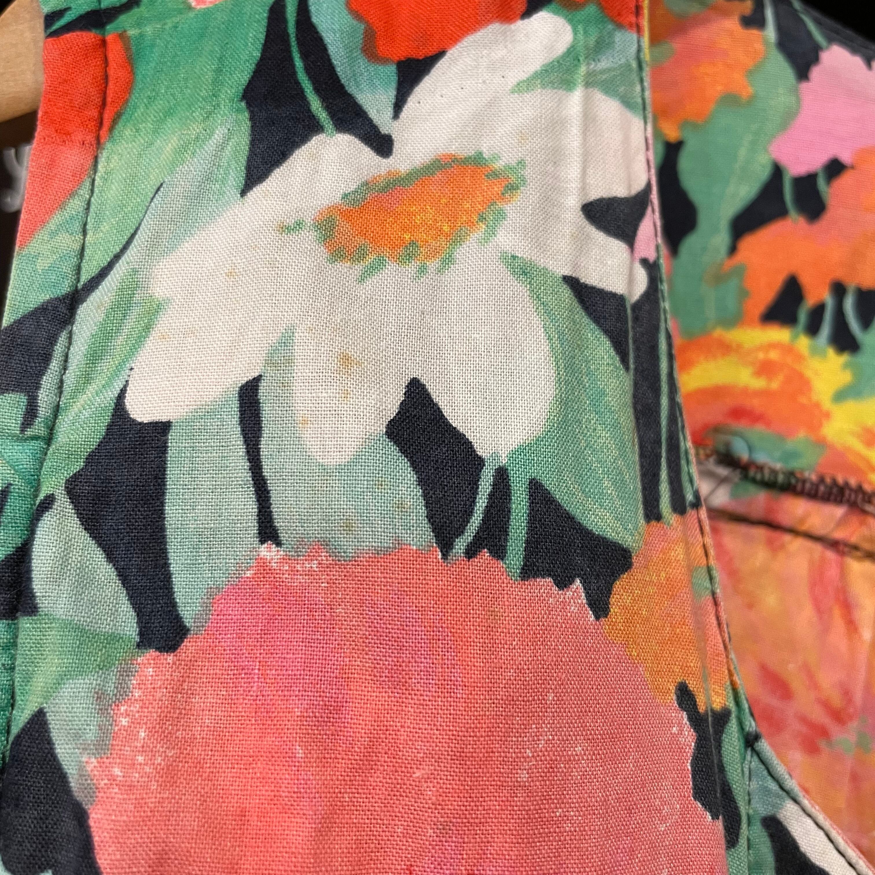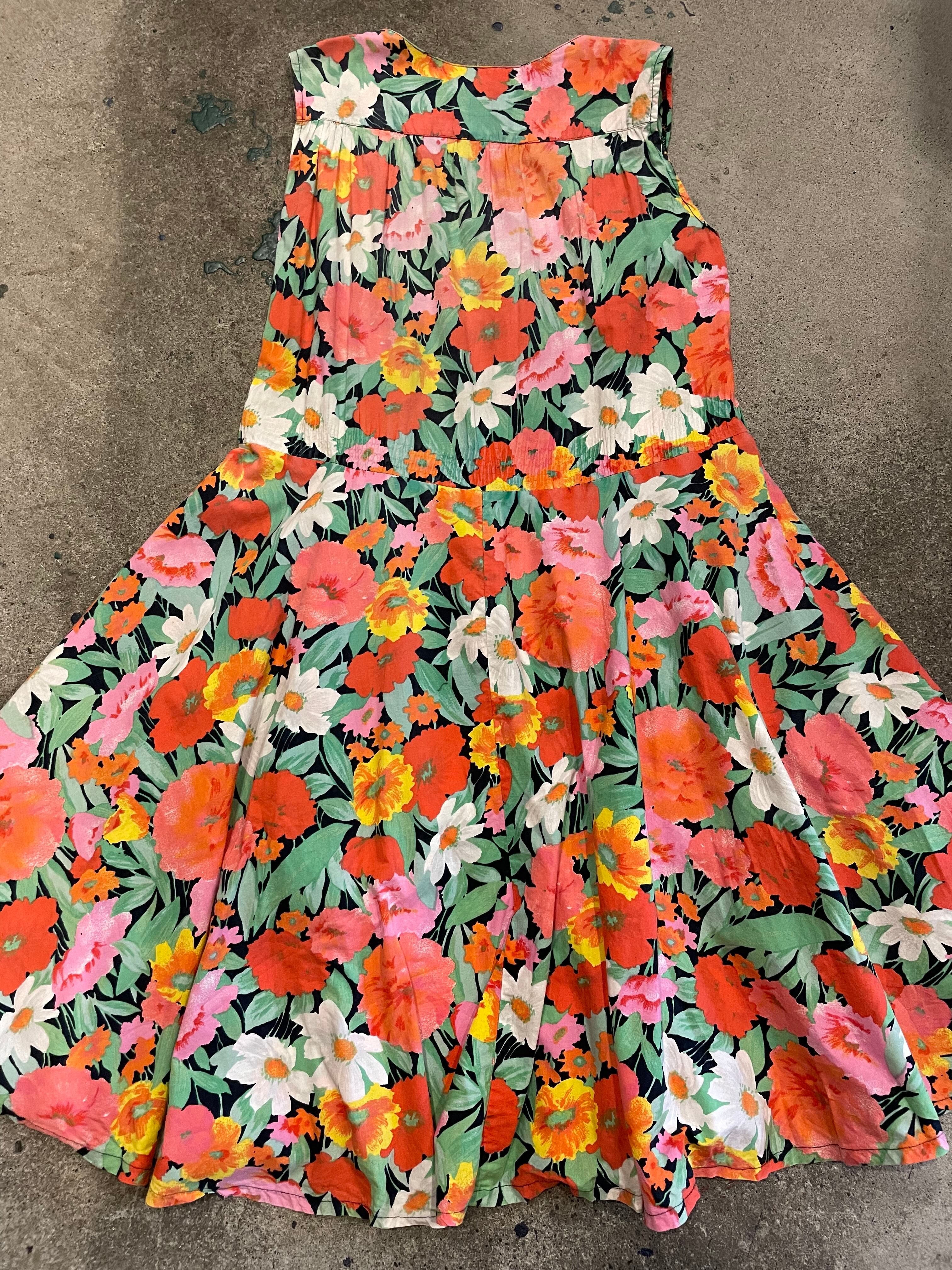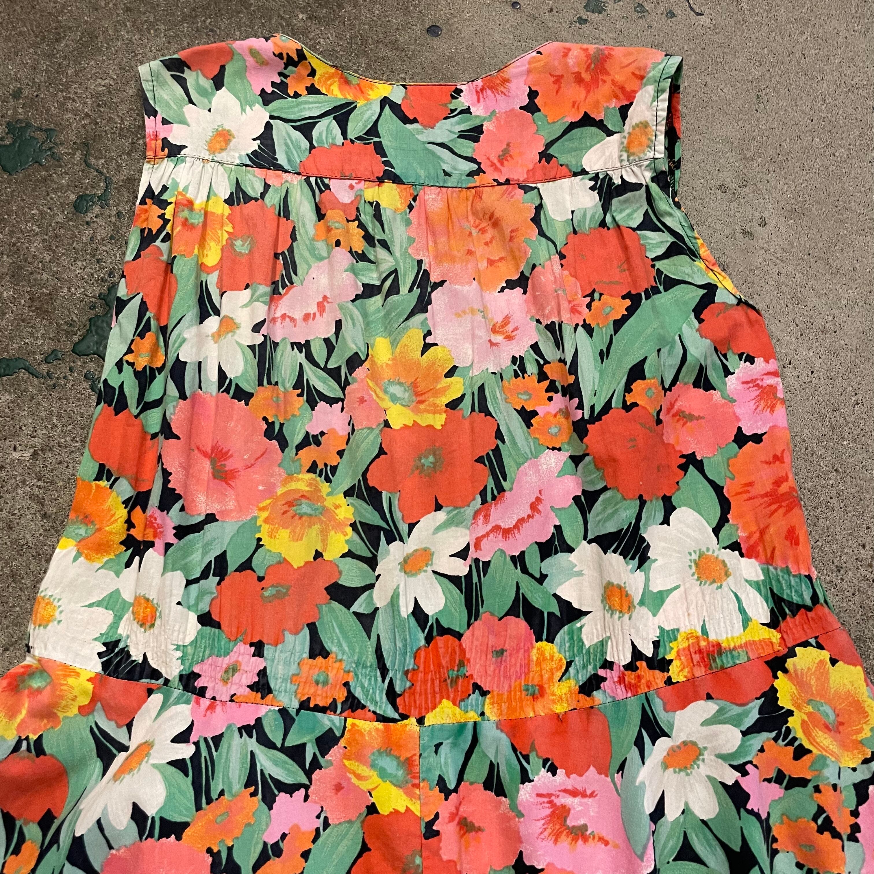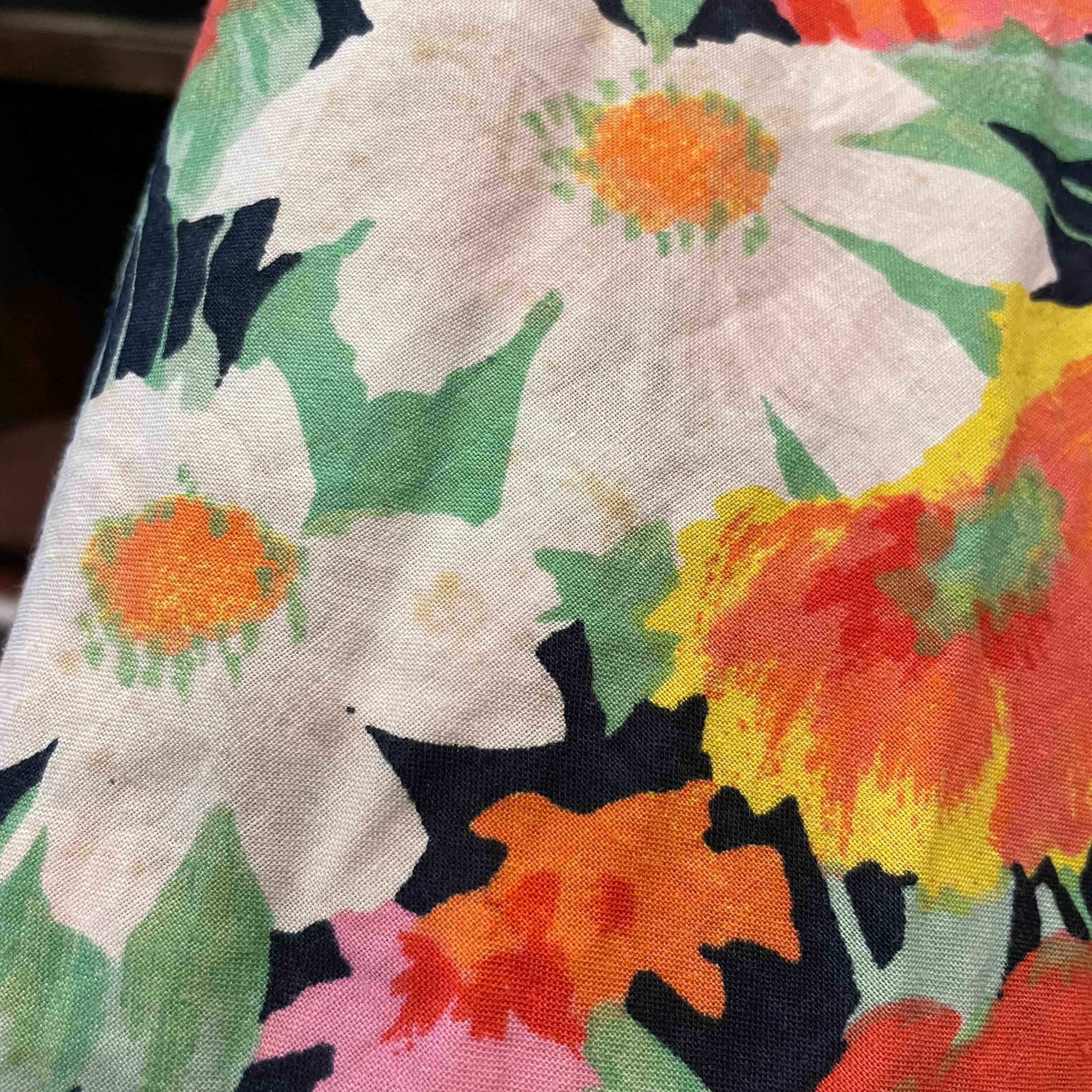 スカートのボリュームがたっぷりでかわいい花柄のワンピースです。前開きでボタンが付いており、両サイドにレースアップ、背中のヨークからのギャザーなど細部までこだわりの感じられる一着です。
