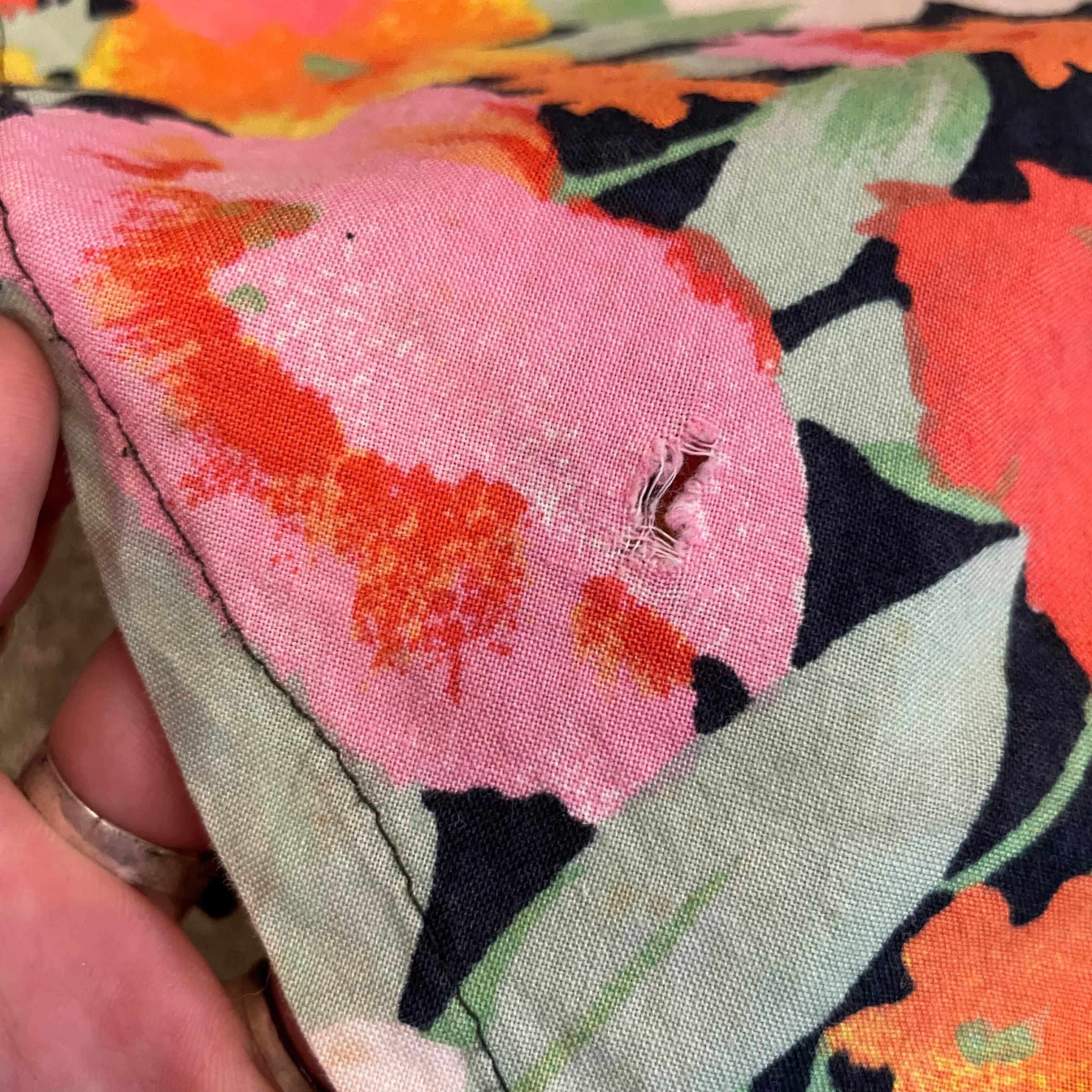 両肩に詰めていた跡(日焼けとミシン目)、裾の方にキズ、背中の日焼け、ウエストシャーリングの取れた跡、シミ等かなり使用感のある商品ですので古着にご理解のある方のご購入をお願い致します。