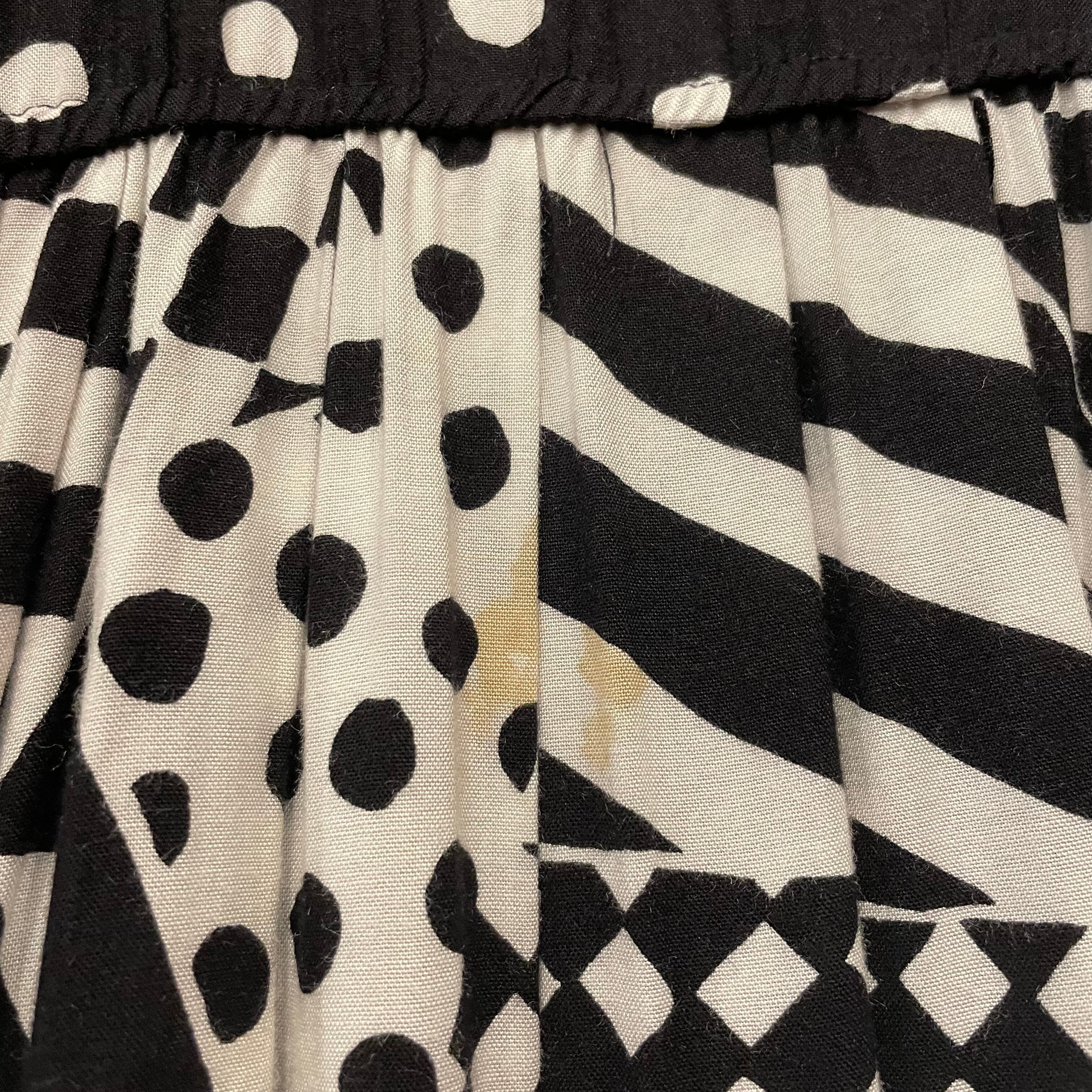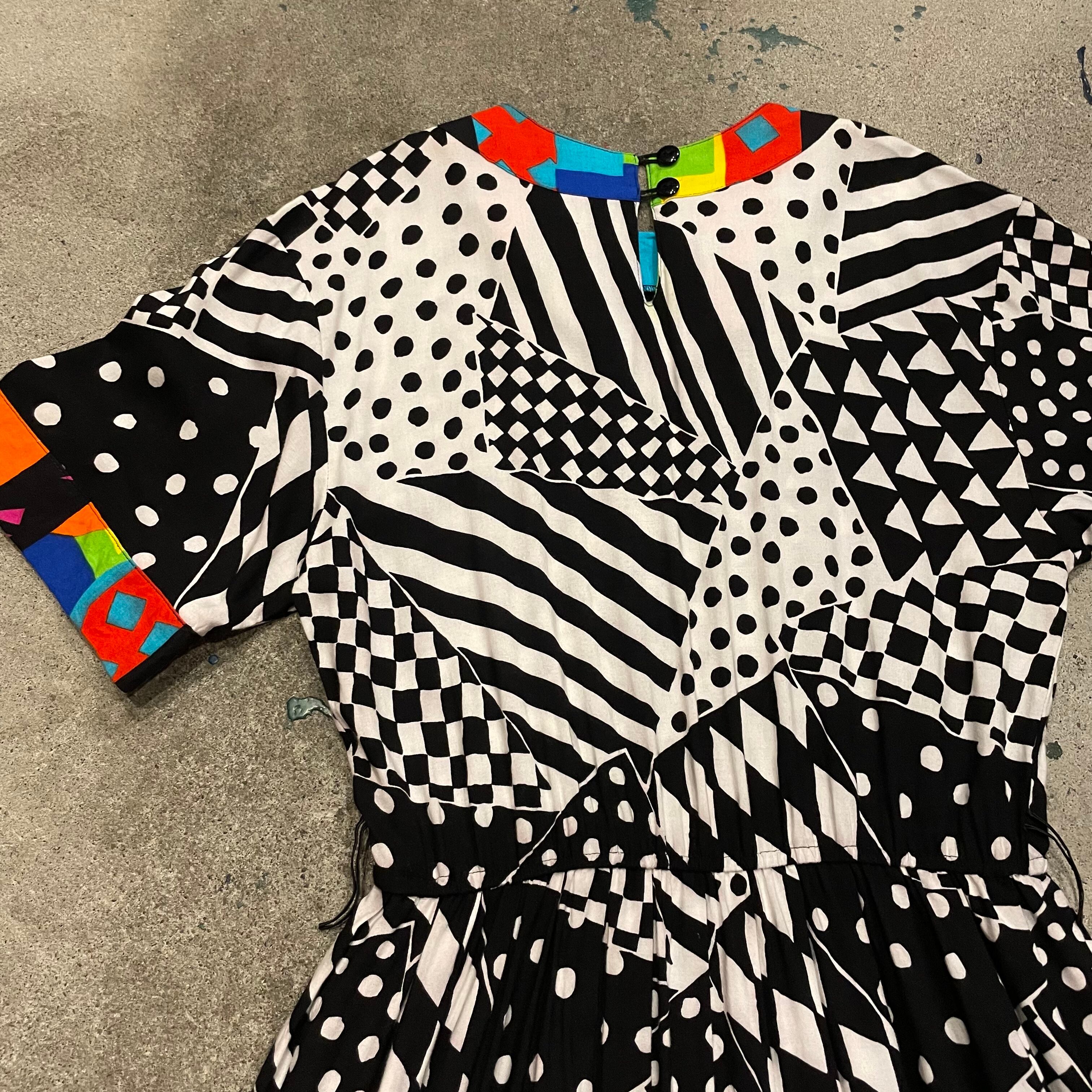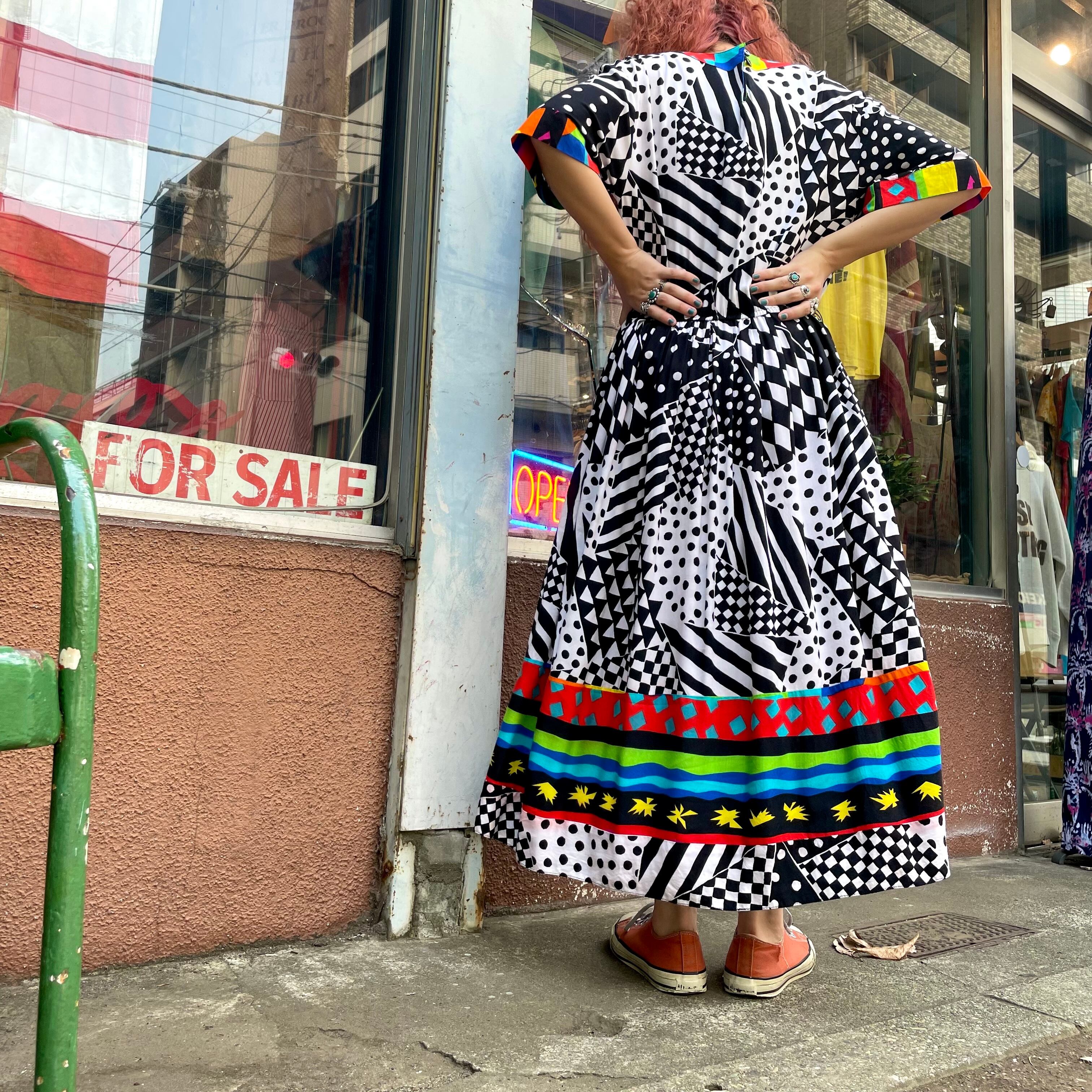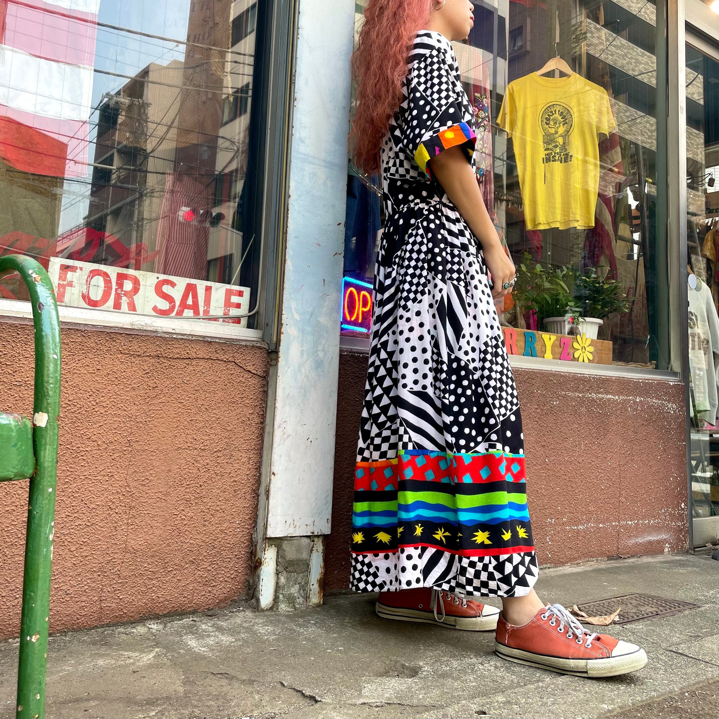 モノトーンとカラフルの柄×柄がかわいいワンピースです。とてもポップでアートな雰囲気が良いですね。長めの袖と程よいボリューム感があり、ウエストはゴムが入っています。ベルトでウエストマークしたり、大振りのアクセサリーをつけたり、頭にスカーフを巻いても可愛いと思います。